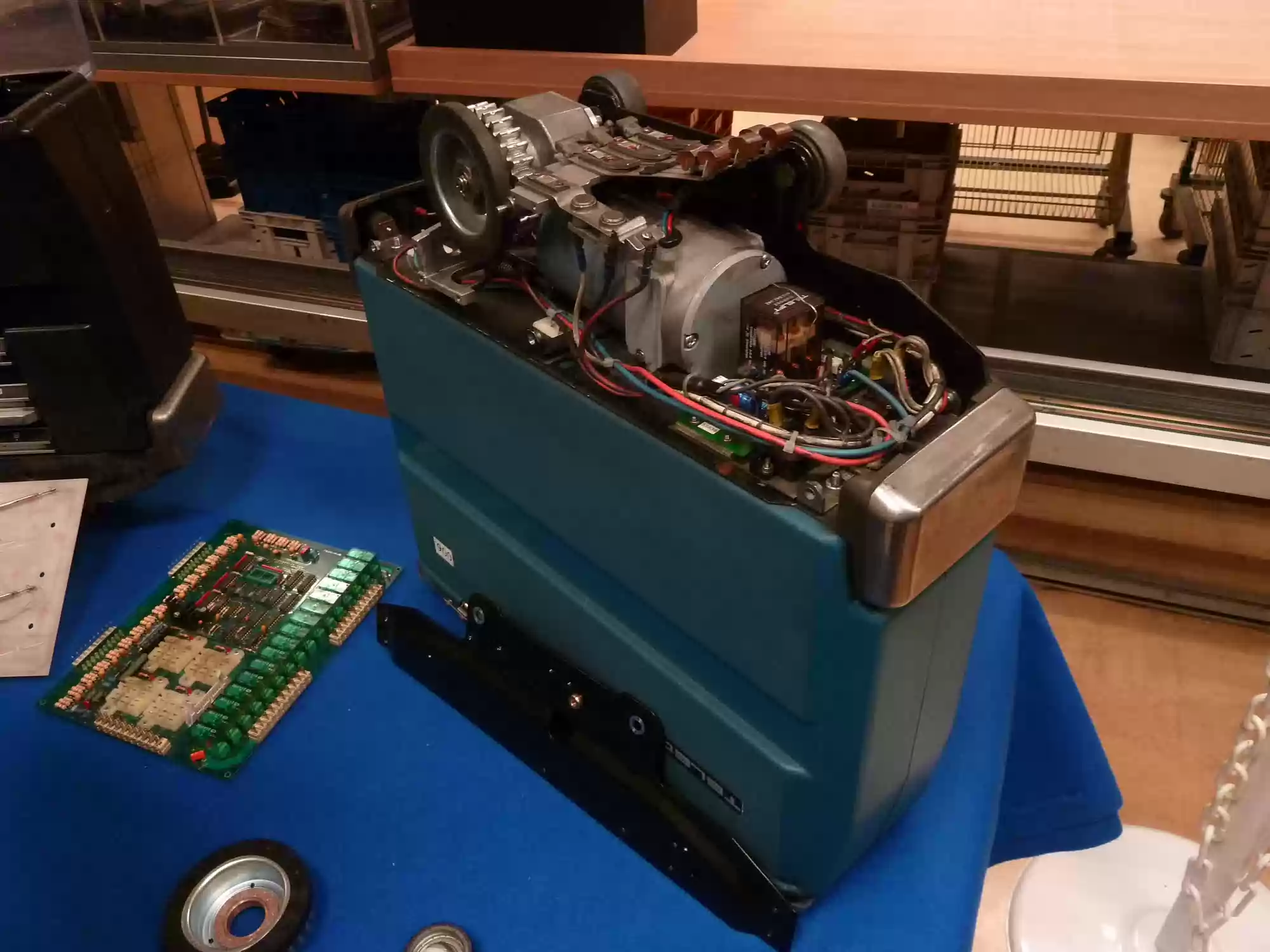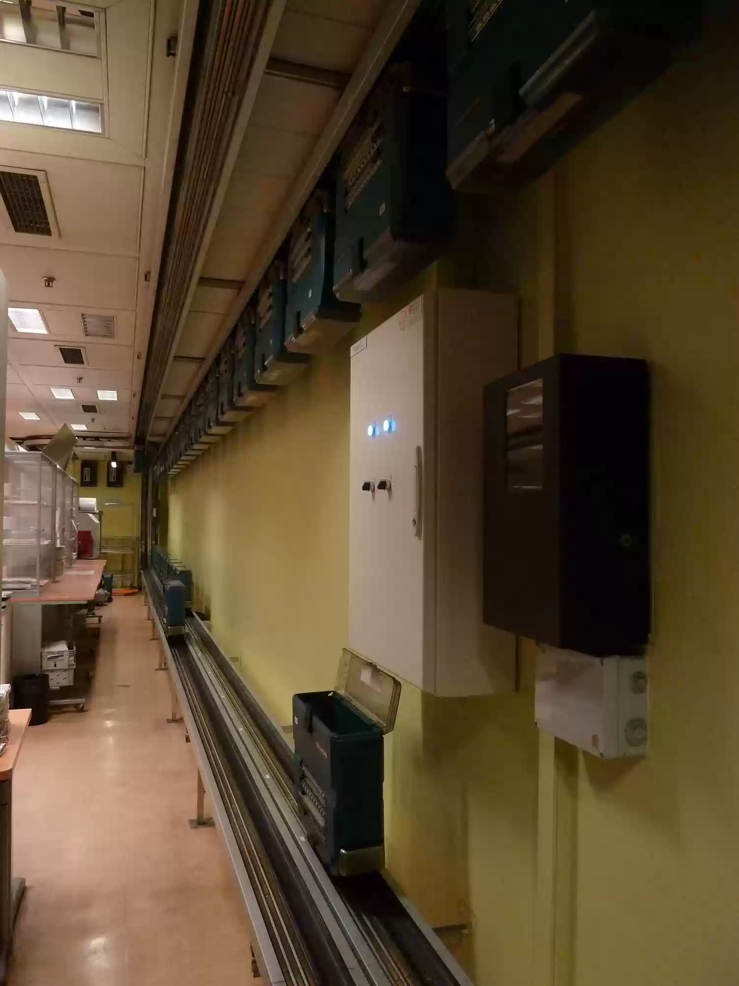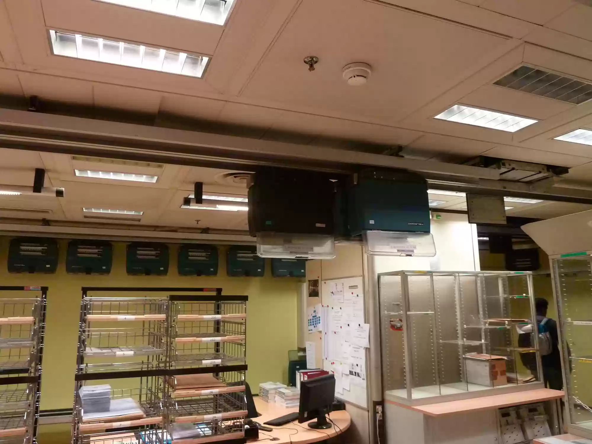 Teledoc, an automated document and small parcel delivery system, uses 7km of rails and 450 small carriers, serves 140 stations across all buildings.