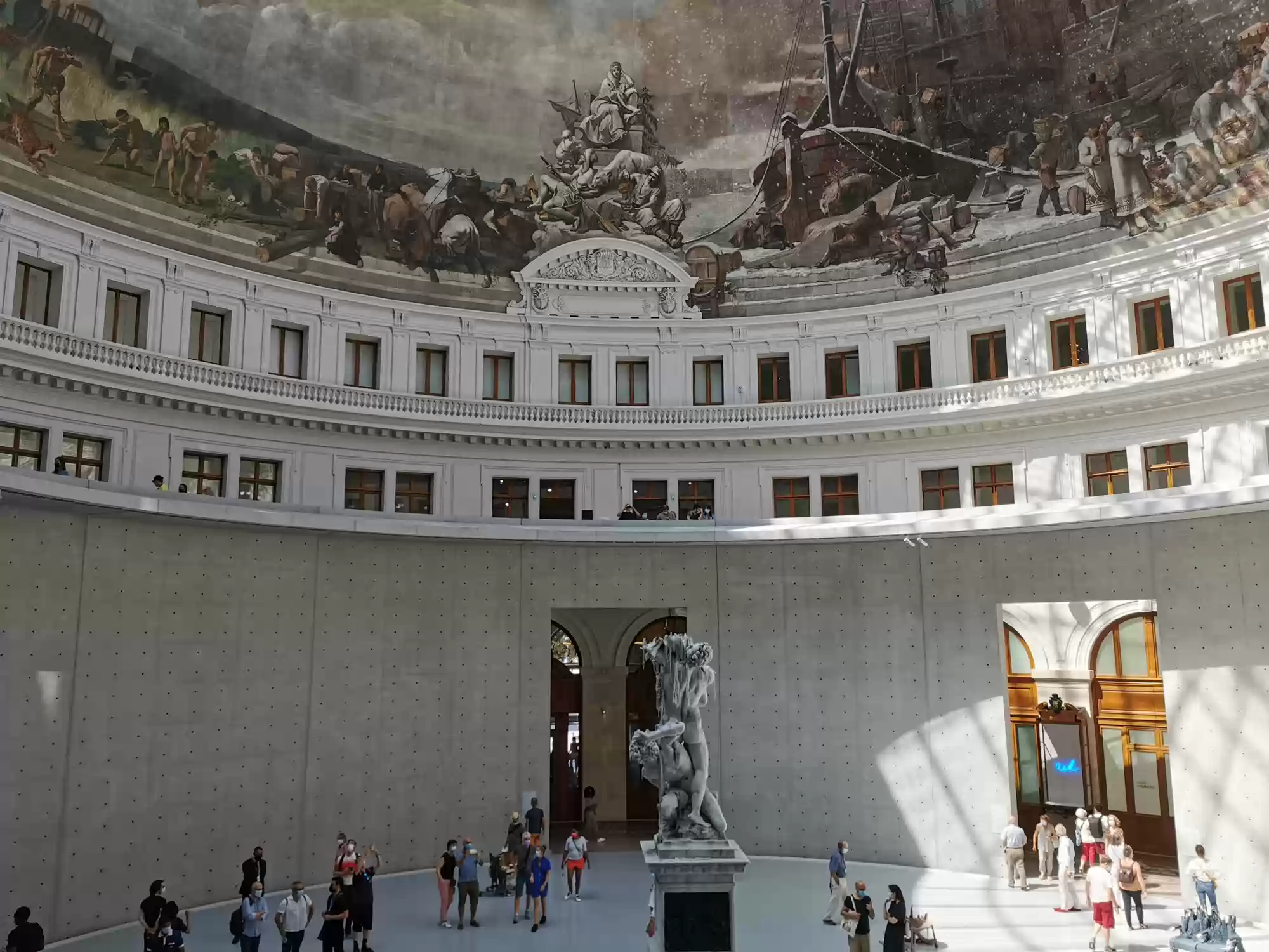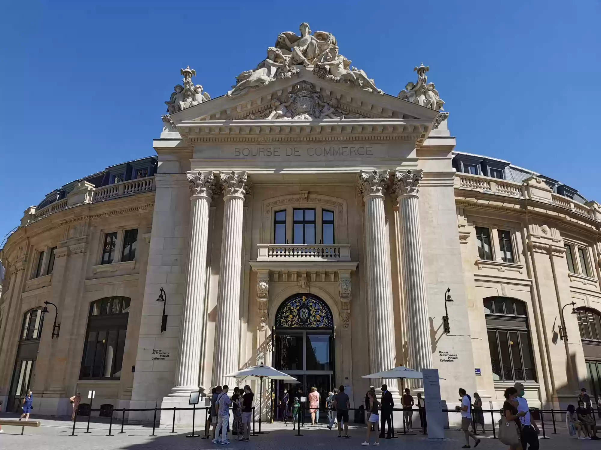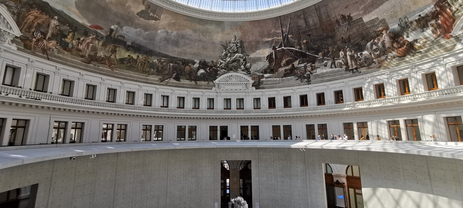 Bourse de commerce, where wheat was traded, built in the 1760s and remodeled in 1886-1889. It now houses the art collection of billionaire François… Left: Medicis column (1574, 31 meters), the only structure left from the former Medicis palace standing before the Bourse de Commerce was built. Building surrounding the Bourse du commerce. Arcades from the 18th century building. Left: the concrete structure installed by Tadao Ando. A concrete structure was installed by Tadao Ando in 2020 in the rotunda. The circular painting (1889) in the dome depicts trade between all continents. The circular painting (1889) in the dome depicts trade between all continents. Urs Fischer, monumental candles, 2011-2020. Urs Fischer, monumental candles, 2011-2020. Labels