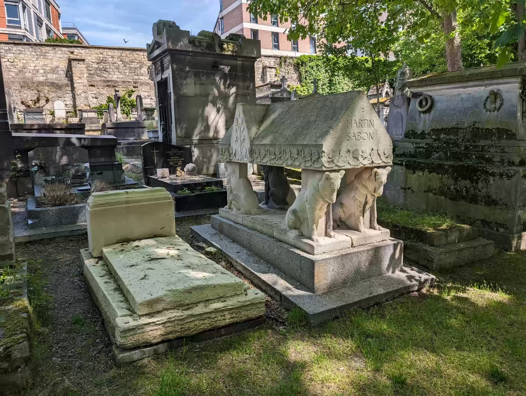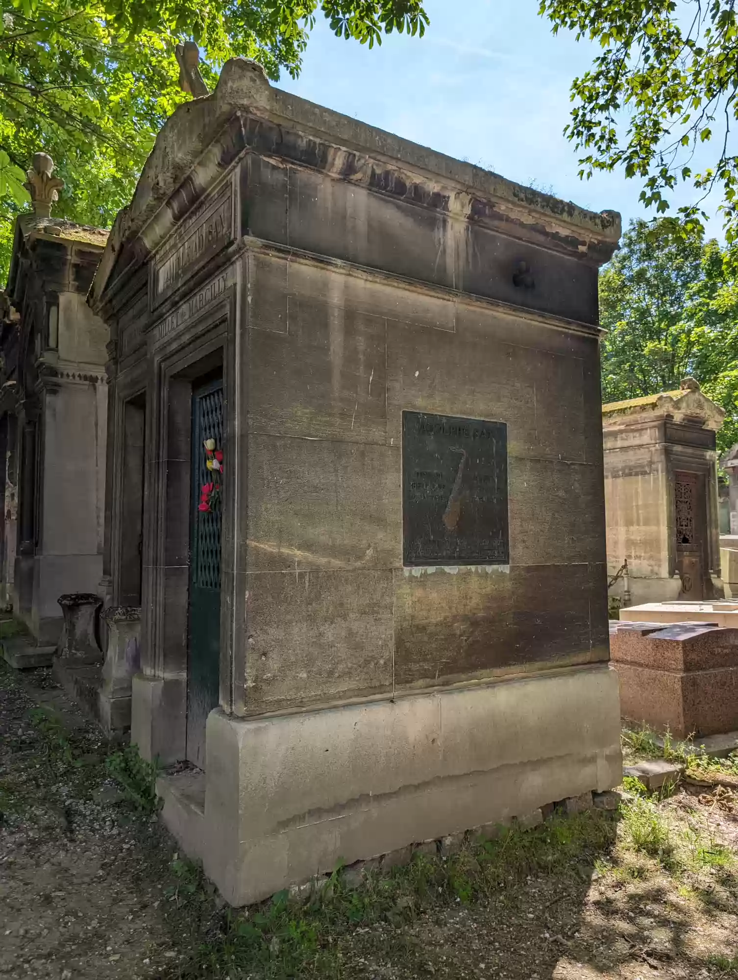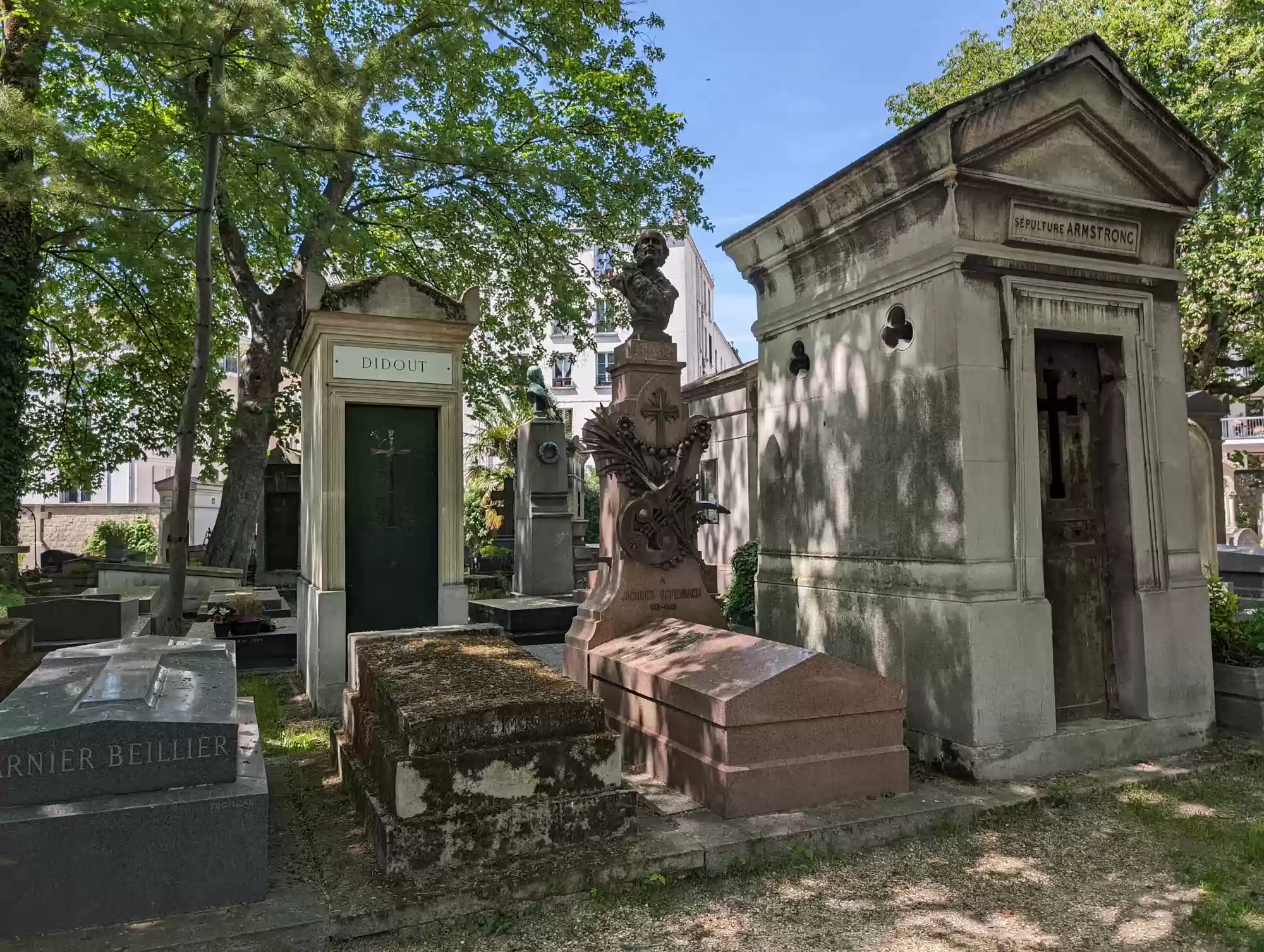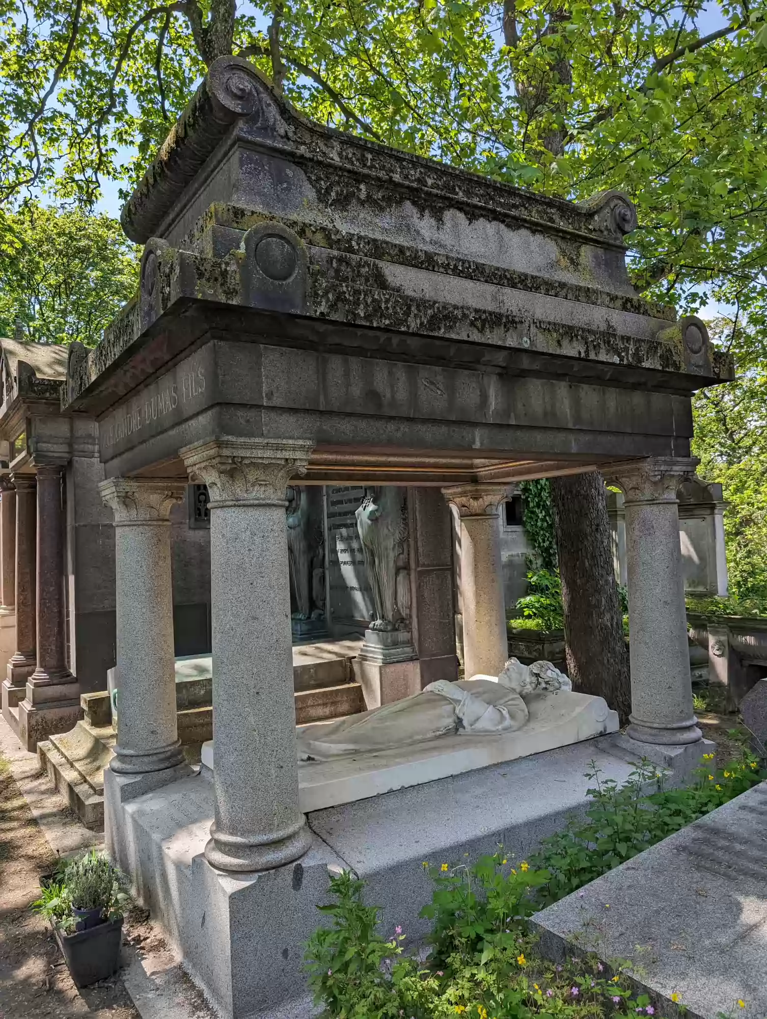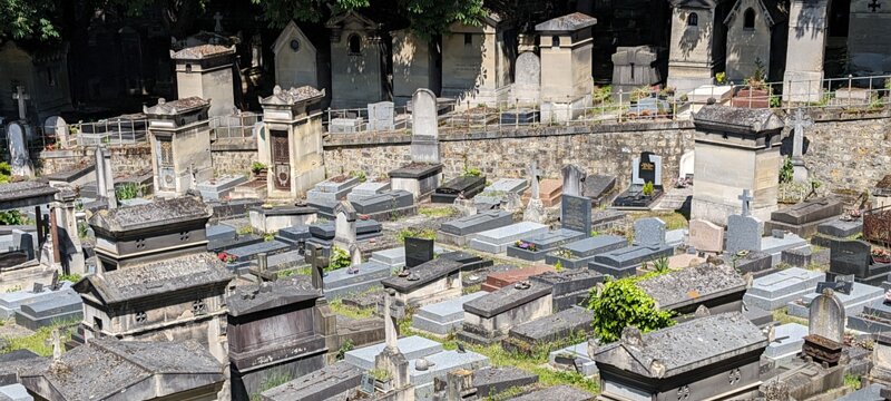 The cemetery of Montmartre was created in 1825. It holds 21500 tombs. Leon Foucault. Adolphe Sax. Degas family. Alexandre Dumas, fils. Michel Berger and France Gall. Michel Galabru. Edmond and Jules de Goncourt. Stendhal. André Marie Ampère. La Goulue. Hector Berlioz. Labels