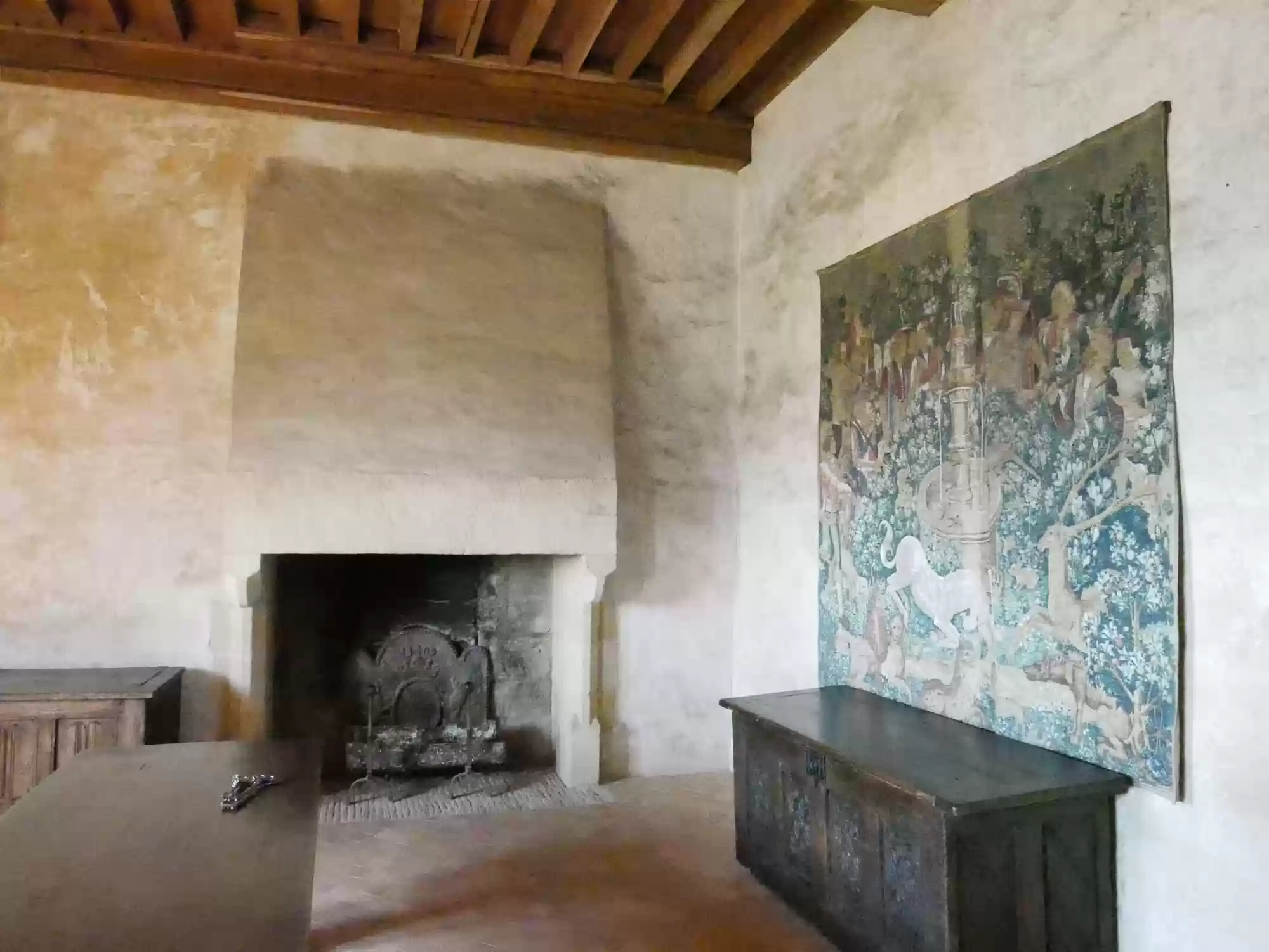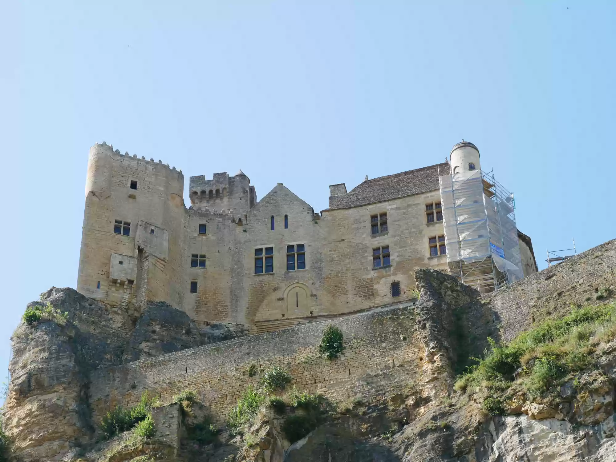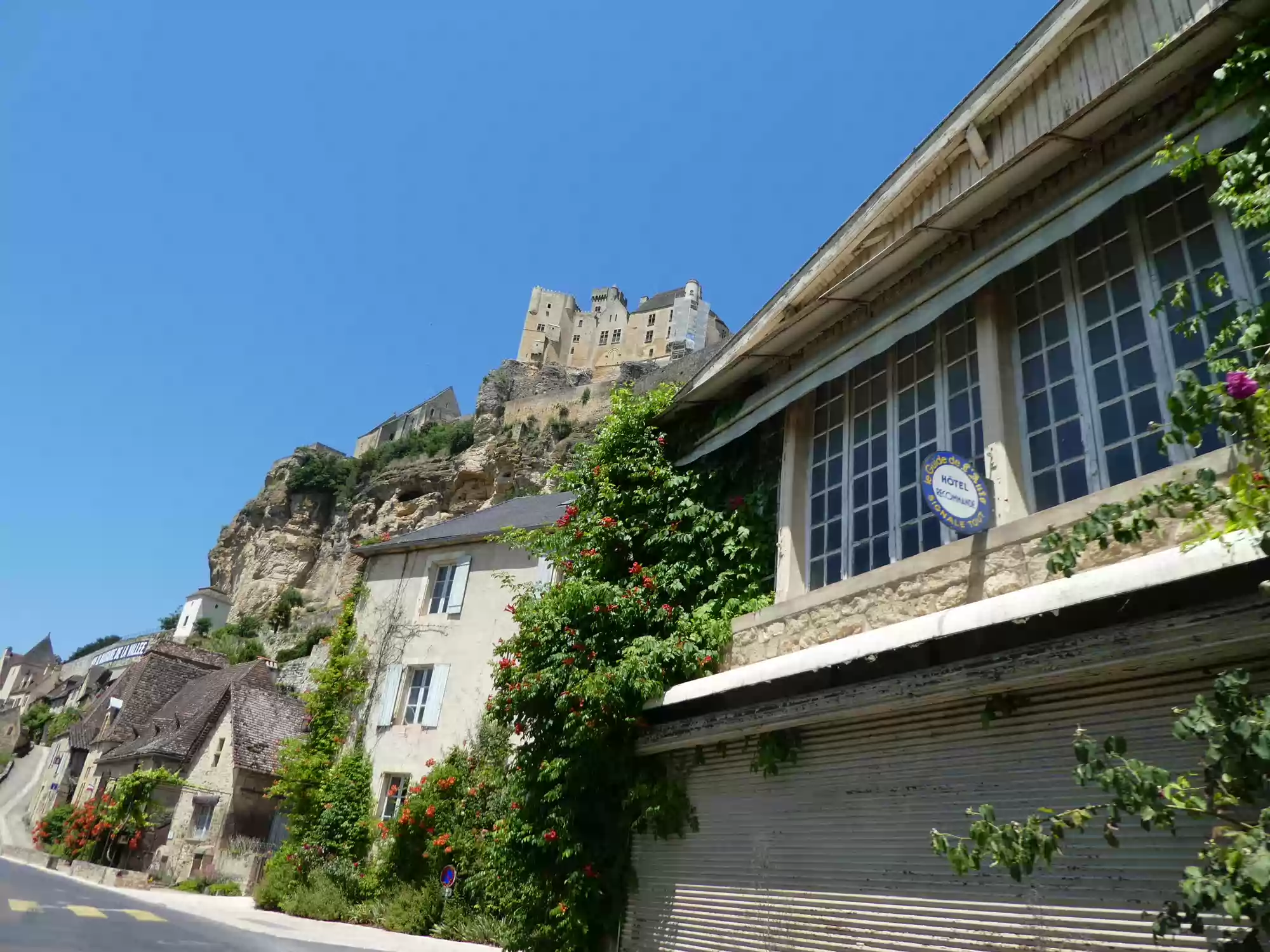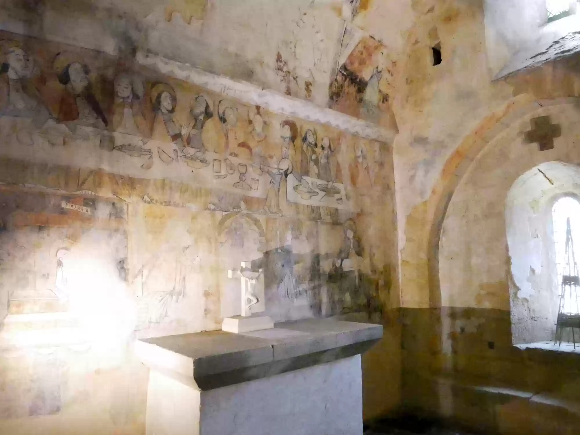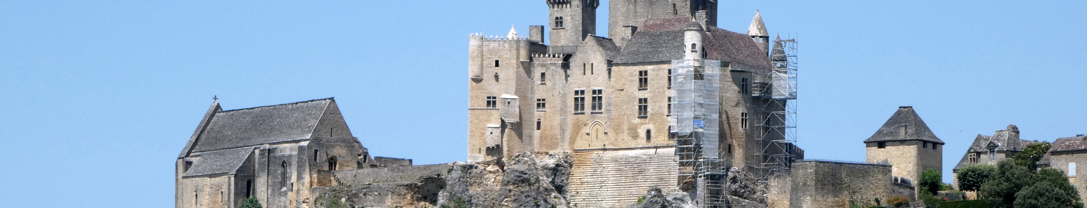 Beynac castle, essentially from the 12th century, 150 meters above river Dordogne. Oratory, 14th century, frescoes from the 15th century: the last supper. Labels
