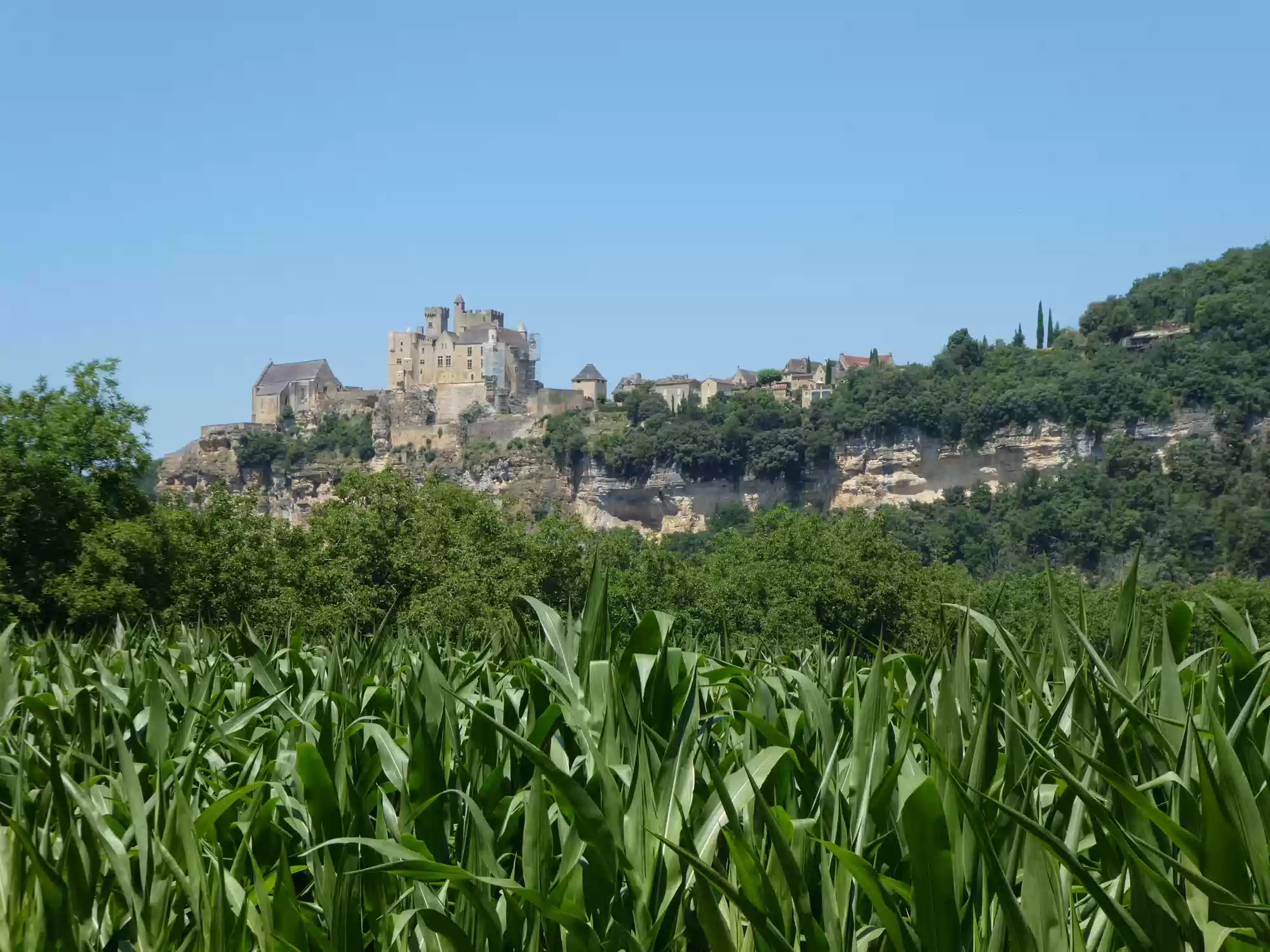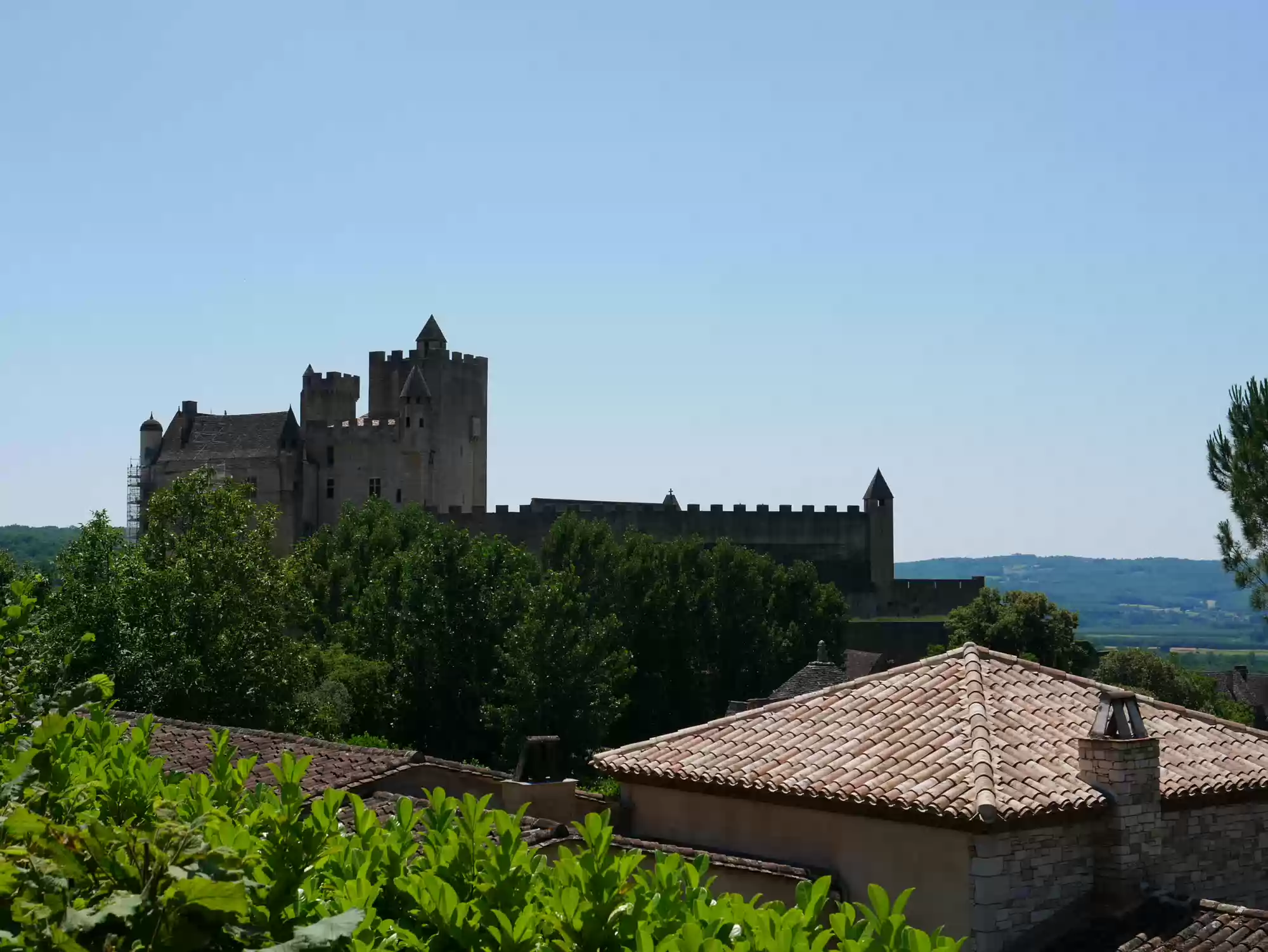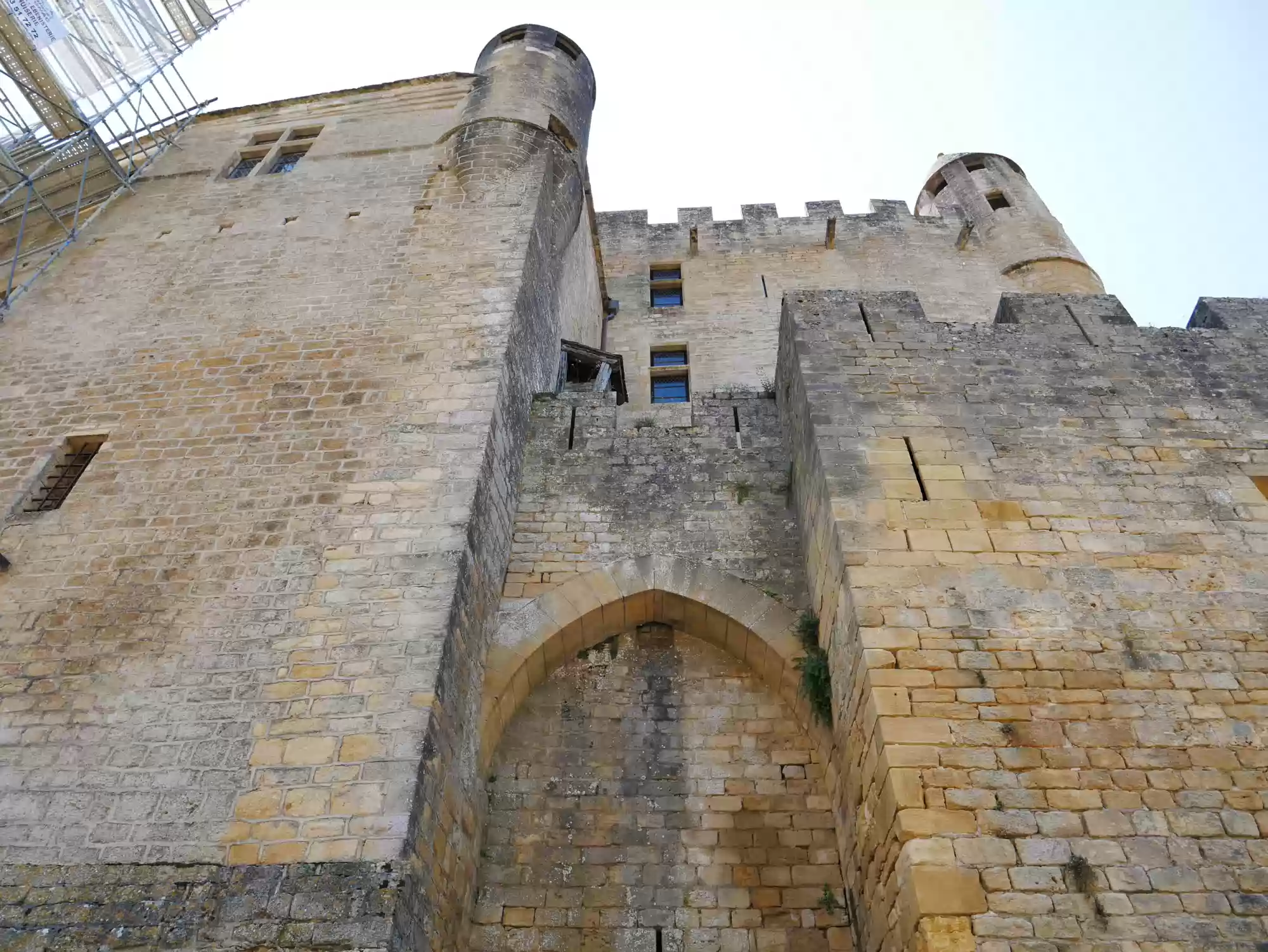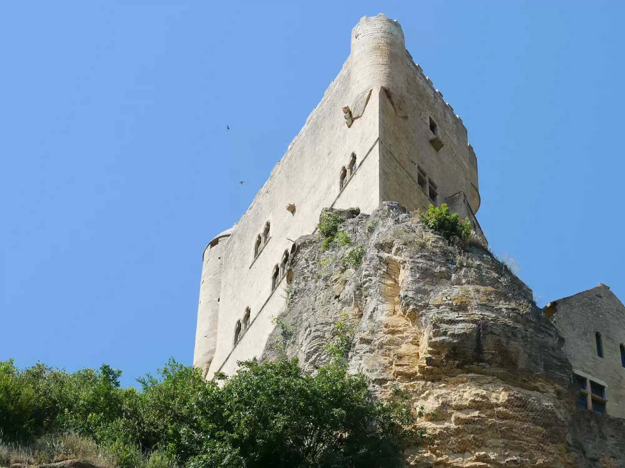 Beynac castle, essentially from the 12th century, 150 meters above river Dordogne. Oratory, 14th century, frescoes from the 15th century: the last supper. Labels