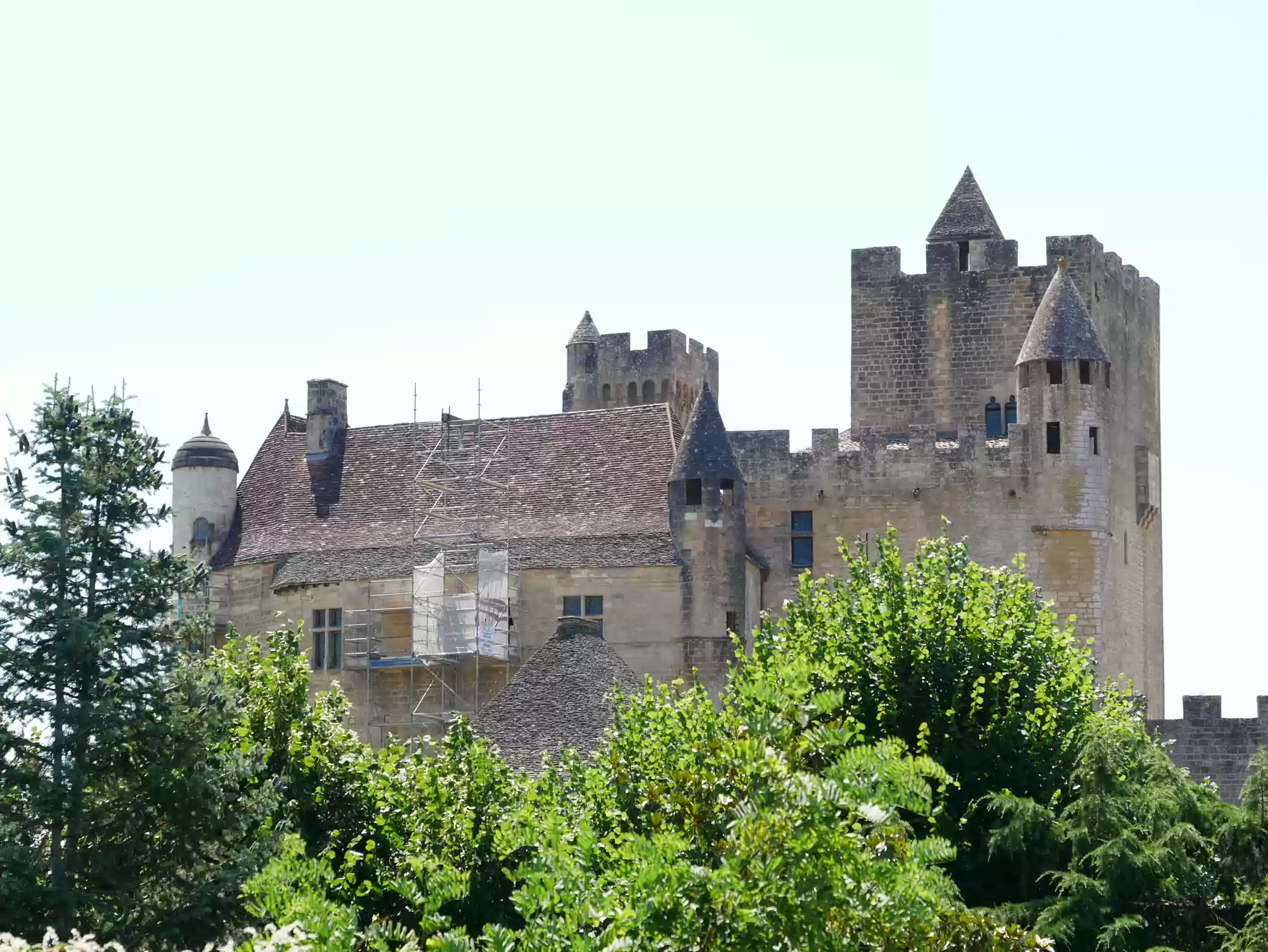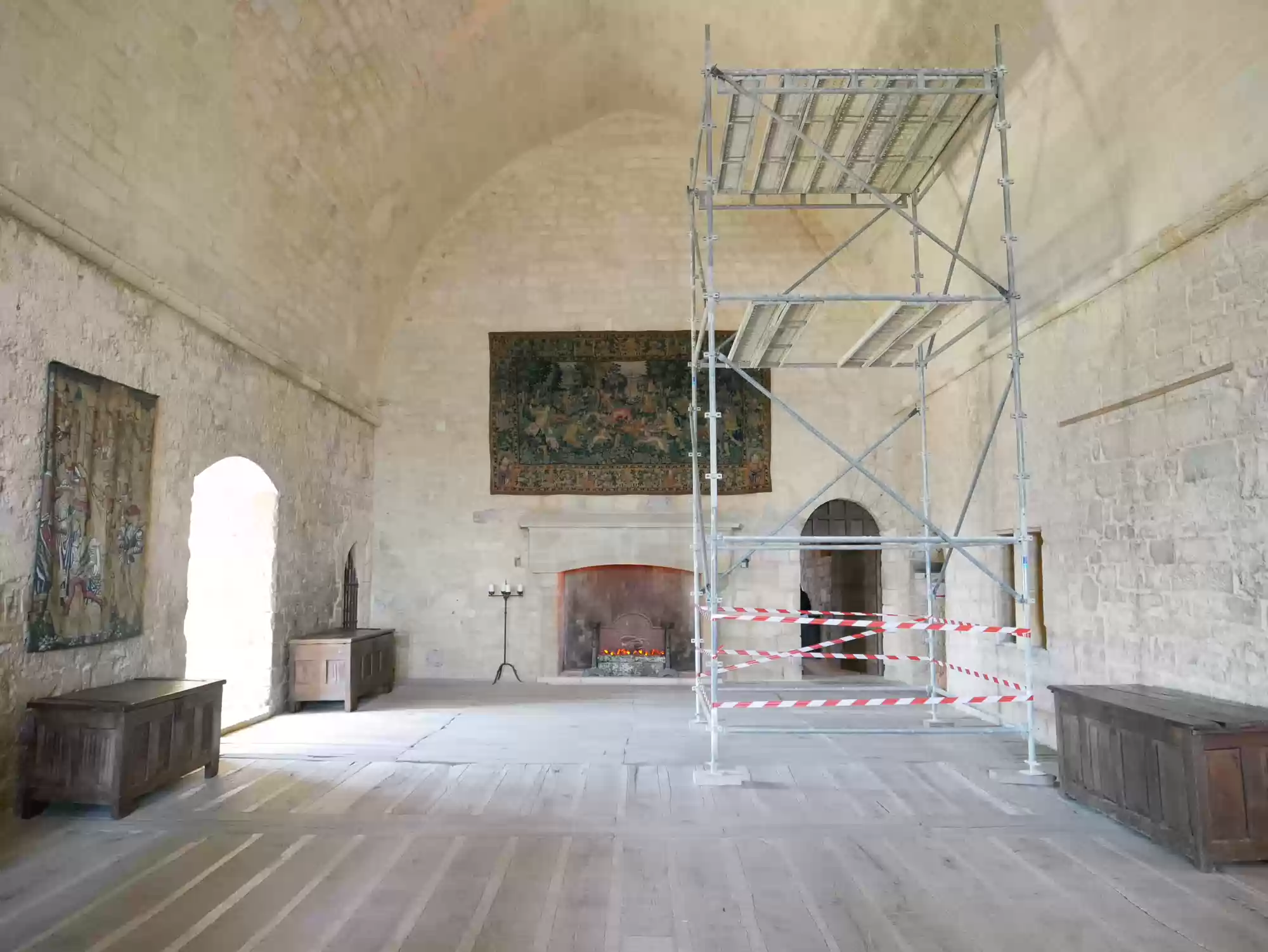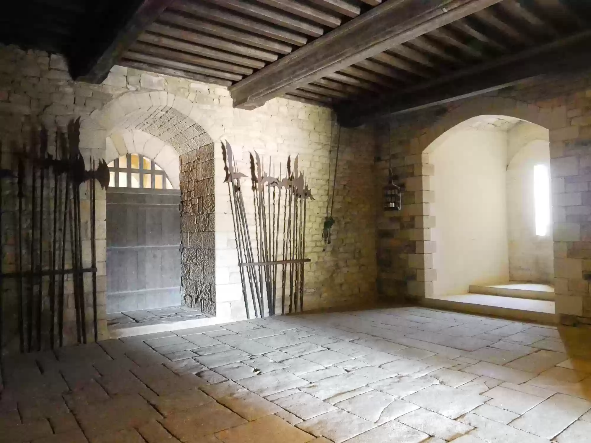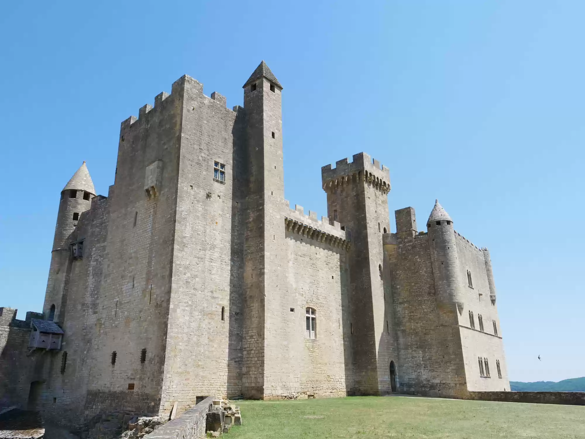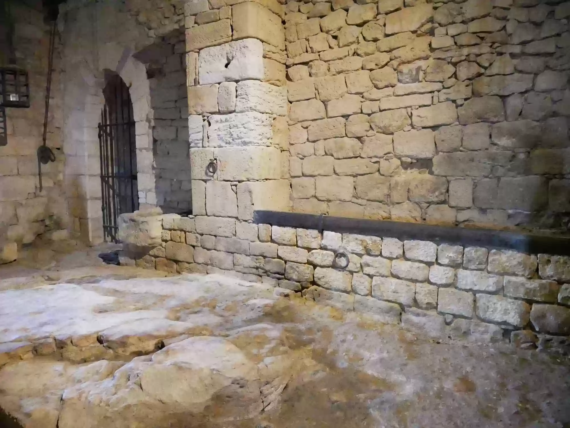 Beynac castle, essentially from the 12th century, 150 meters above river Dordogne. Oratory, 14th century, frescoes from the 15th century: the last supper. Labels