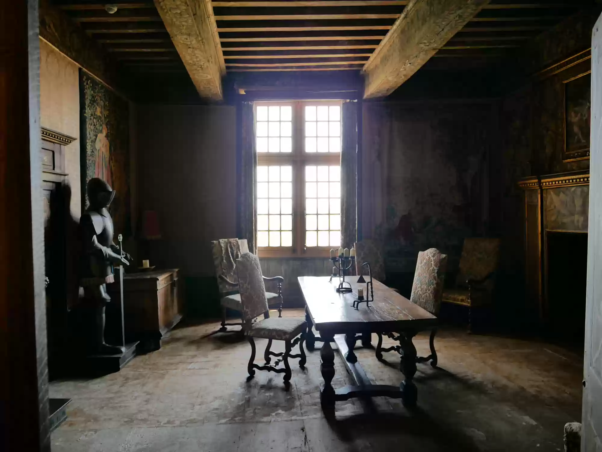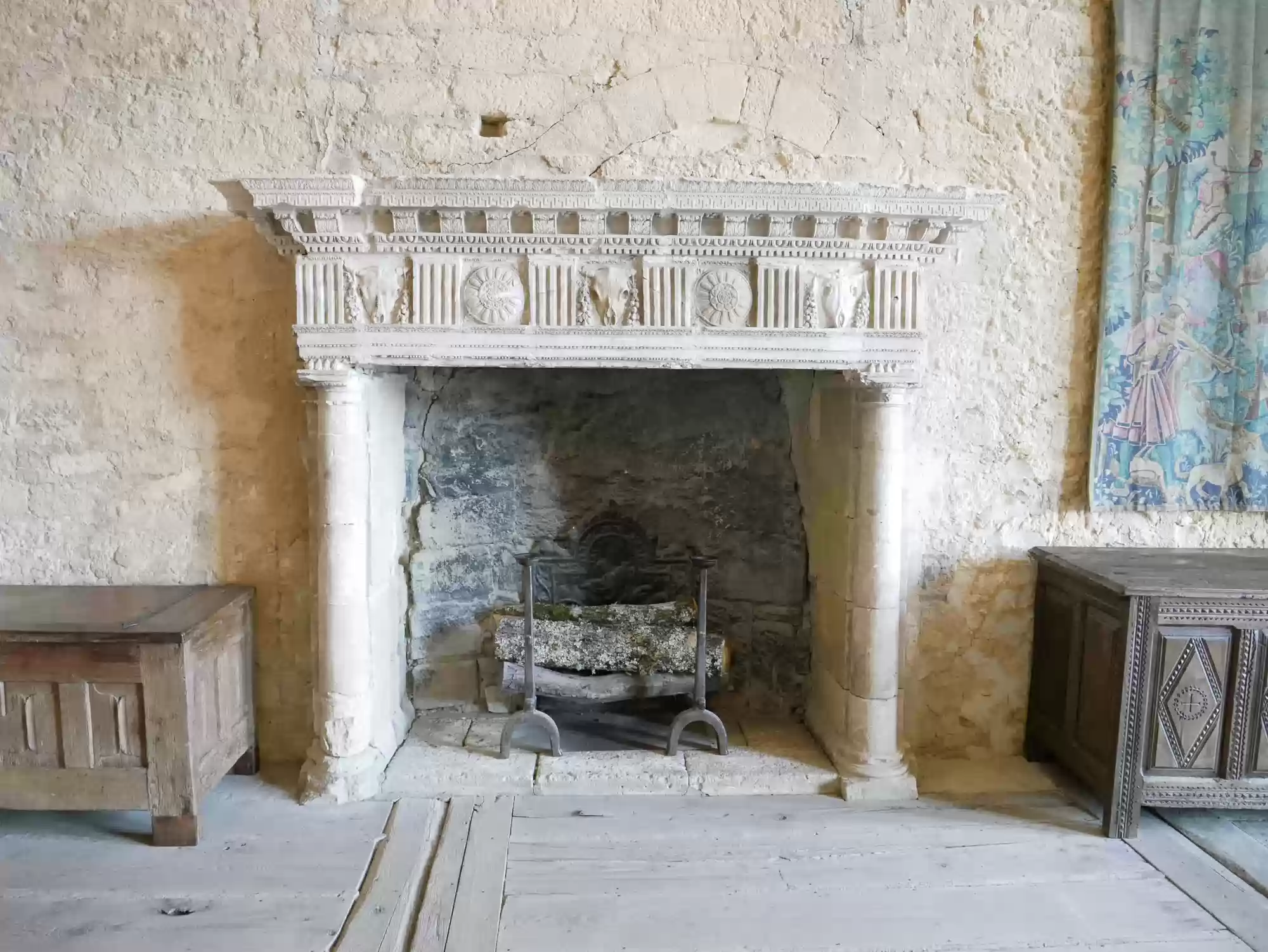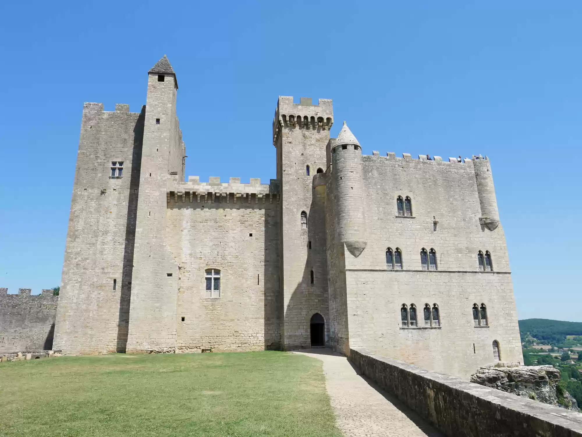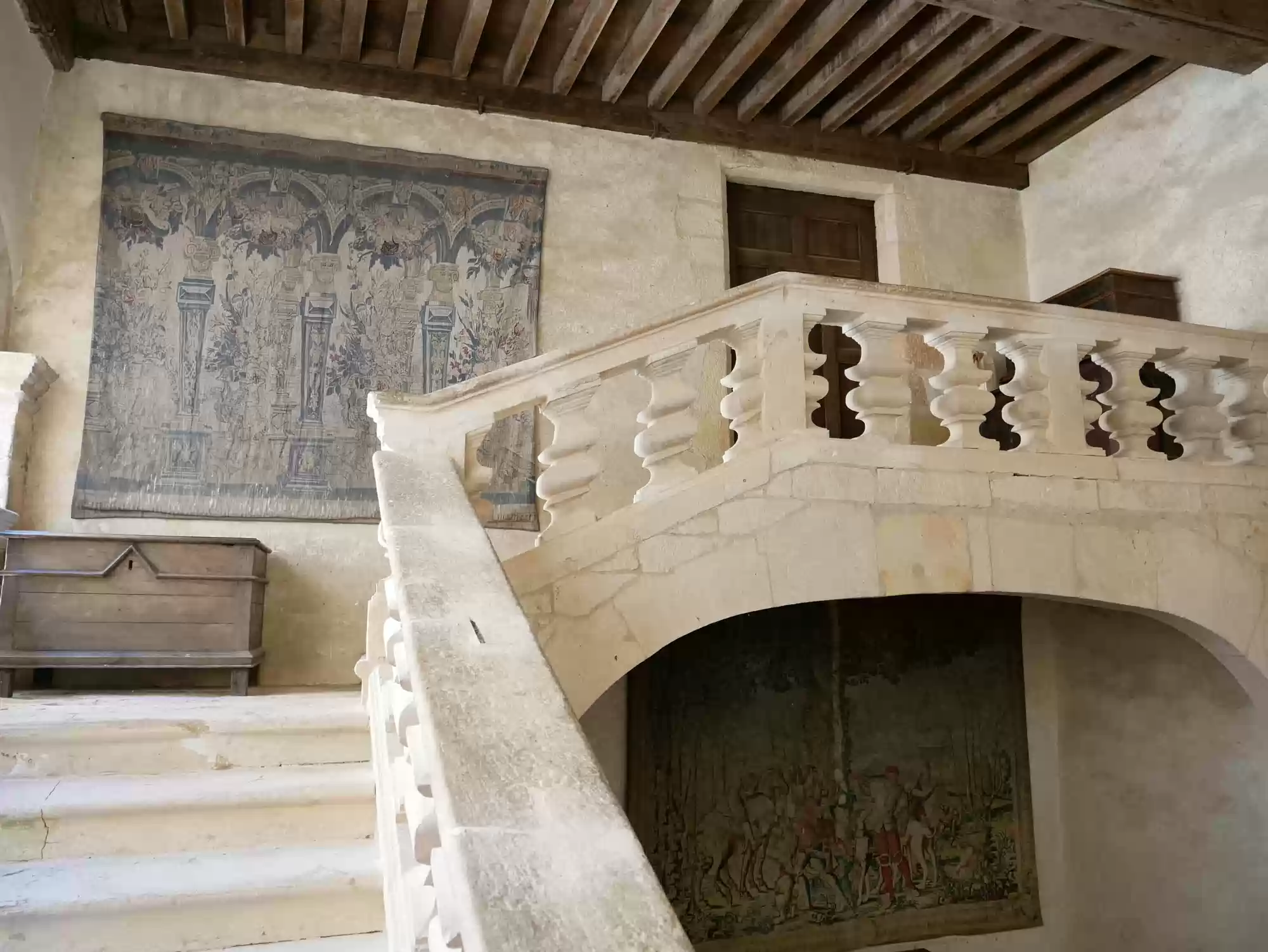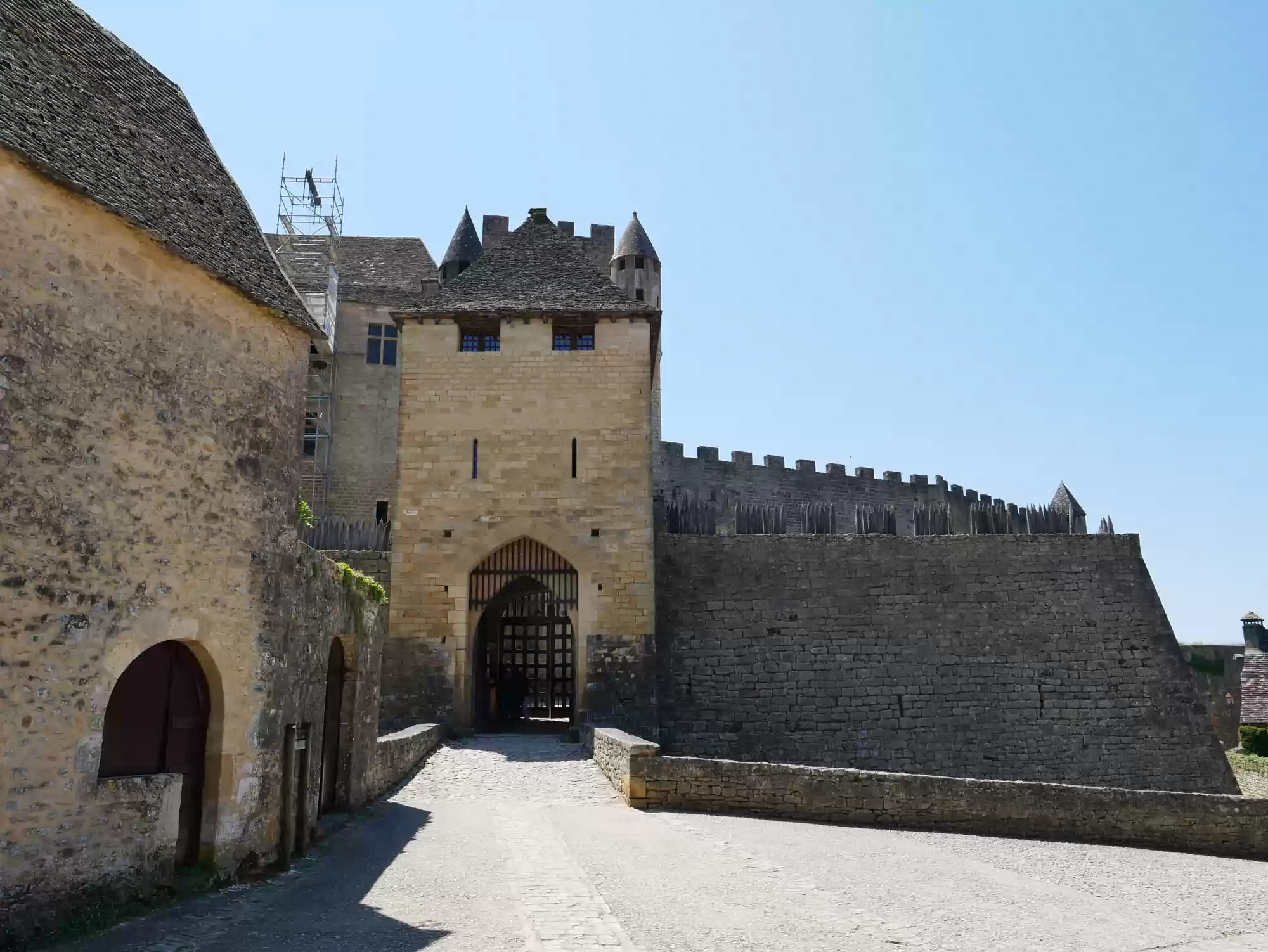 Beynac castle, essentially from the 12th century, 150 meters above river Dordogne. Oratory, 14th century, frescoes from the 15th century: the last supper. Labels