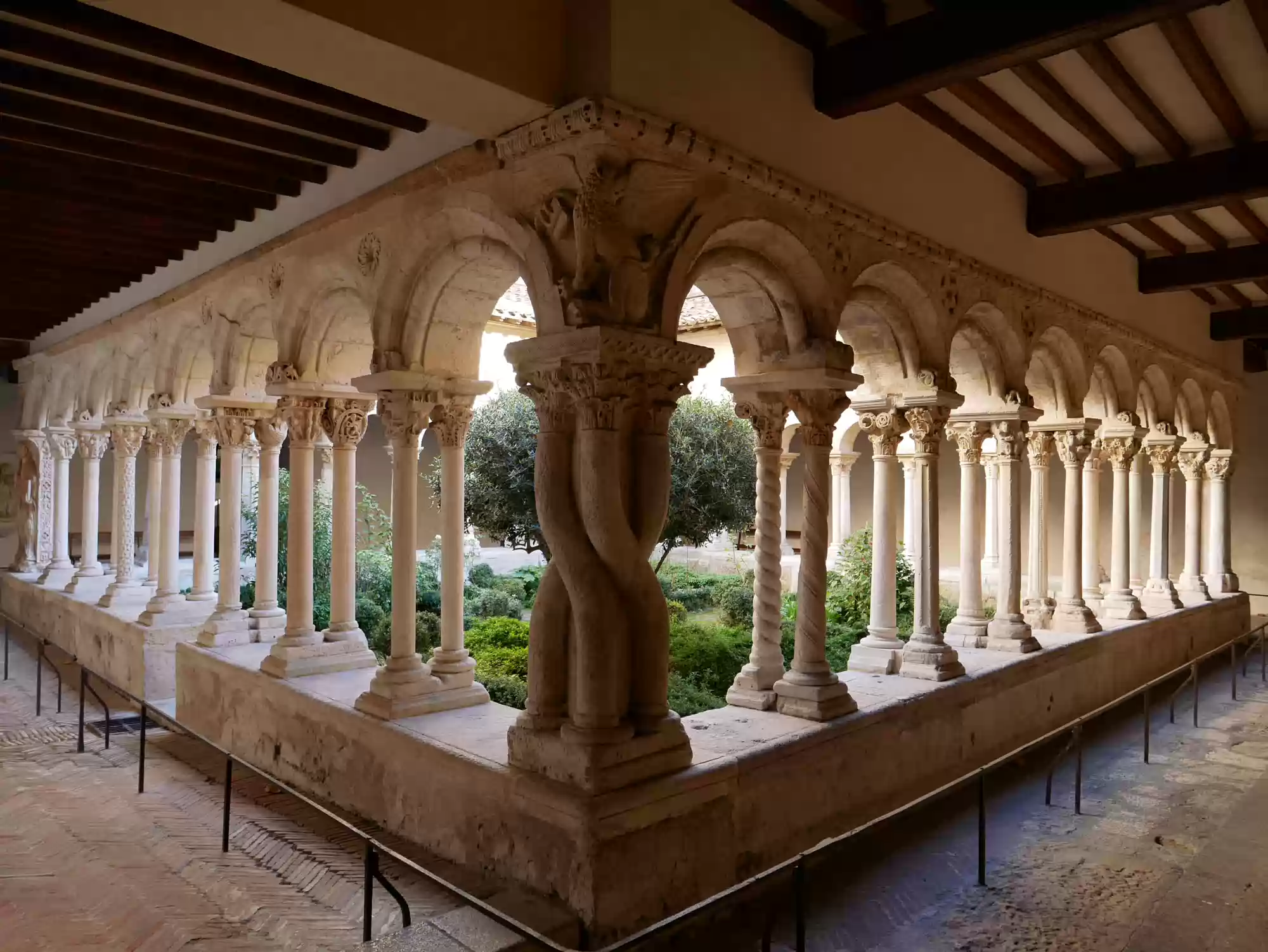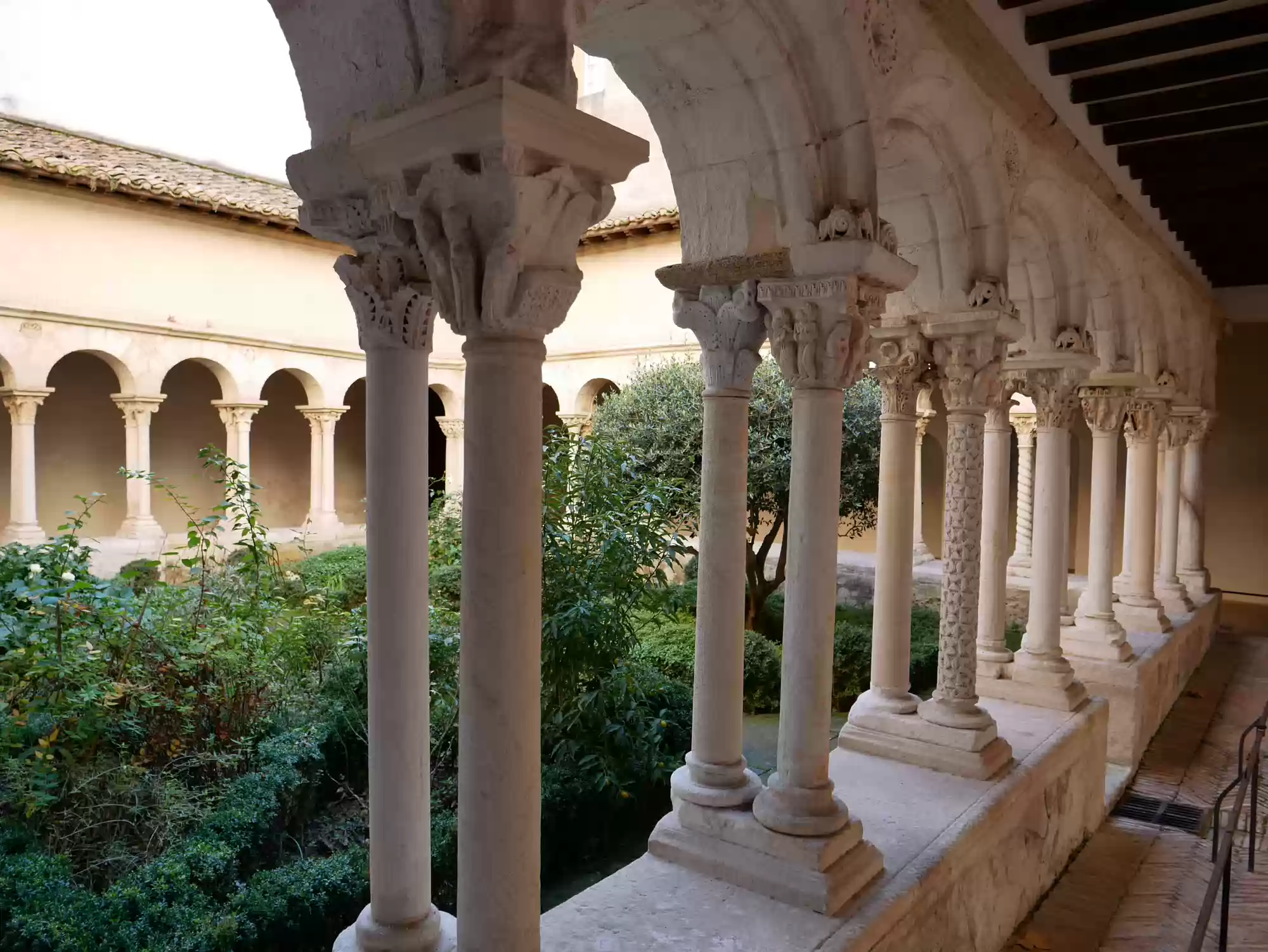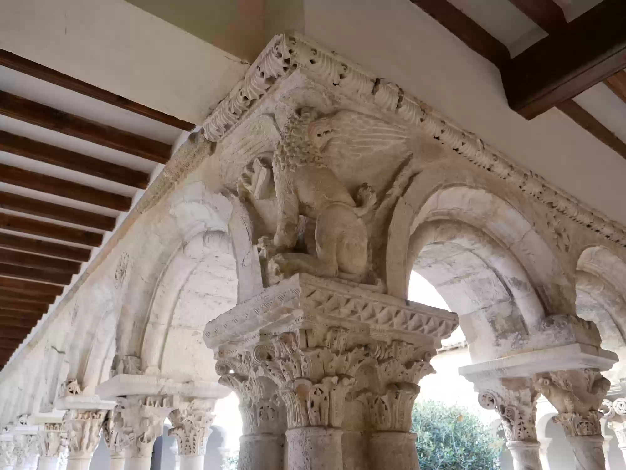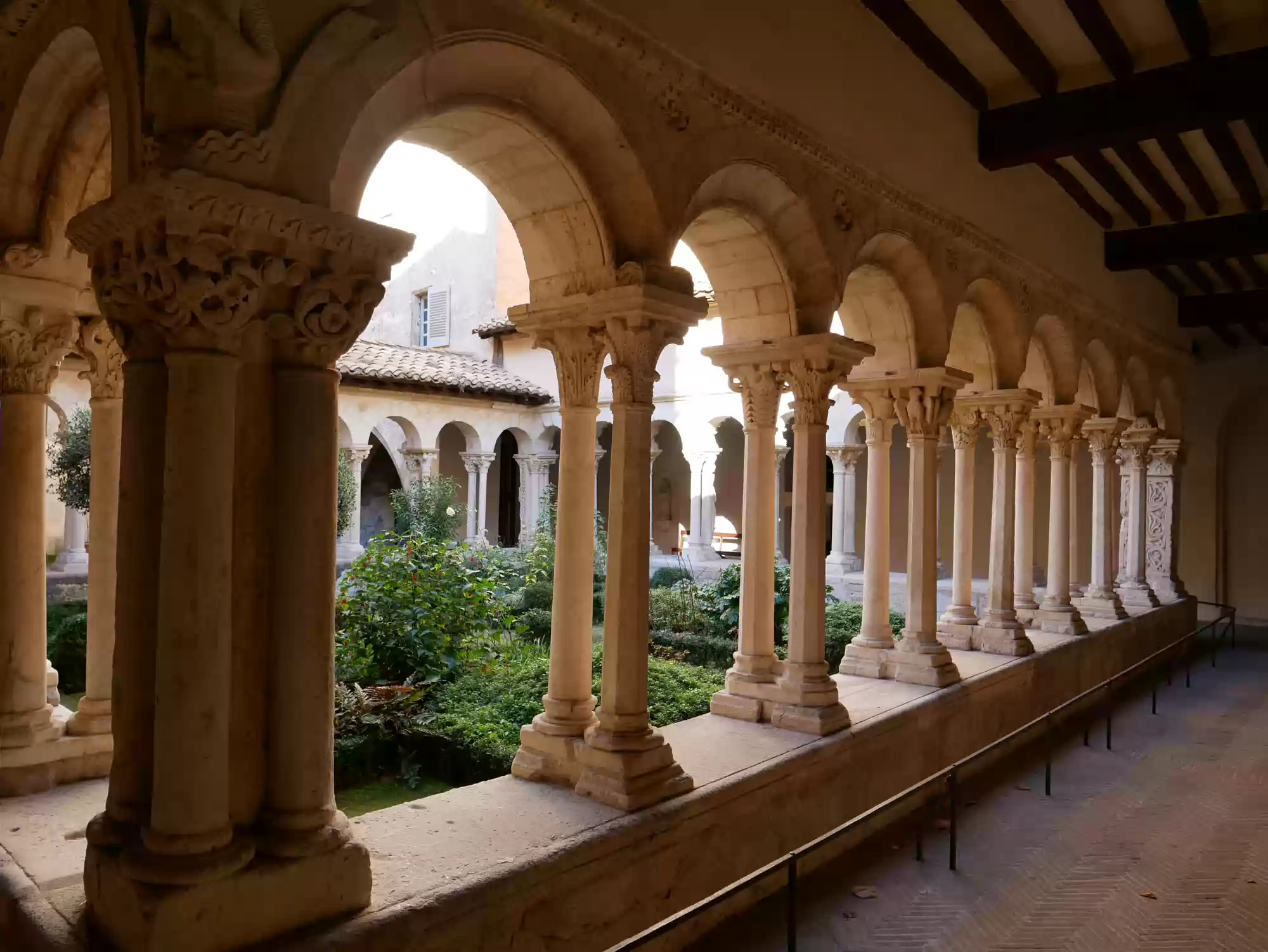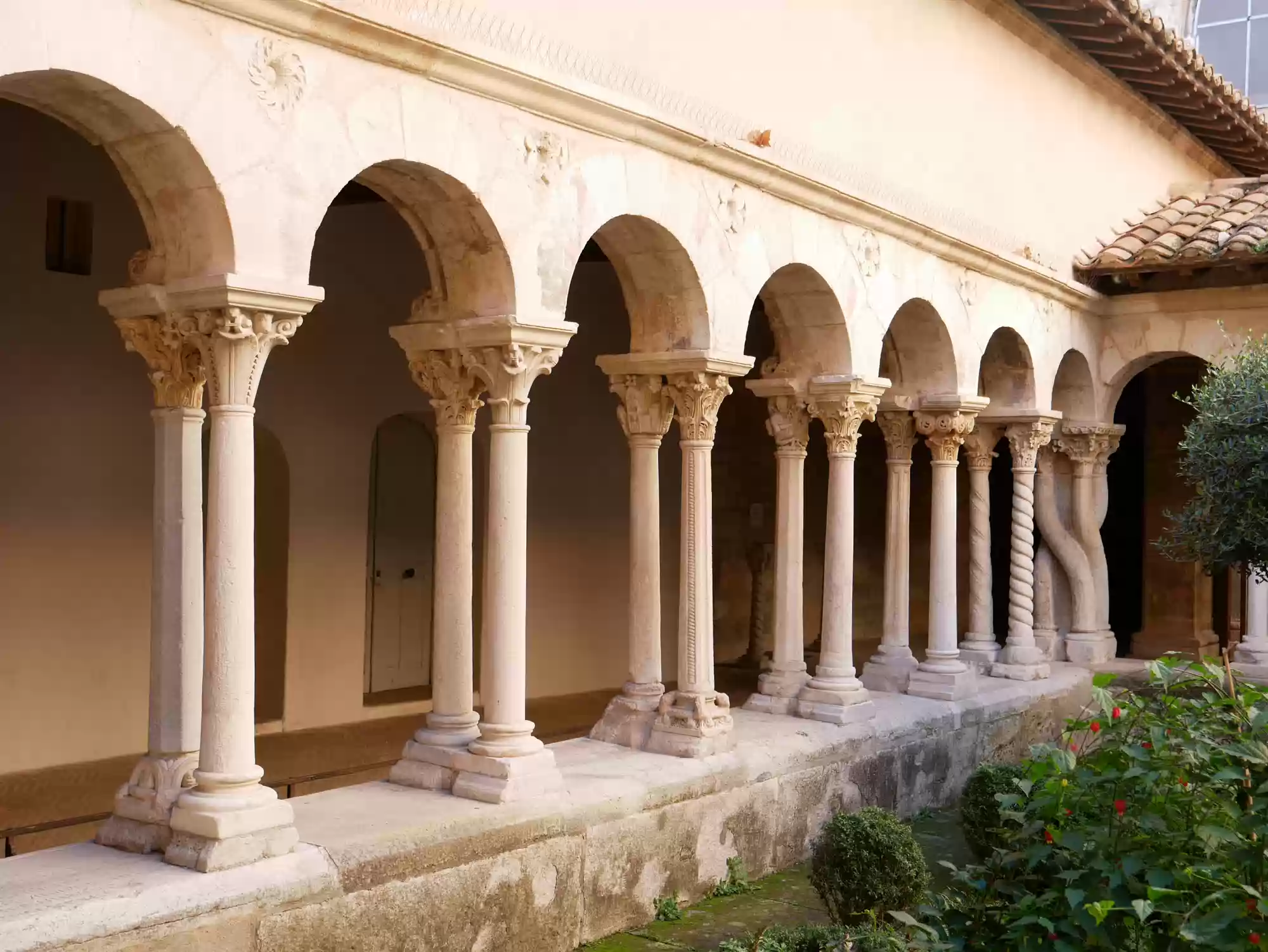 Romanesque cloister, 12th century. Almost all columns and capitals are original, except for a few marble columns reused from former Roman constructions on the…