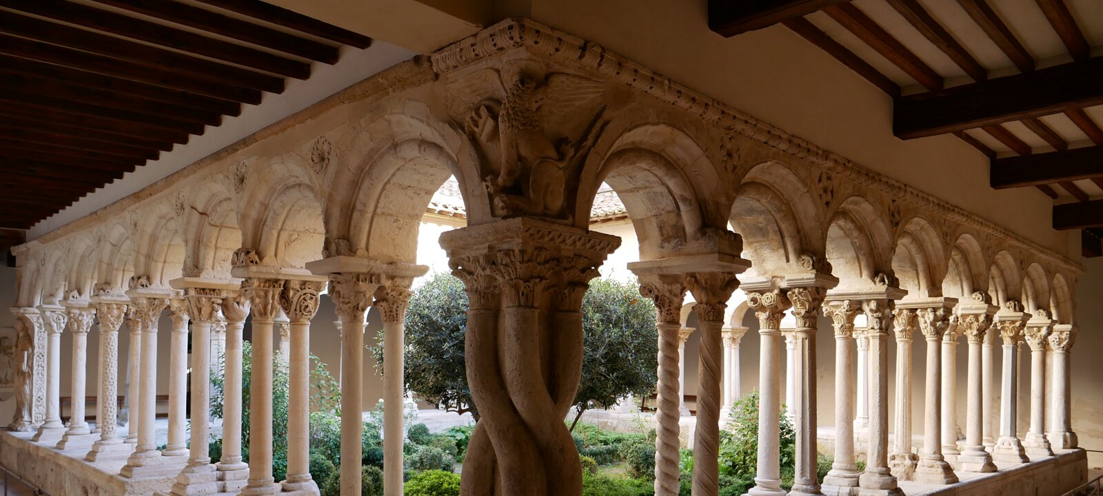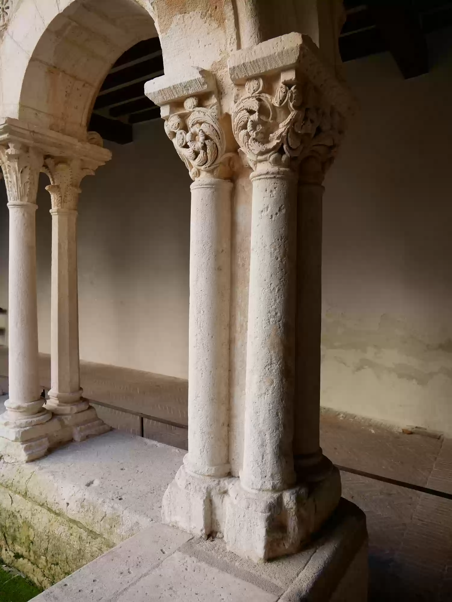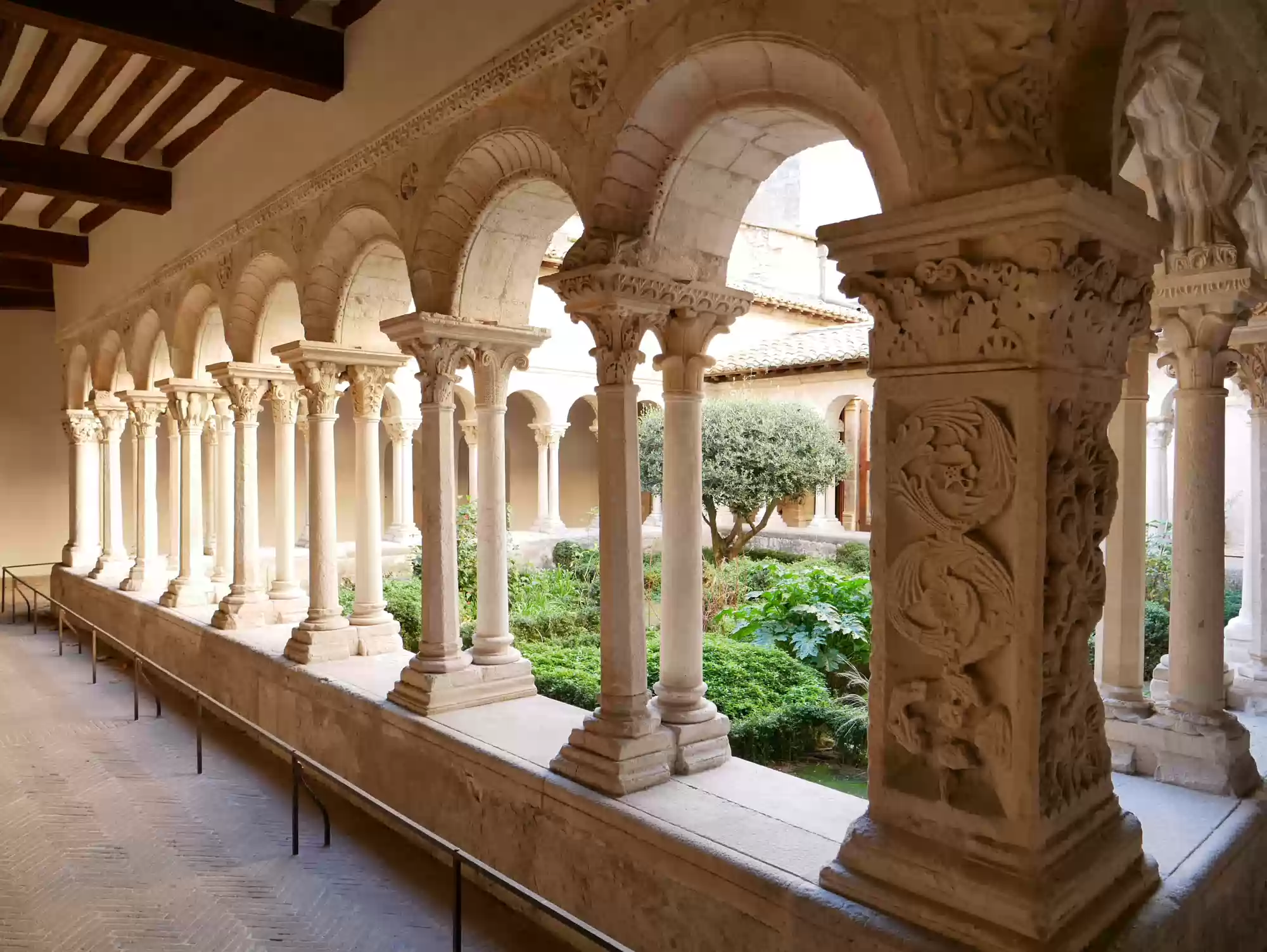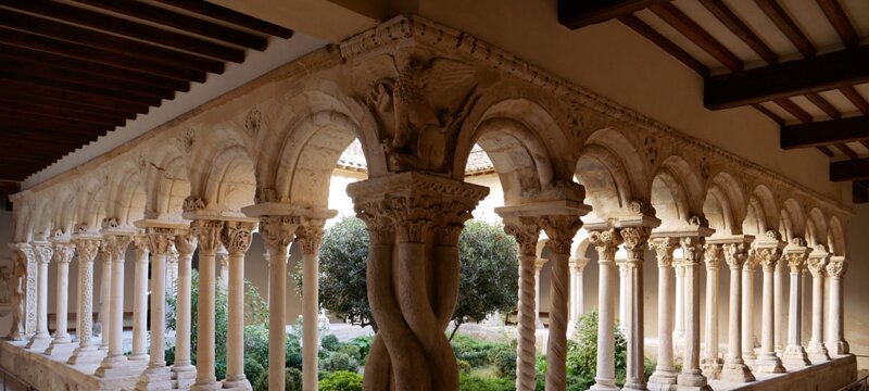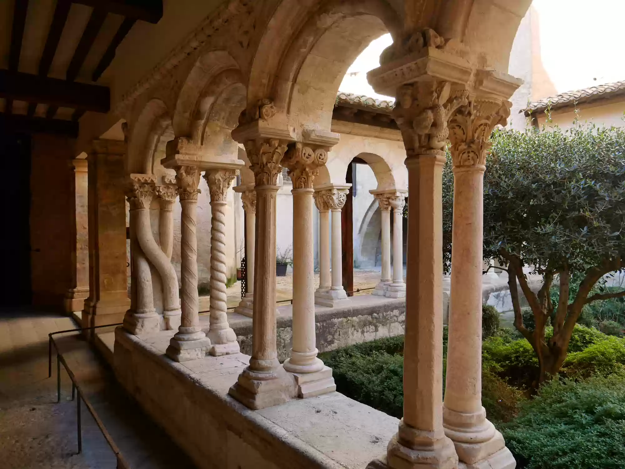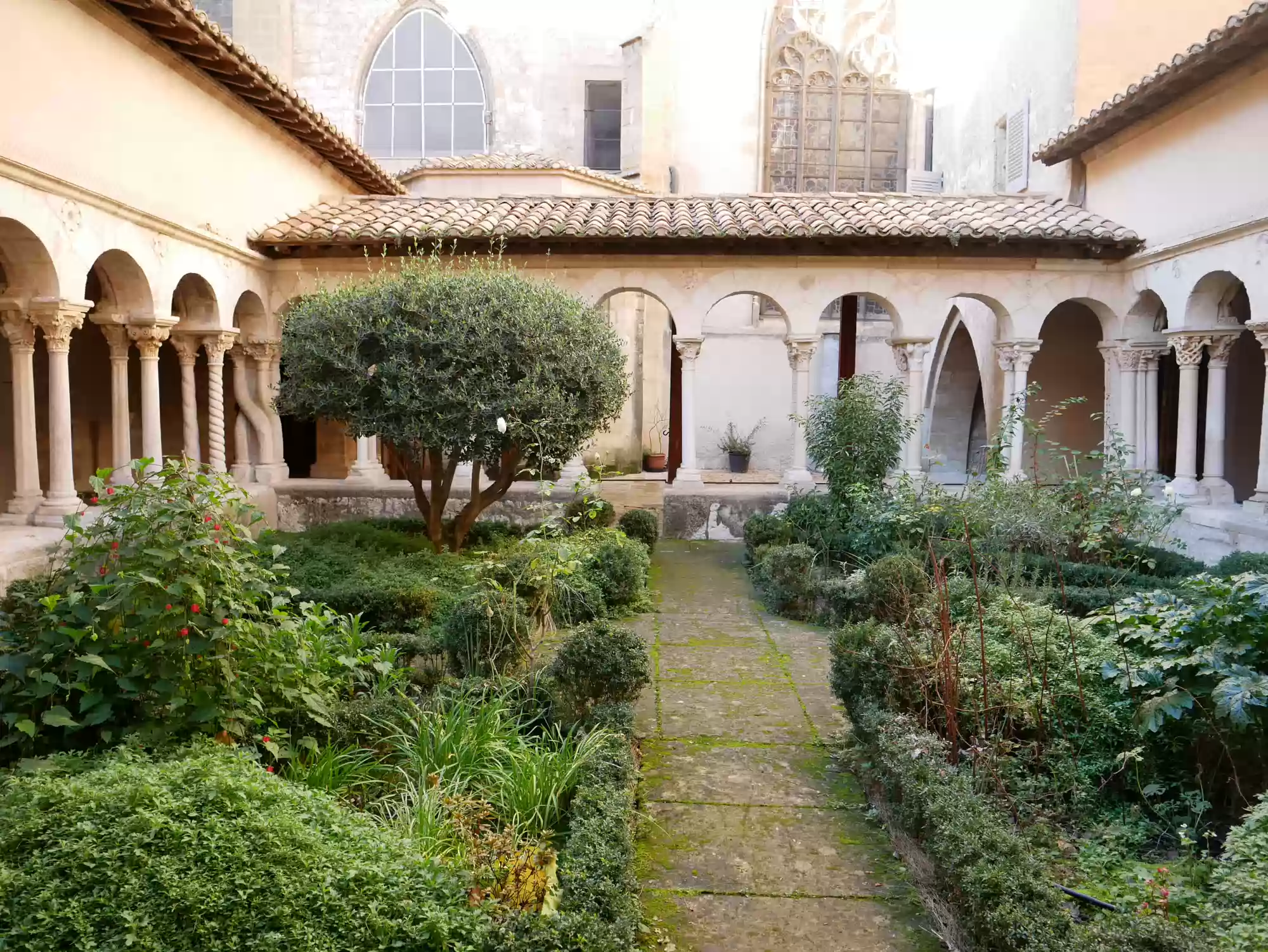 Romanesque cloister, 12th century. Almost all columns and capitals are original, except for a few marble columns reused from former Roman constructions on the…