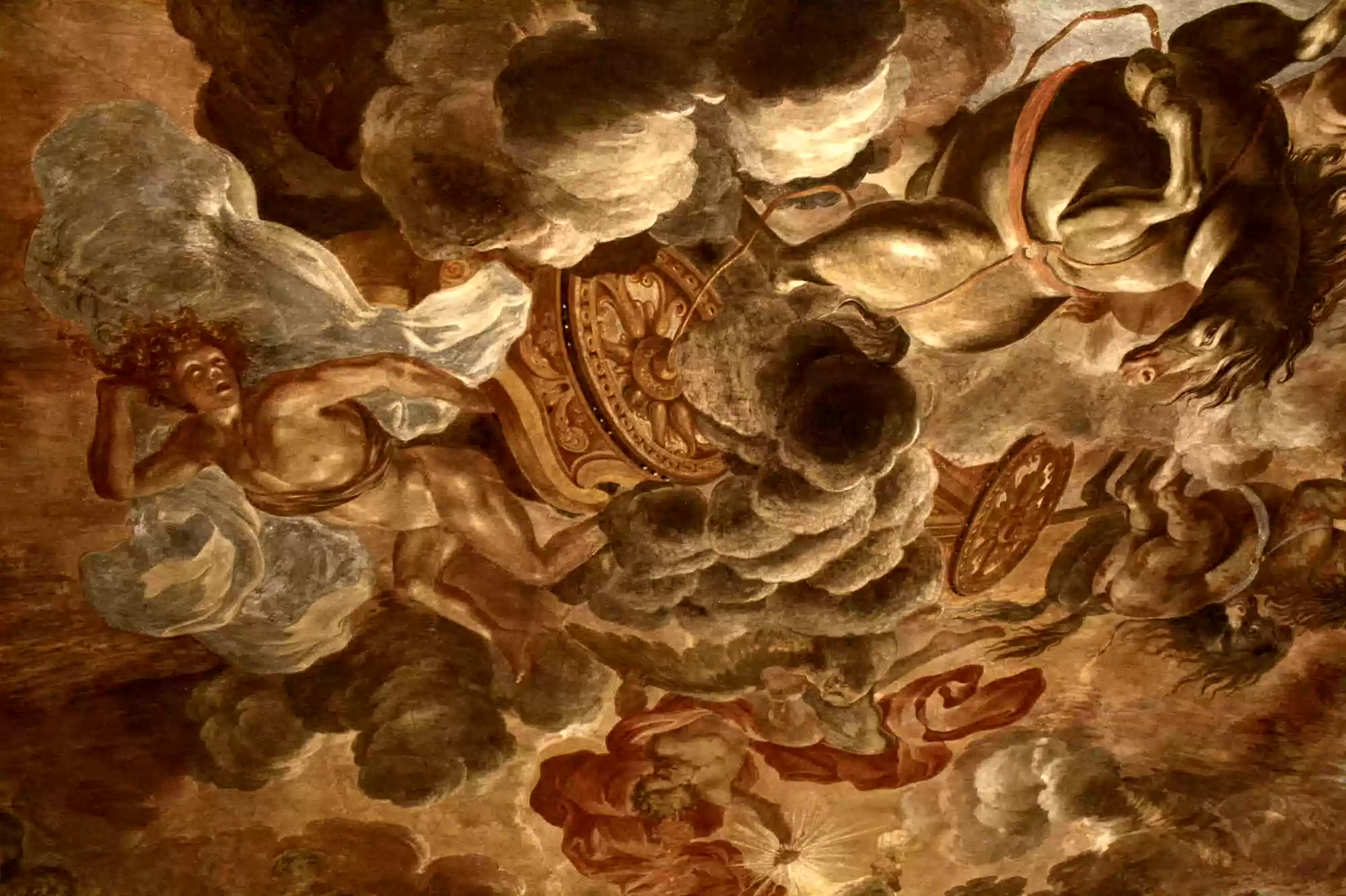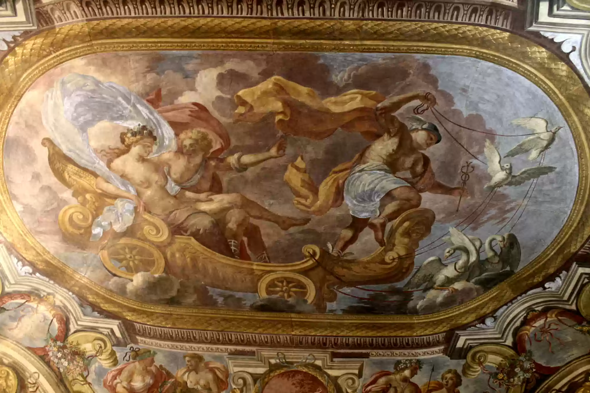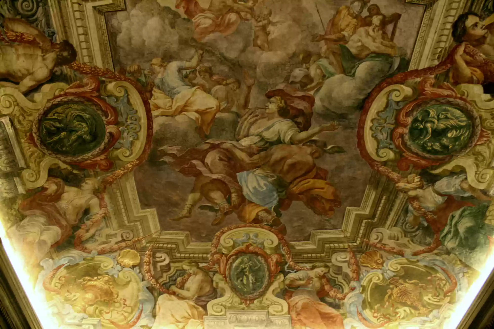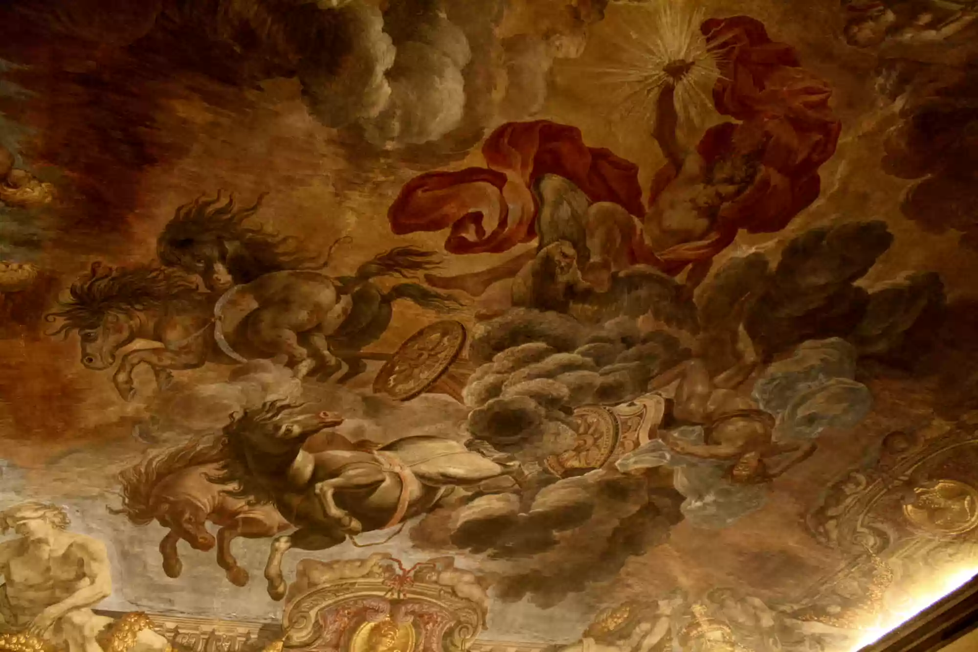 Main room, known as the Phaeton room. The ceiling painting depicts the fall of Phaeton struck by Jupiter. Genoa school, late 17th century.