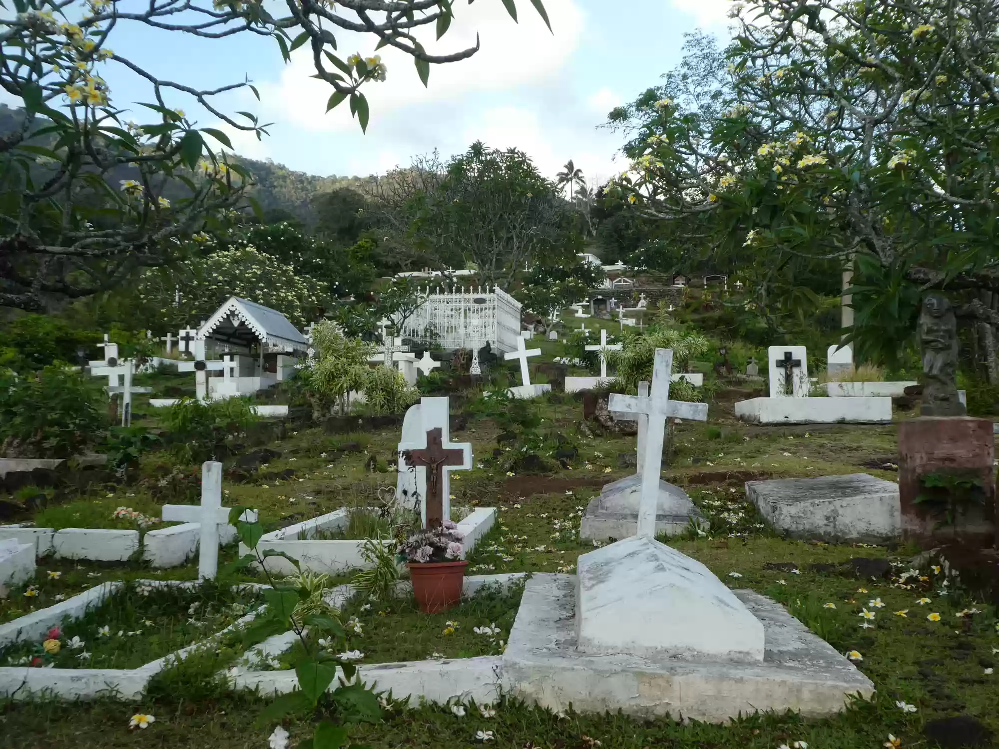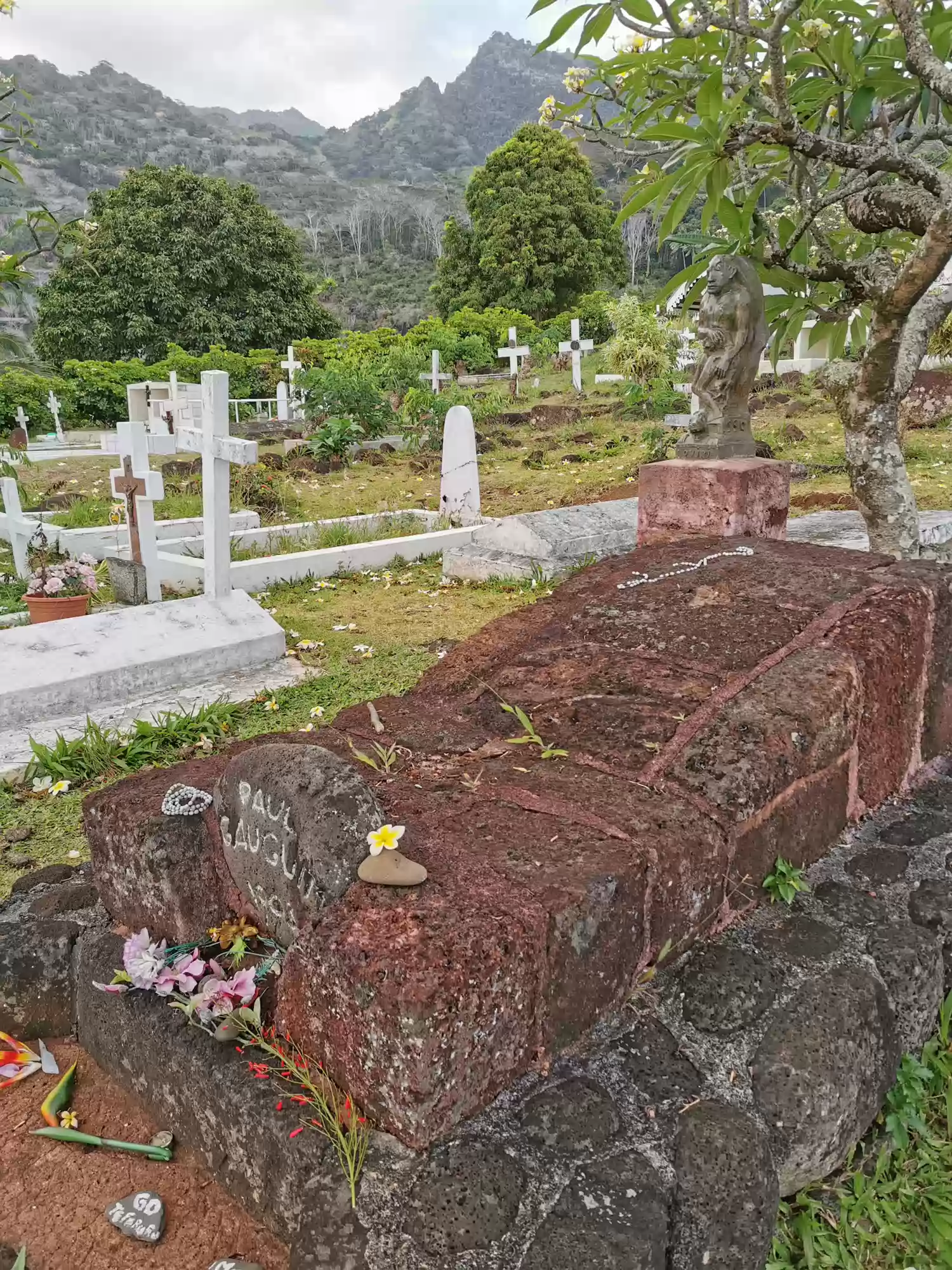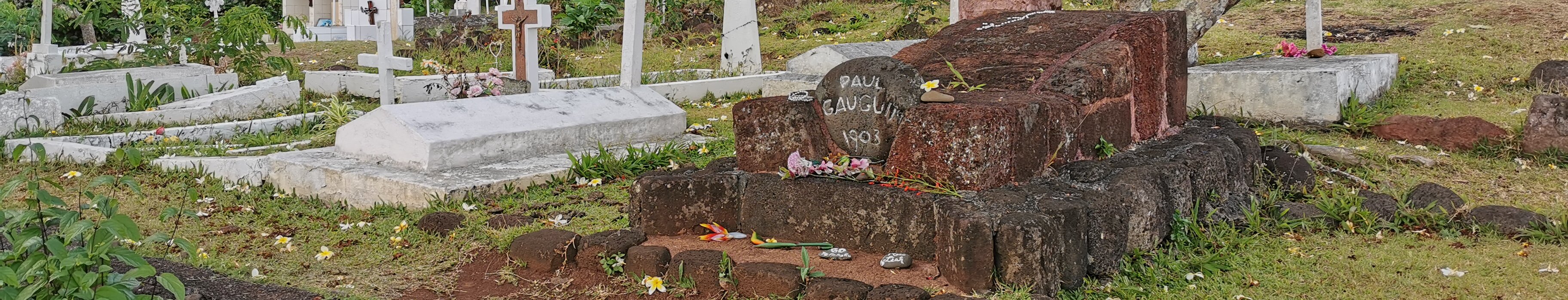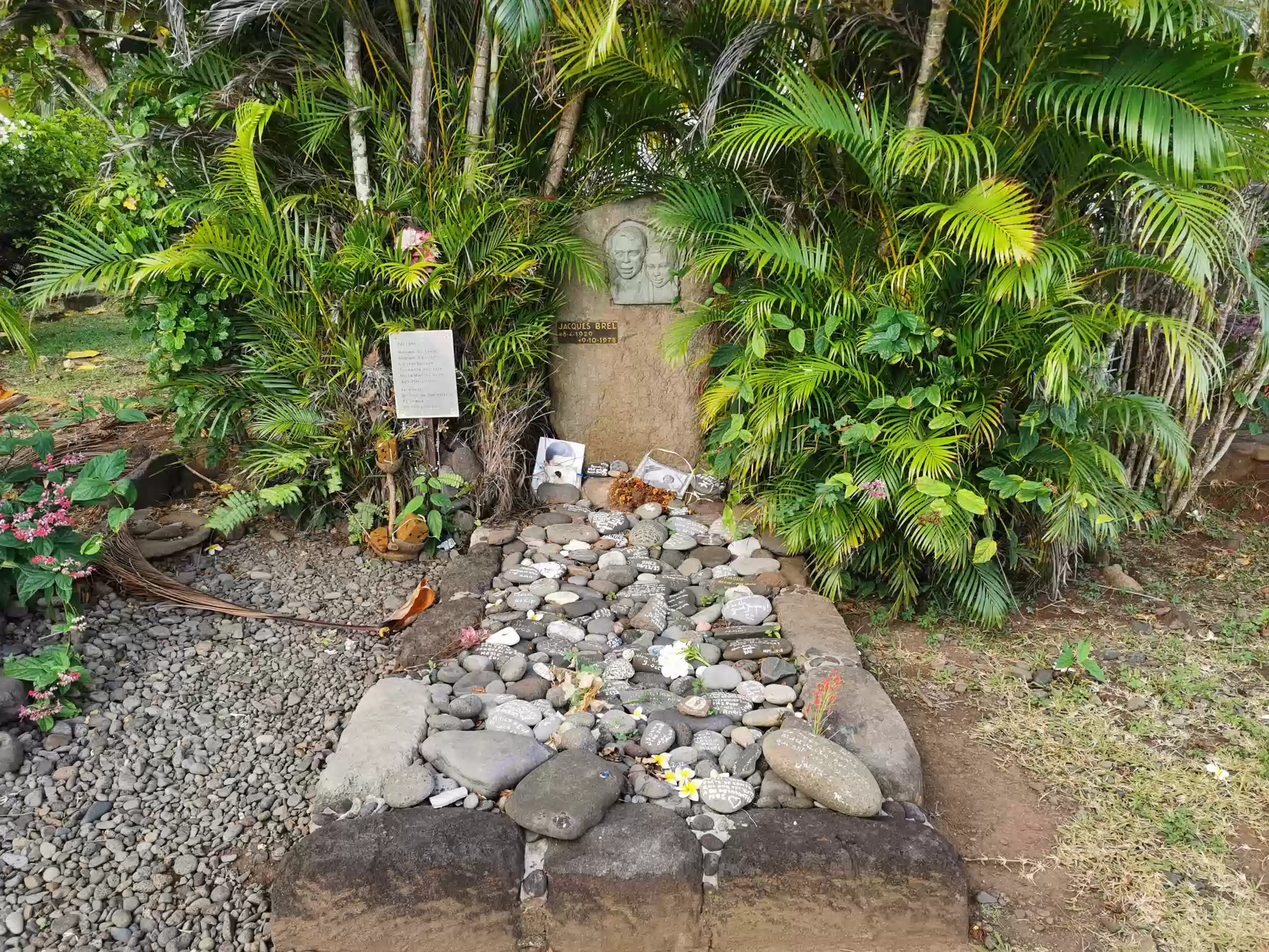 Grave of Paul Gauguin, 7 June 1848 - 8 May 1903. Grave of Paul Gauguin, 7 June 1848 - 8 May 1903. Grave of Paul Gauguin, 7 June 1848 - 8 May 1903. Bronze replica of his sculpture "Oviri", kept in Orsay museum . Tomb of Jacques Brel, 8 april 1929 - 9 octobre 1978. Church Labels