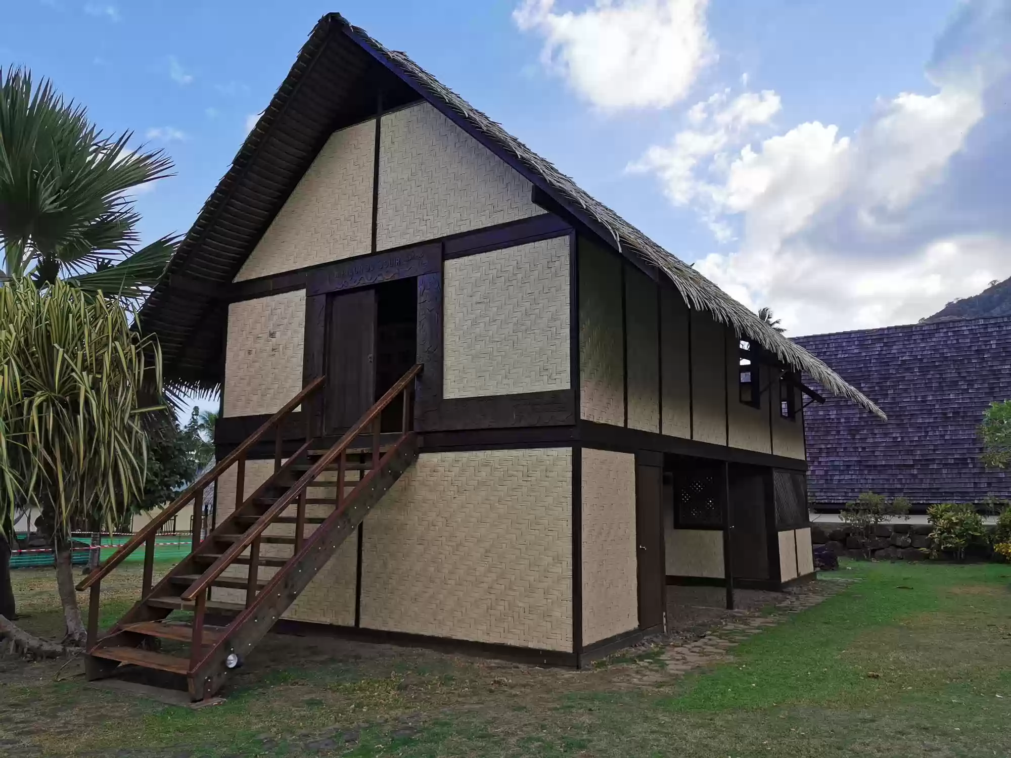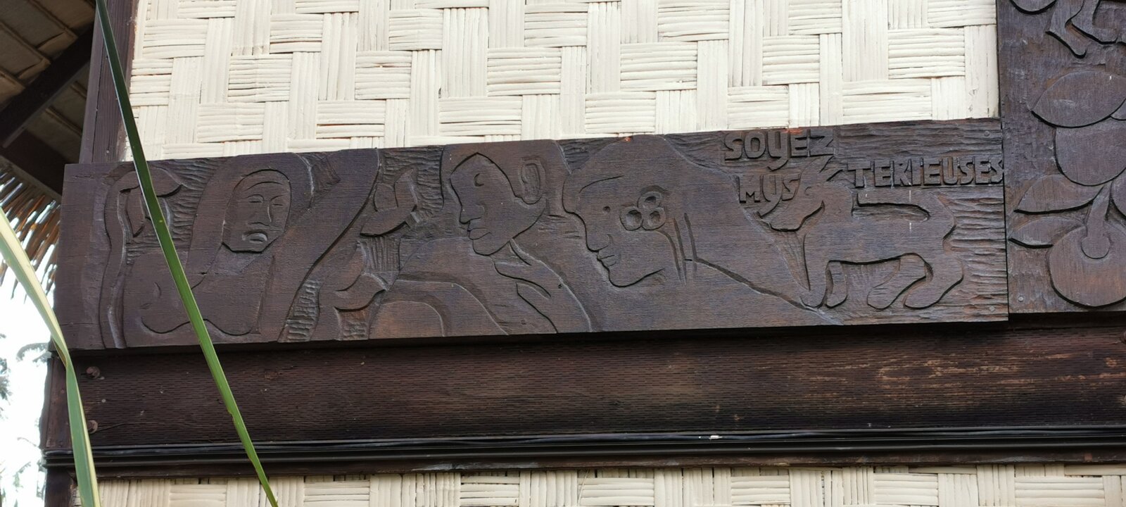 Paul Gauguin's house, "La maison du jouir" (rebuilt in the 2000s). The original carvings, by Gauguin himself, can be found in the Orsay museum .