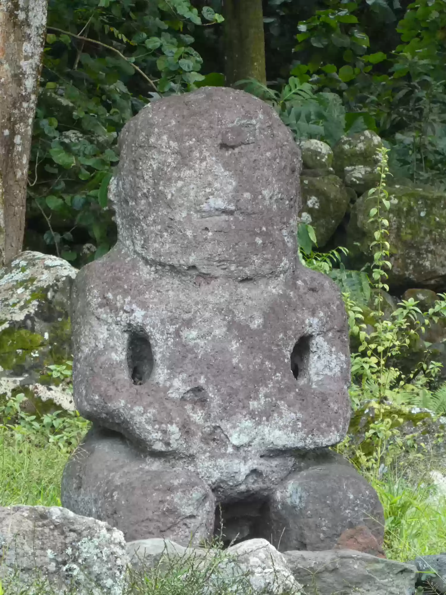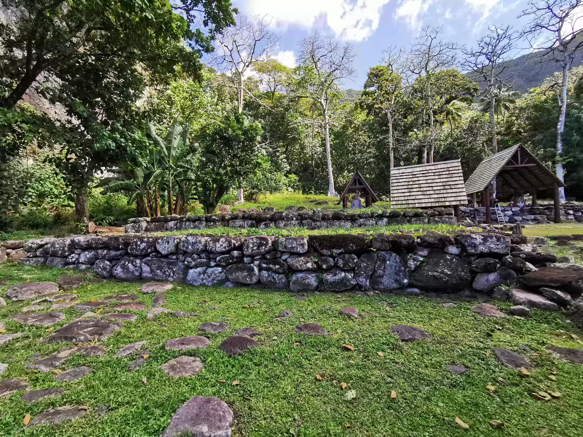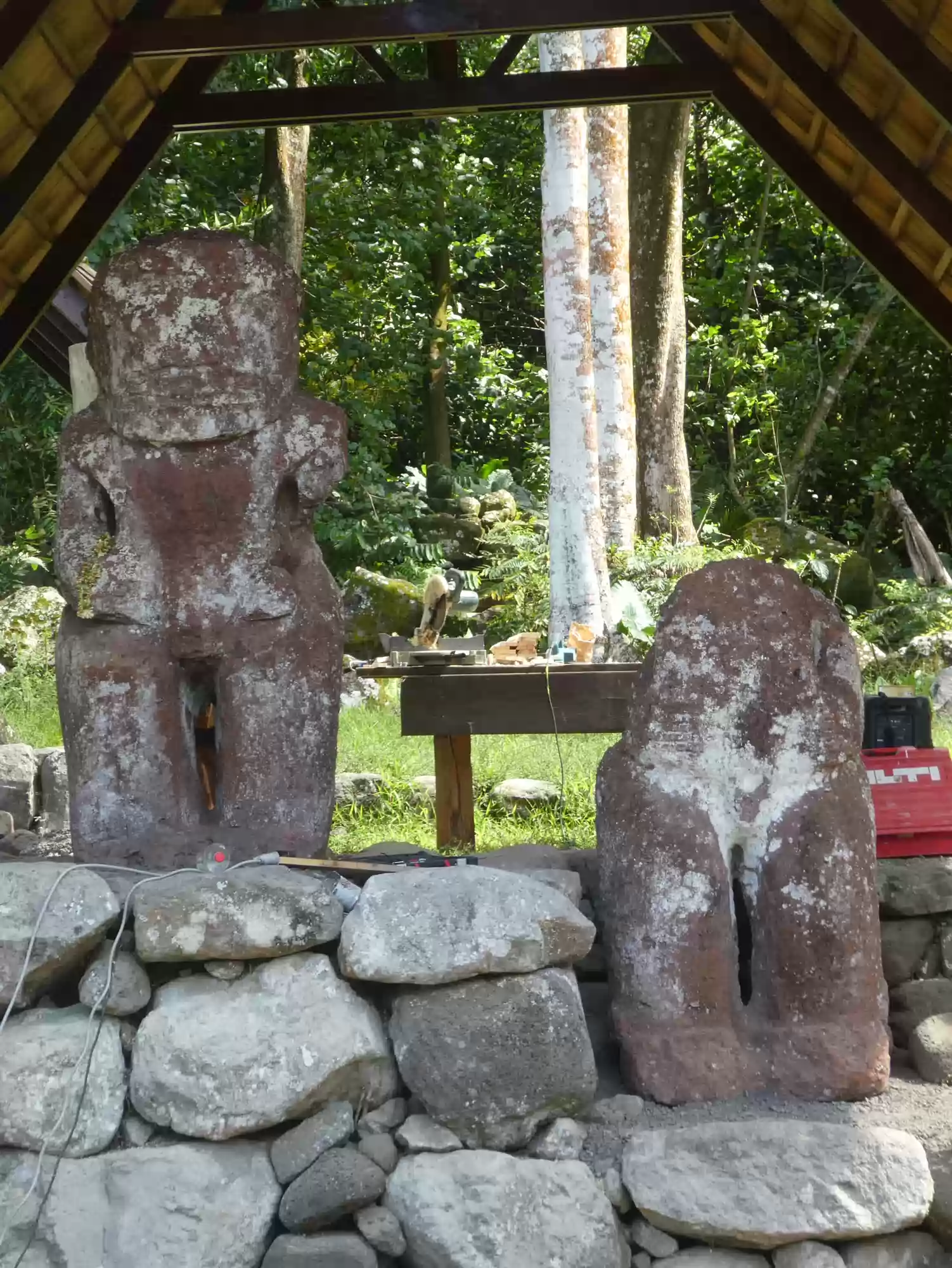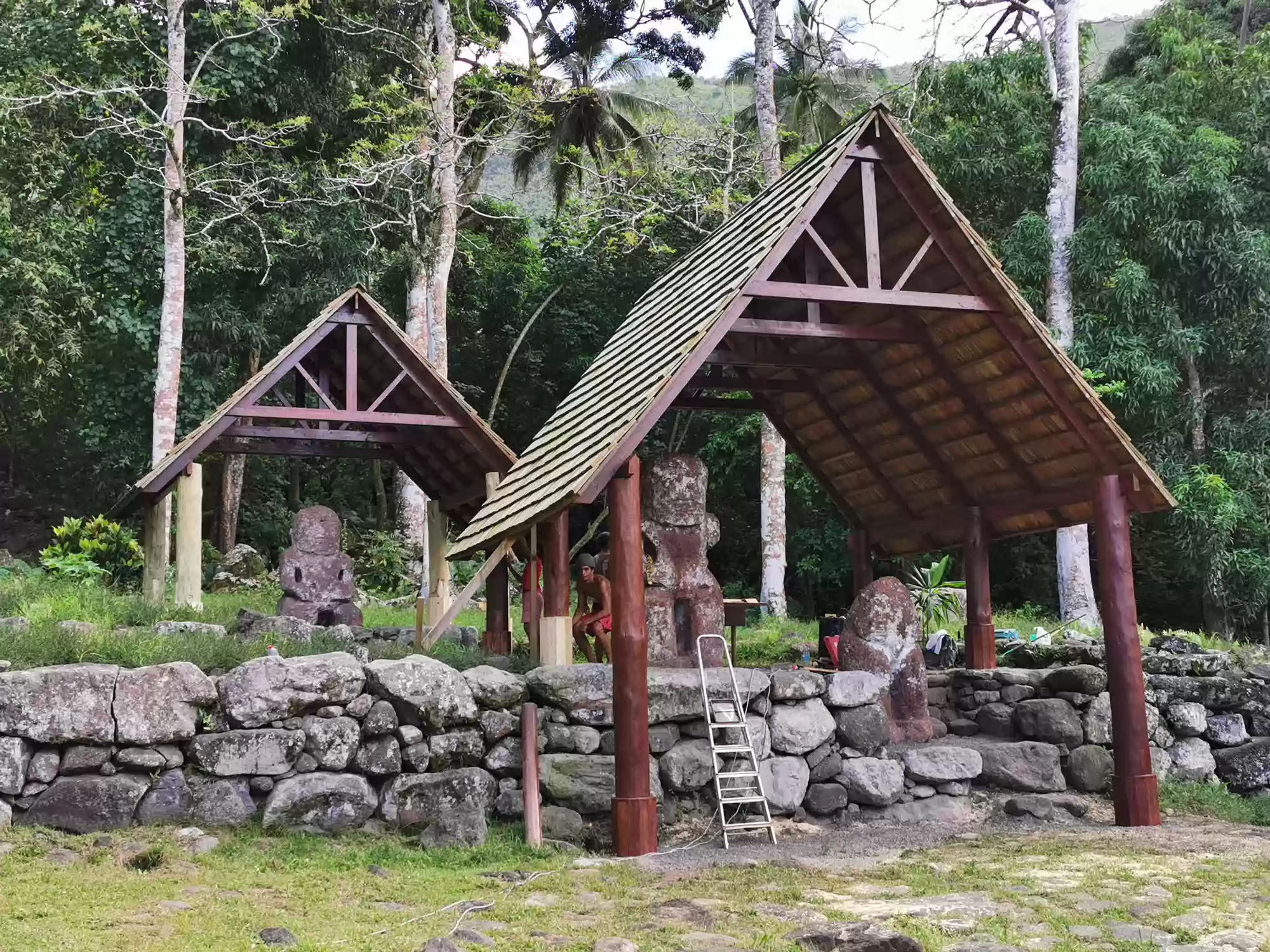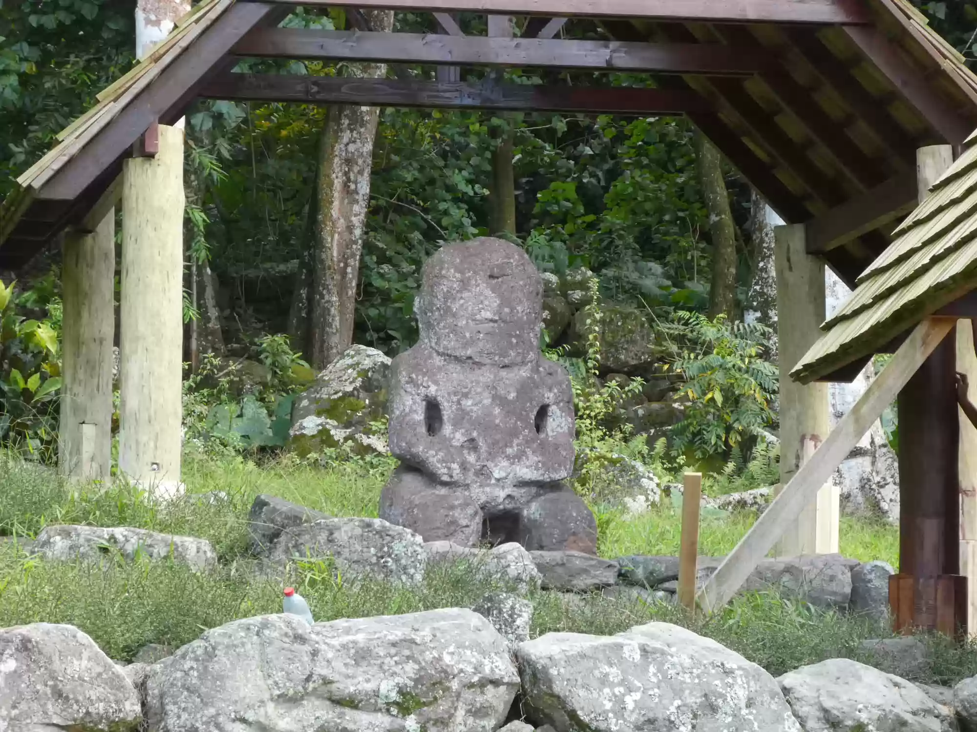 Meae, a sacred space from the pre-christian era. The statues or tiki depict deified ancestors. House of the lord. 3 tikis: the wife, the lord and their son. Grand tiki, 2.67 meters tall, the tallest in French Polynesia (left). Grand tiki, 2.67 meters tall, the tallest in French Polynesia. Sacrifice altar. Crouching tiki, the only one of its kind. Bottom: carving of an animal on the crouching tiki. Labels