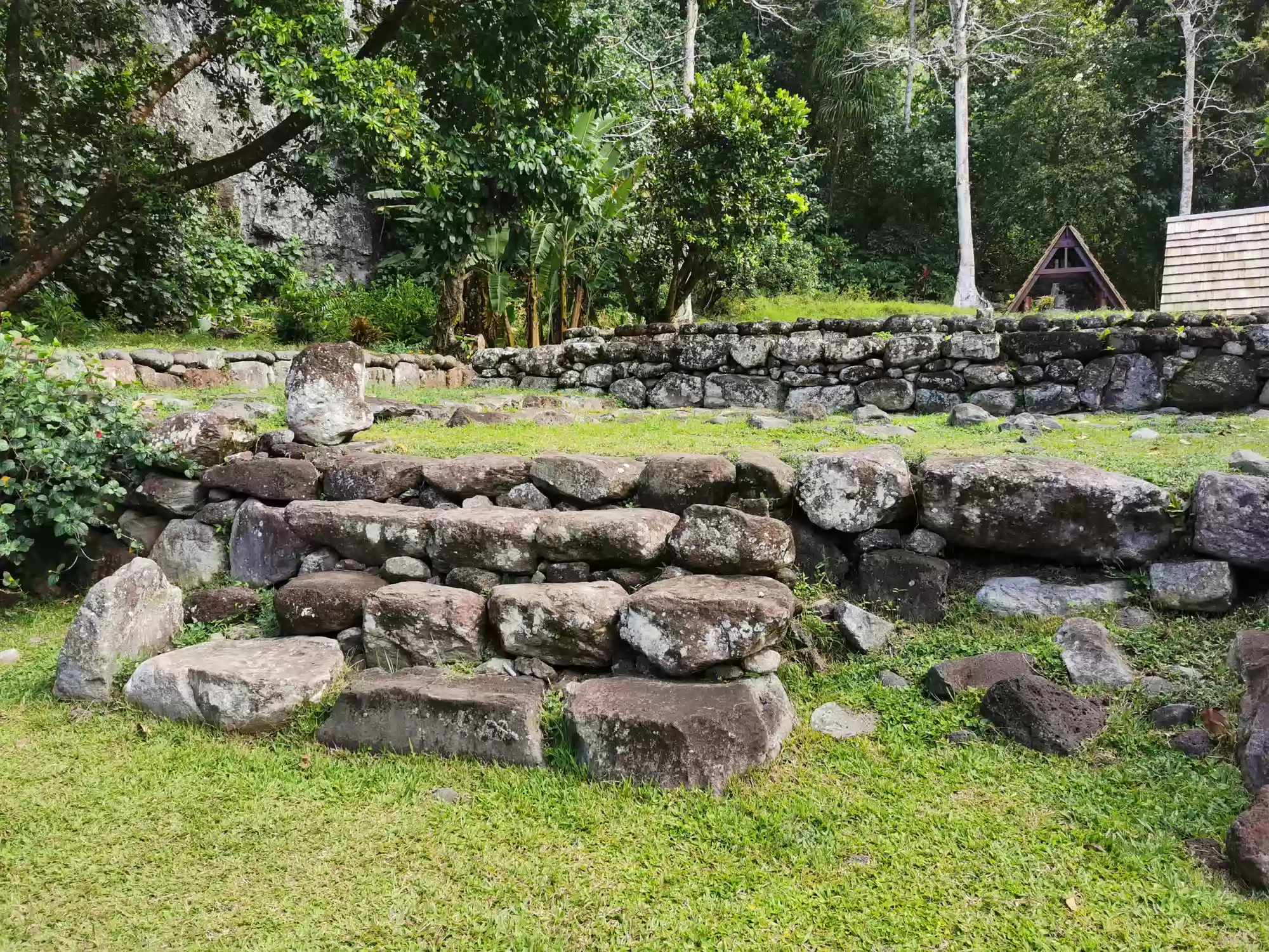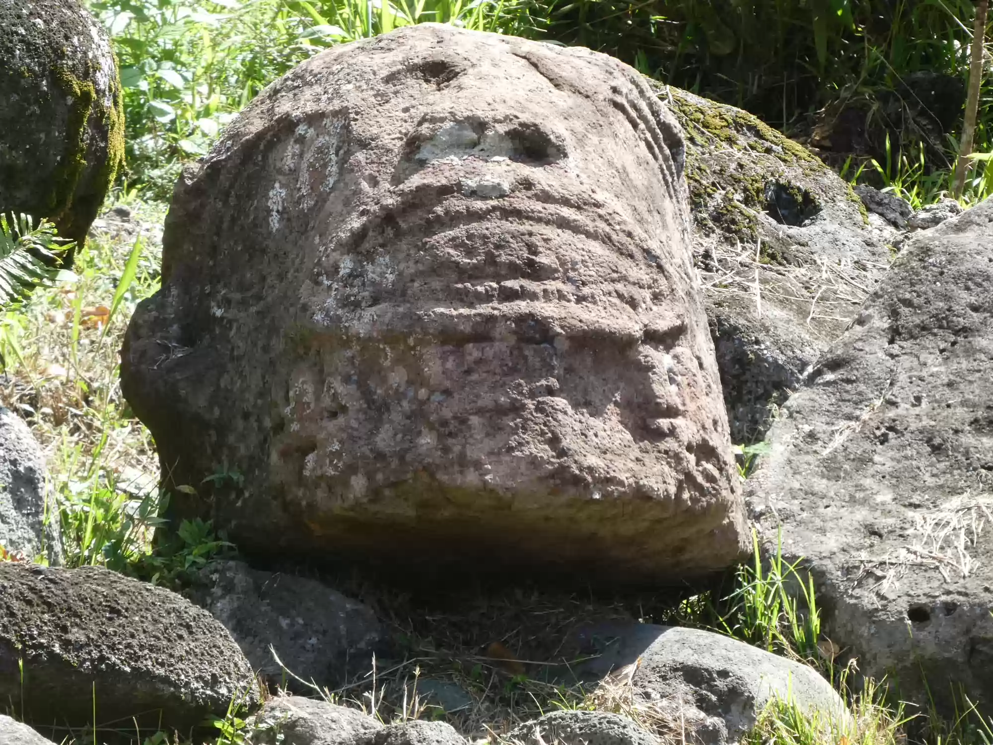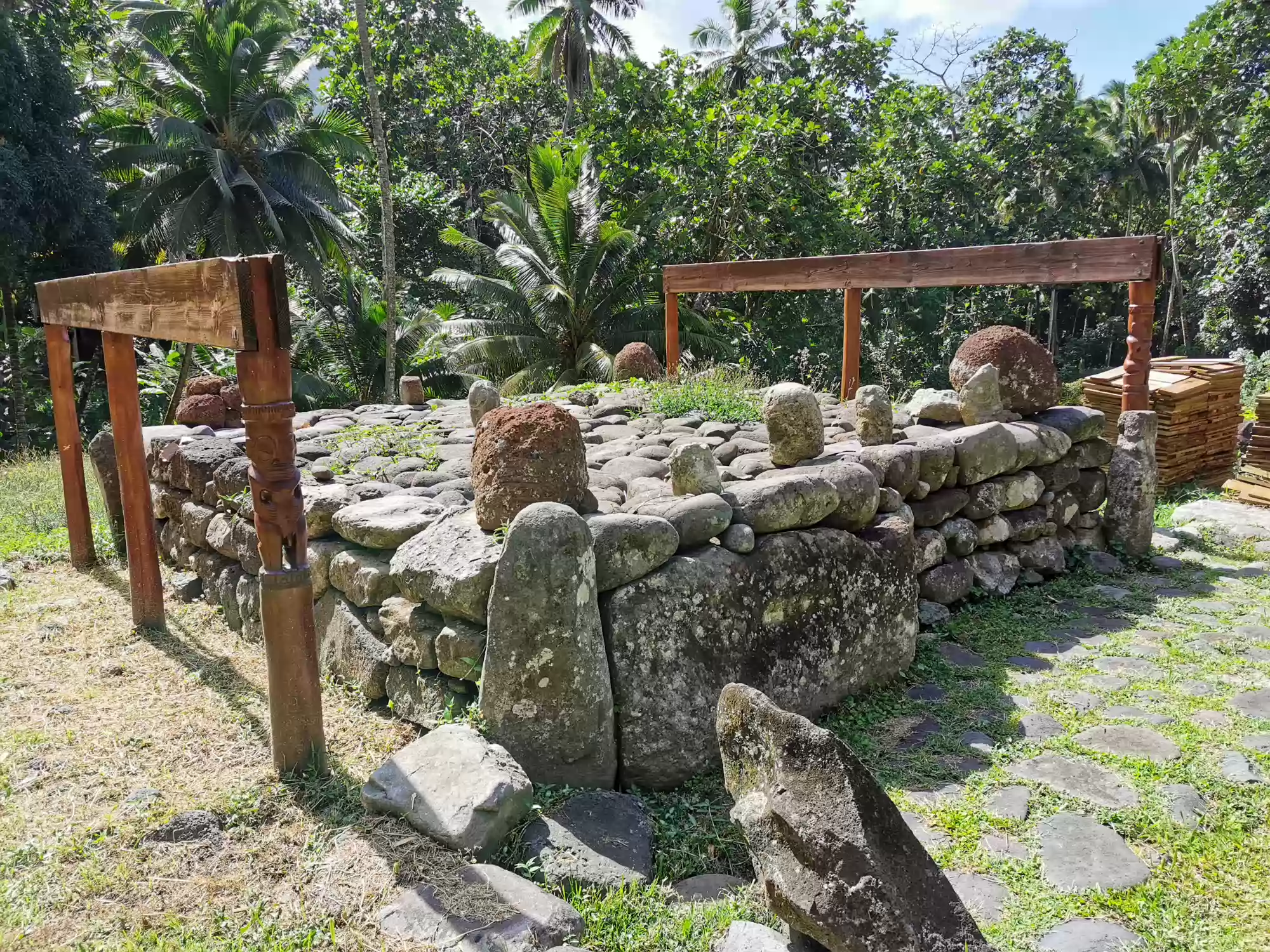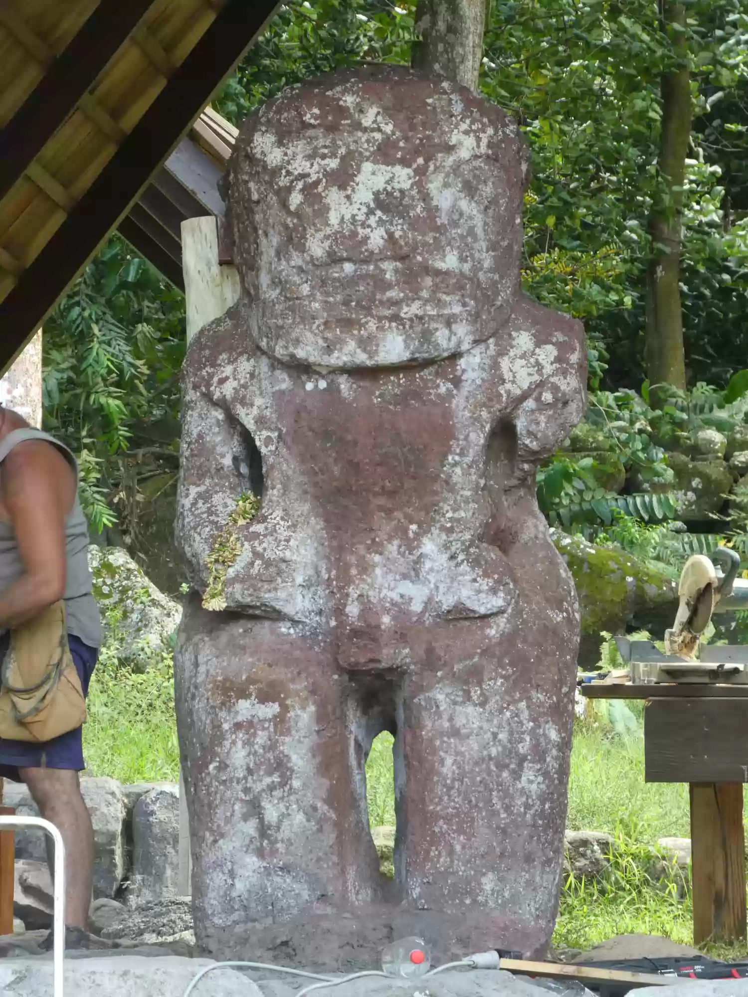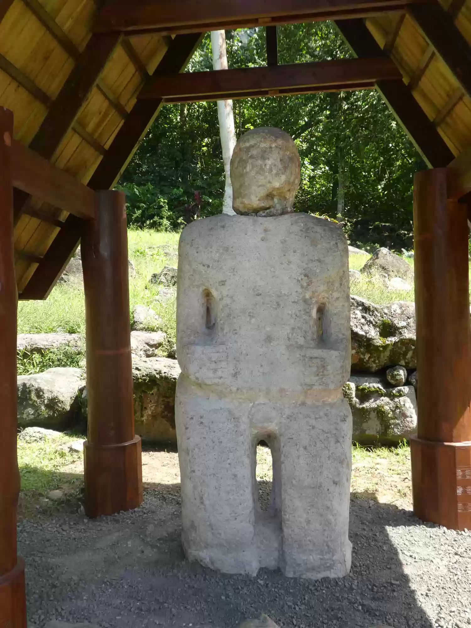 Meae, a sacred space from the pre-christian era. The statues or tiki depict deified ancestors. House of the lord. 3 tikis: the wife, the lord and their son. Grand tiki, 2.67 meters tall, the tallest in French Polynesia (left). Grand tiki, 2.67 meters tall, the tallest in French Polynesia. Sacrifice altar. Crouching tiki, the only one of its kind. Bottom: carving of an animal on the crouching tiki. Labels