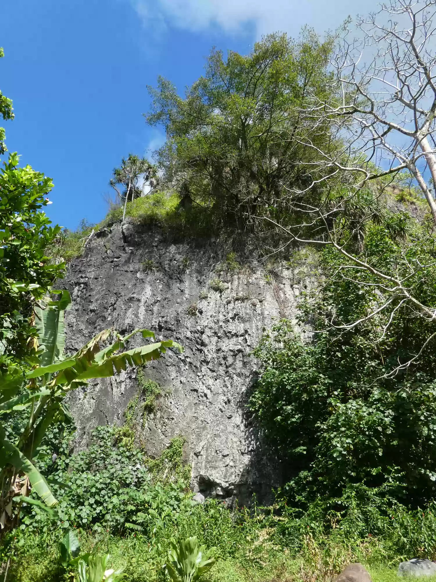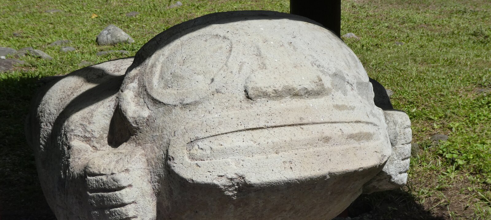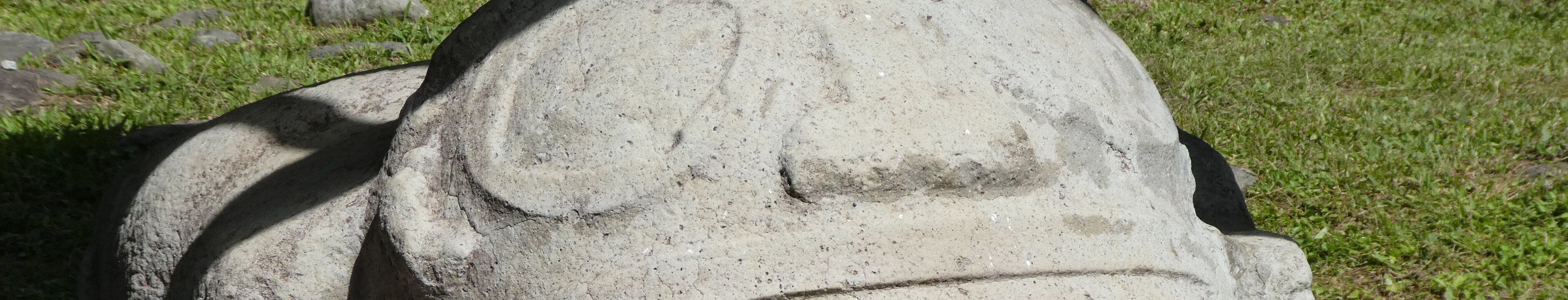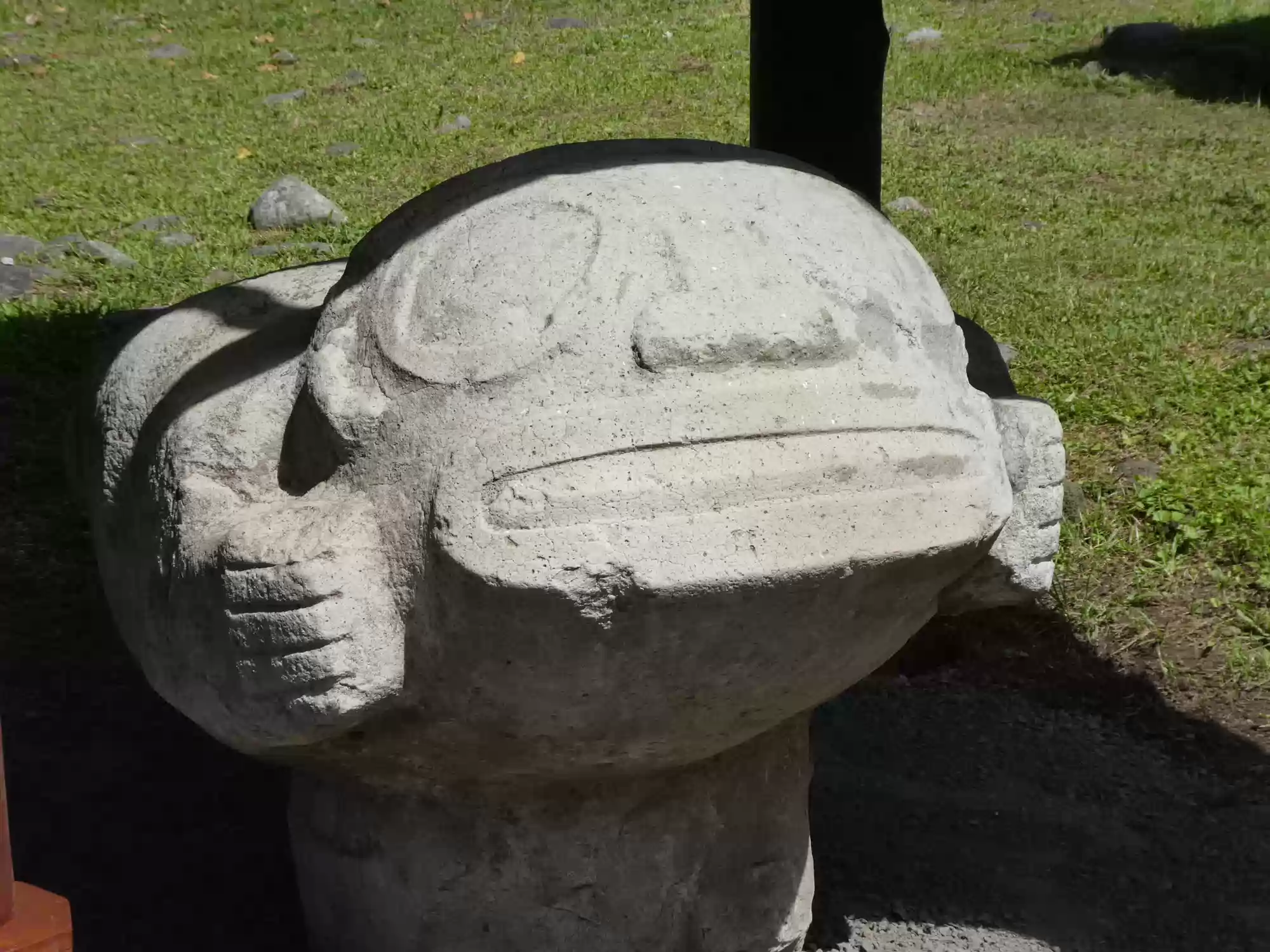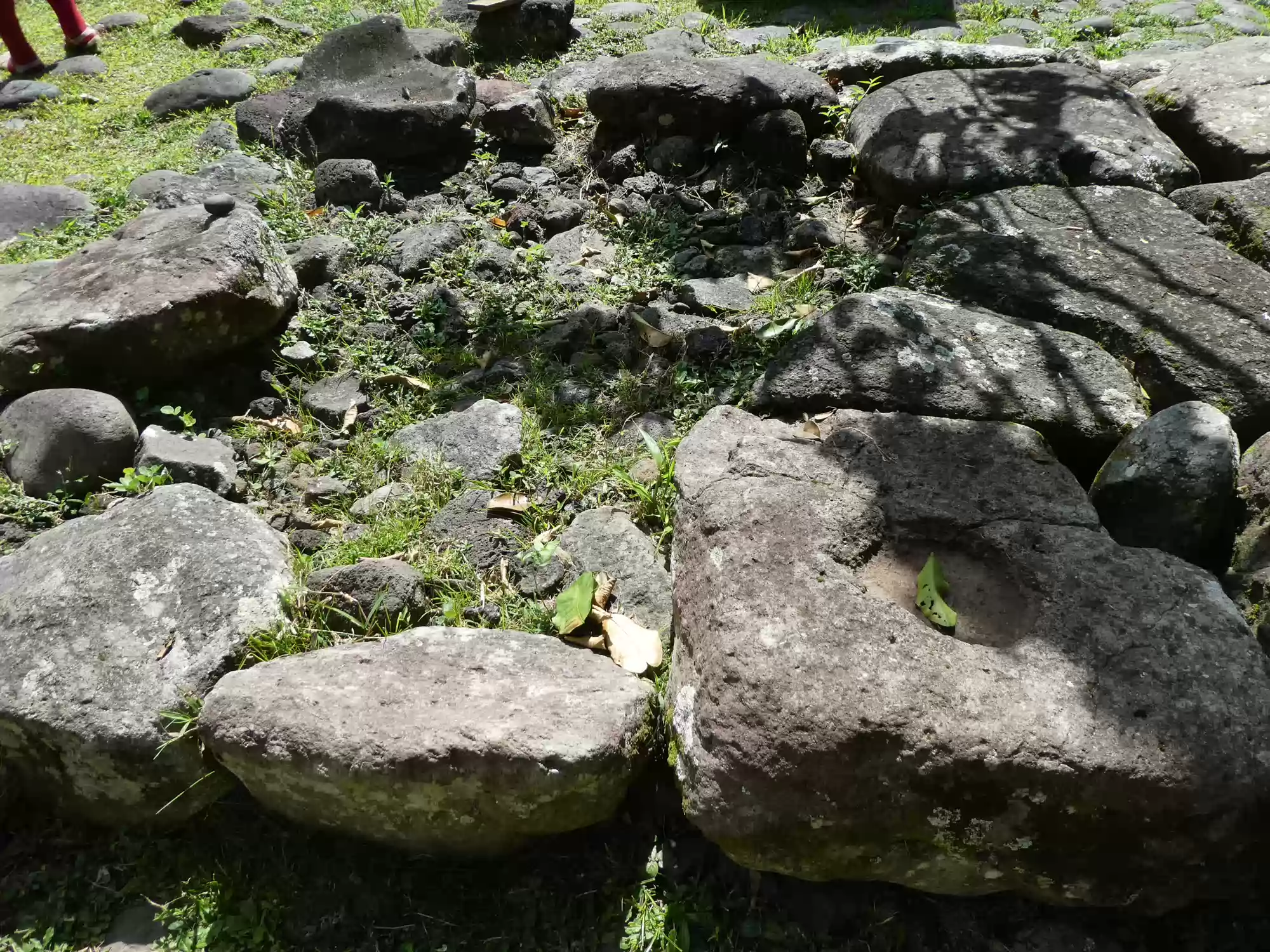 Meae, a sacred space from the pre-christian era. The statues or tiki depict deified ancestors. House of the lord. 3 tikis: the wife, the lord and their son. Grand tiki, 2.67 meters tall, the tallest in French Polynesia (left). Grand tiki, 2.67 meters tall, the tallest in French Polynesia. Sacrifice altar. Crouching tiki, the only one of its kind. Bottom: carving of an animal on the crouching tiki. Labels