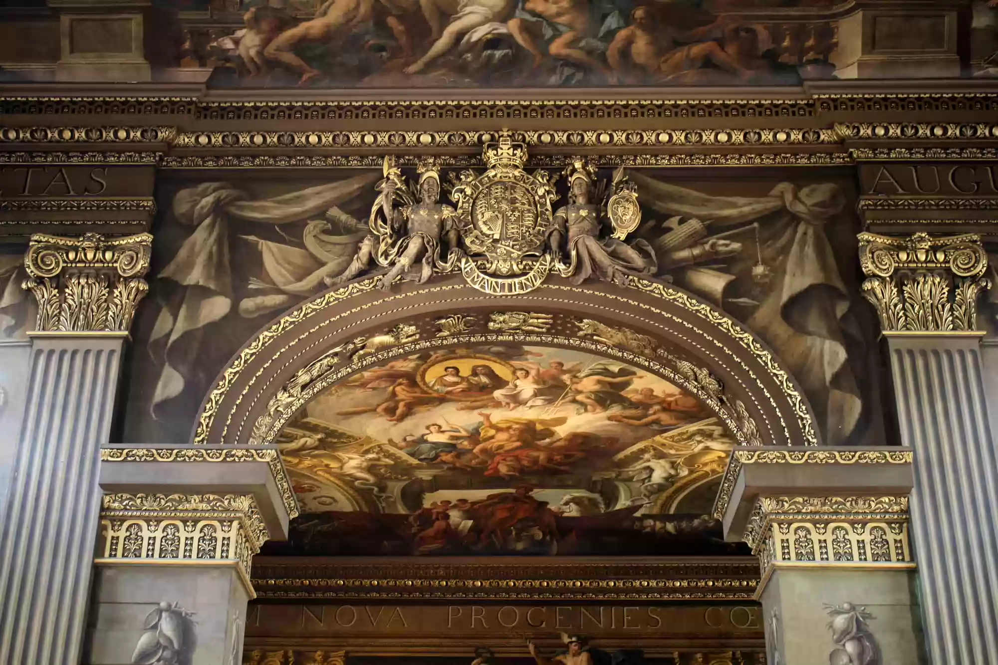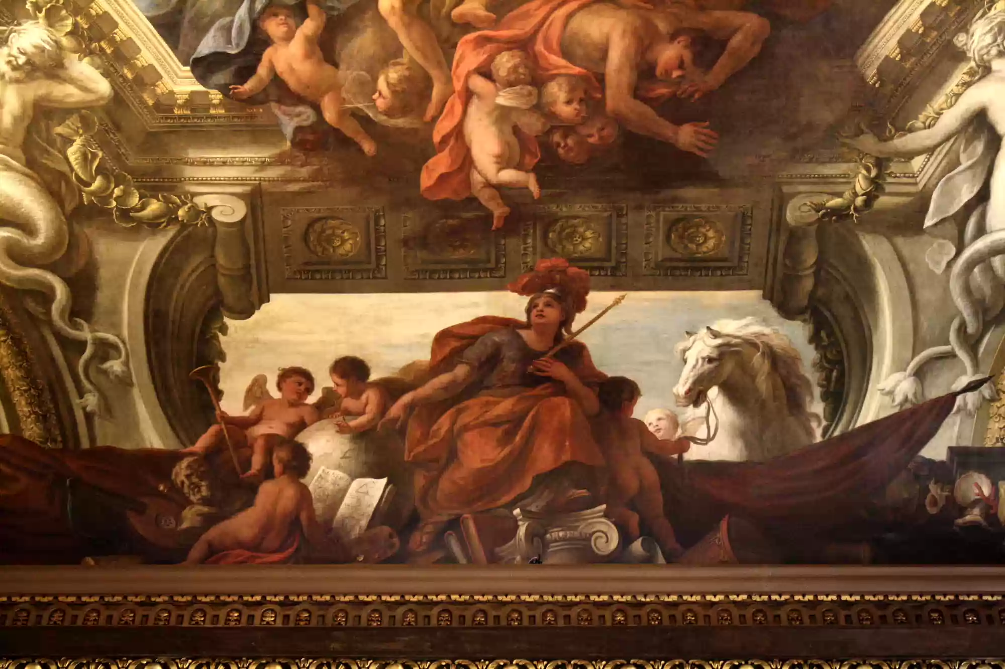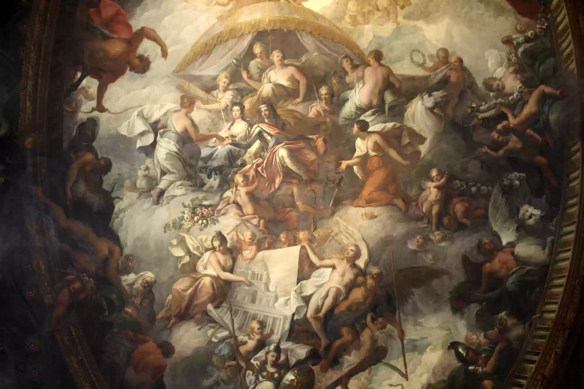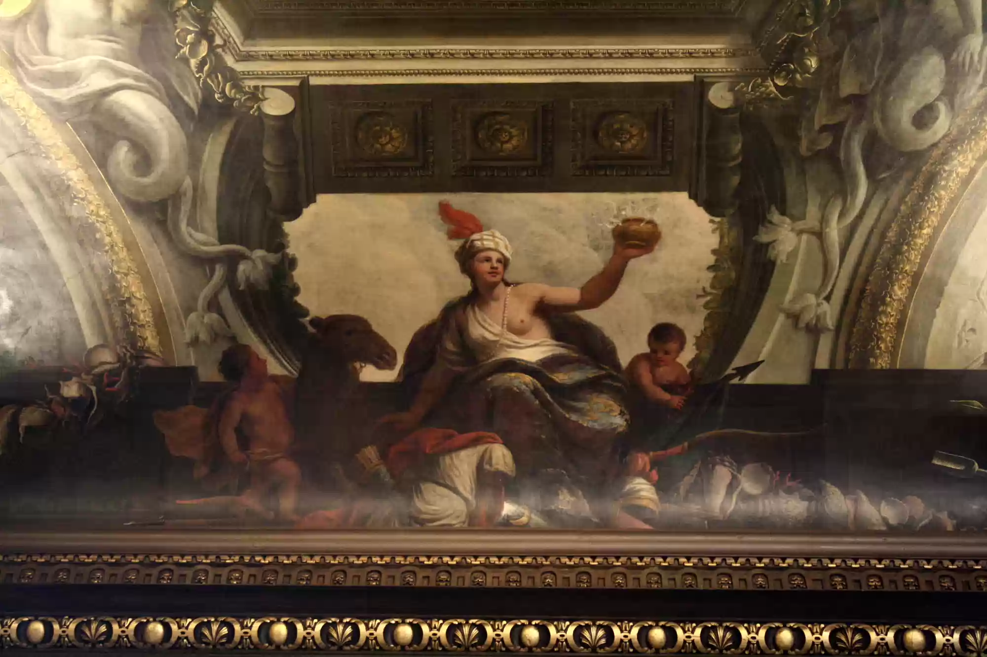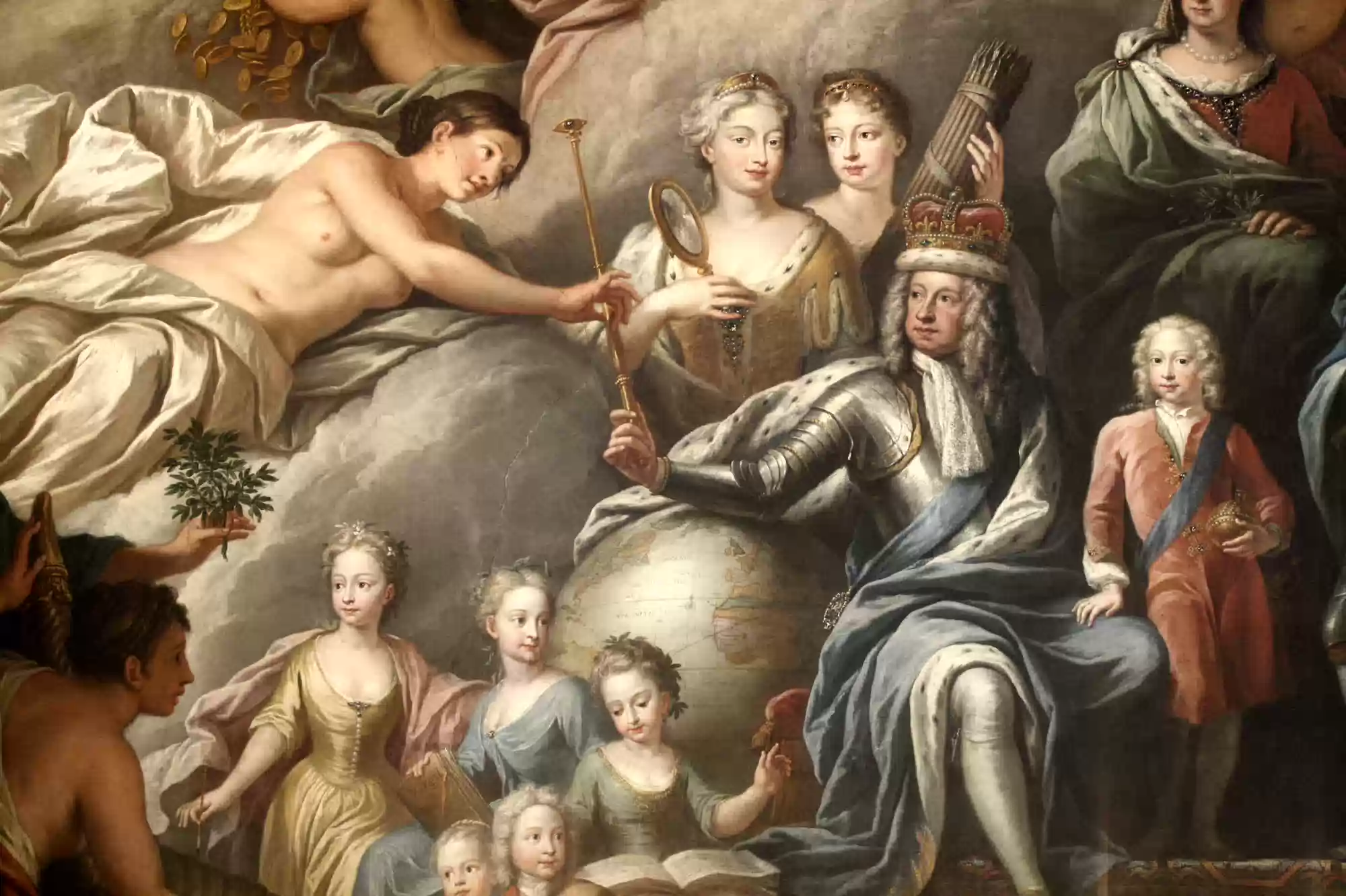 Painted hall was built in the first half of the 18th century and painted in 1779-1789. George I, his family and his virtues. Europe. America. Africa. Asia. Labels