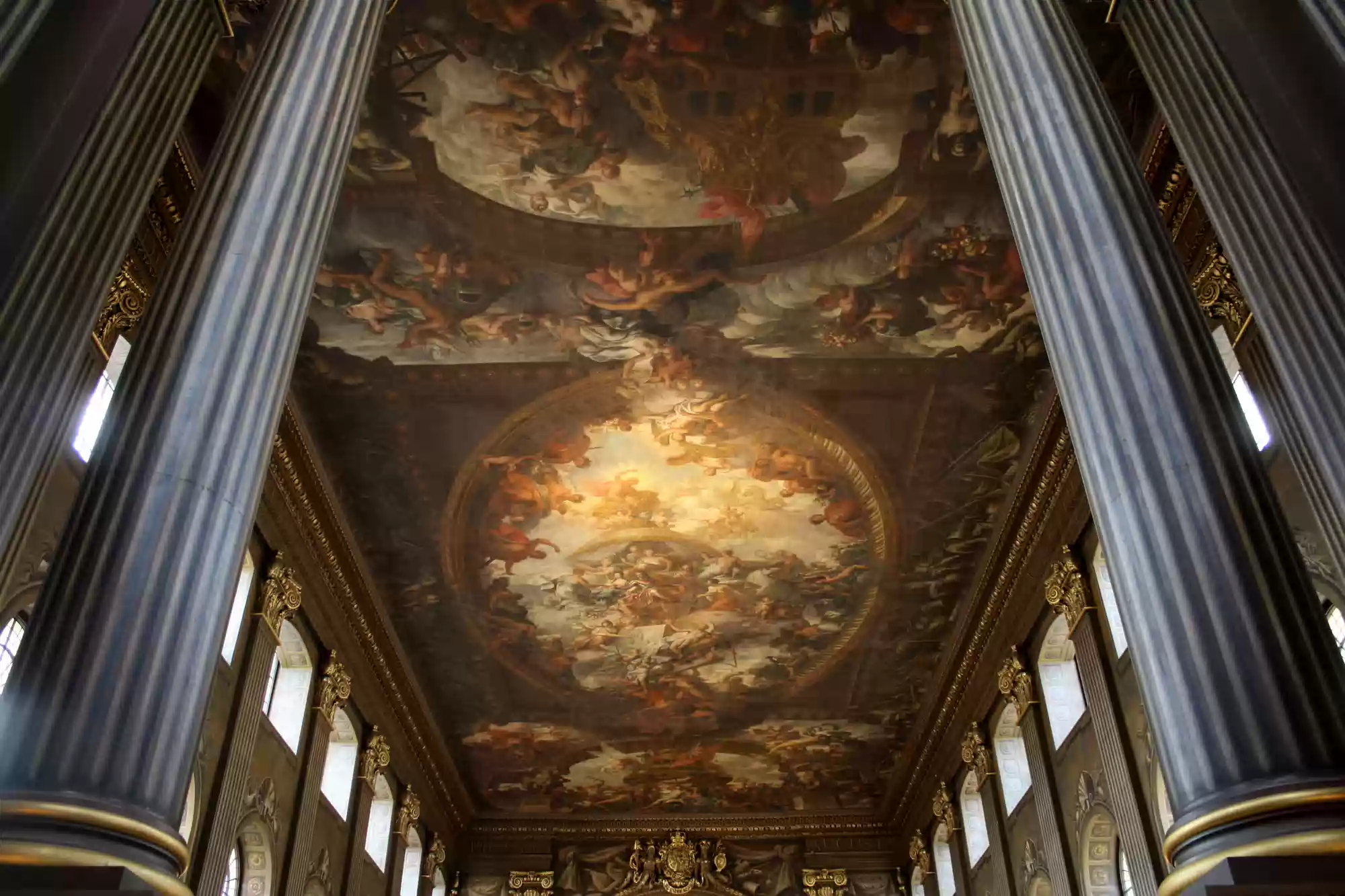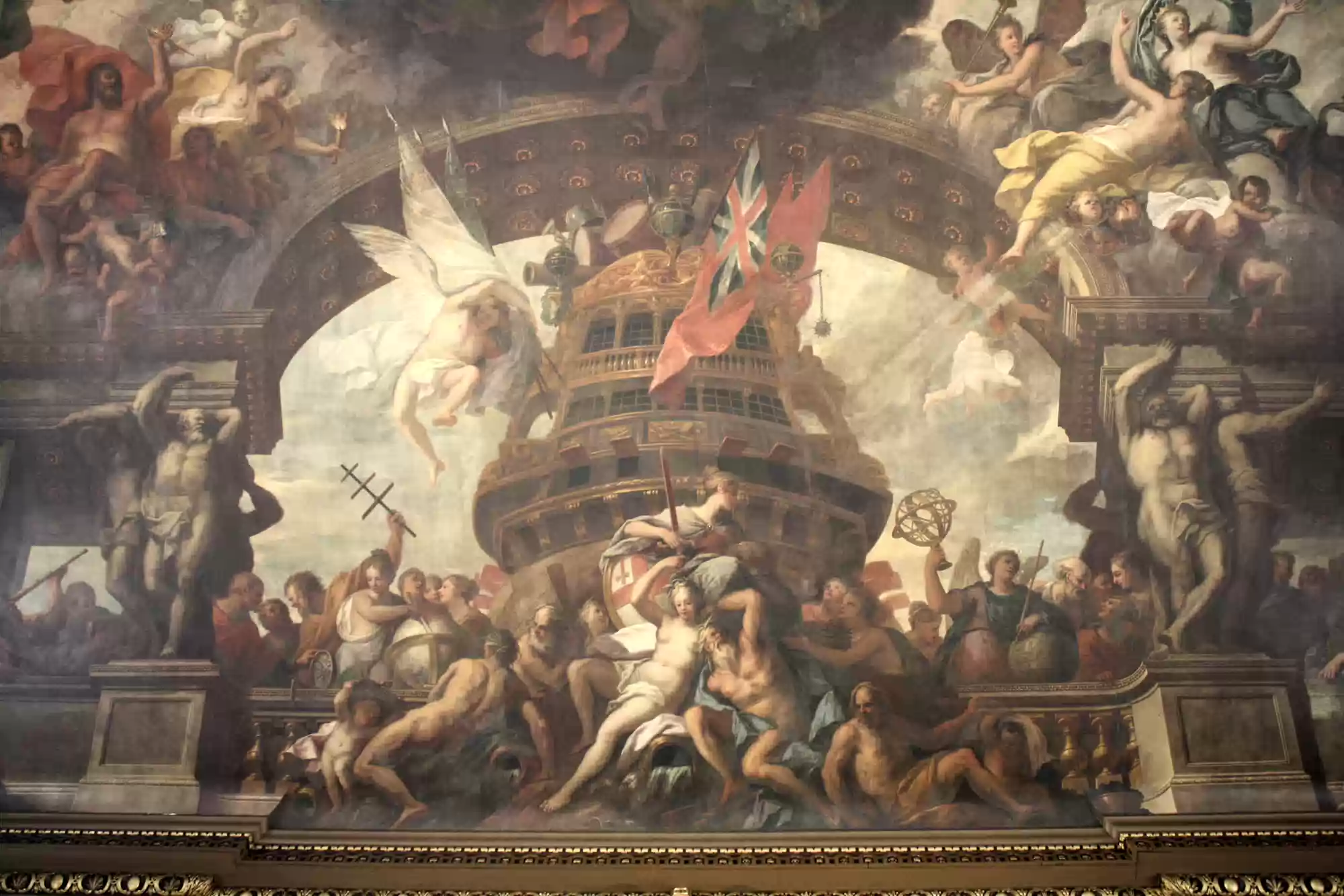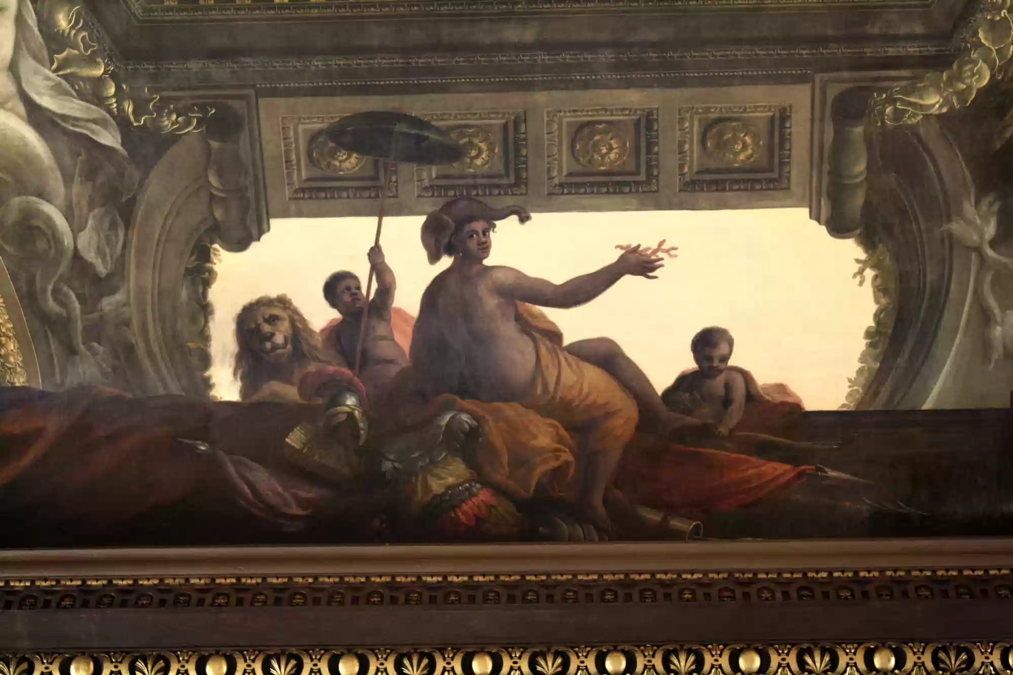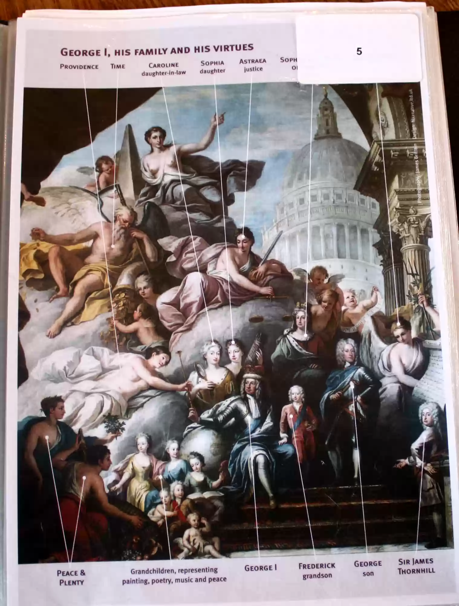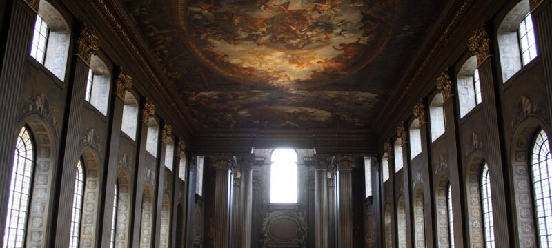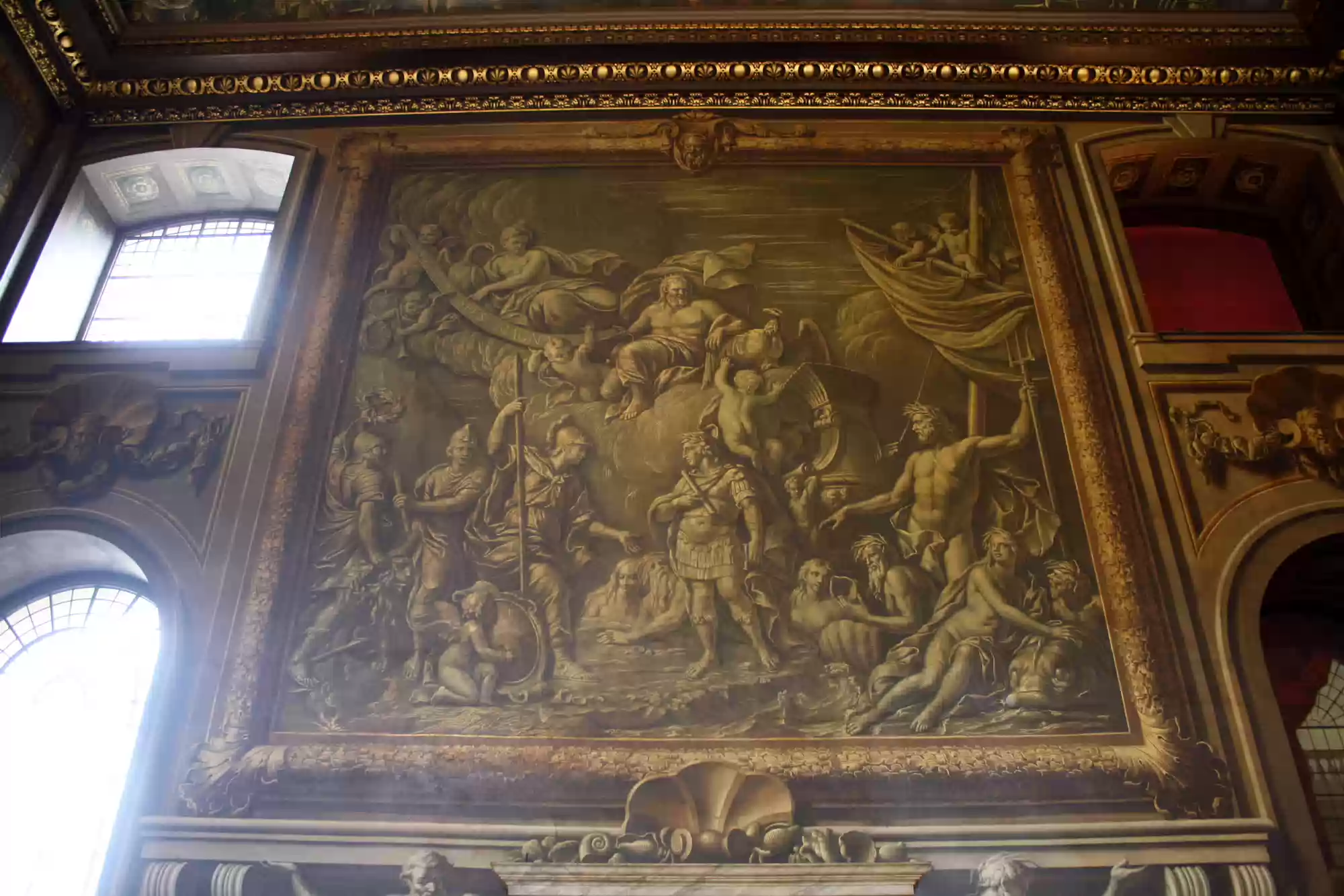 Painted hall was built in the first half of the 18th century and painted in 1779-1789. George I, his family and his virtues. Europe. America. Africa. Asia. Labels