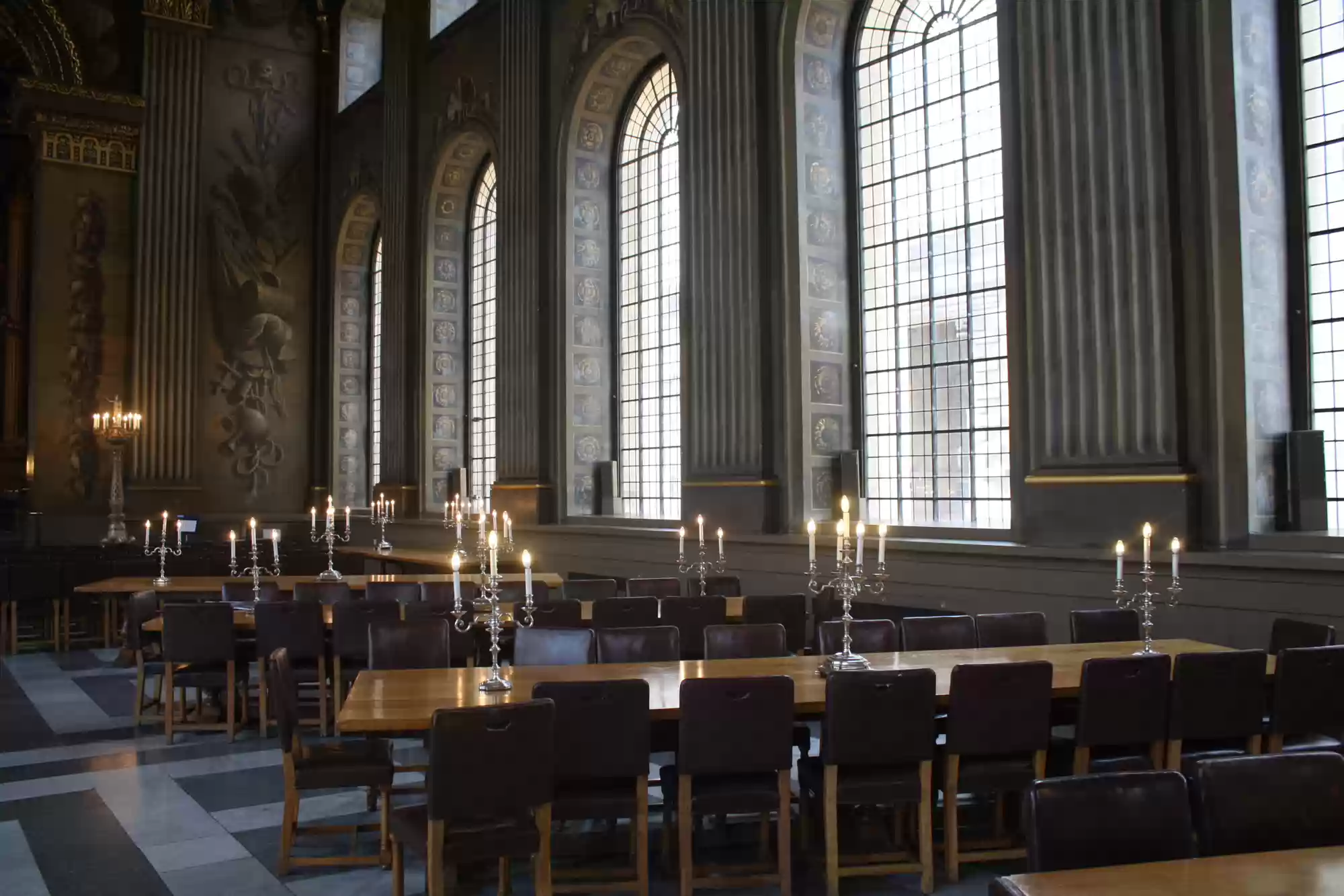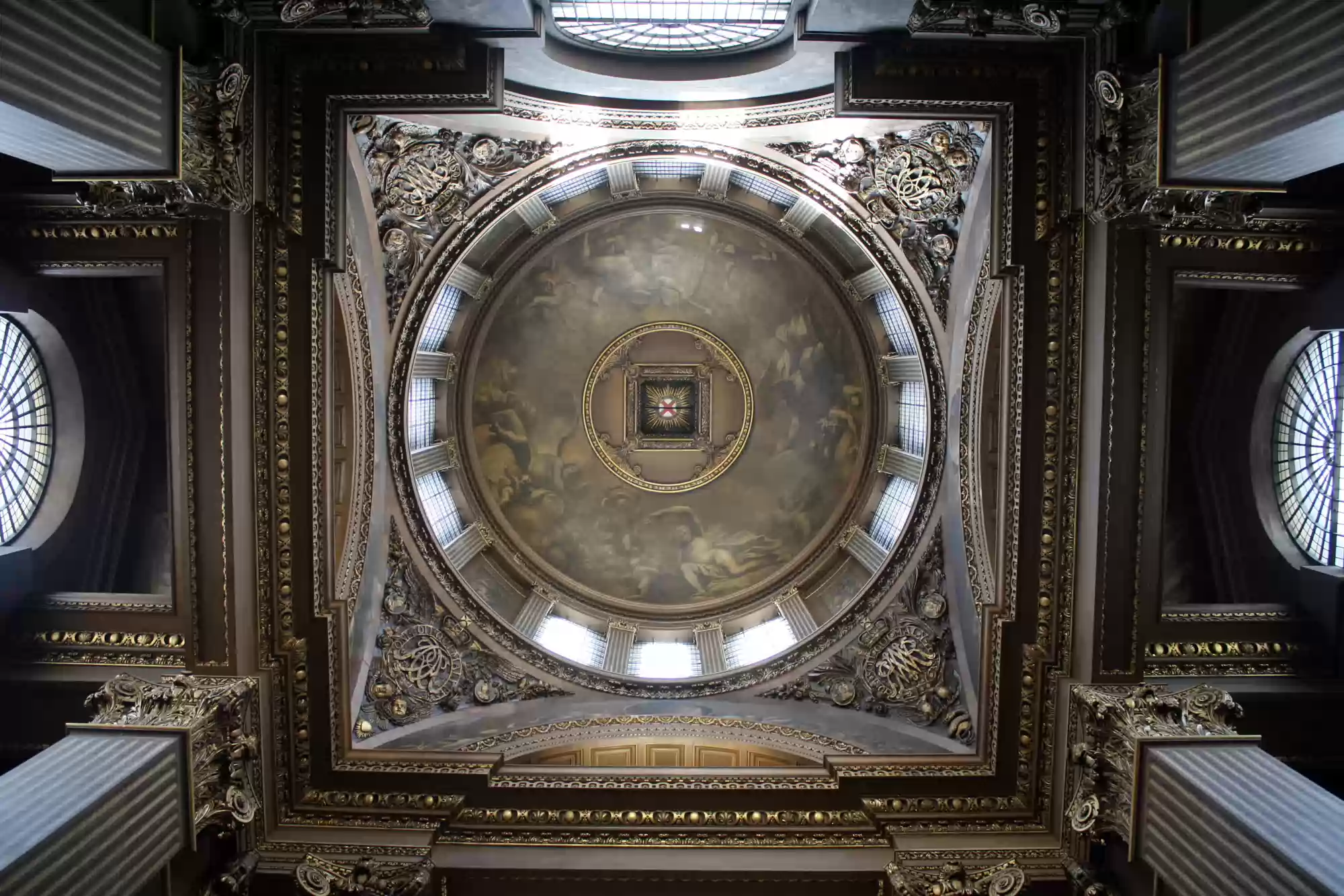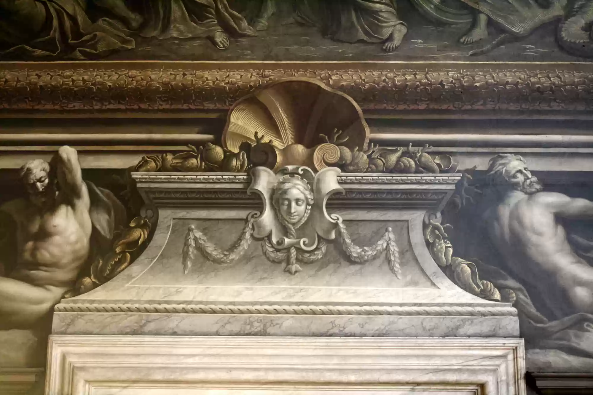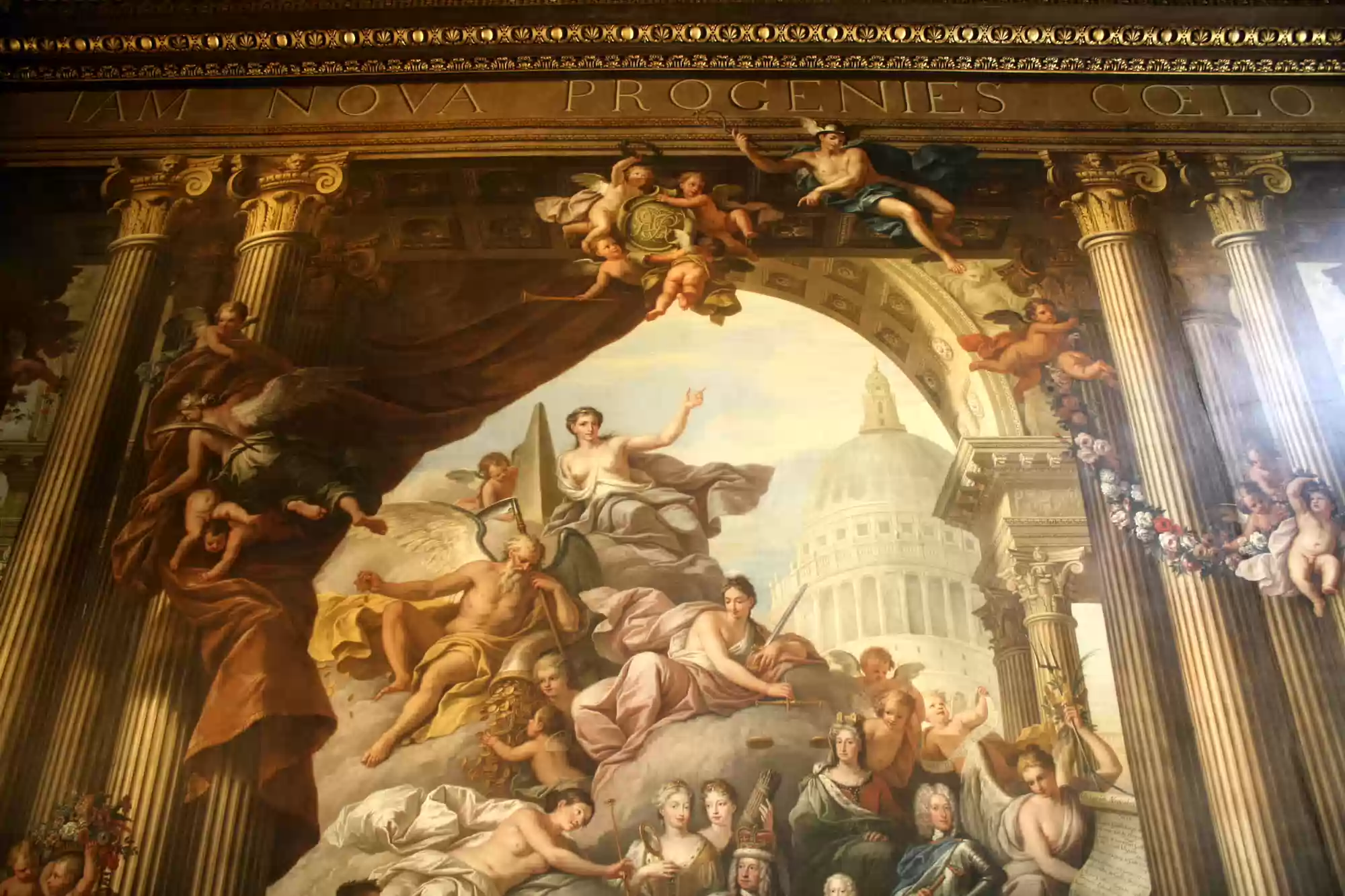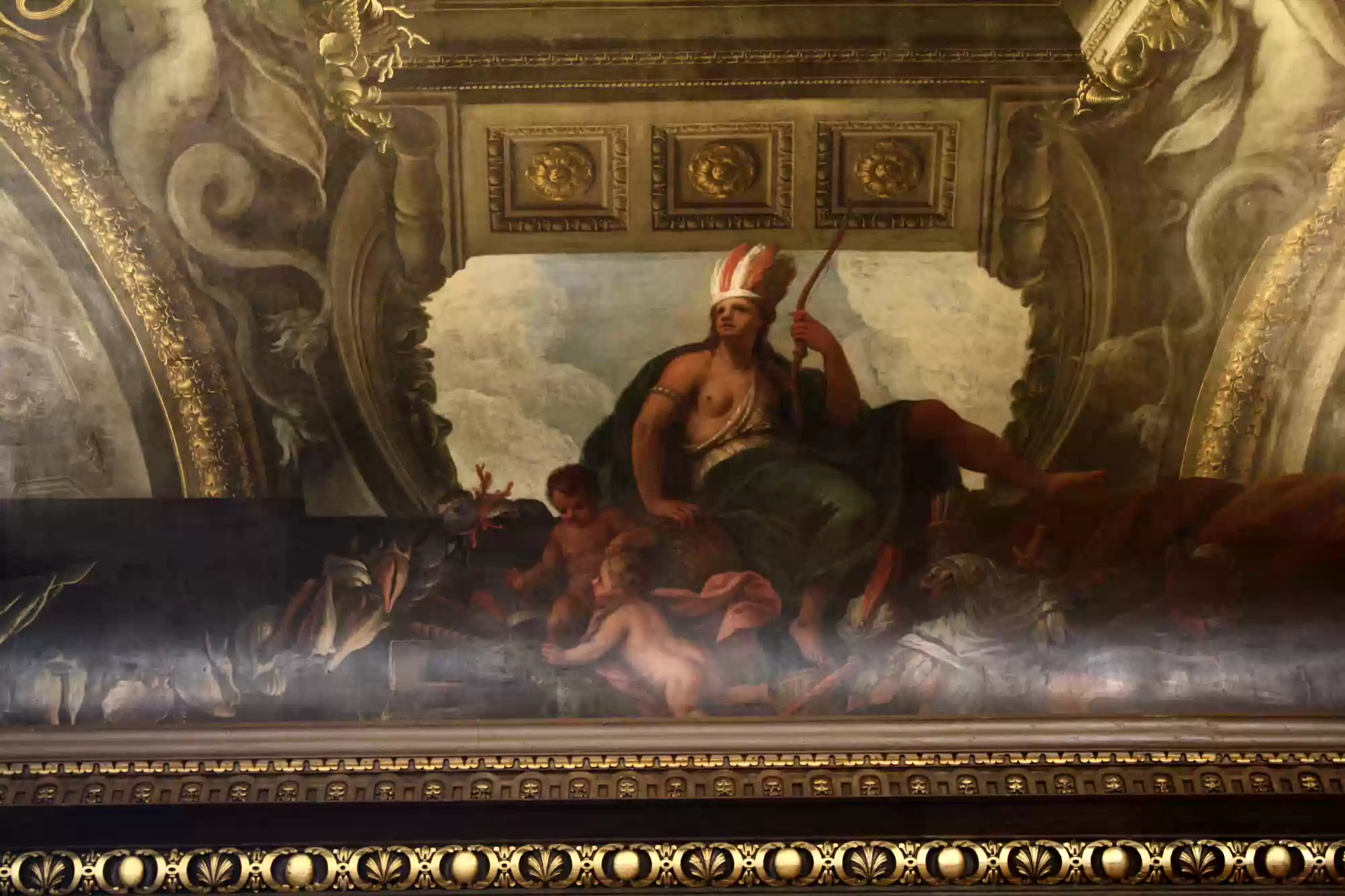 Painted hall was built in the first half of the 18th century and painted in 1779-1789. George I, his family and his virtues. Europe. America. Africa. Asia. Labels