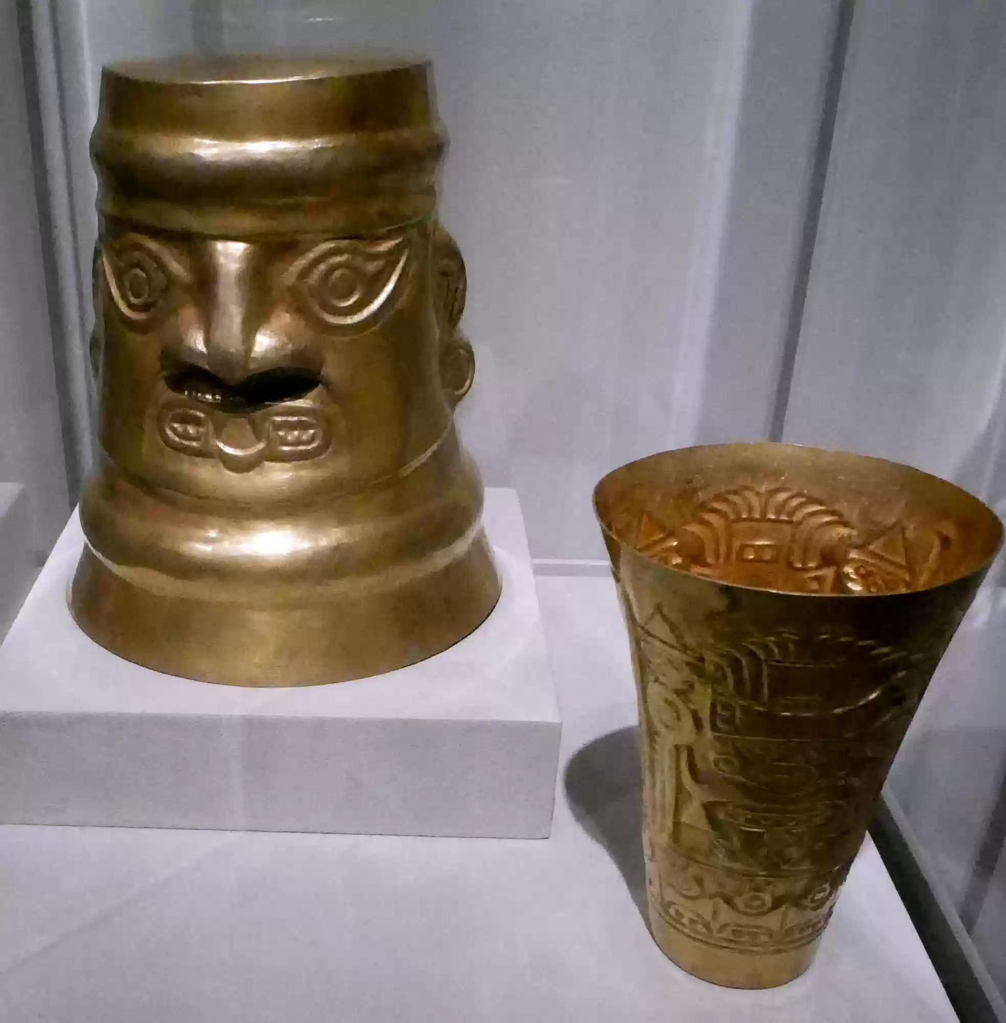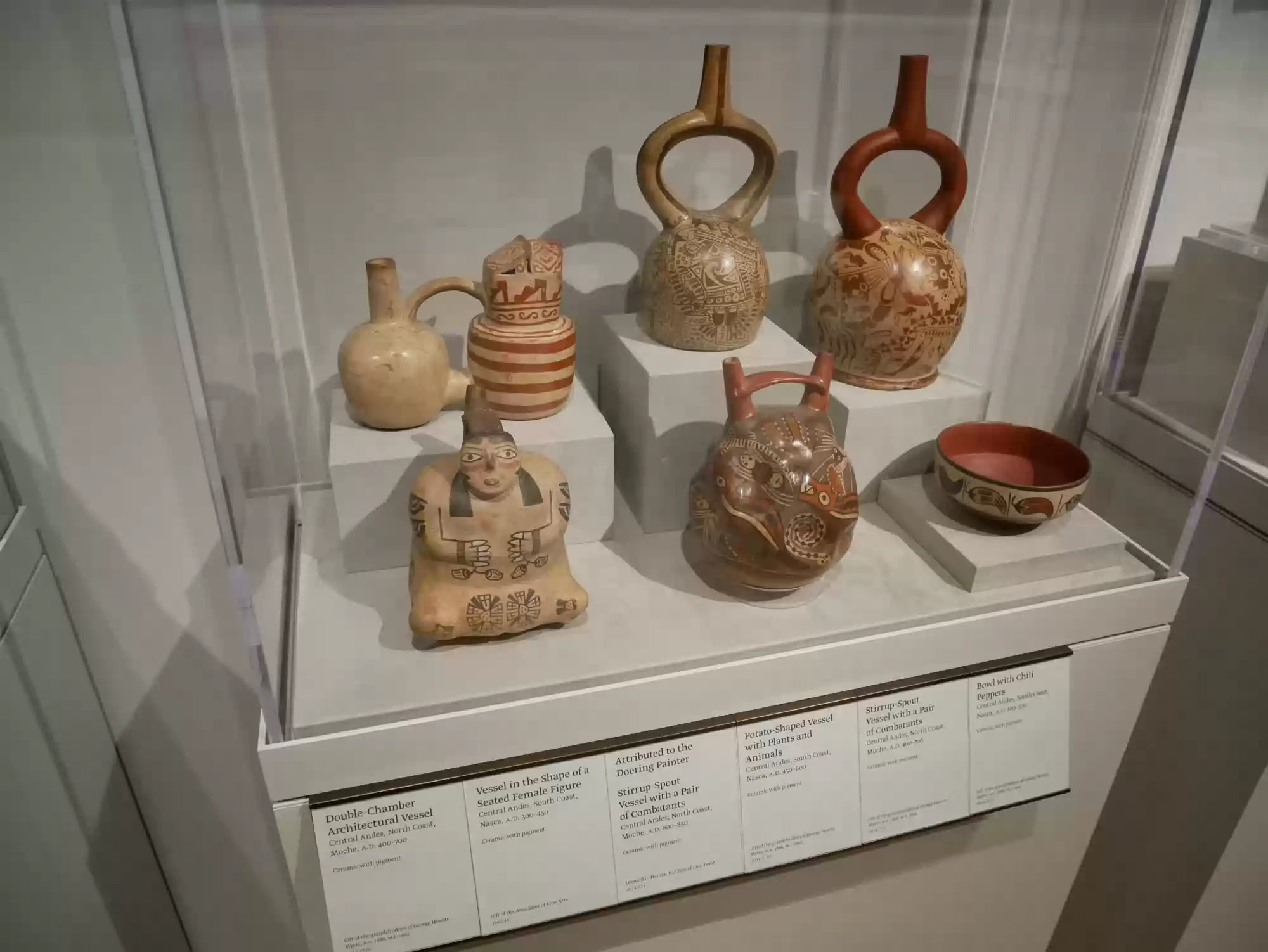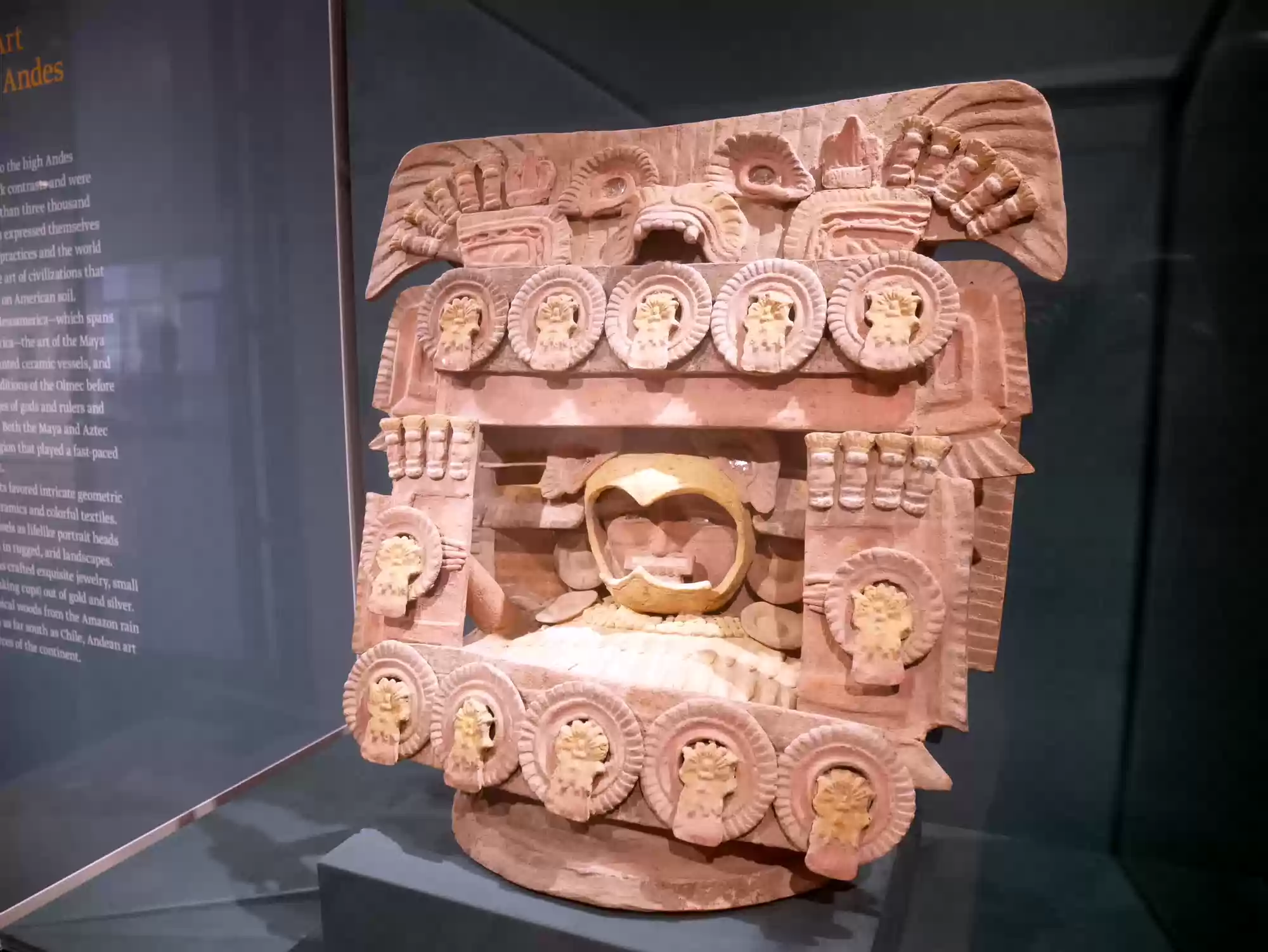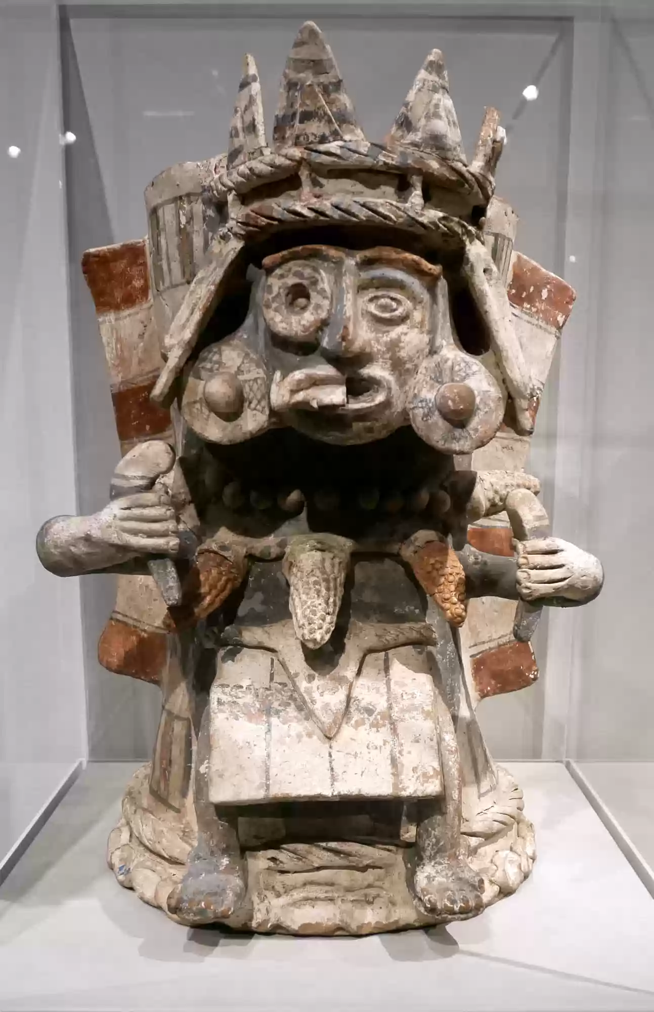 Censer lid with a figure in a bird costume, Mexicp or Guatemala, ceramic with pigment and mica, Teotihuacan, 400-650 AD. Mexico. Model of a ballgame with spectators, Mexico, Nayarit, 100-250 AD. Model of a ballgame with spectators, Mexico, Nayarit, 100-250 AD. Panel with a figure holding a staff and a bag, Mexico, Veracruz, volcanic stone, 500-700 AD. Mexico and Guatemala, before the 9th century AD. Brazier in the shape of a deity with elements of Tlaloc (rain god) and Chicomecoatl (maize goddess), Mexico, Aztec, 1325-1521 AD. Central Andes, Moche and Nasca, 100-700 AD. Beakers, Central Andes, Lambayeque, 1100-1350 AD. Ritual objects made of a single sheet of gold. Crown, Central Andes, Lambayeque, gold, 1100-1350 AD. Dura-EuroposPaintings Labels