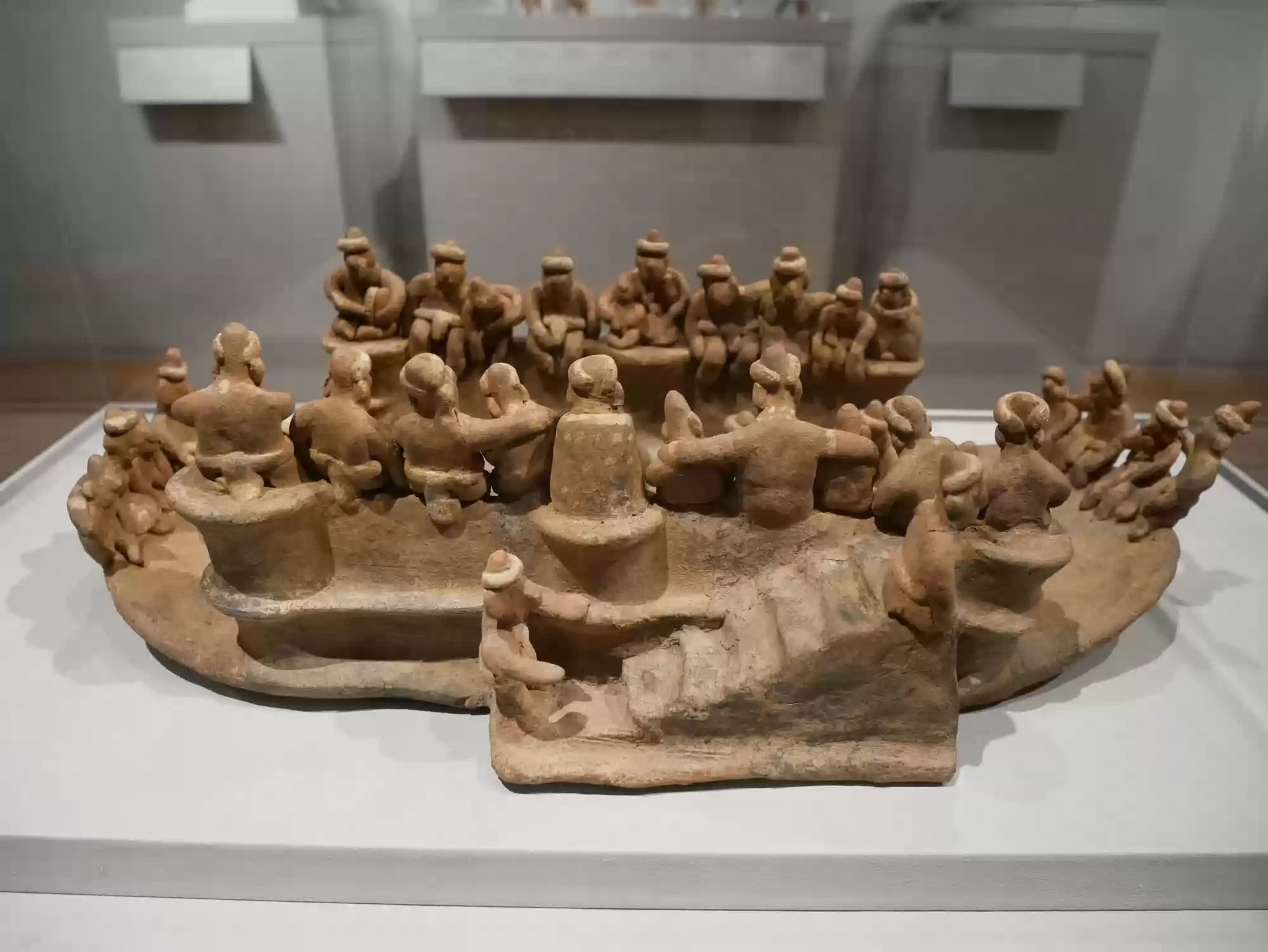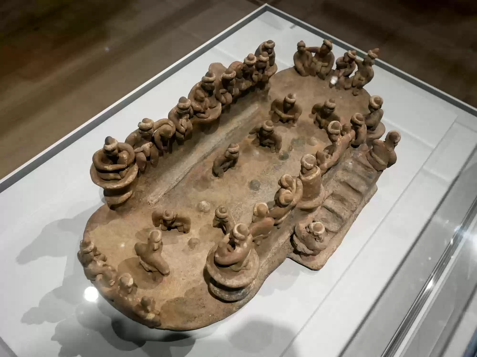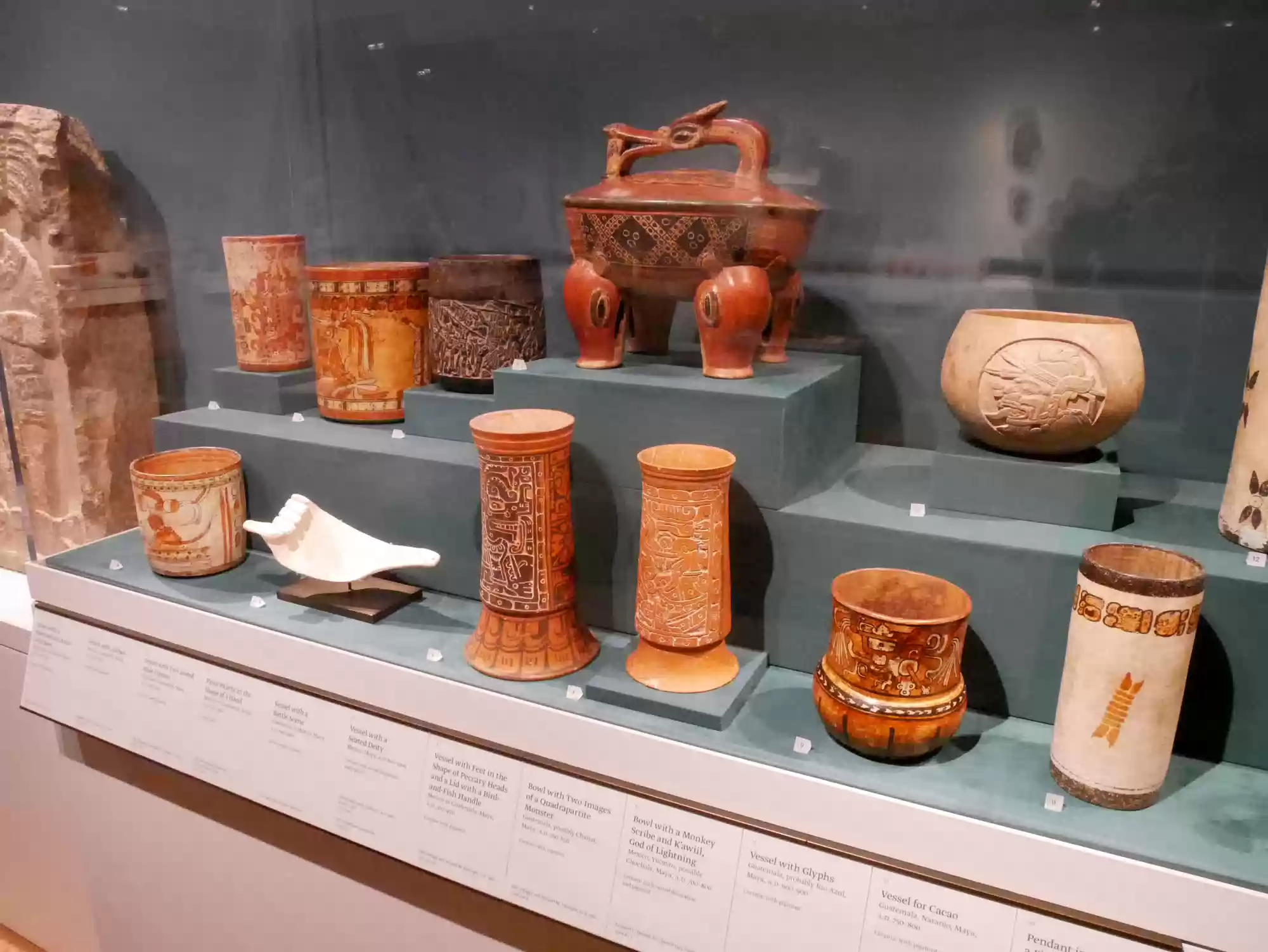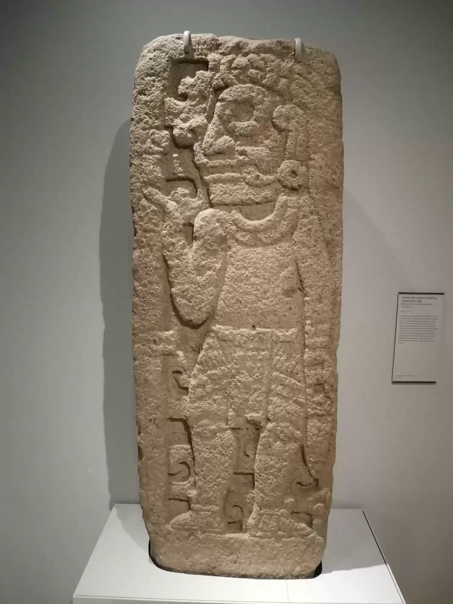 Censer lid with a figure in a bird costume, Mexicp or Guatemala, ceramic with pigment and mica, Teotihuacan, 400-650 AD. Mexico. Model of a ballgame with spectators, Mexico, Nayarit, 100-250 AD. Model of a ballgame with spectators, Mexico, Nayarit, 100-250 AD. Panel with a figure holding a staff and a bag, Mexico, Veracruz, volcanic stone, 500-700 AD. Mexico and Guatemala, before the 9th century AD. Brazier in the shape of a deity with elements of Tlaloc (rain god) and Chicomecoatl (maize goddess), Mexico, Aztec, 1325-1521 AD. Central Andes, Moche and Nasca, 100-700 AD. Beakers, Central Andes, Lambayeque, 1100-1350 AD. Ritual objects made of a single sheet of gold. Crown, Central Andes, Lambayeque, gold, 1100-1350 AD. Dura-EuroposPaintings Labels