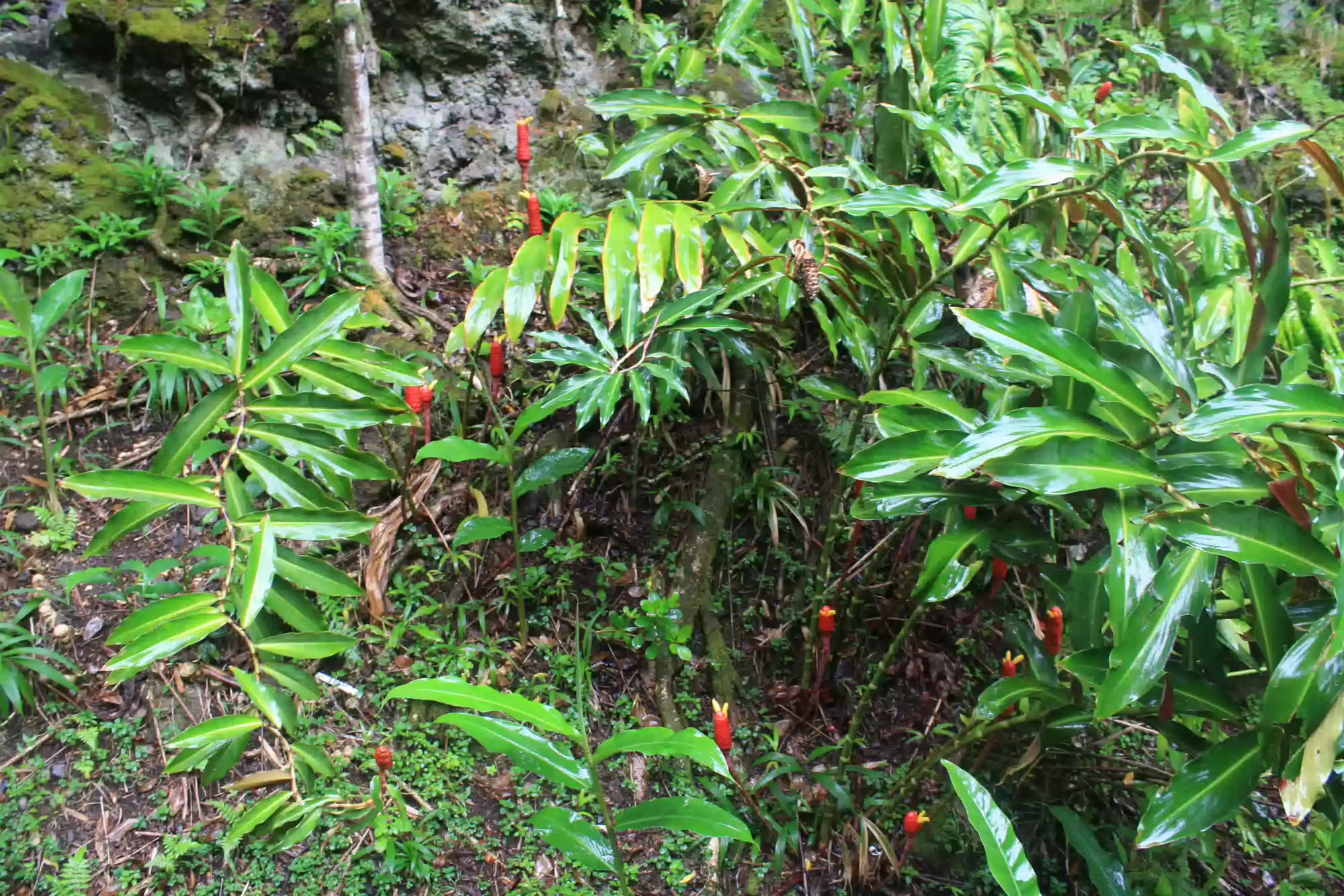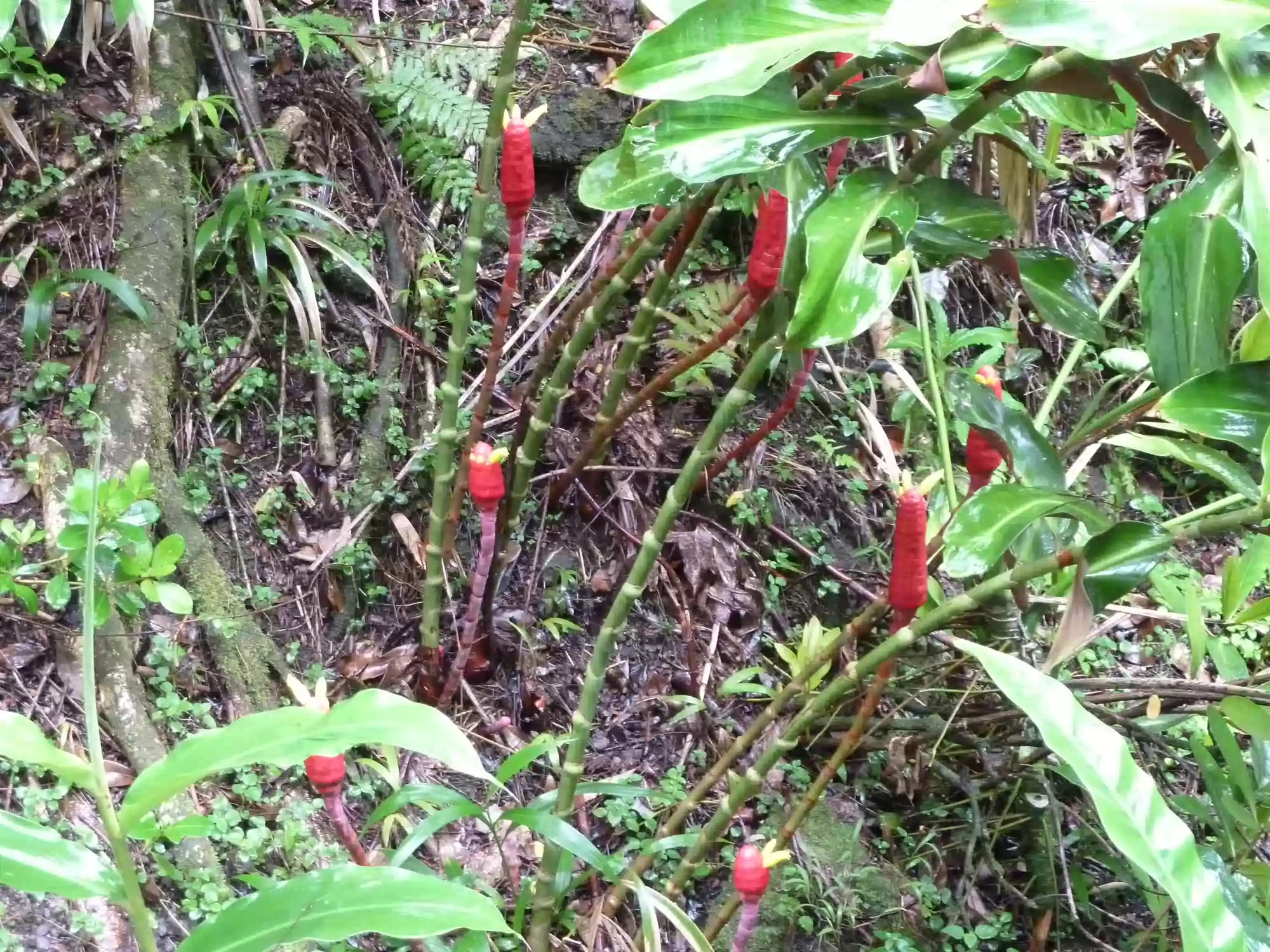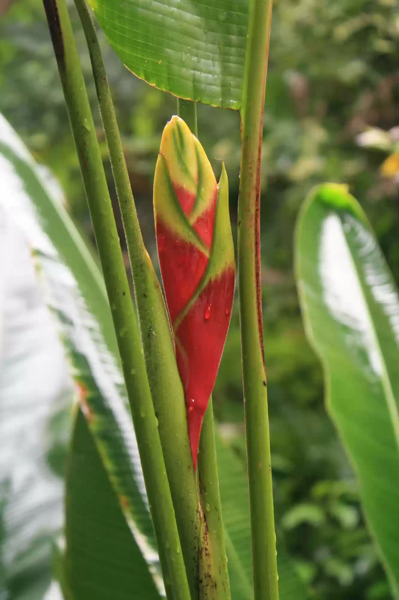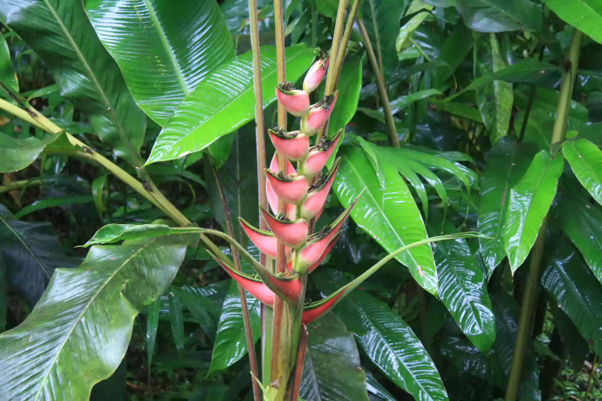 Alexandra palm, Australia. Heliconia "Eden Pink", Colombia, Ecuador, Peru. Pink maracas. Common guava, central America. Akaka FallsHonomu Labels