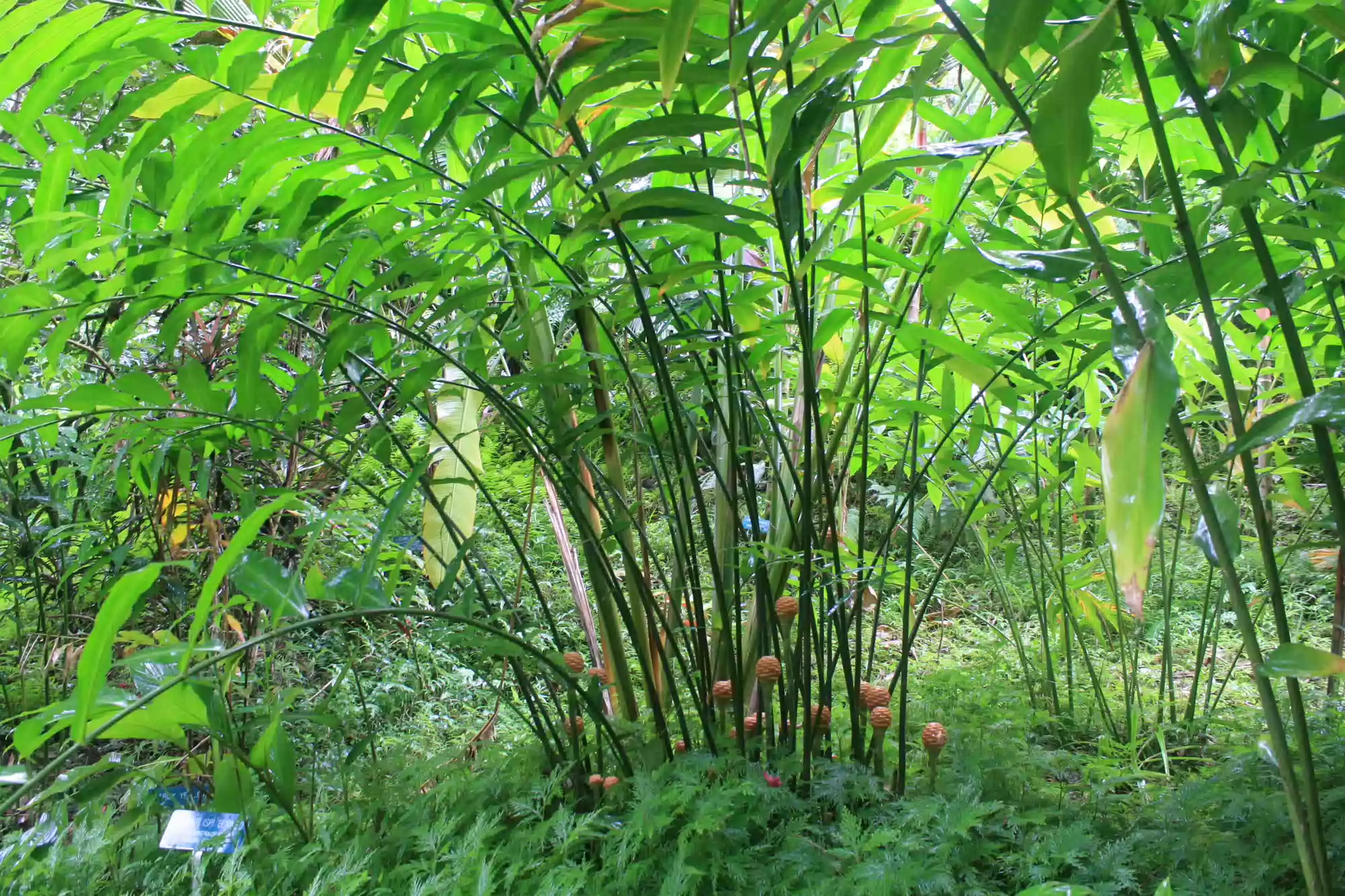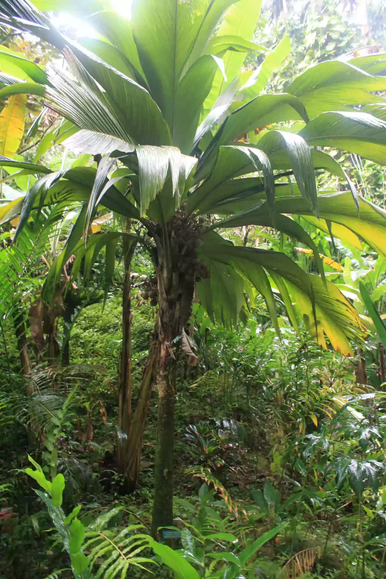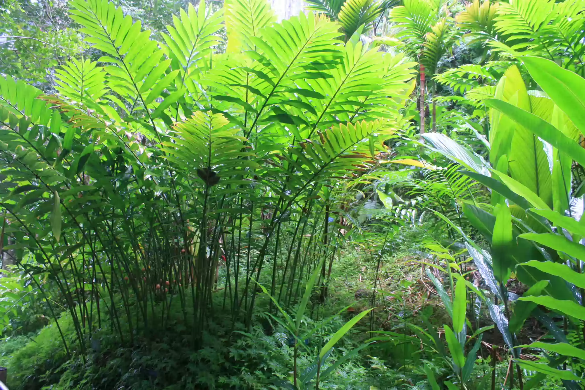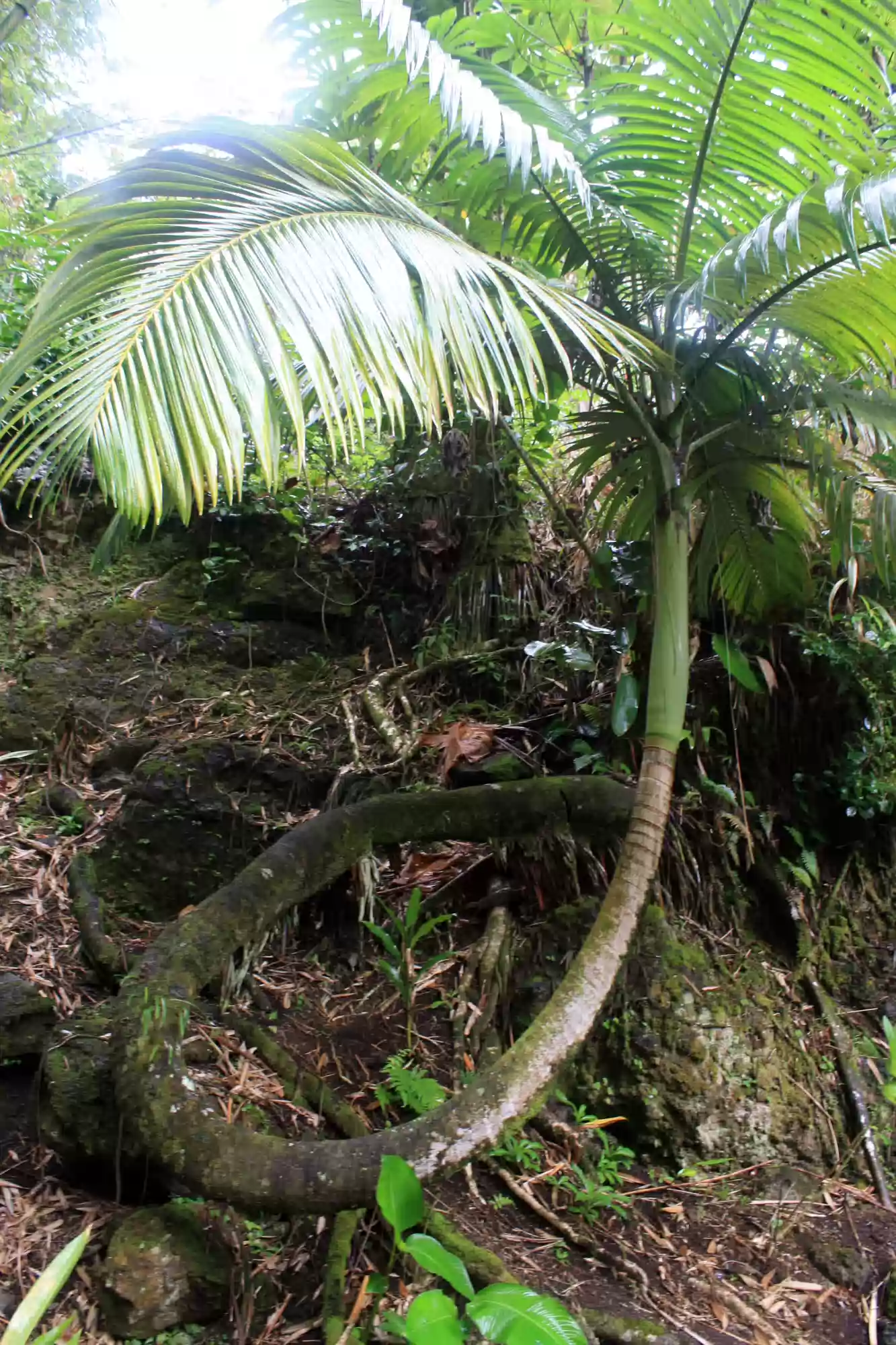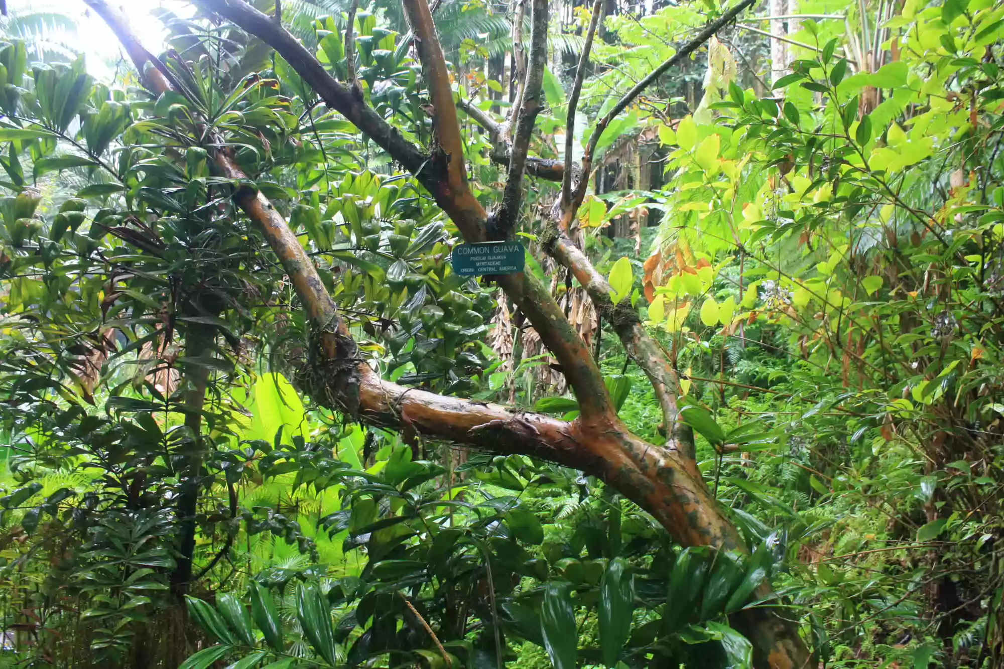 Alexandra palm, Australia. Heliconia "Eden Pink", Colombia, Ecuador, Peru. Pink maracas. Common guava, central America. Akaka FallsHonomu Labels