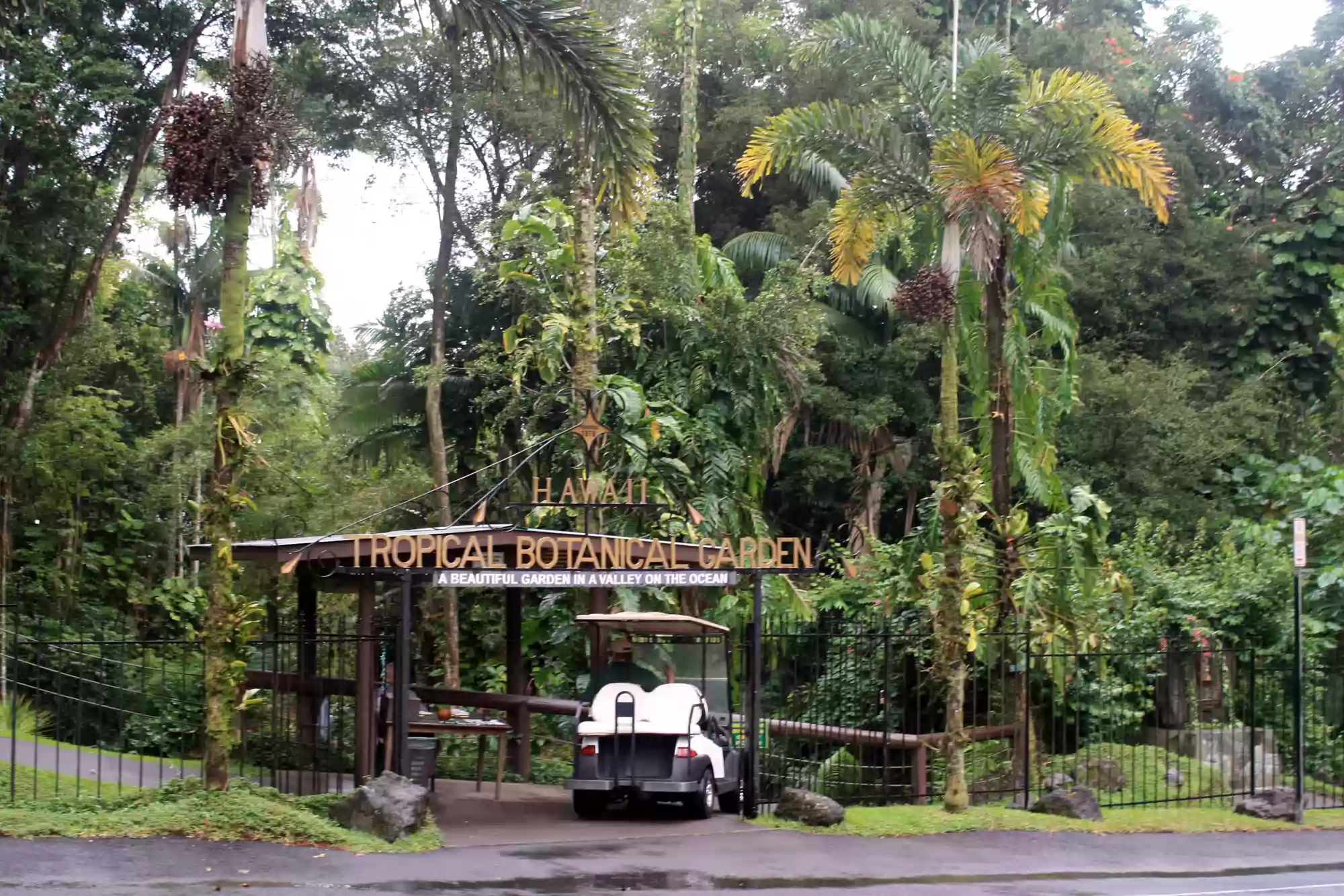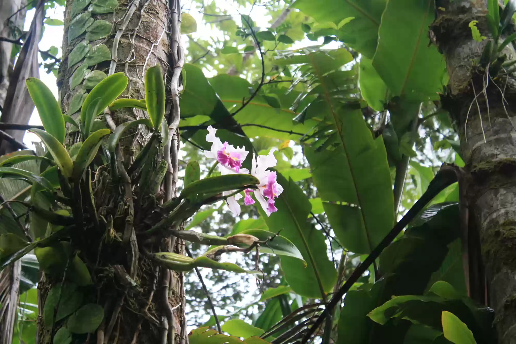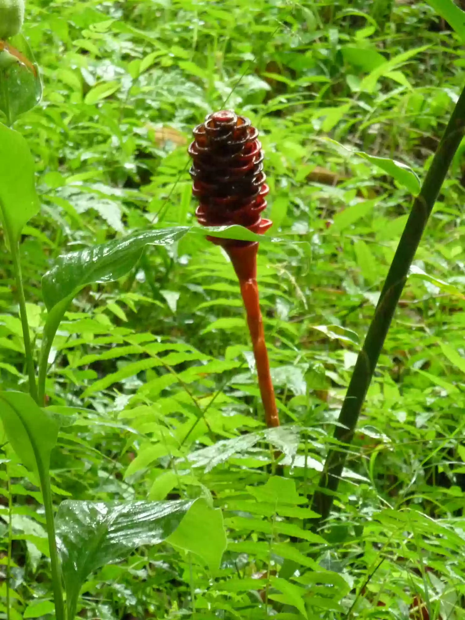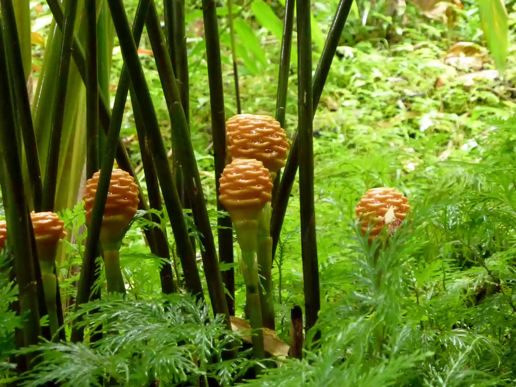 Alexandra palm, Australia. Heliconia "Eden Pink", Colombia, Ecuador, Peru. Pink maracas. Common guava, central America. Akaka FallsHonomu Labels