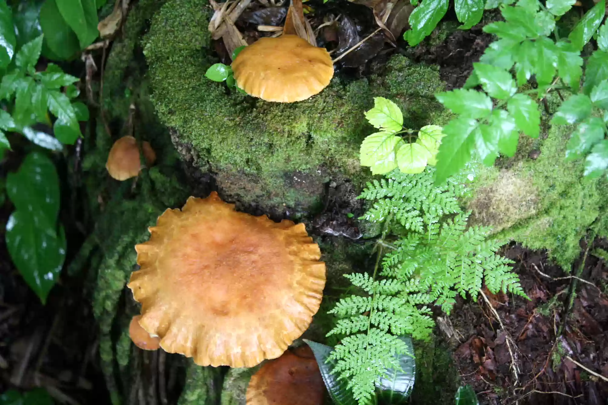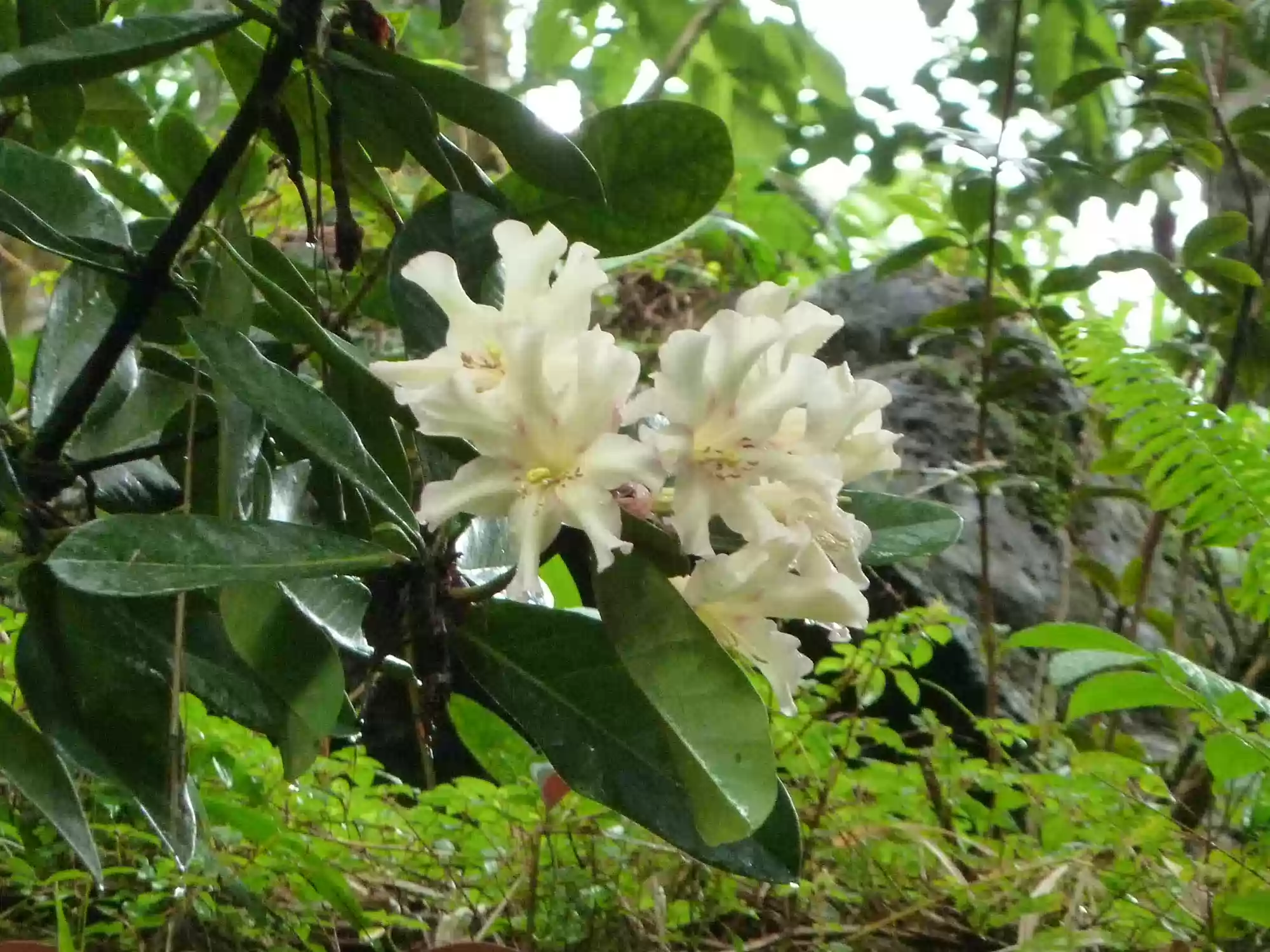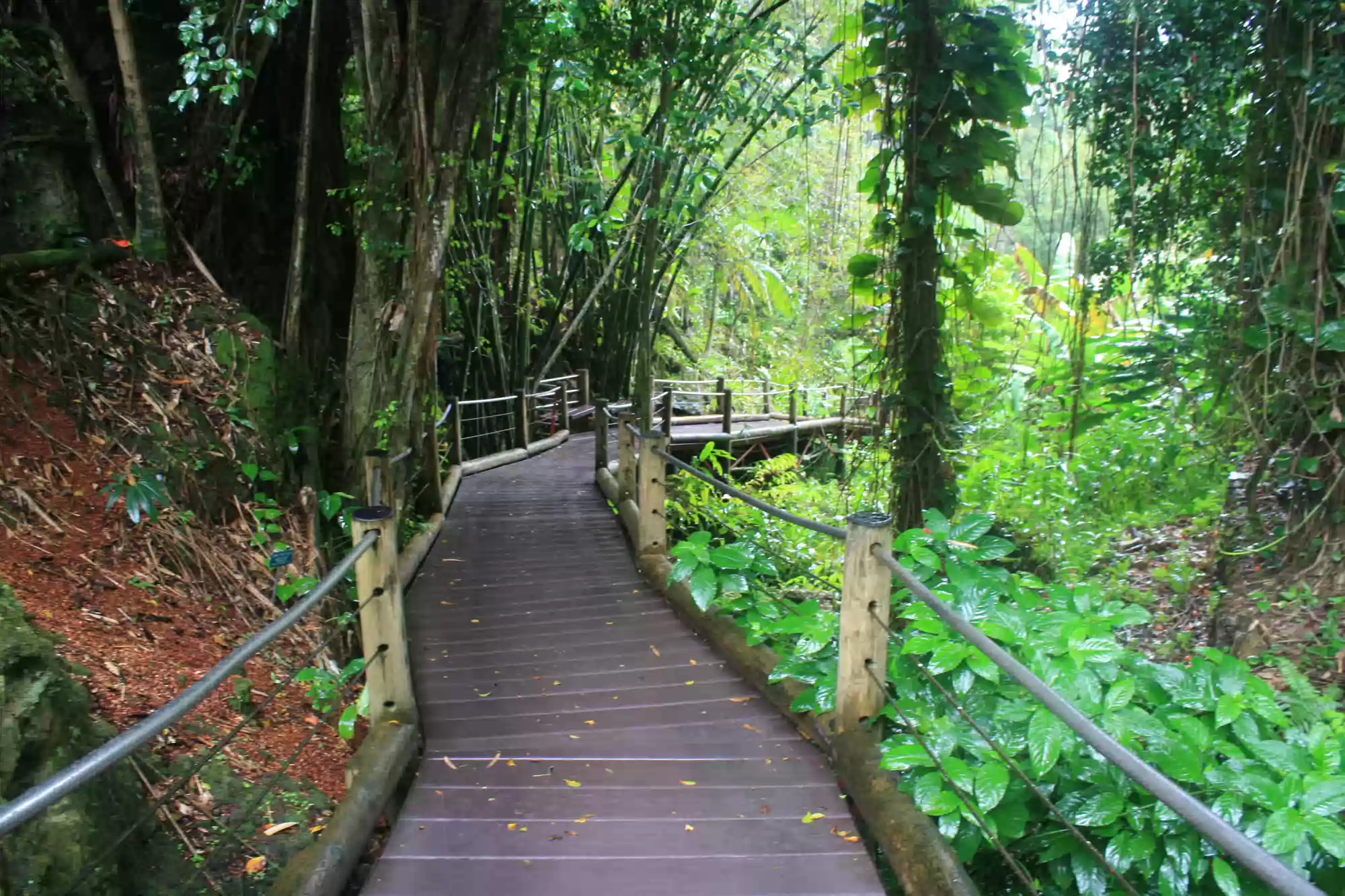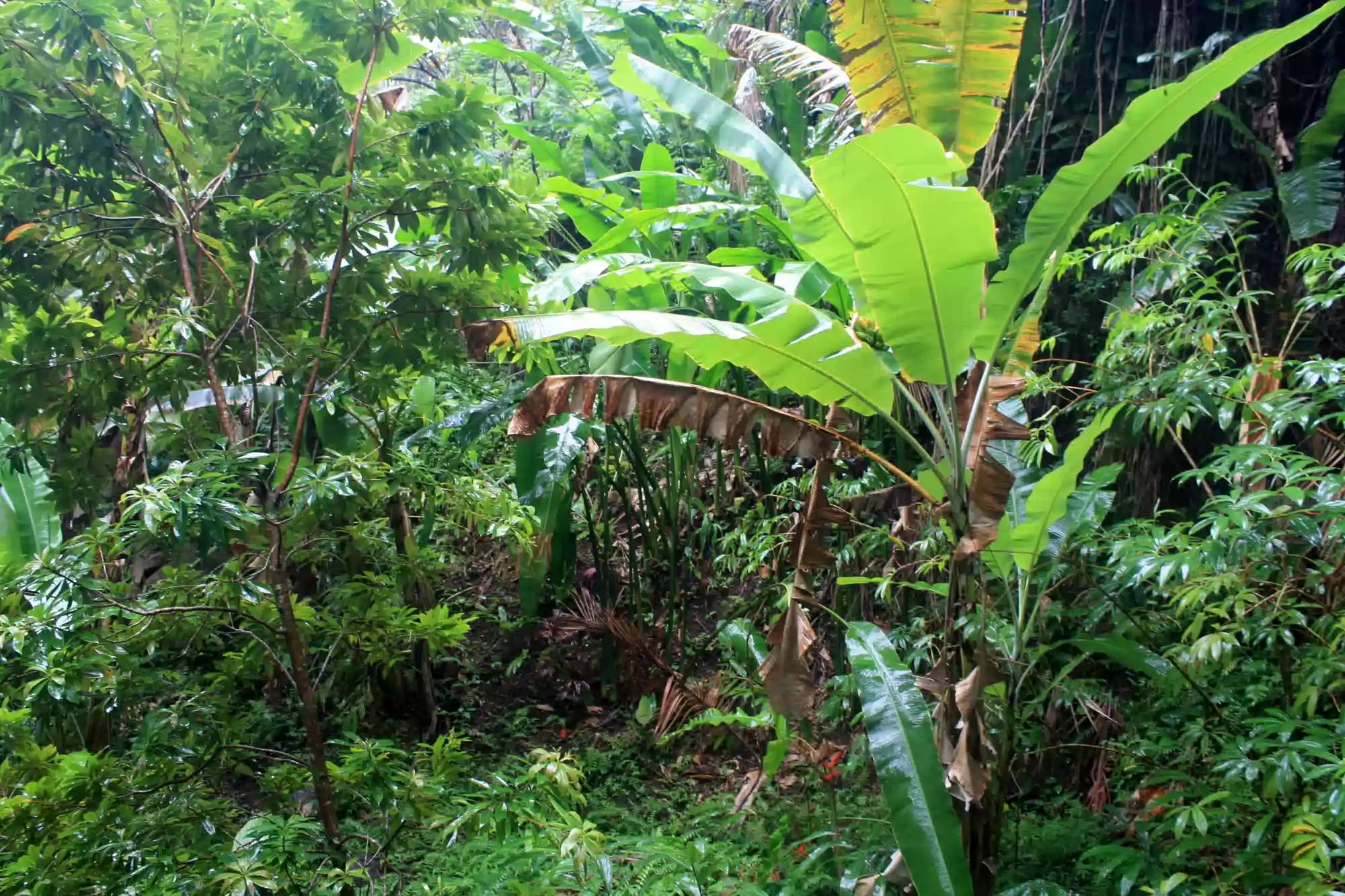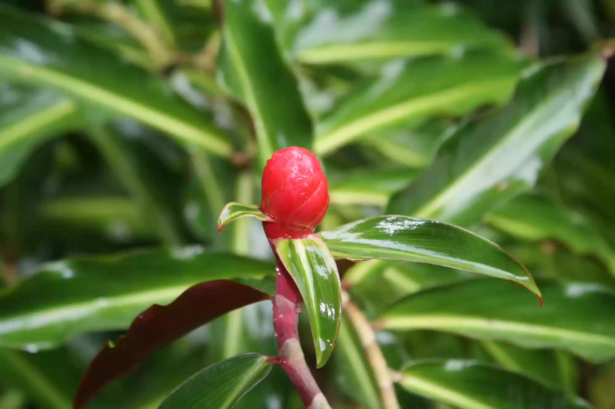 Alexandra palm, Australia. Heliconia "Eden Pink", Colombia, Ecuador, Peru. Pink maracas. Common guava, central America. Akaka FallsHonomu Labels