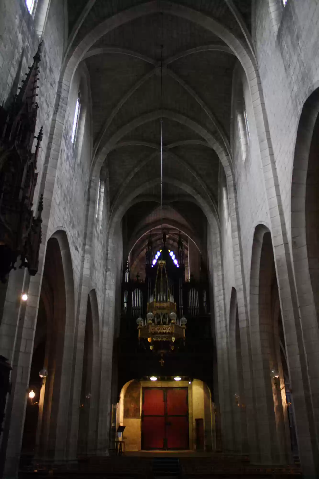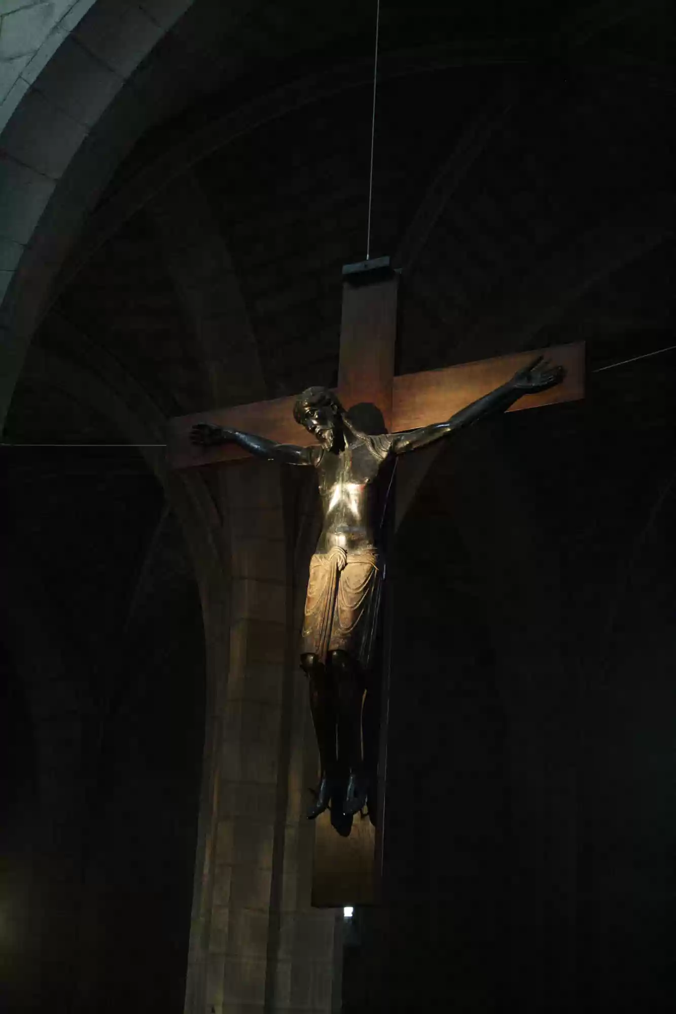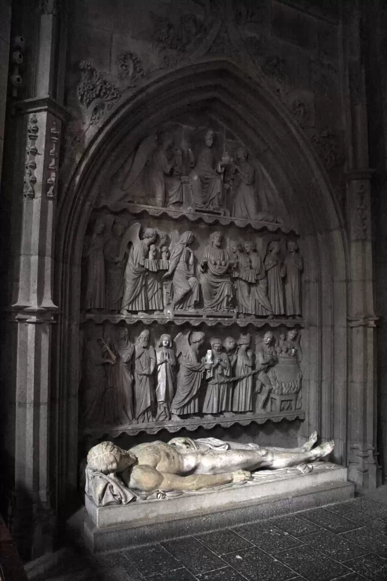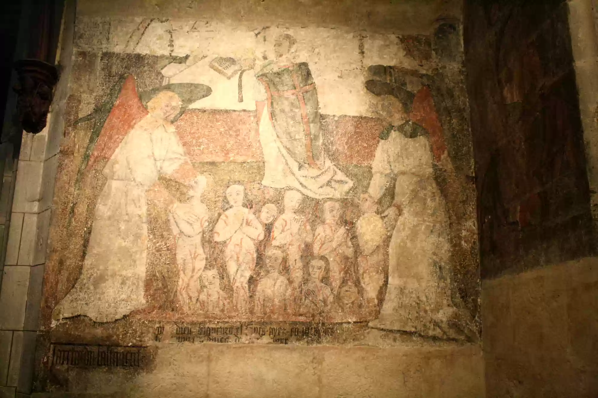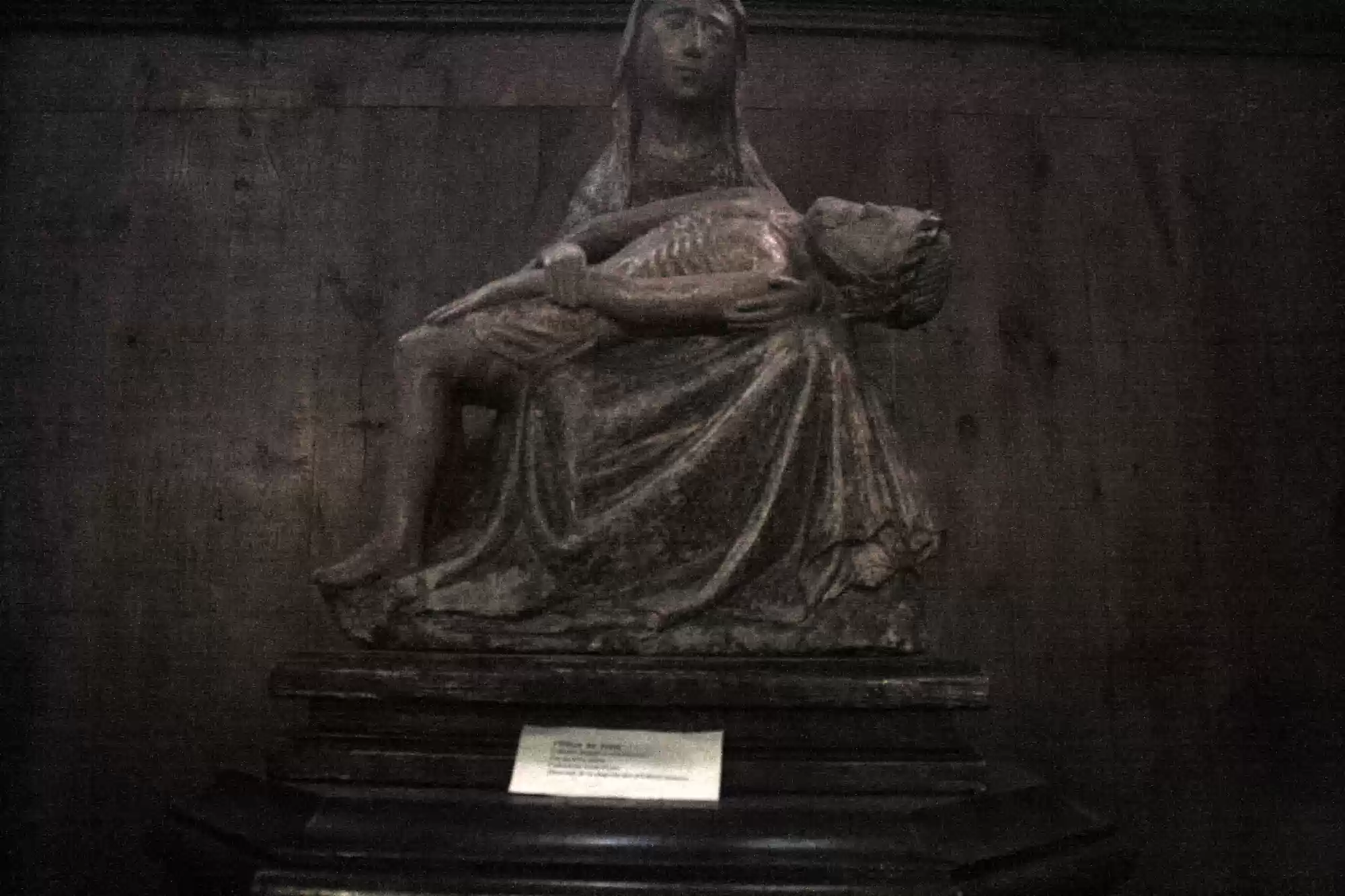 The 14th century cathedral is made of local basalt stone, which is very tough to carve. Main altar. 15th century frescoe (Hell). 13th century wooden statue. Labels