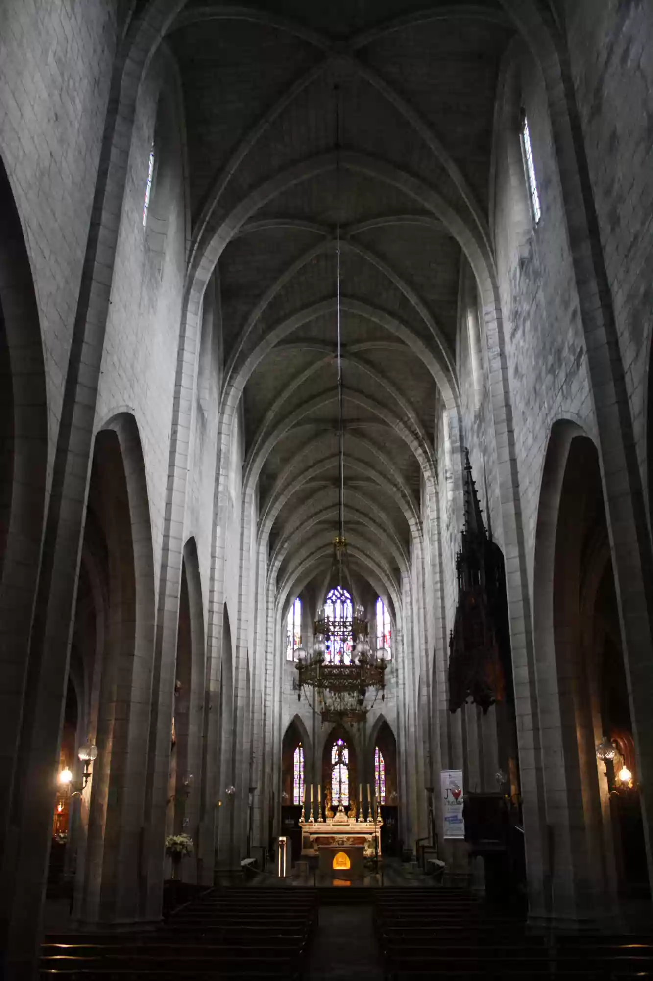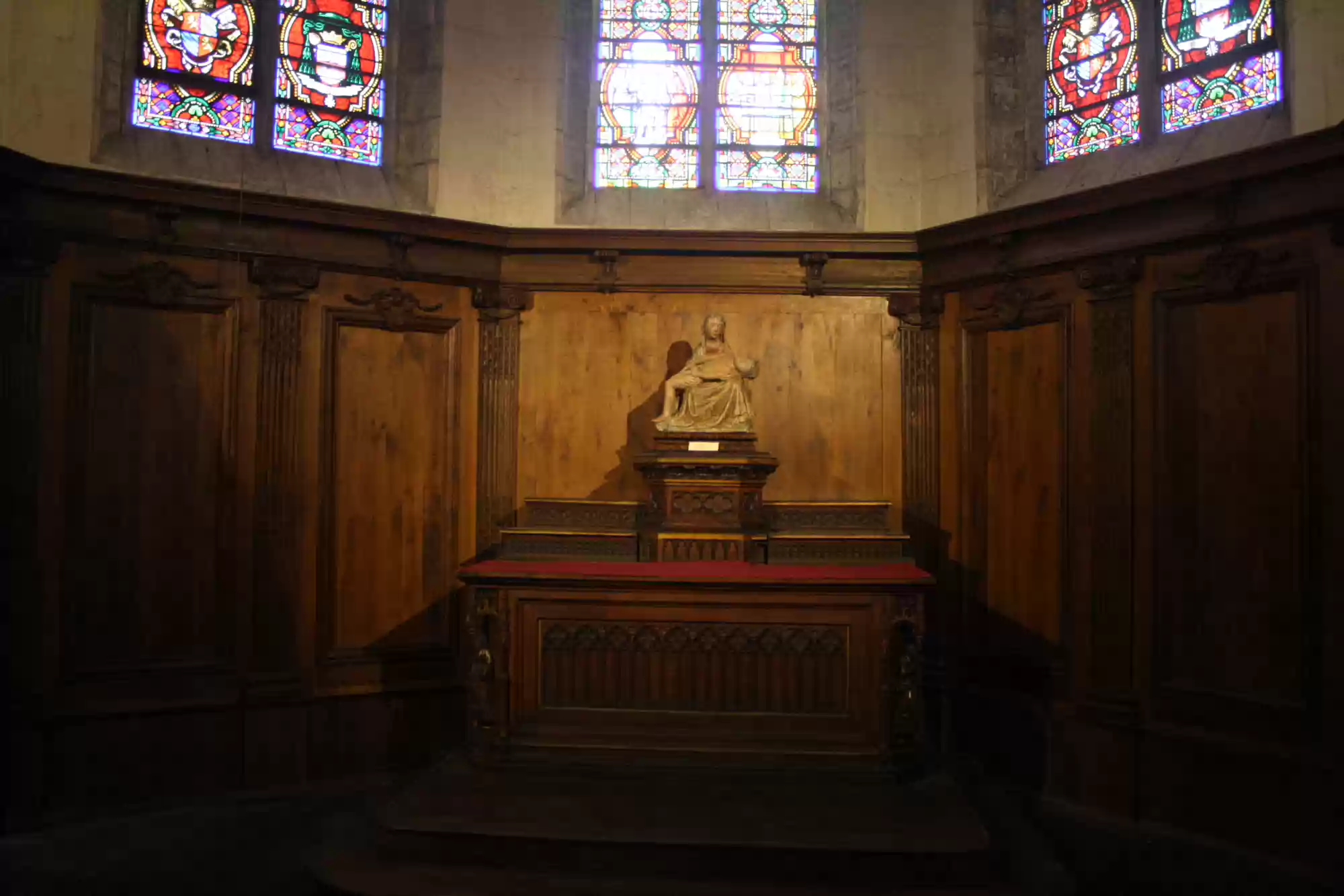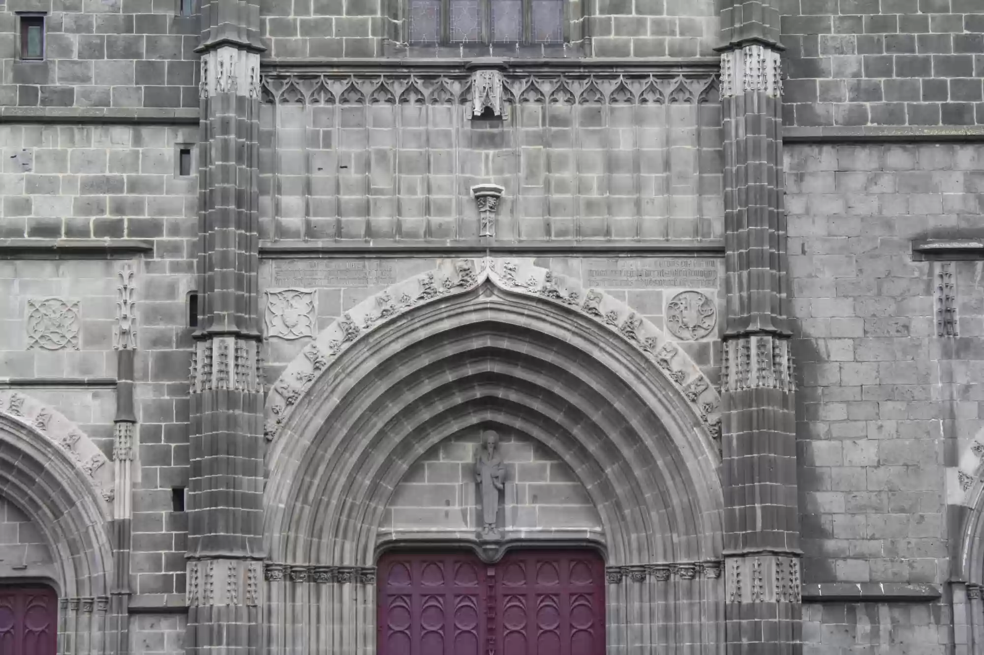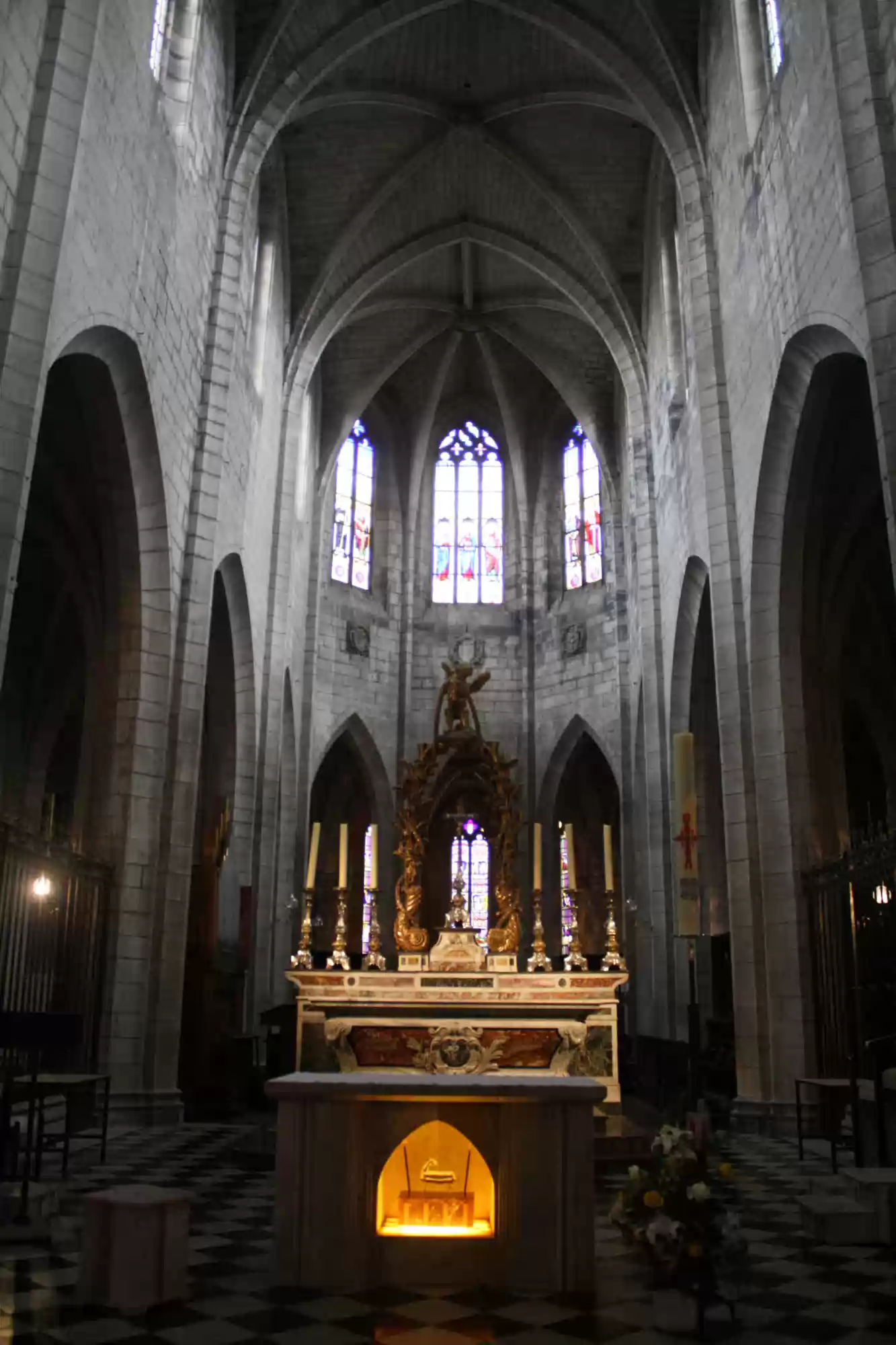 The 14th century cathedral is made of local basalt stone, which is very tough to carve. Main altar. 15th century frescoe (Hell). 13th century wooden statue. Labels