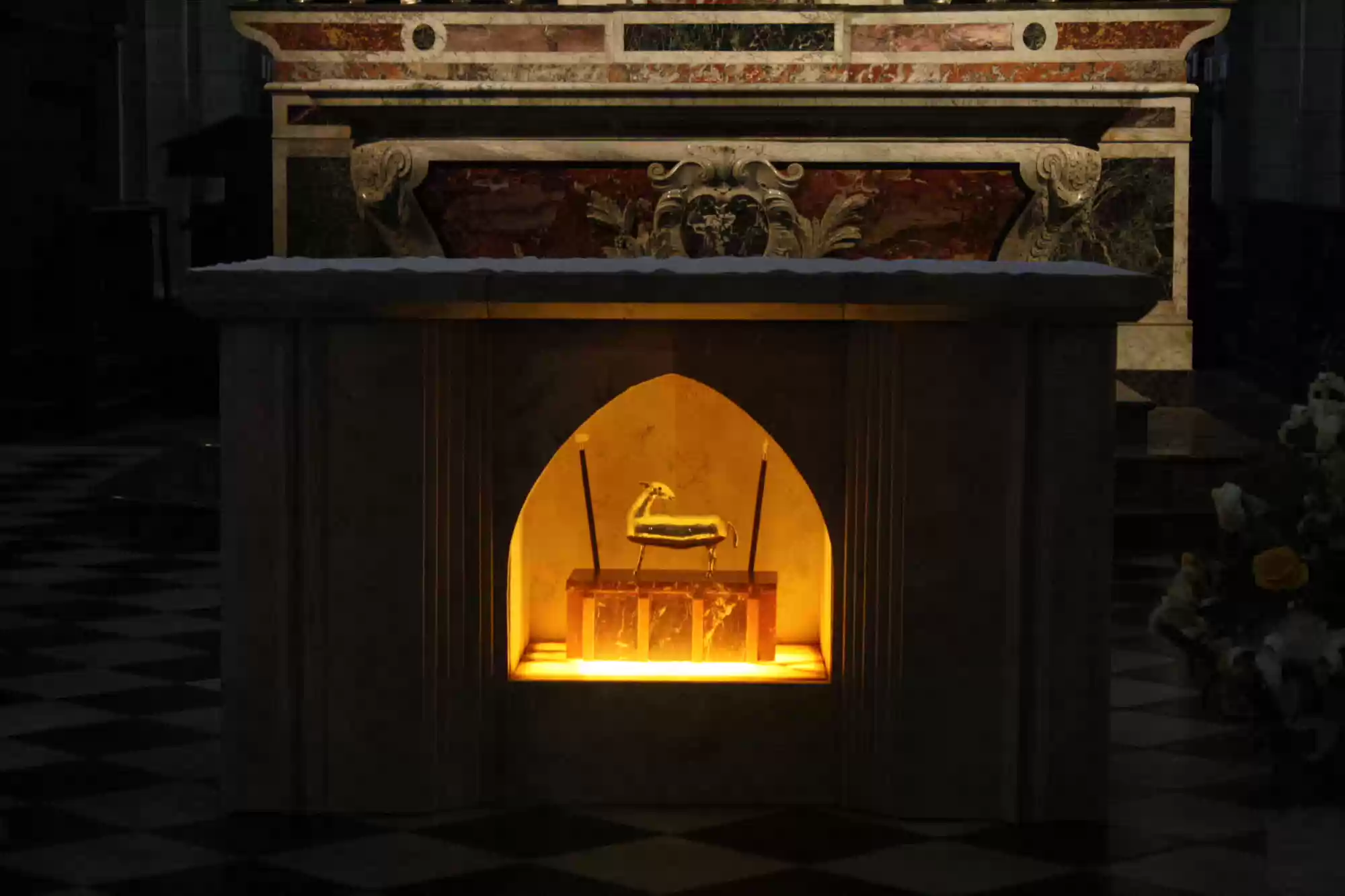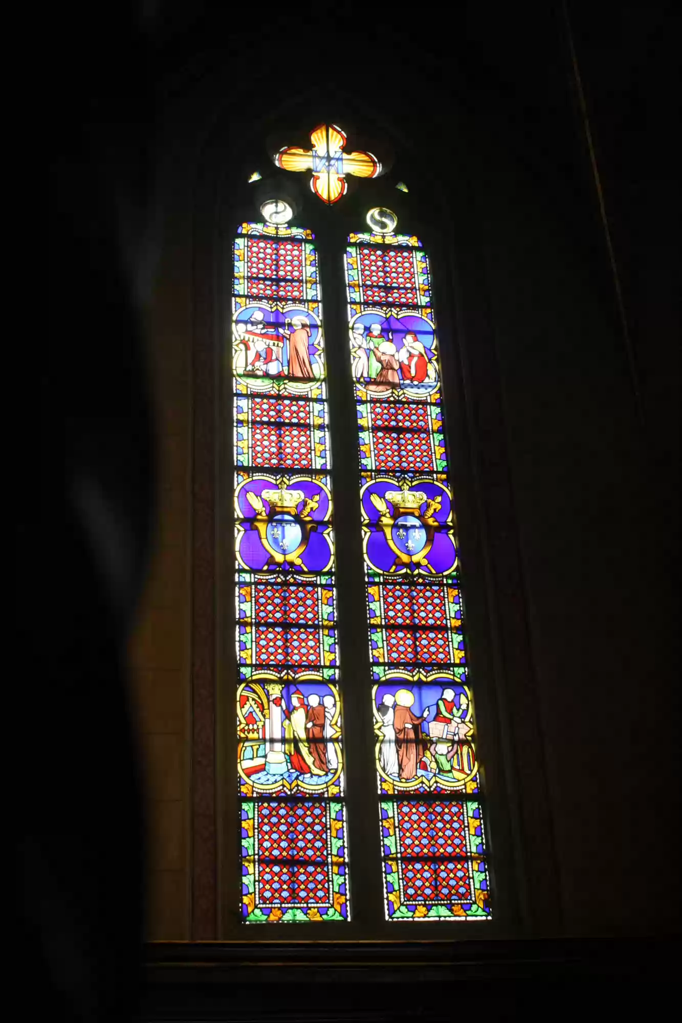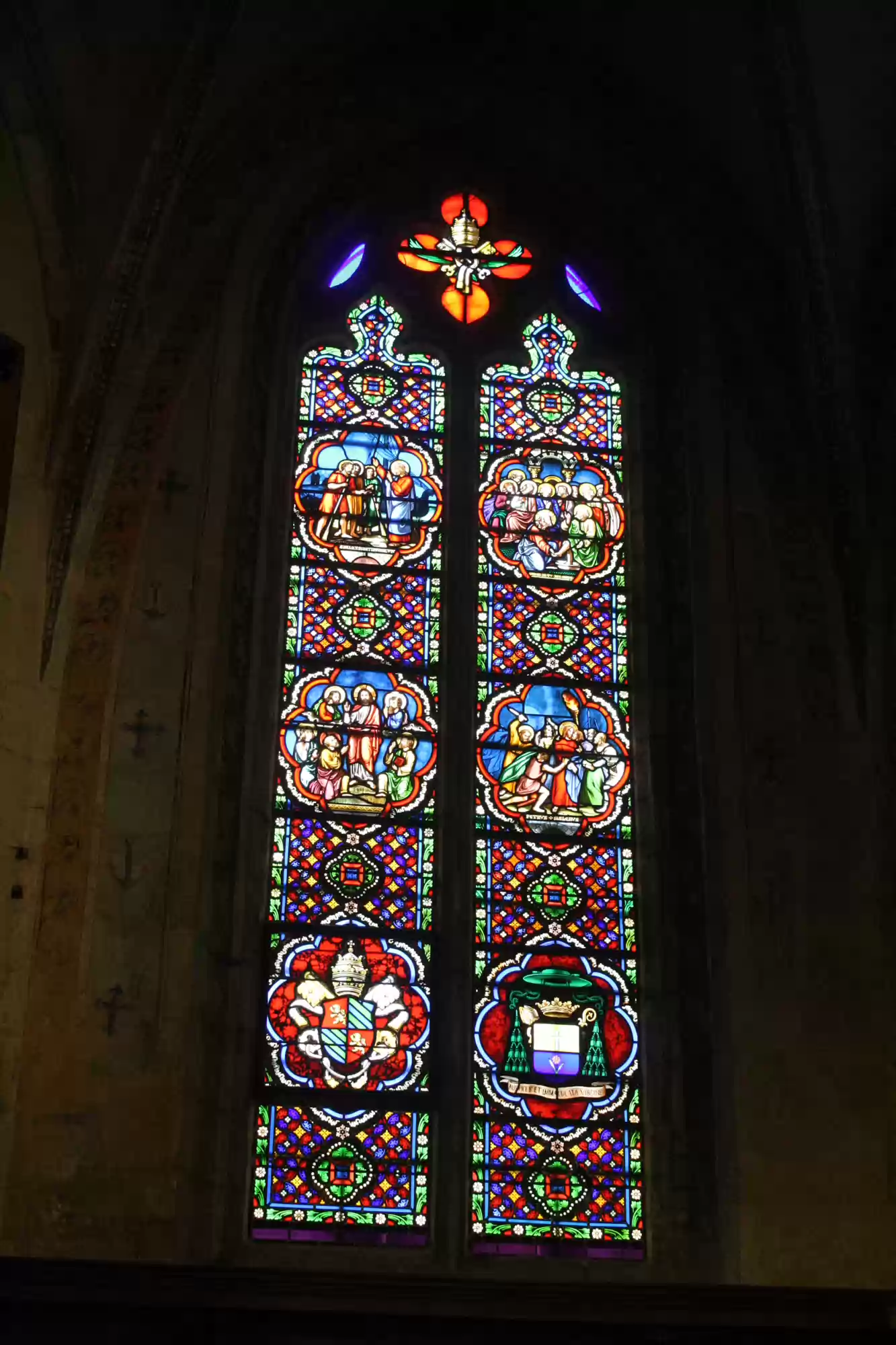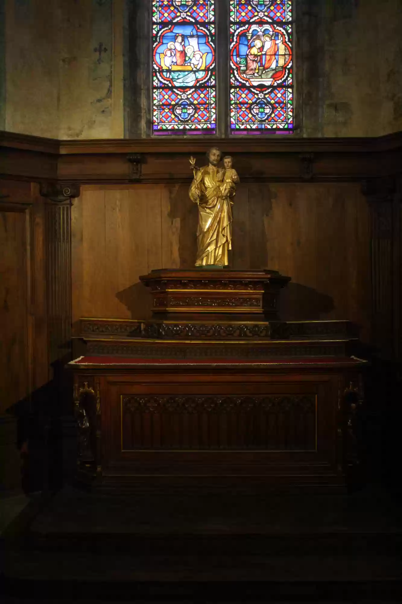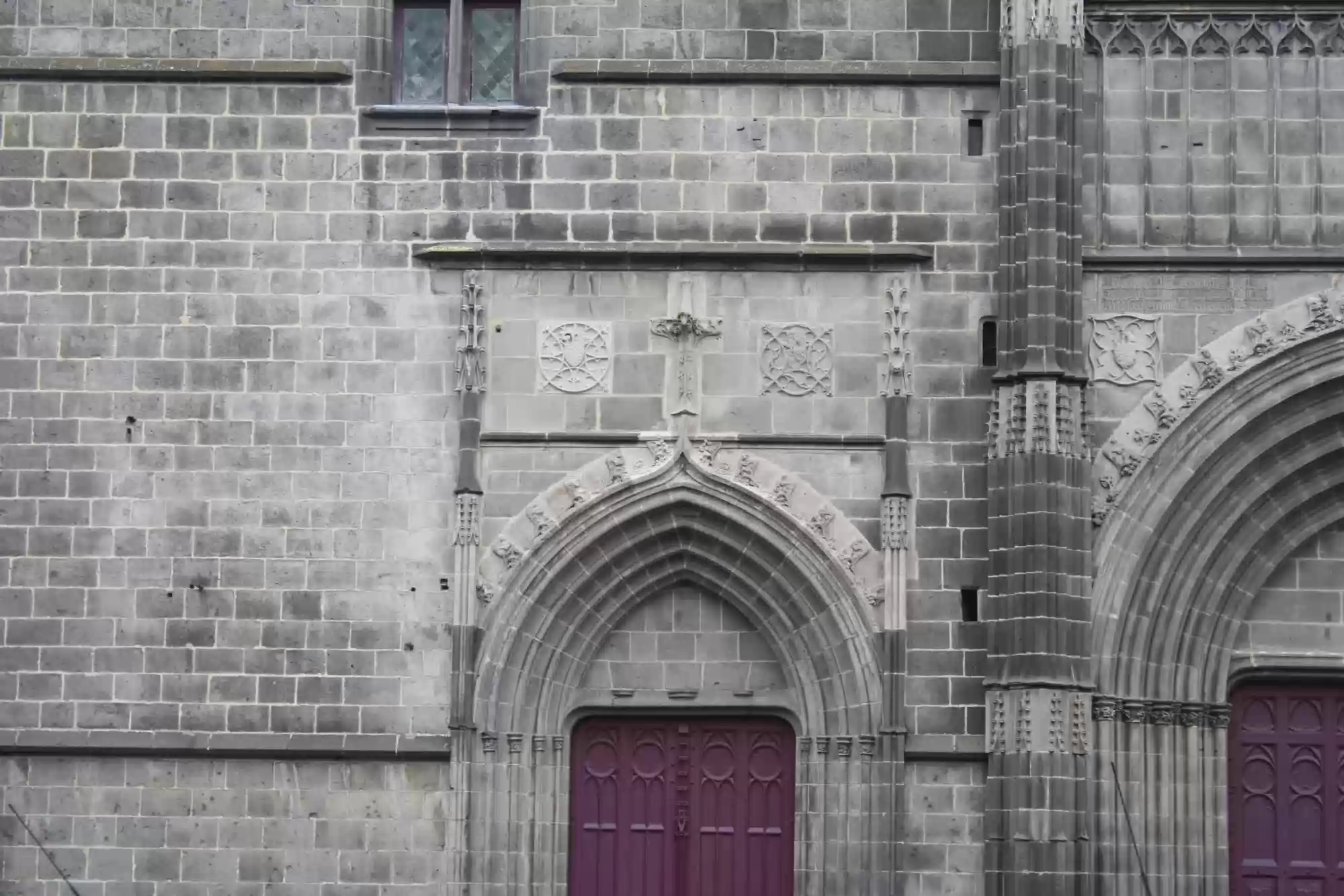 The 14th century cathedral is made of local basalt stone, which is very tough to carve. Main altar. 15th century frescoe (Hell). 13th century wooden statue. Labels