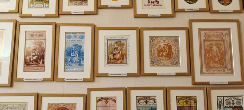 Crypt13 images Flavigny abbey, 8th-18th century, used as a anise sweet factory since the late 18th century. Anise sweet boxes. Pan used until 1855 to make sweets. Basin used from 1855. Anise sweets tin boxes. Labels