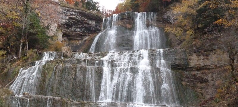 The spring of the Hérisson river are located at alt. 805m. The river then flows rapidly through a series of cascades towards a valley. Cascade de l'éventail (fan cascade), 65m high. Evergreen and decideous trees are mixed in the forest. Mouthe Labels