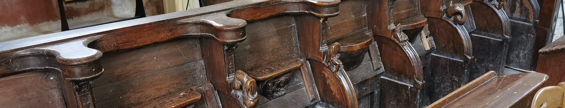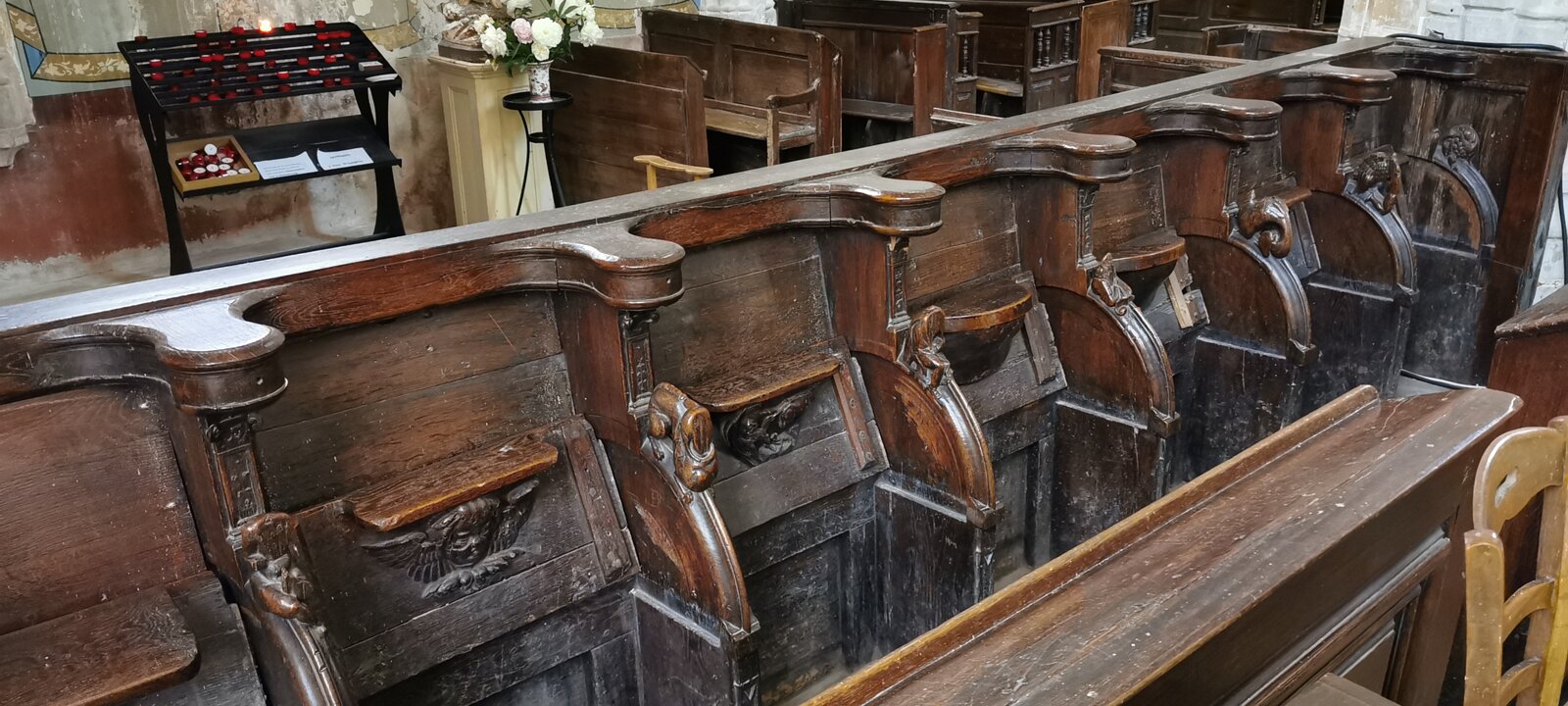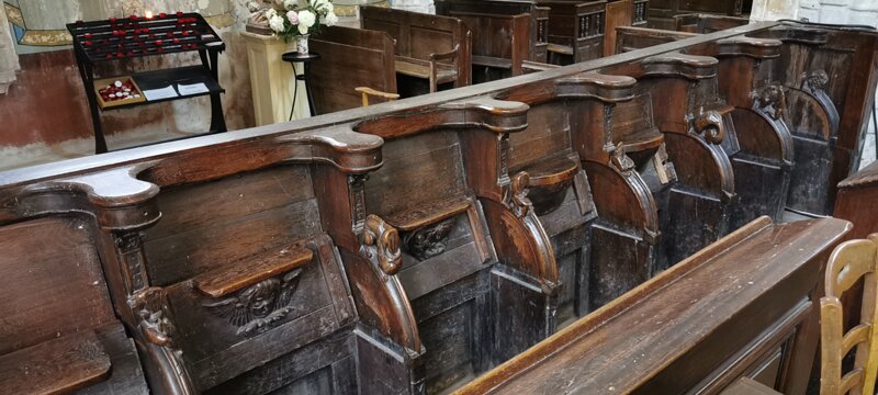 Notre Dame, 1491-1515. Stained glass window, ca. 1600. Stalls, 16th century. Stalls, 16th century. Stalls, 16th century. Stalls, 16th century. Labels