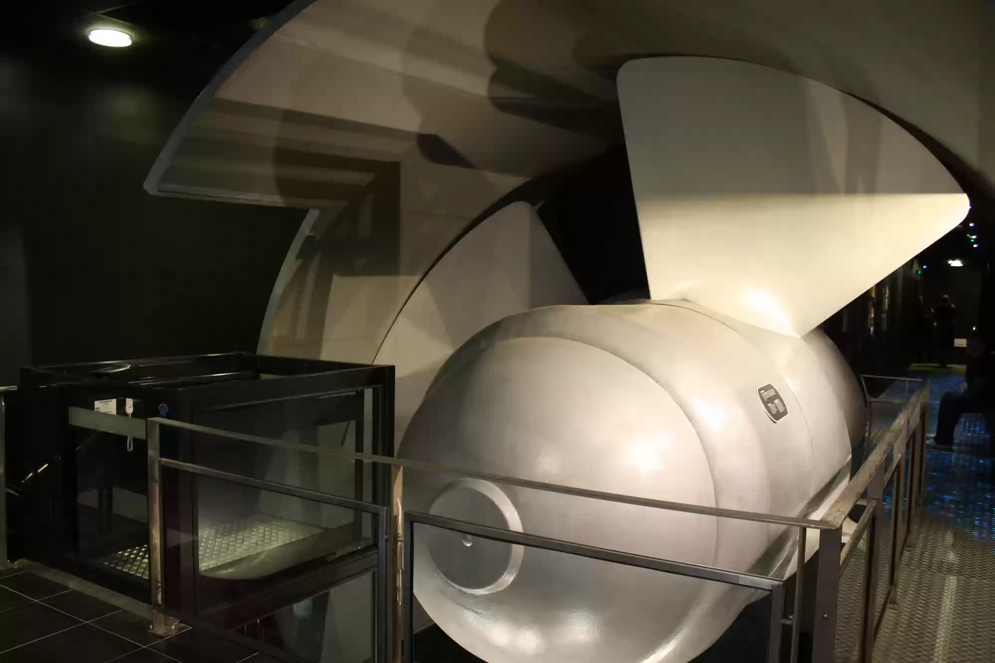 To-scale model of a turbine (2m high) or "bulb". Each of the 24 bulbs can produce 10 MW of electricity.