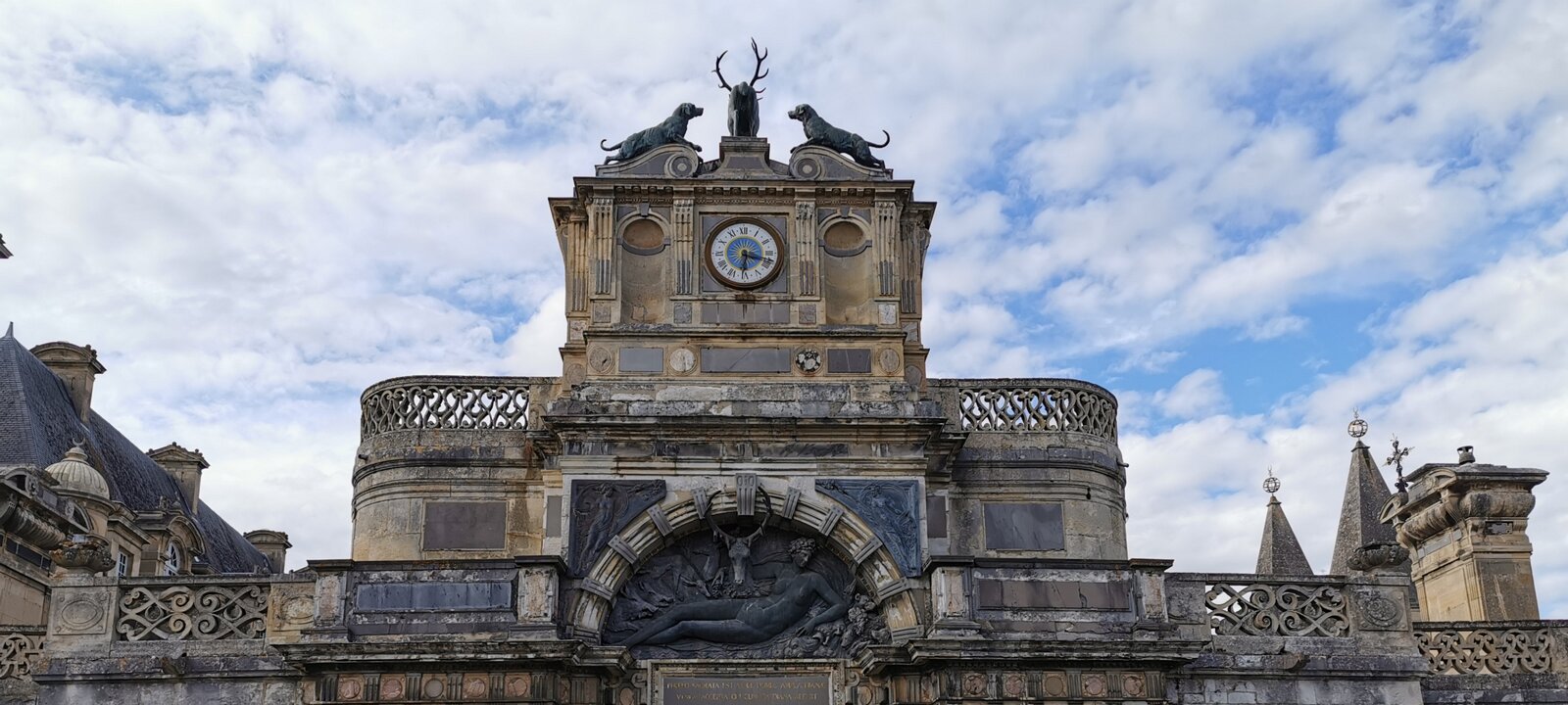 Portal with a red deer (the symbol of Diane, patroness of the hunters in roman and greek mythologies) and 4 hounds. The original statues were melted during the…