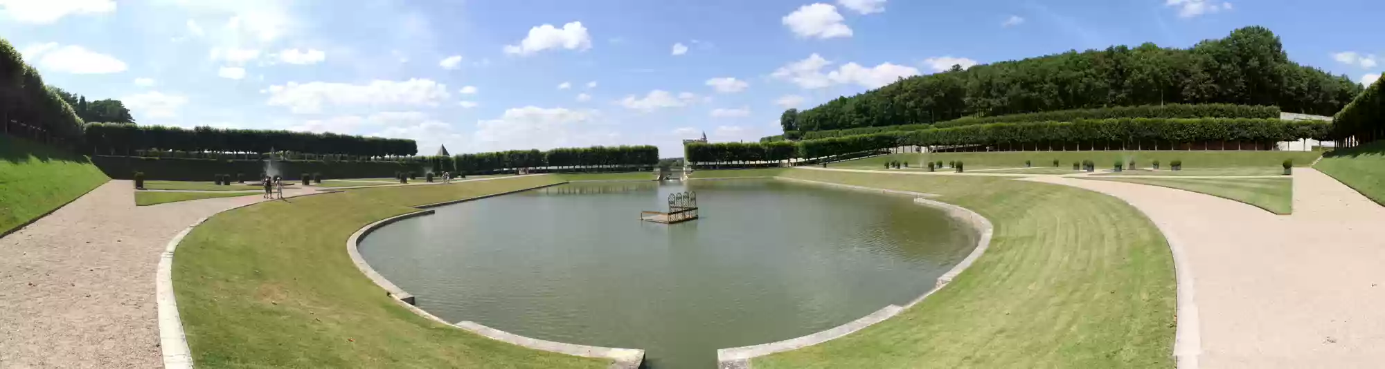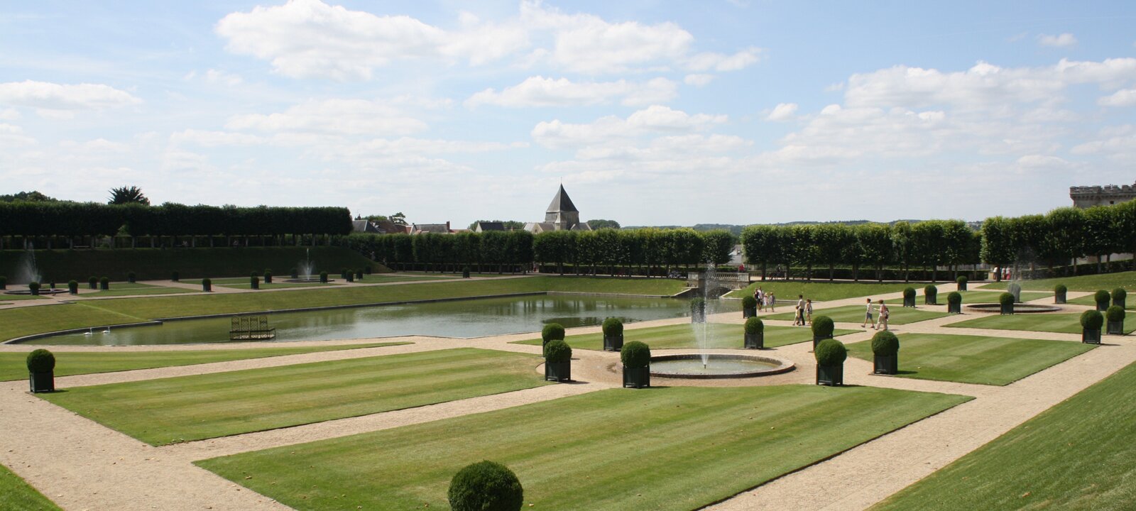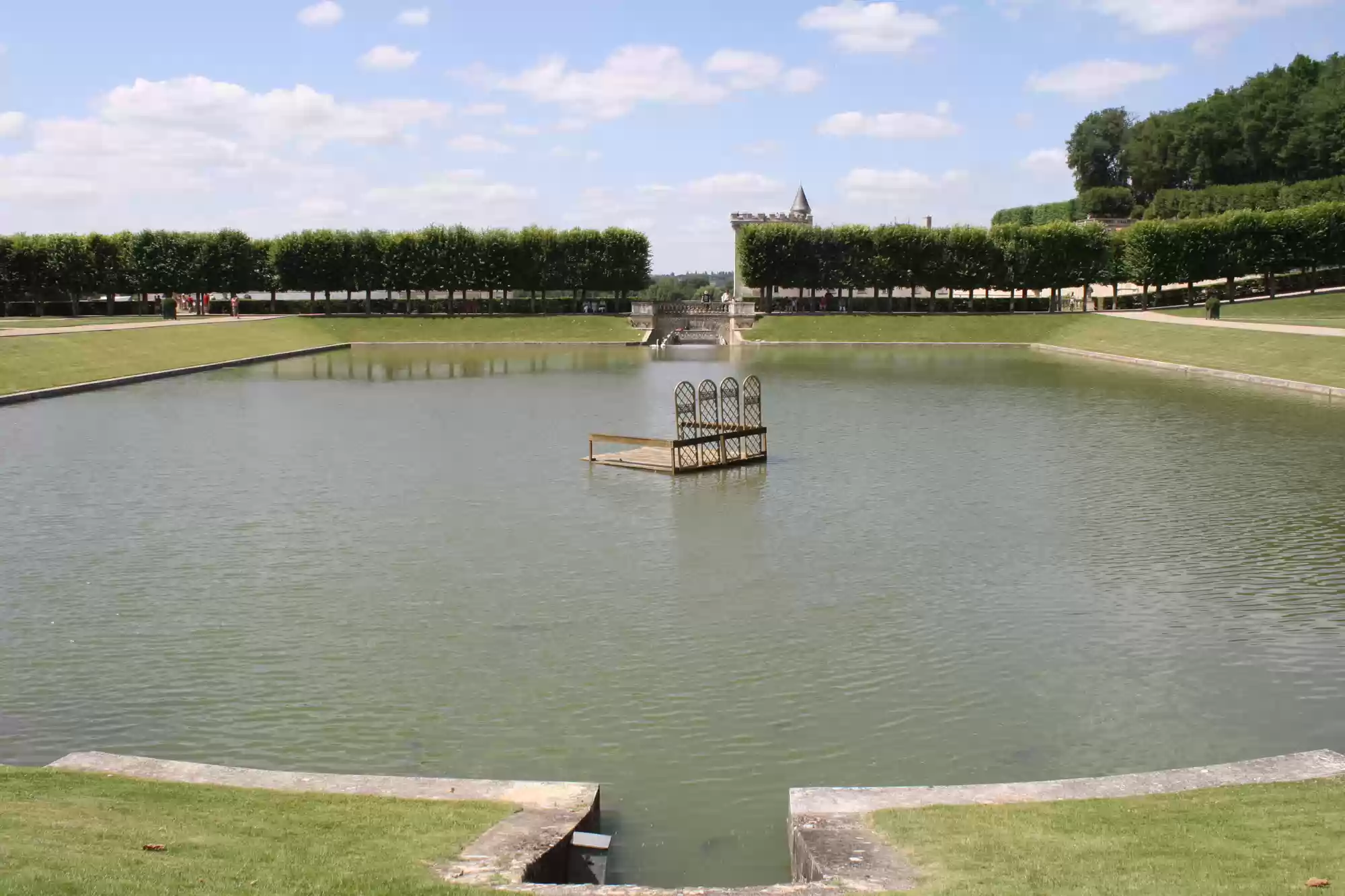 The water garden is of classical inspiration and is organized around a large Louis XV mirror-shaped pond. The garden is surrounded by a cloister of lime trees. Mirror pond. Kitchen garden Labels