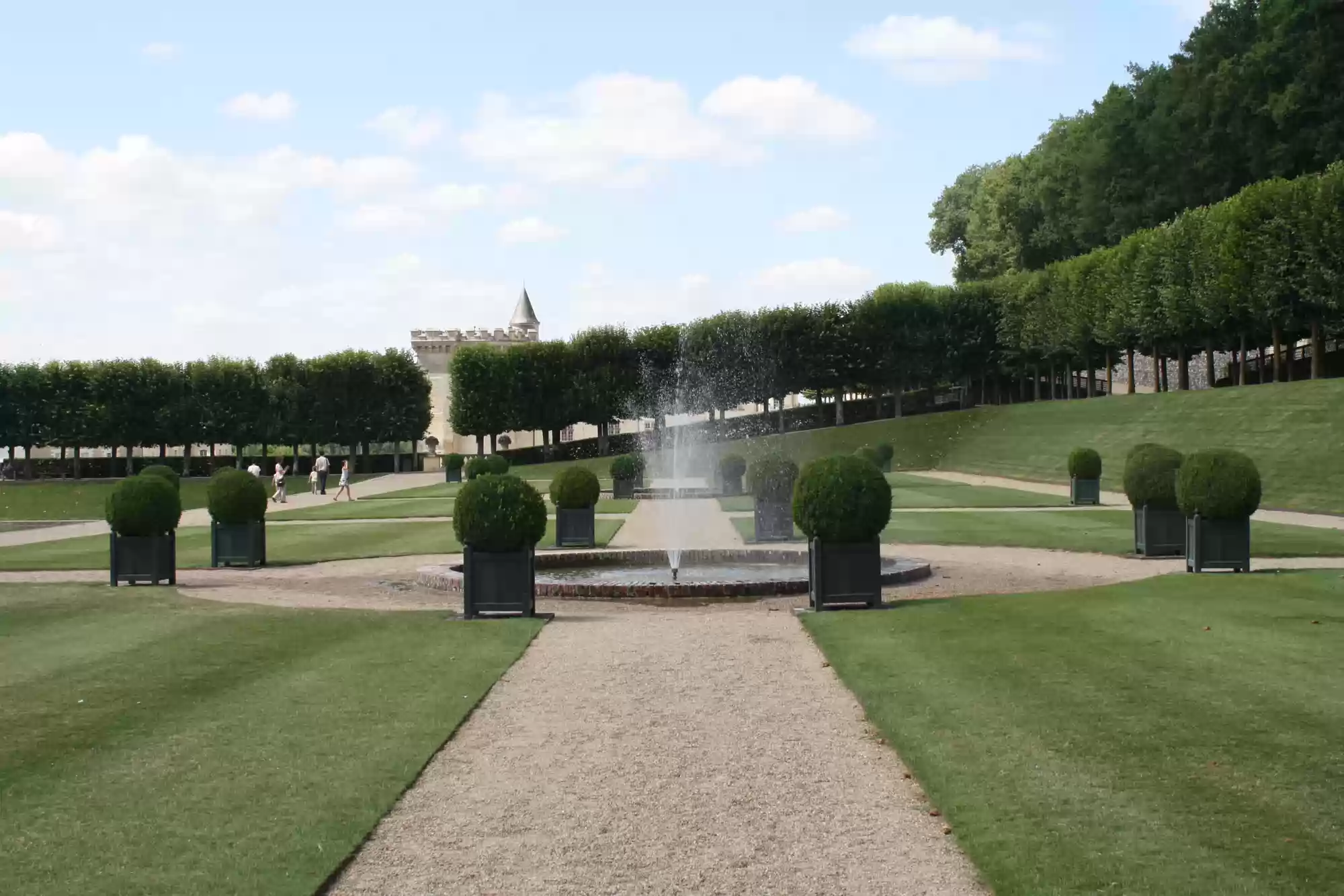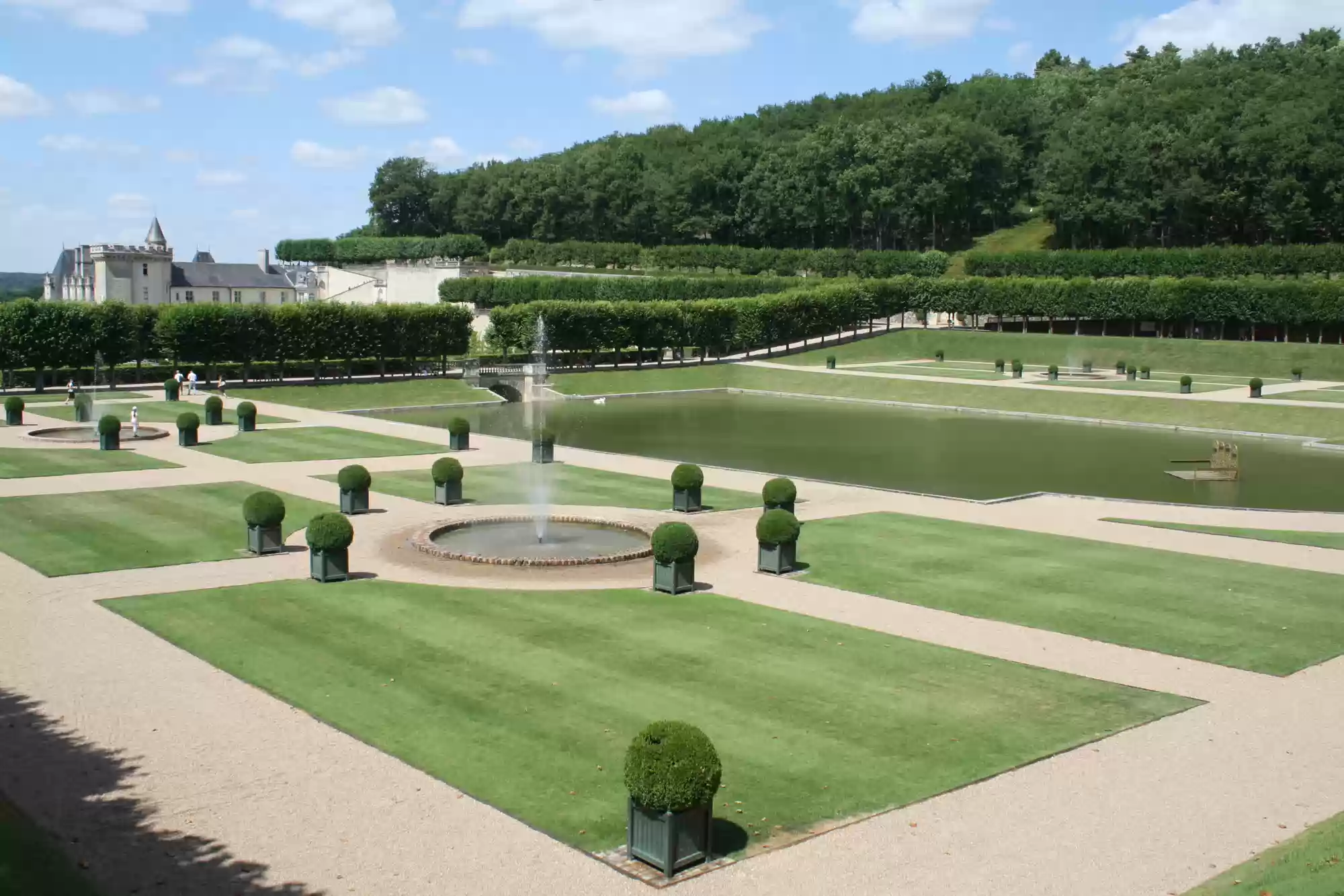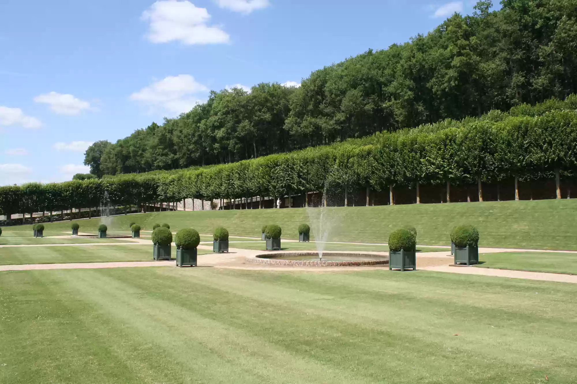 The water garden is of classical inspiration and is organized around a large Louis XV mirror-shaped pond. The garden is surrounded by a cloister of lime trees. Mirror pond. Kitchen garden Labels