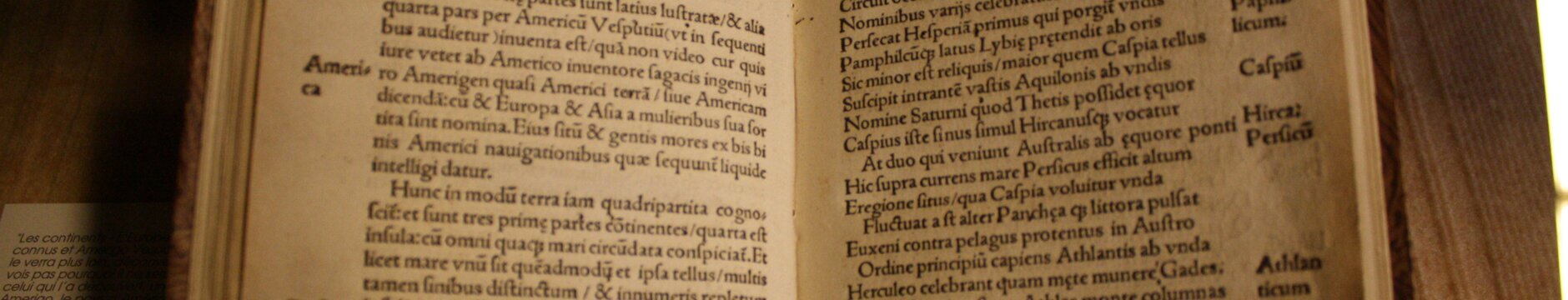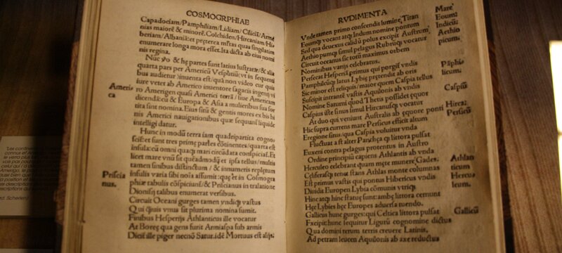 The Humanist Library, housed in a former covered market, contains many rare manuscripts and books includng 16th century printed books. Religious book, 7th century. Manuscript from the 7th century. Merovingian lectionary, manuscript on parchment, 7th century. 12th century manuscipt on parchment, Caroline minuscule script with margin annotations. Book with prayers, 12th century. Otto von Passau, The loving soul, 1430. Cursive gothic script. Saint Augustine, printed in 1468 on paper. Jakob Wimpfeling, printed in 1497 in Strasbourg on paper. Schoolbook of Beatus Rhenanus, 1498. Beatus was the founder of the library. First record of the word "America", making this book the de facto birth certificate of the "New World". Matthias Ringmann, printed in 1507. Gospel book, J. Geiler von Kaysesberg. printed in 1515. Claude Ptolemy (100-170 CE), book printed in Strasbourg on paper in 1520. Charles V's letter making Beatus a nobleman, 18 August 1523. Martin Luther, Bible, 1549. Sainte-Foy church Labels