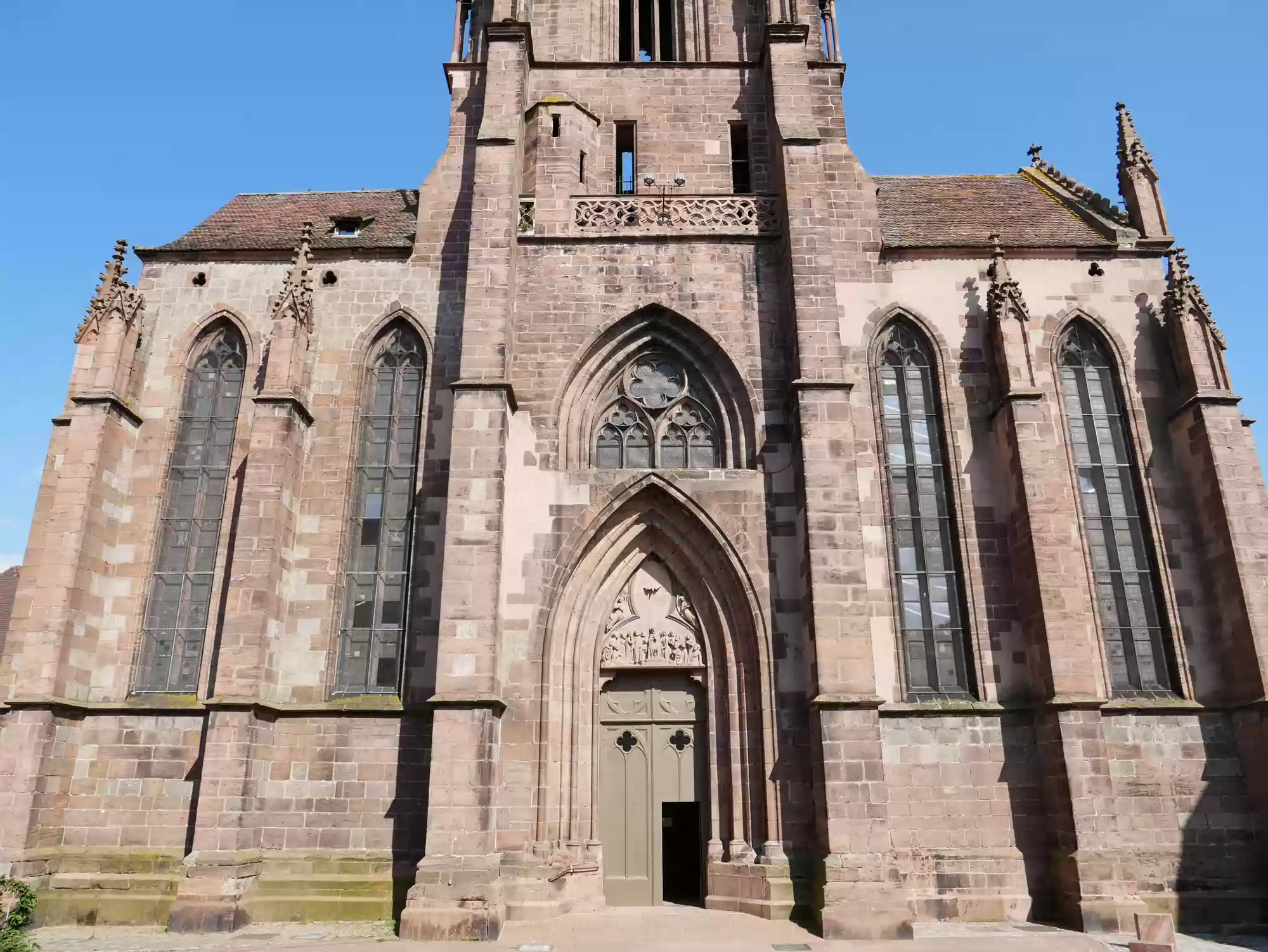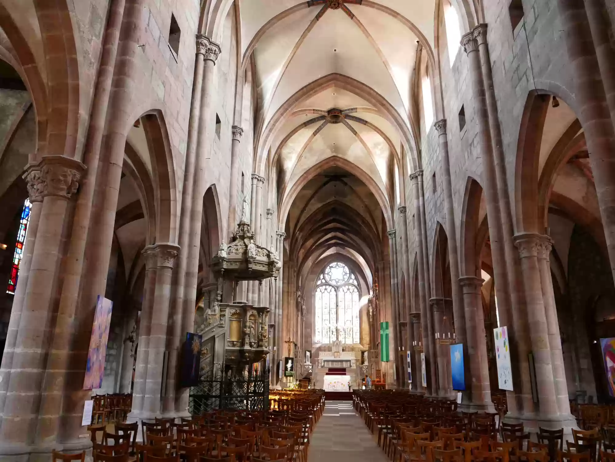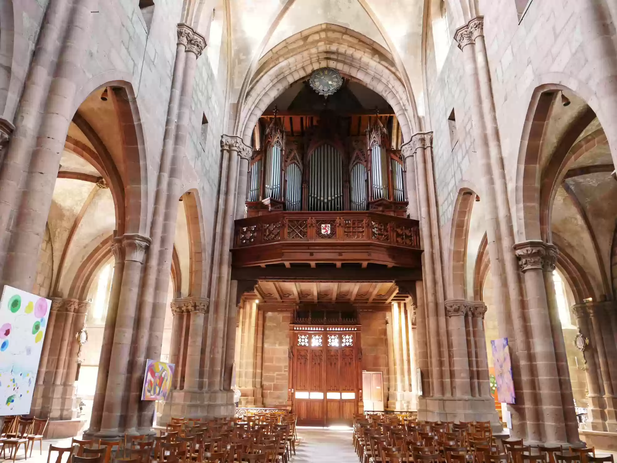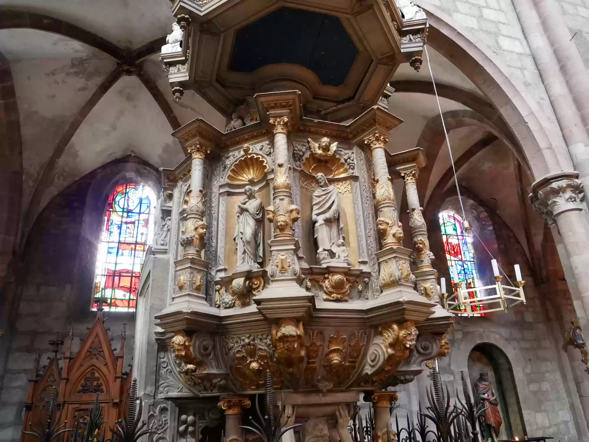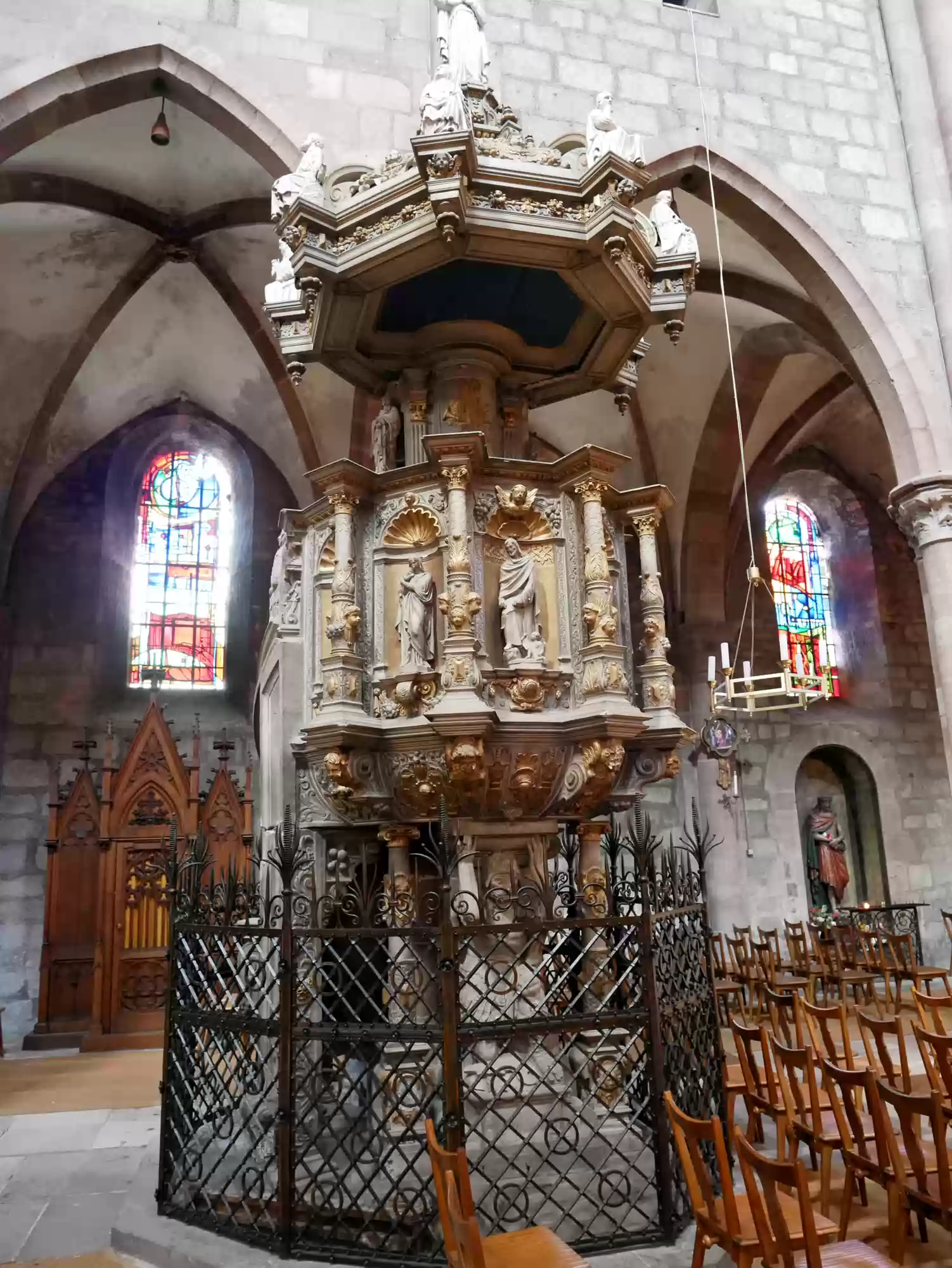St Georges gothic church, 13-15th centuries. Chair, 1619. Chair, 1619. Chair, 1619: Samson. Sainte-Foy church Labels
