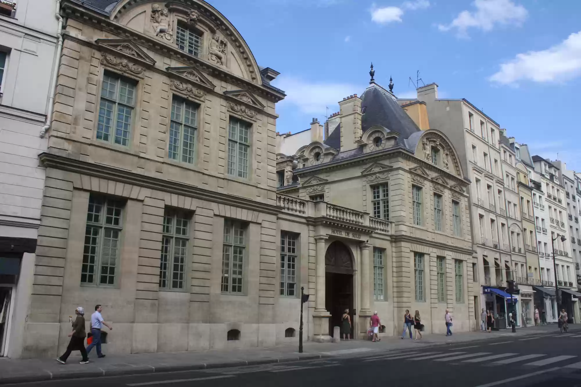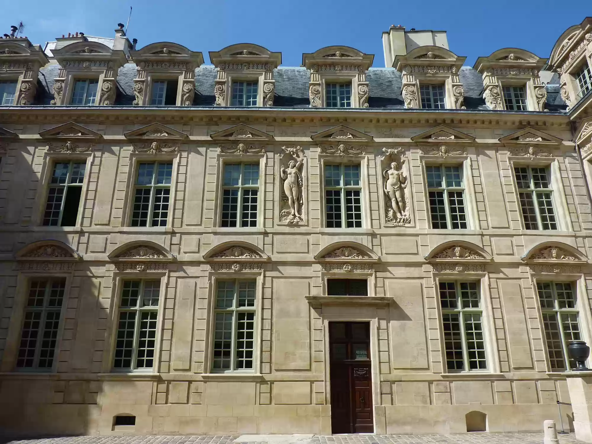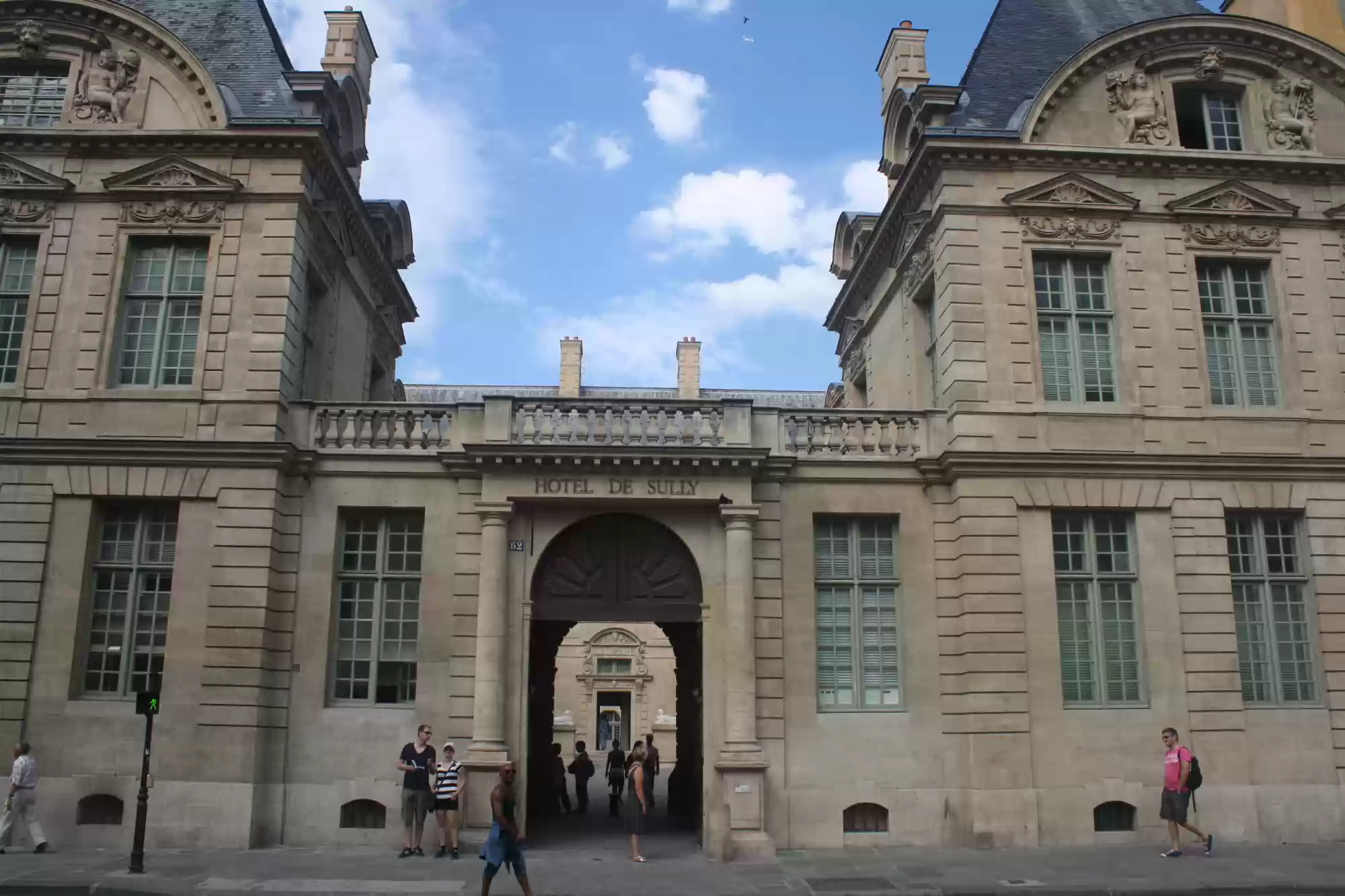 Vosges square is surrounded by several hôtels particuliers (private mansions/townhouses), such as the Hôtel de Sully, built between 1625 and 1630. . Hôtel de Sully. Hôtel de Sully. Staircase. Below a flight of stairs. . Bibliothèque HistoriqueNotre-Dame-des-Blancs-Manteaux Labels