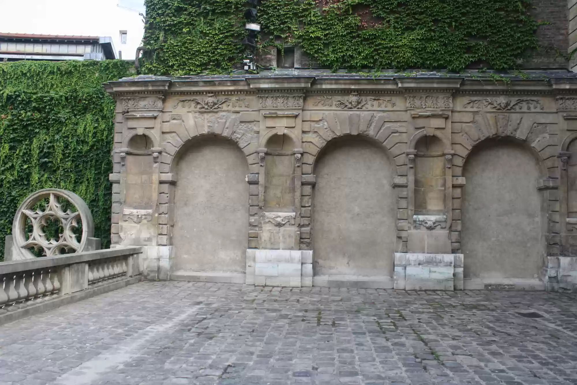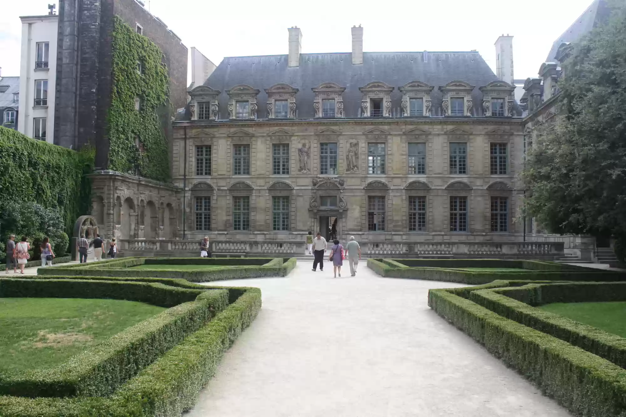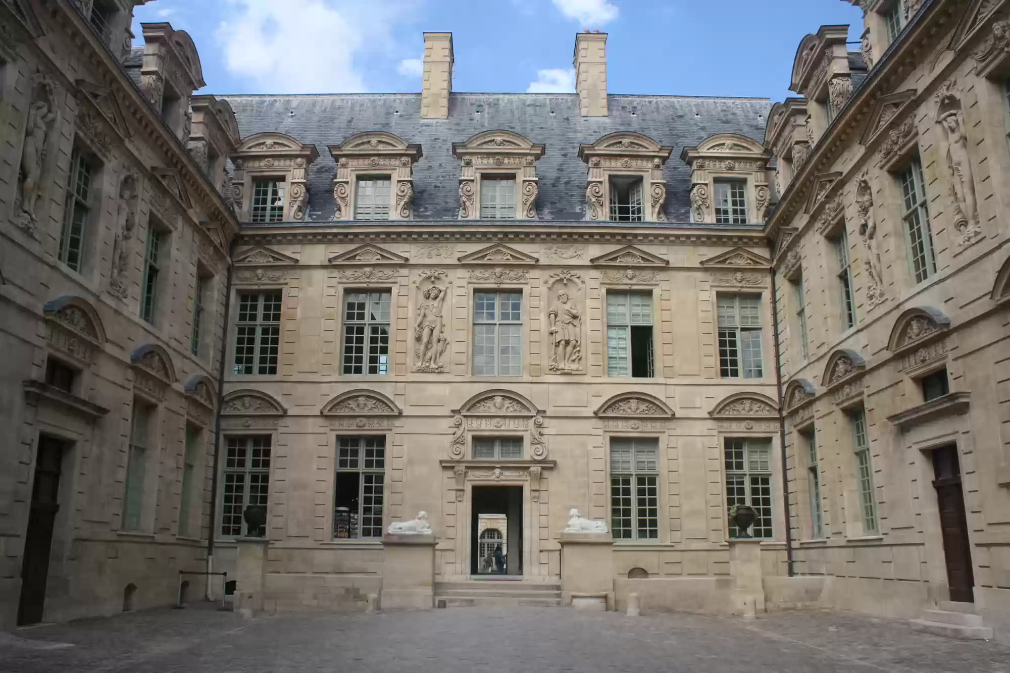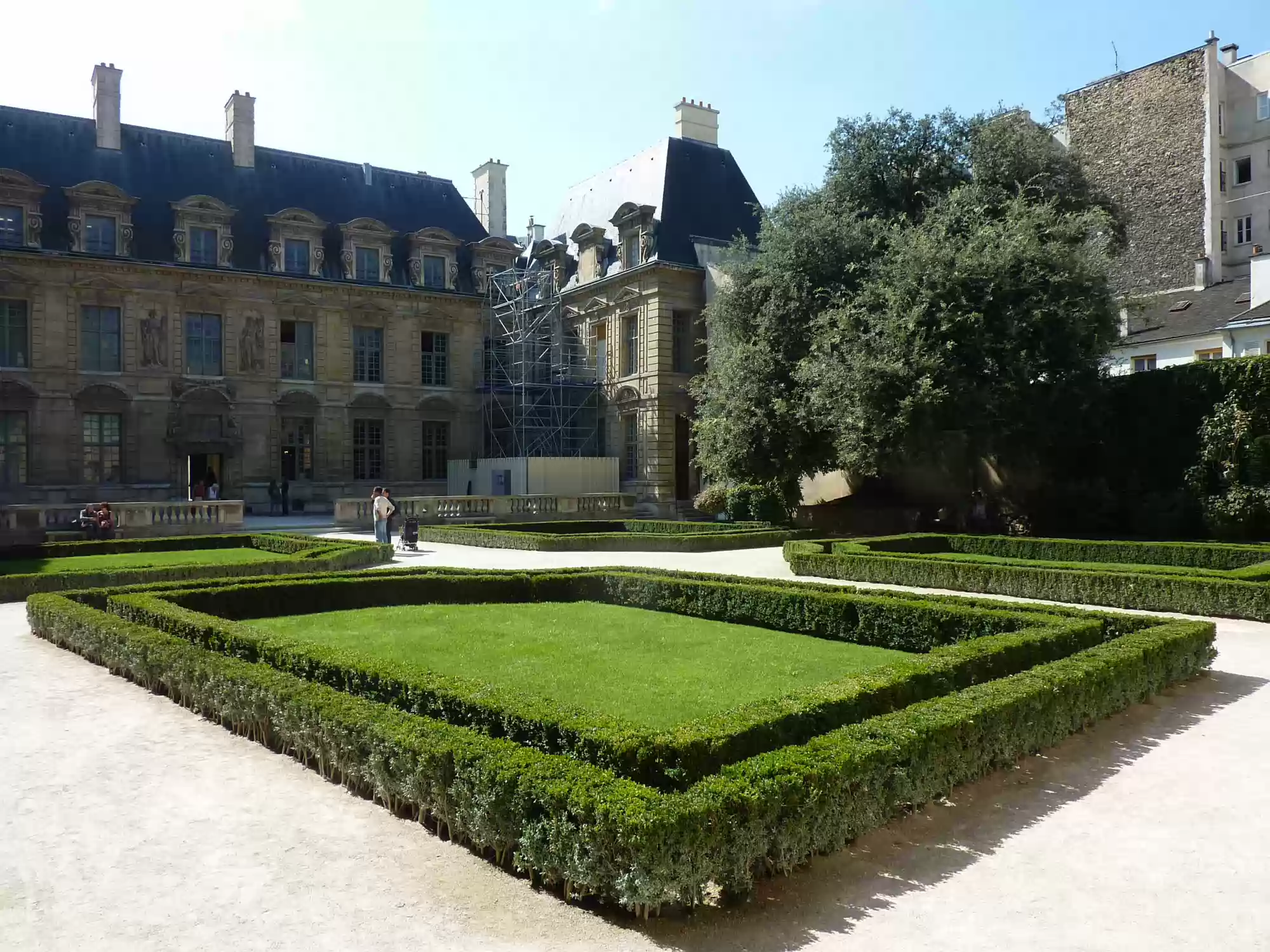 Vosges square is surrounded by several hôtels particuliers (private mansions/townhouses), such as the Hôtel de Sully, built between 1625 and 1630. . Hôtel de Sully. Hôtel de Sully. Staircase. Below a flight of stairs. . Bibliothèque HistoriqueNotre-Dame-des-Blancs-Manteaux Labels