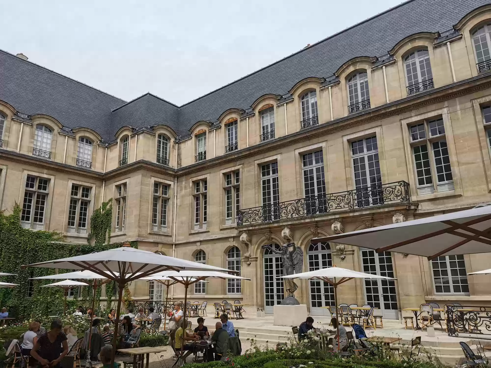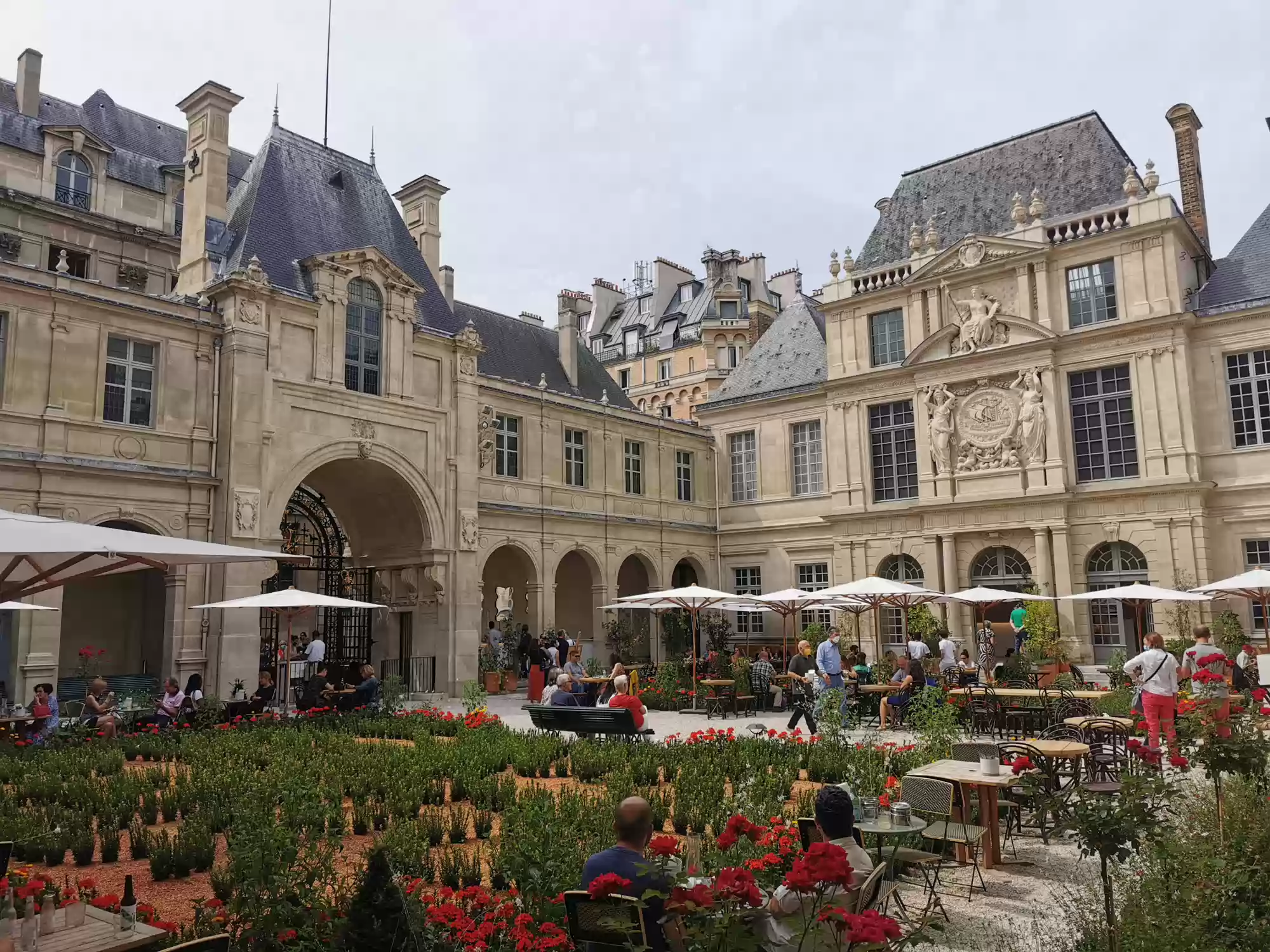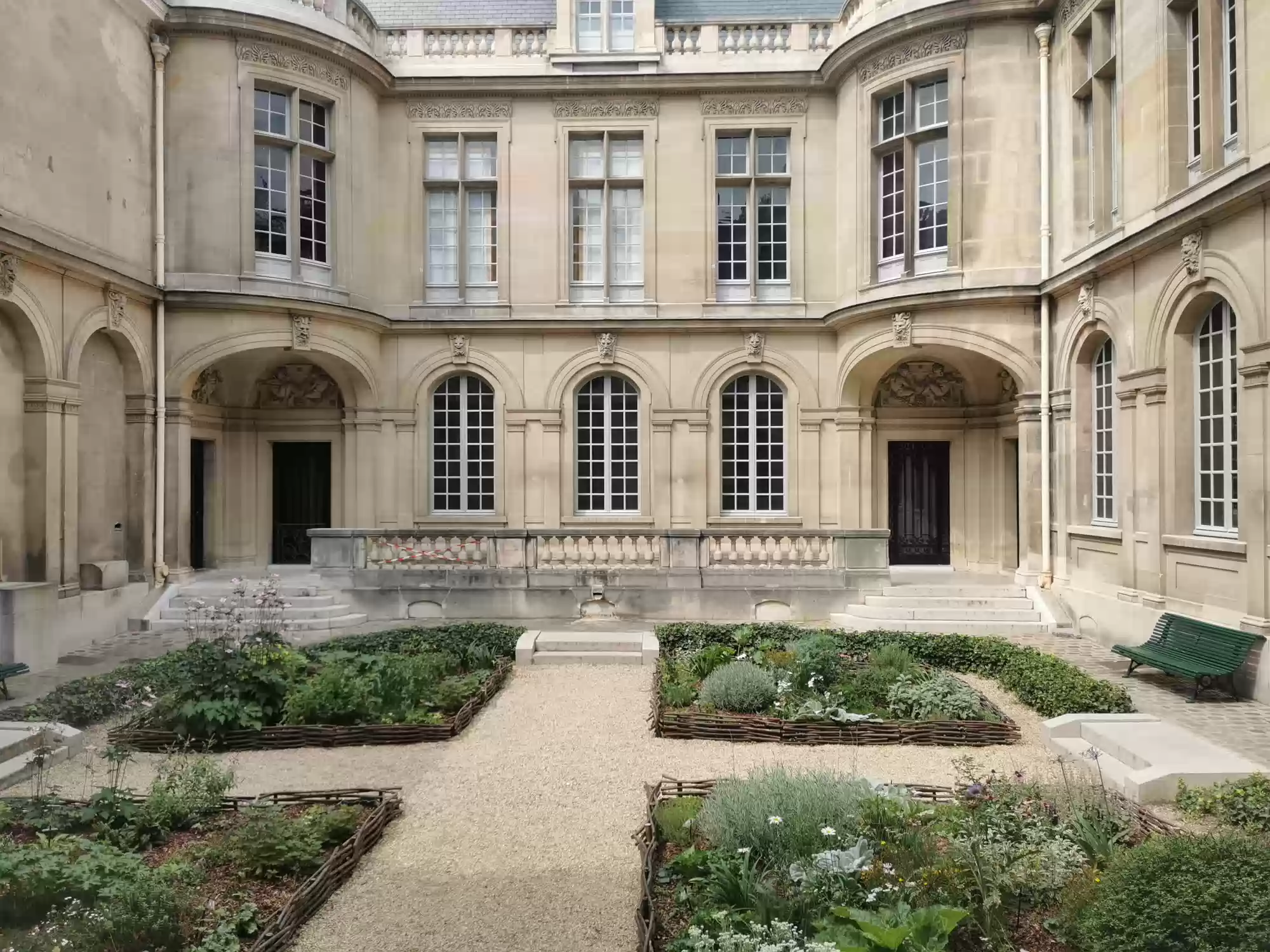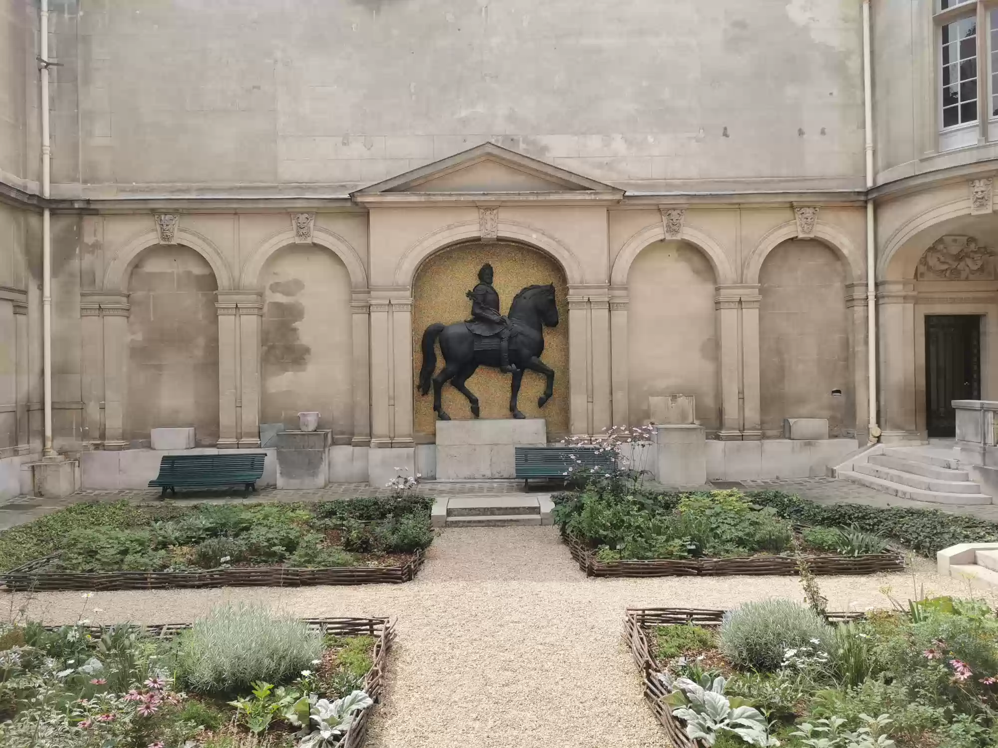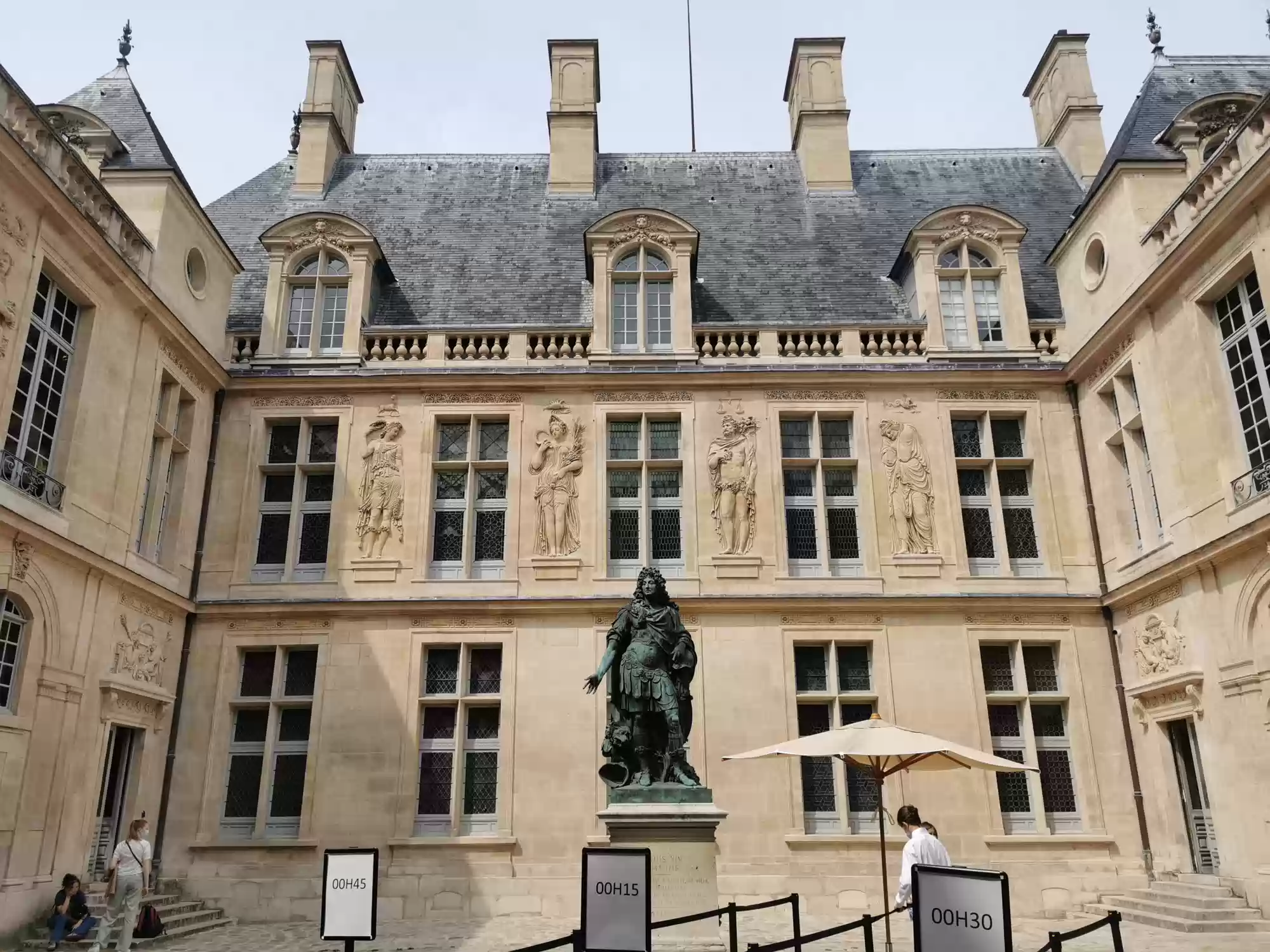Main courtyard of hotel Carnavalet, with a statue of Louis XIV by Antoine Coysevox, 1689. The renaissance hotel was remodeled by Mansart in 1660. Roofs were…