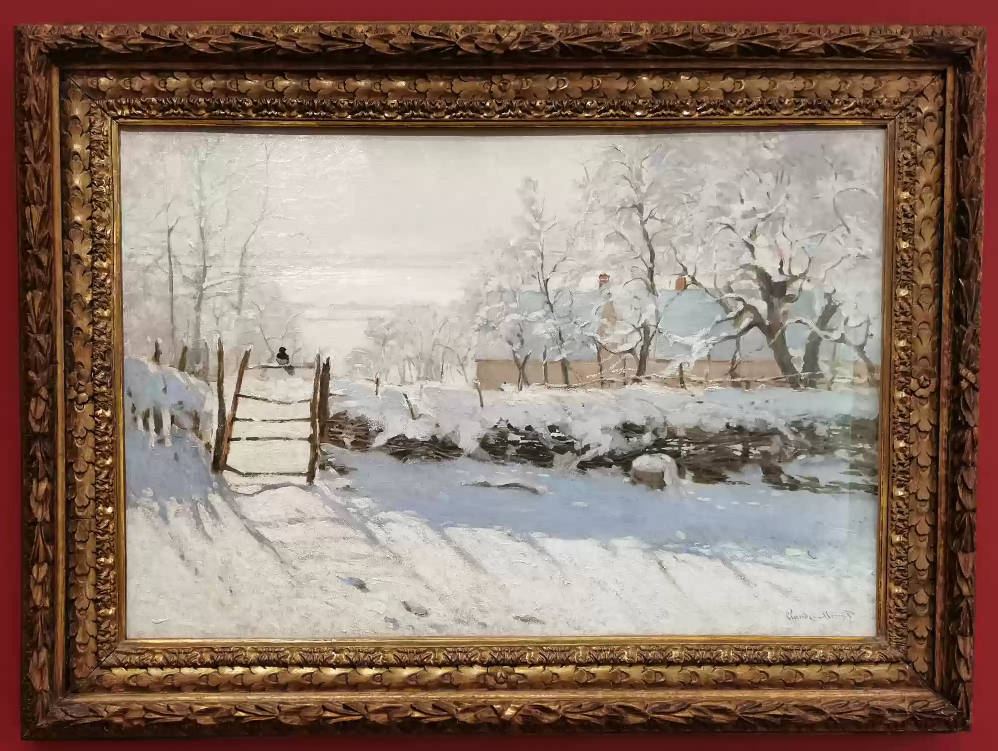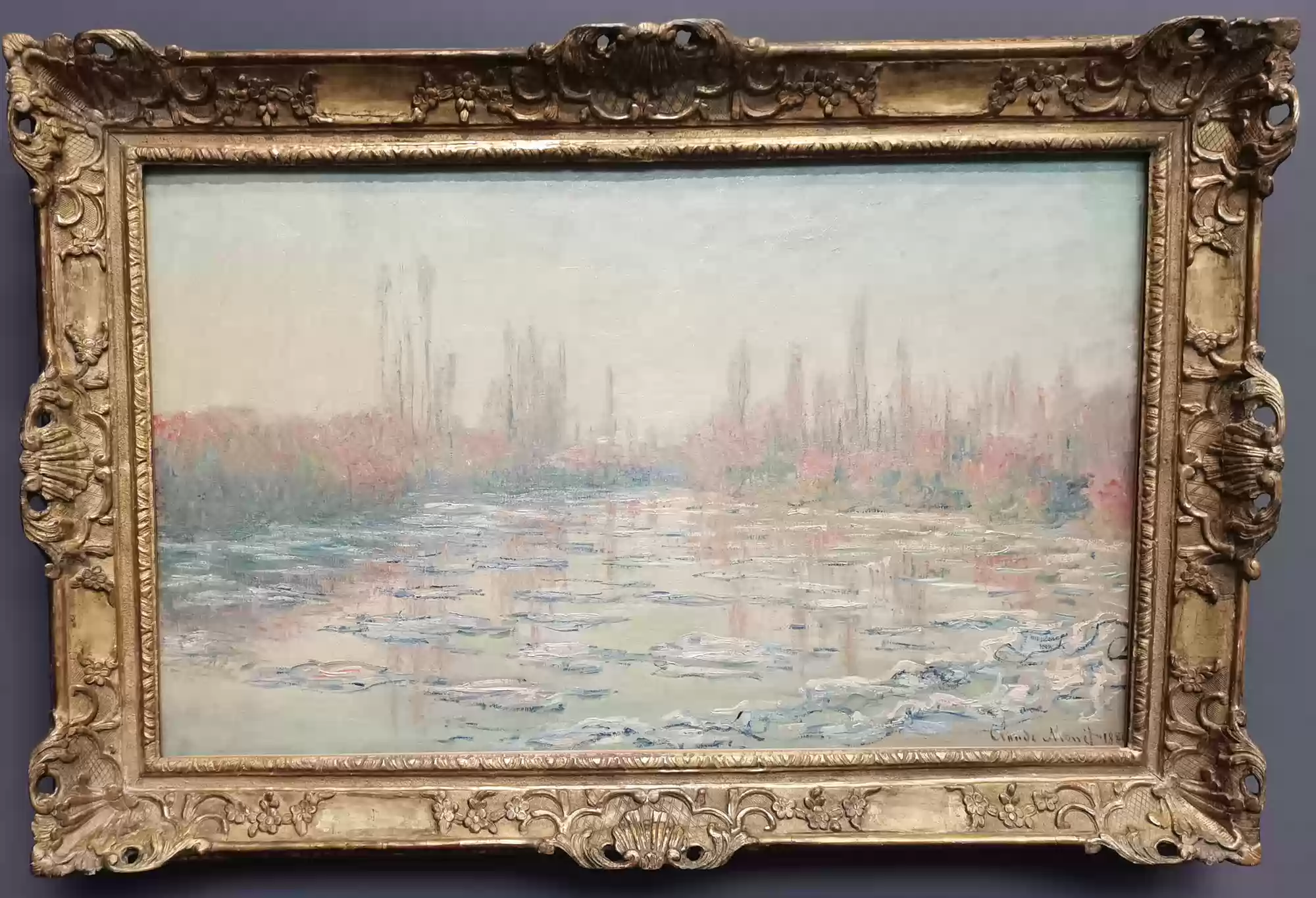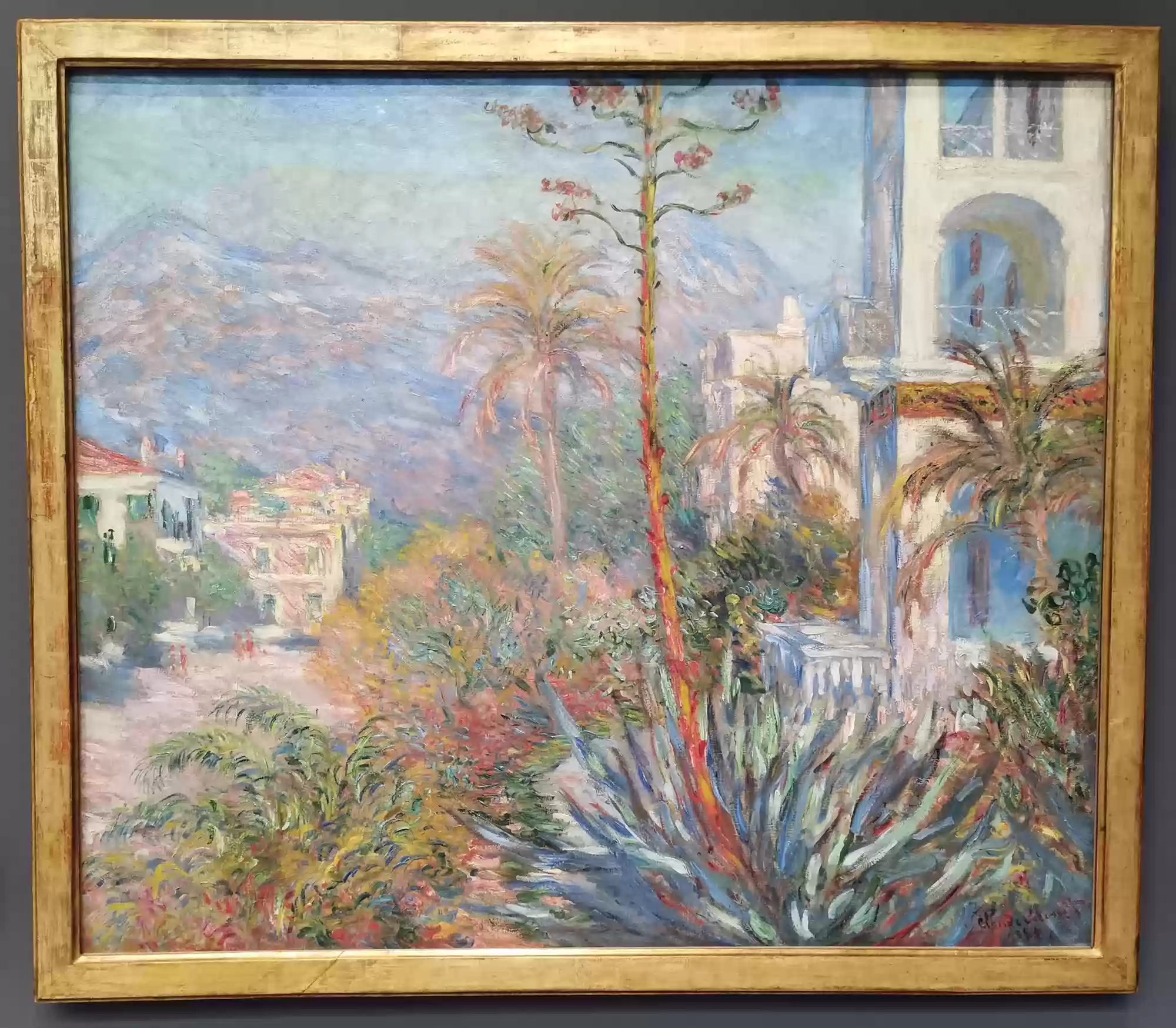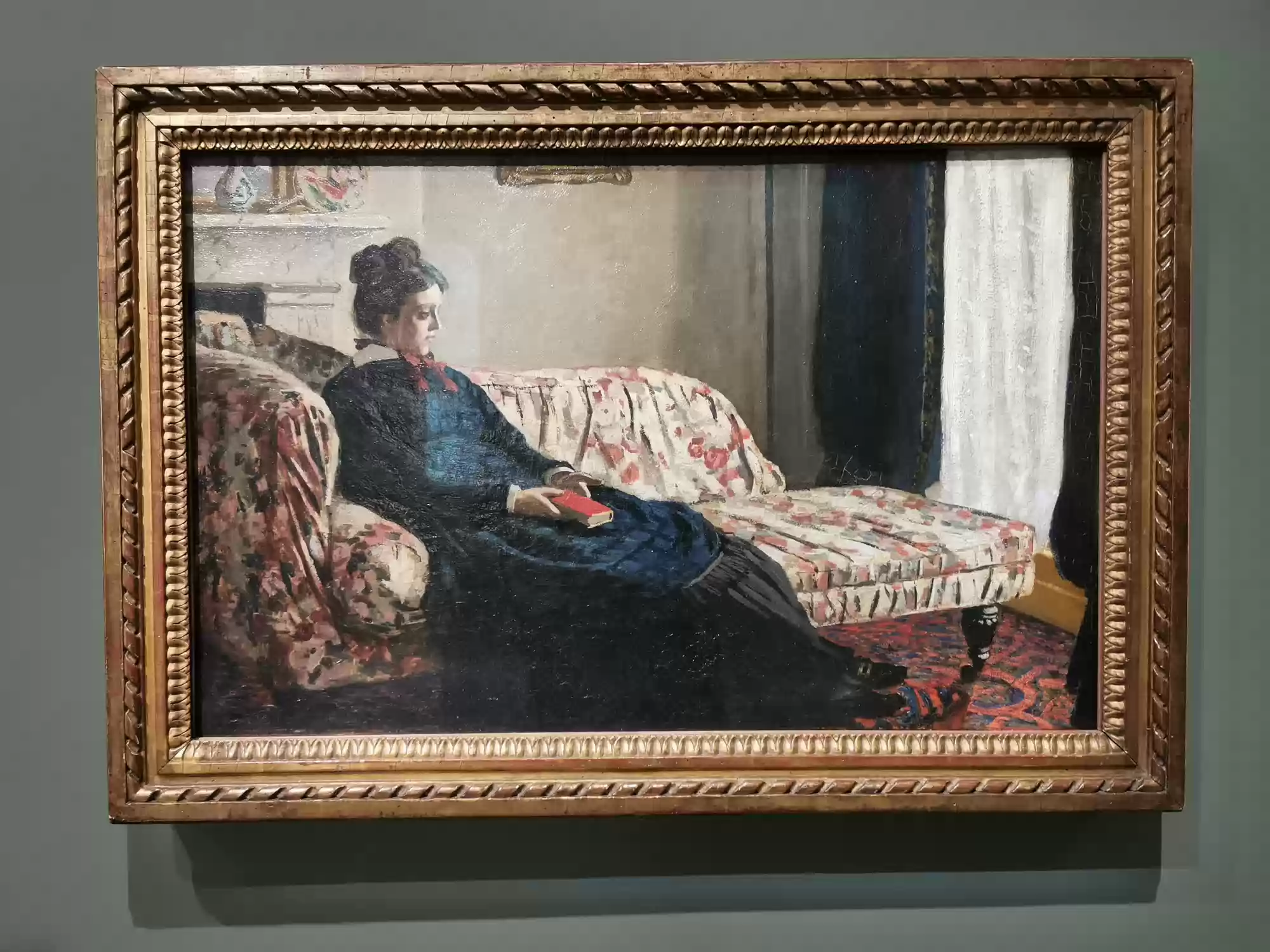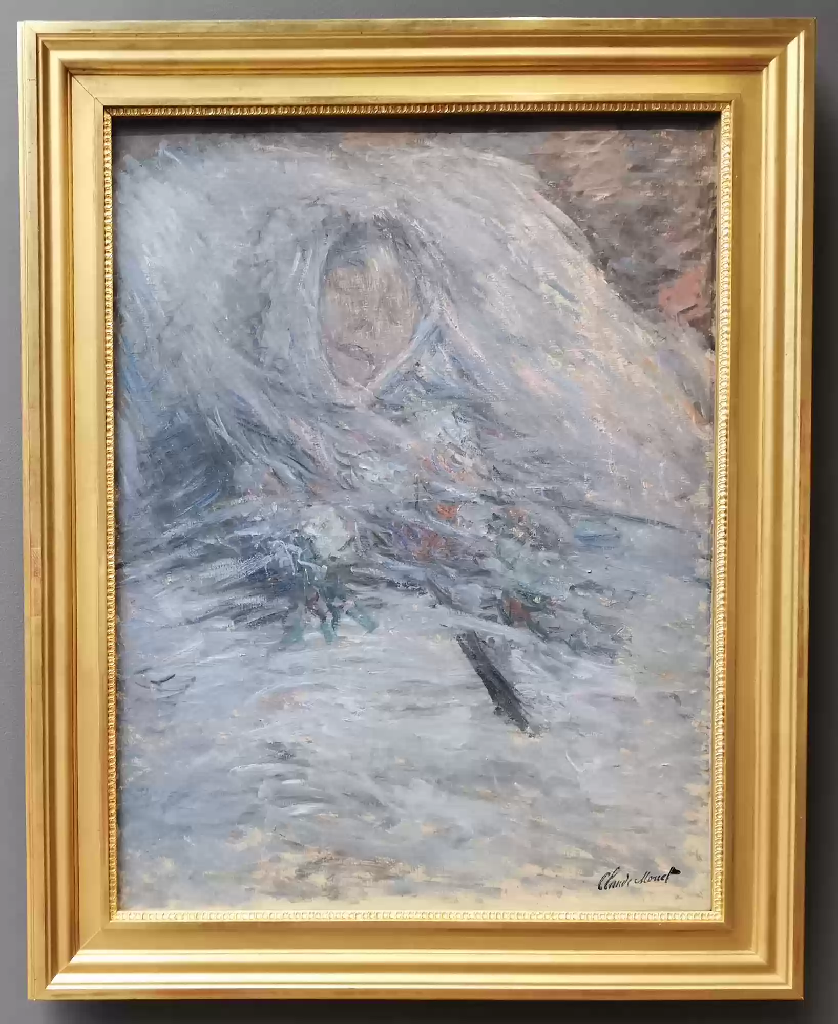 Claude Monet, Luncheon on the grass, 1865-1866, left unfinished (an attempt to outperform Manet). Claude Monet, Madame Louis Joachim Gaudibert, 1868. Claude Monet, The magpie, 1868-1869. Claude Monet, Madame Monet on a sofa, ca. 1871. Monet, Rouen cathedral. Claude Monet, Inside an apartment, 1875. Pierre-Auguste Renoir, Portrait of Claude Monet, 1875. Claude Monet, Saint-Lazare station, 1877. Claude Monet, Camille on her deathbed, 1879. Camille Monet was Claude's wife. Claude Monet, Ice melting on the Seine river, 1880. Claude Monet, Villas in Bordighera, 1884. Claude Monet, Water lillies, pink harmony, 1900. Claude Monet, London, the Houses of Parliament, Sunlight Opening in Fog, 1904. ManetVan Gogh Labels