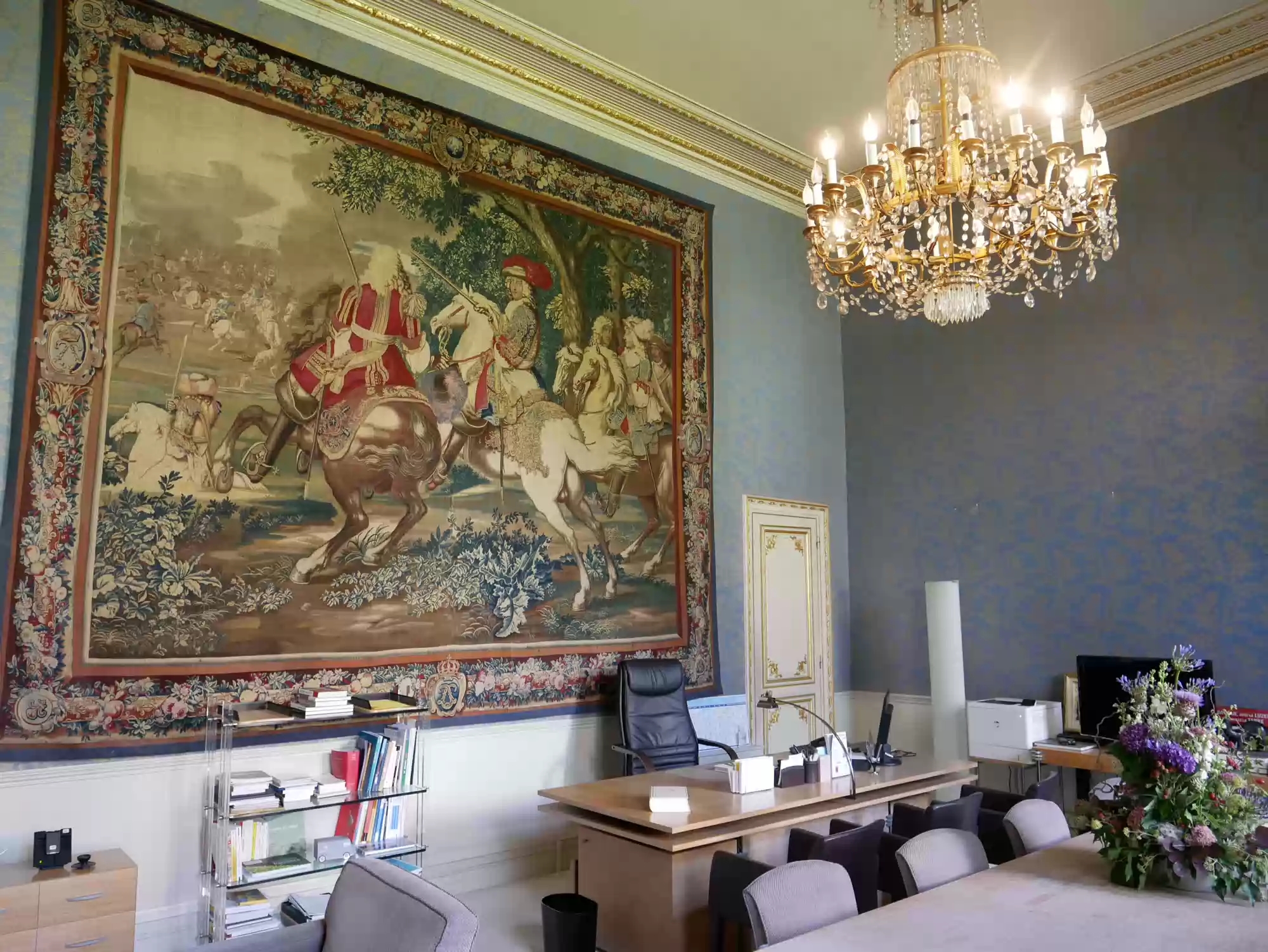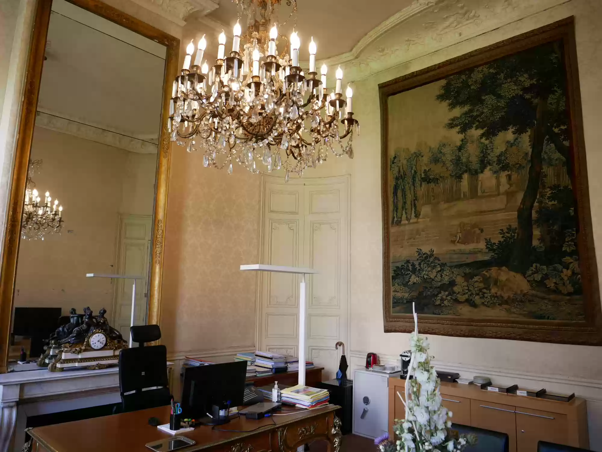 Office, Gobelins tapestry from the 17th century, clock by Roblin (1870).