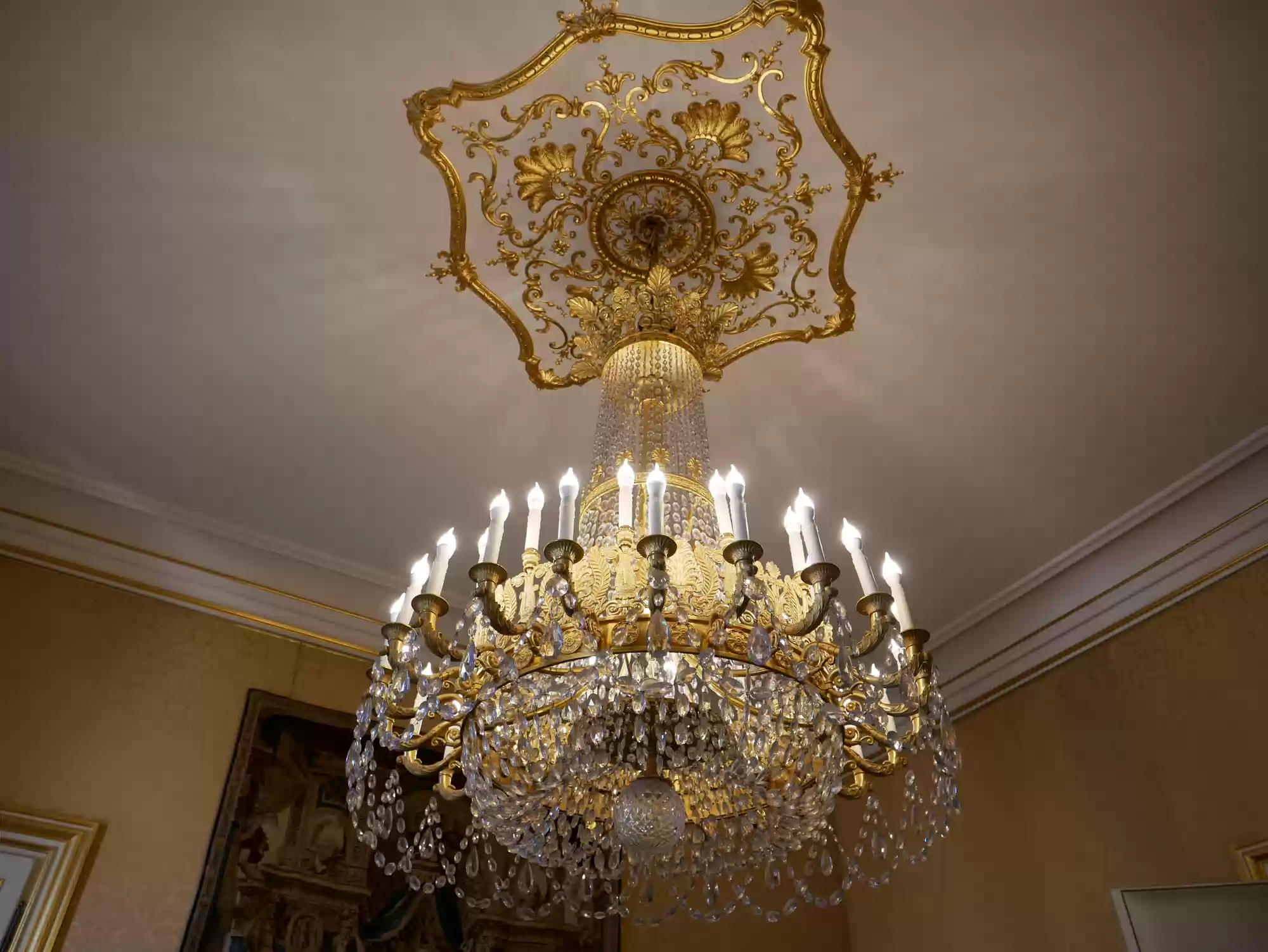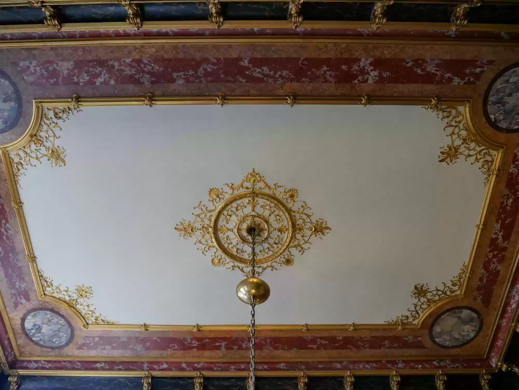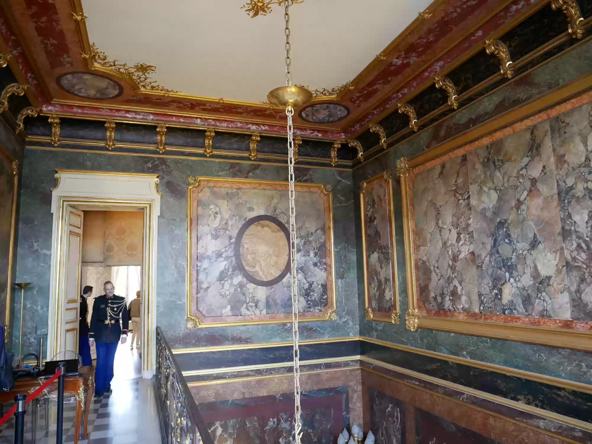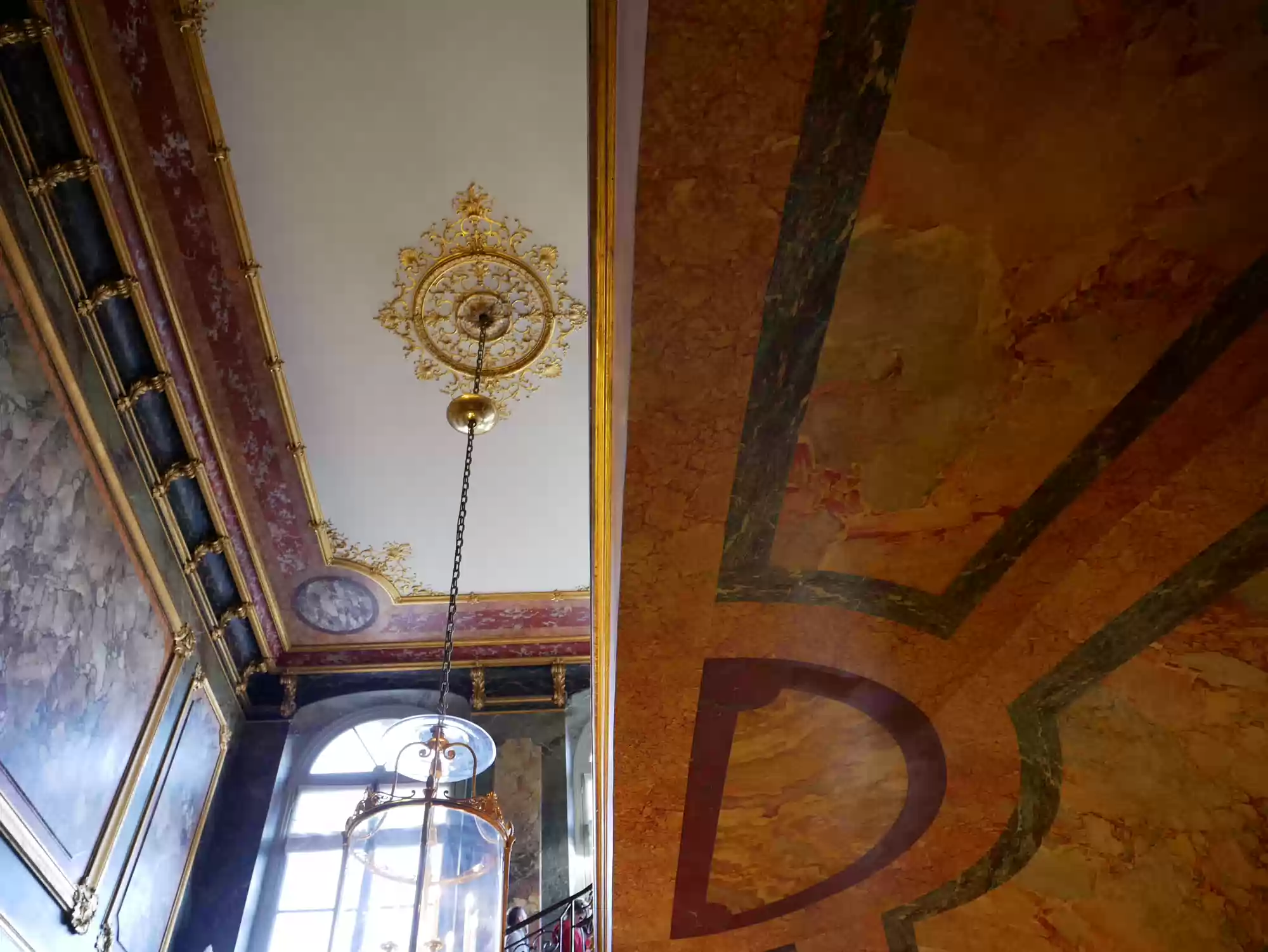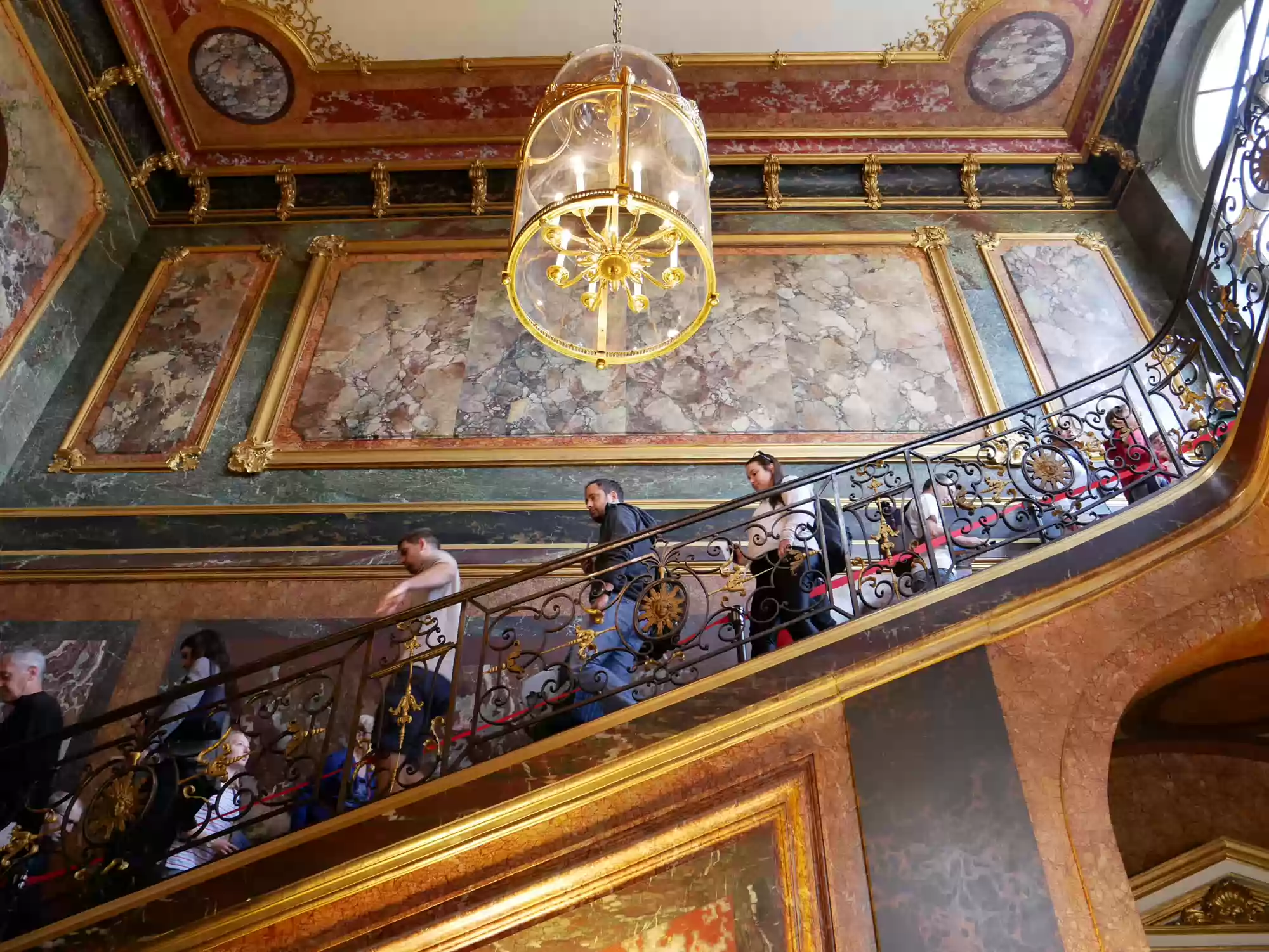 Grand staircase. Faux-marble painted in 1855. The handrail was wrought in 1724. The light is from the early 19th century.