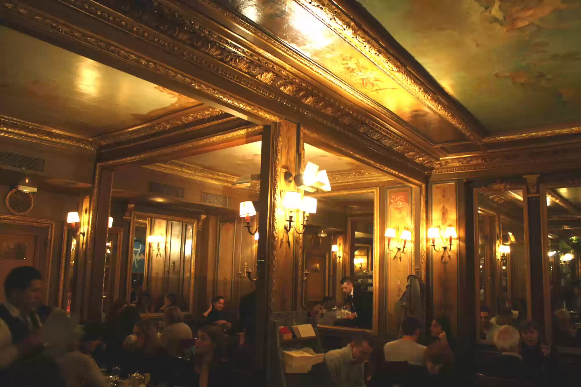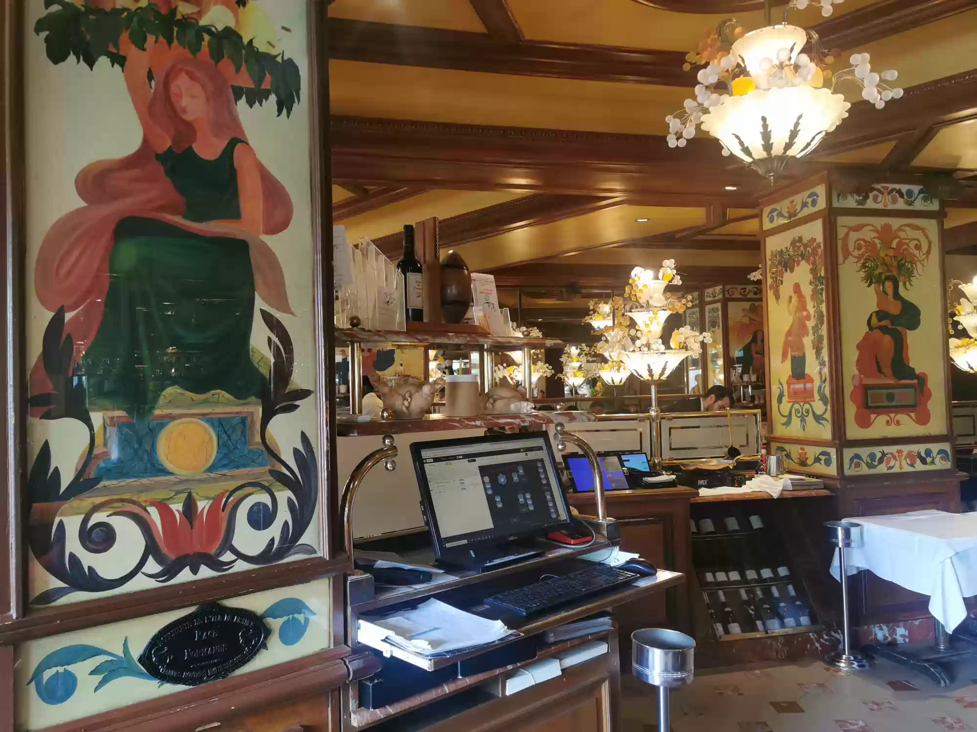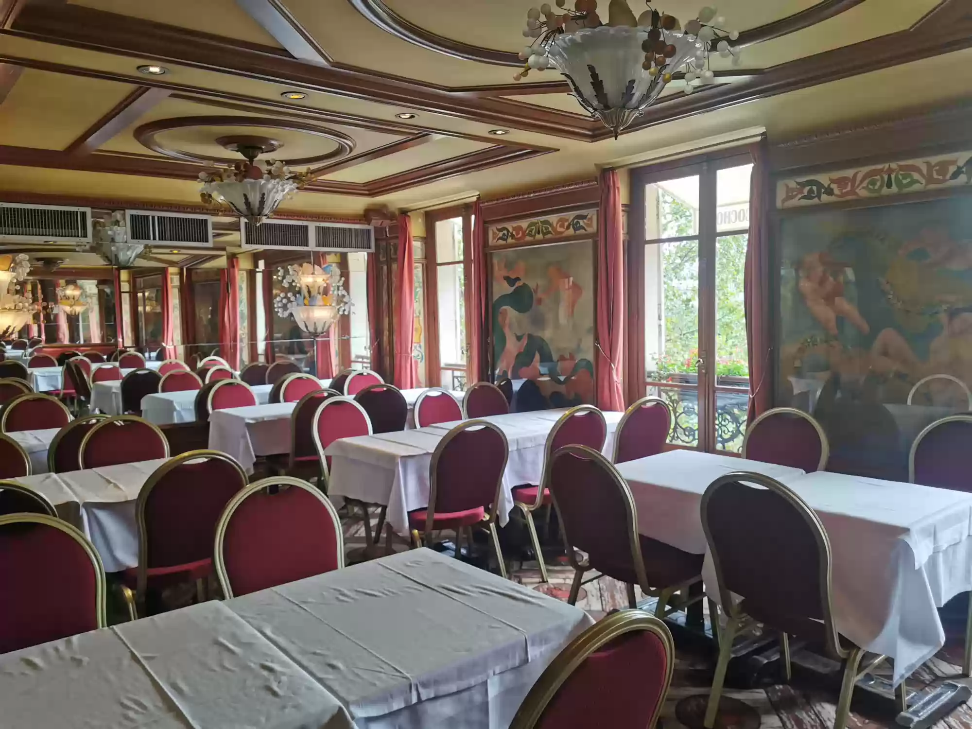 Restaurant room at Jenny's, mid 19th century. The map in the background depicts Colmar in Alsace.