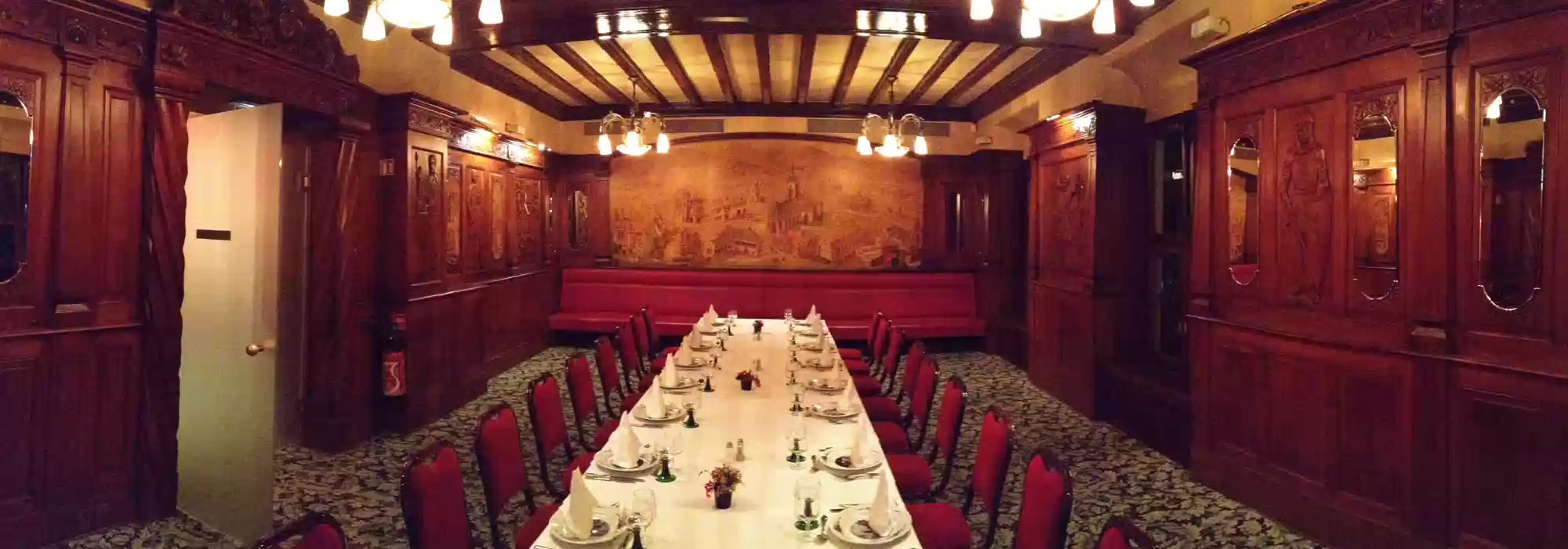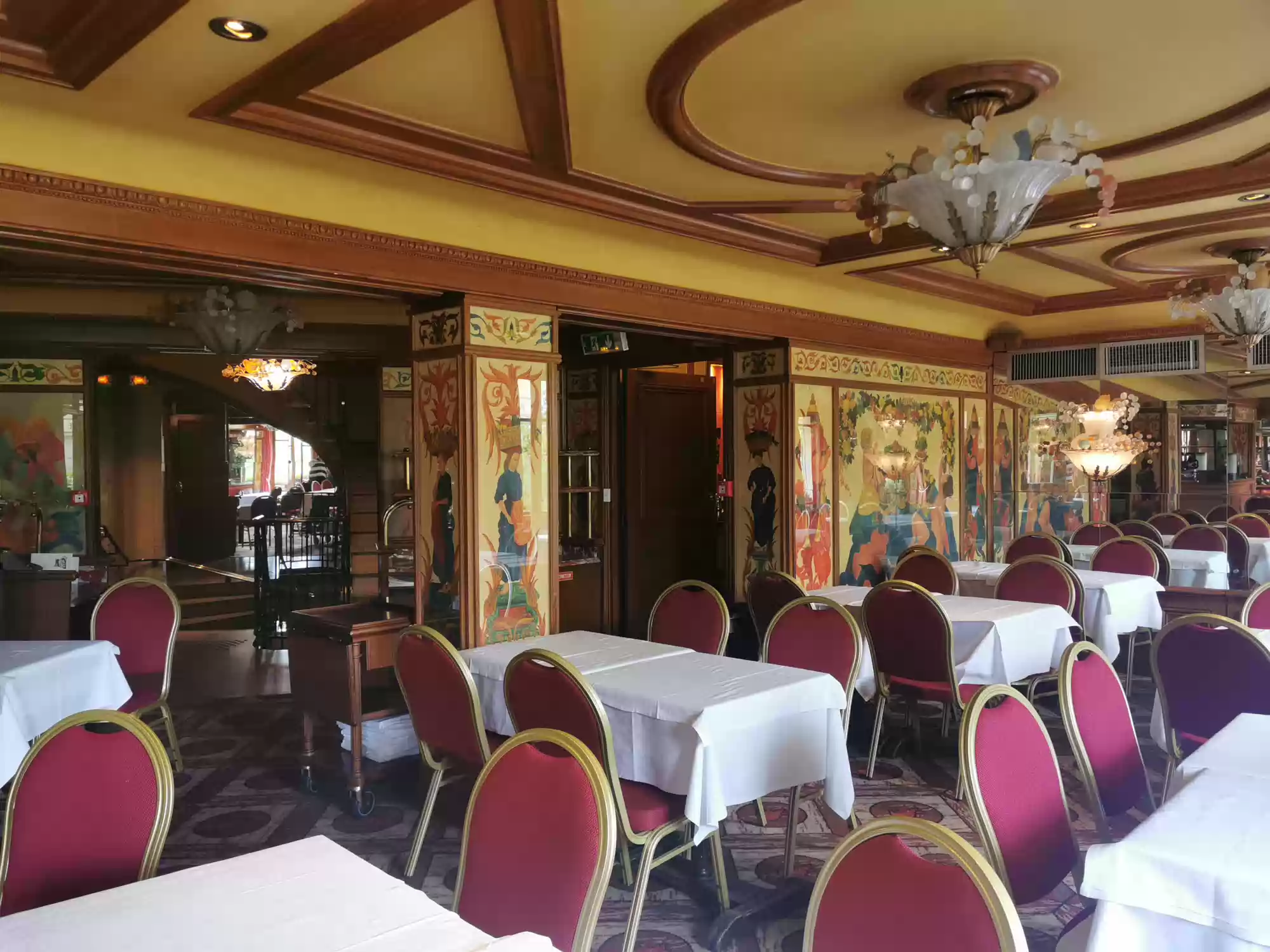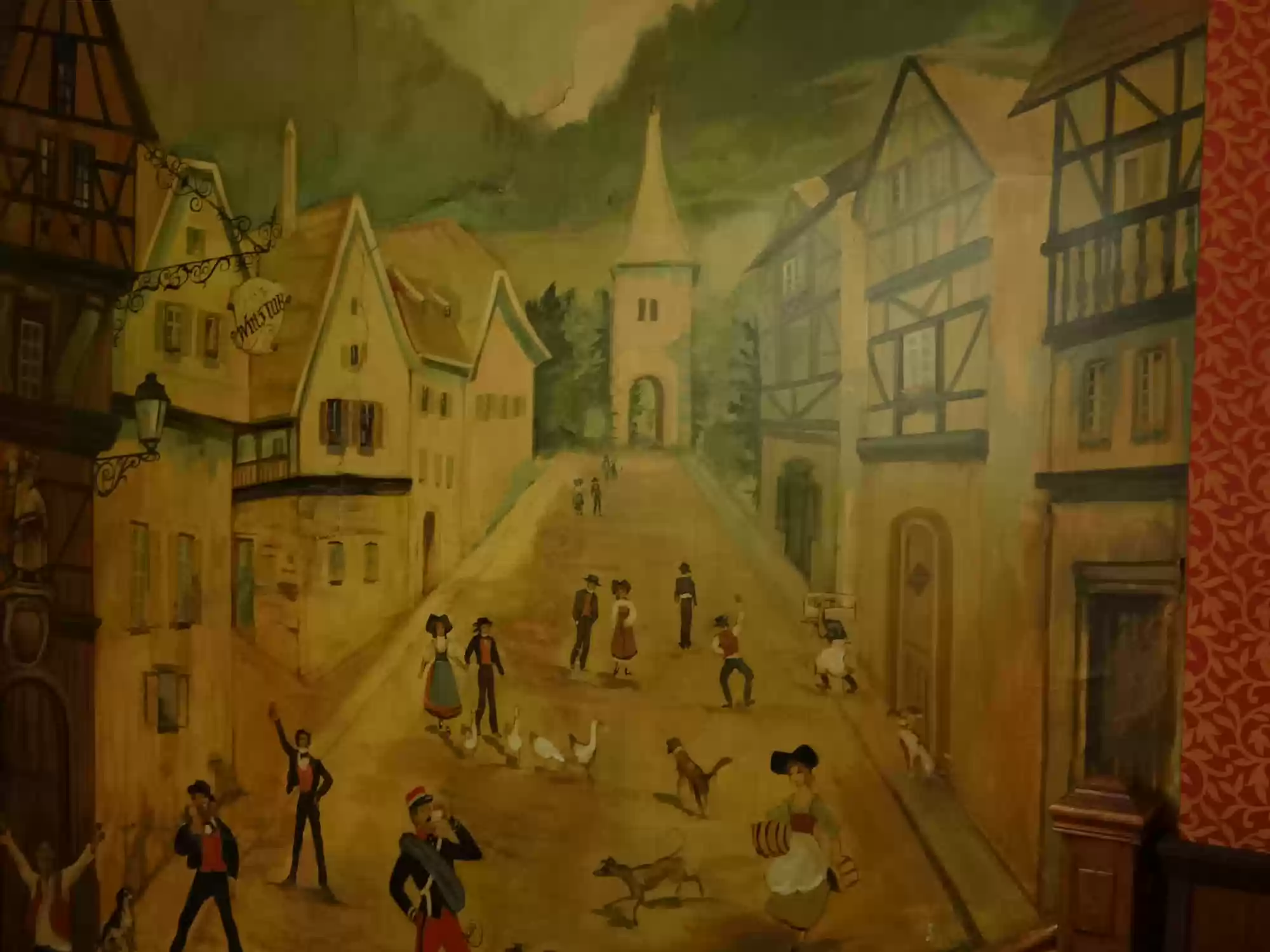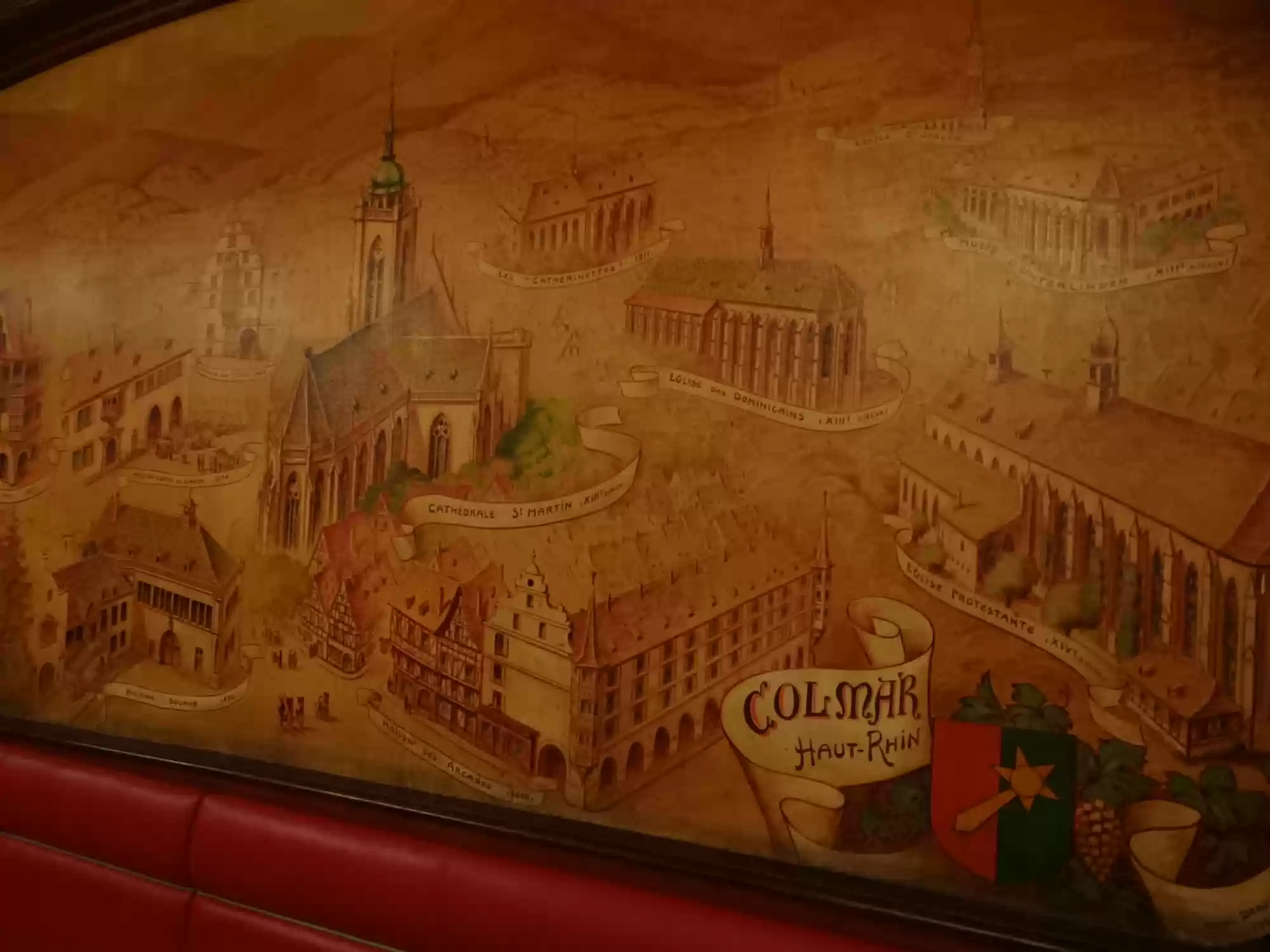 Restaurant room at (now closed) Jenny's, mid 19th century. The map in the background depicts Colmar in Alsace.