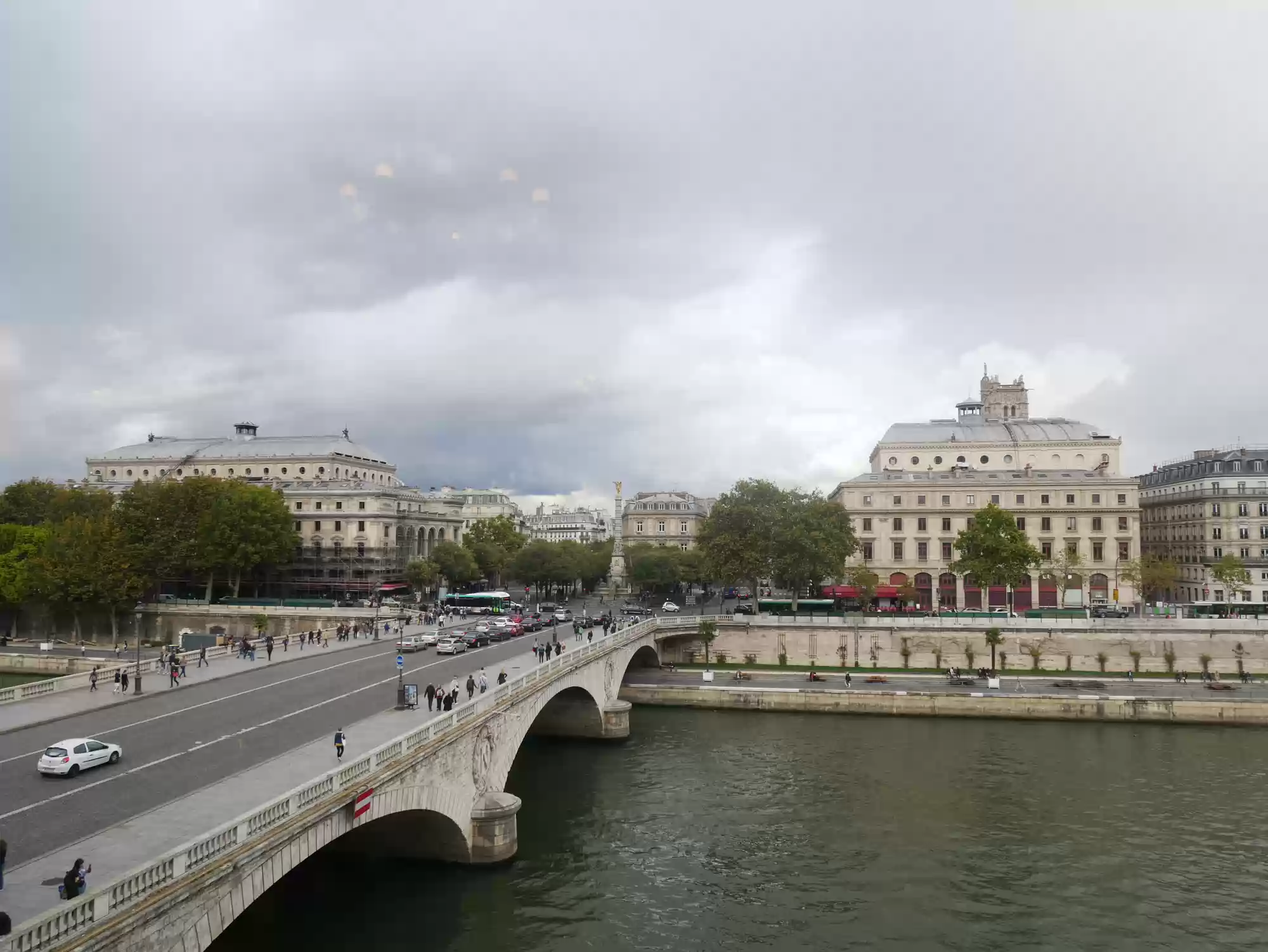 P1060574 Pont au change, Chatelet square, Chatelet theater (left) and Ville theater (right).