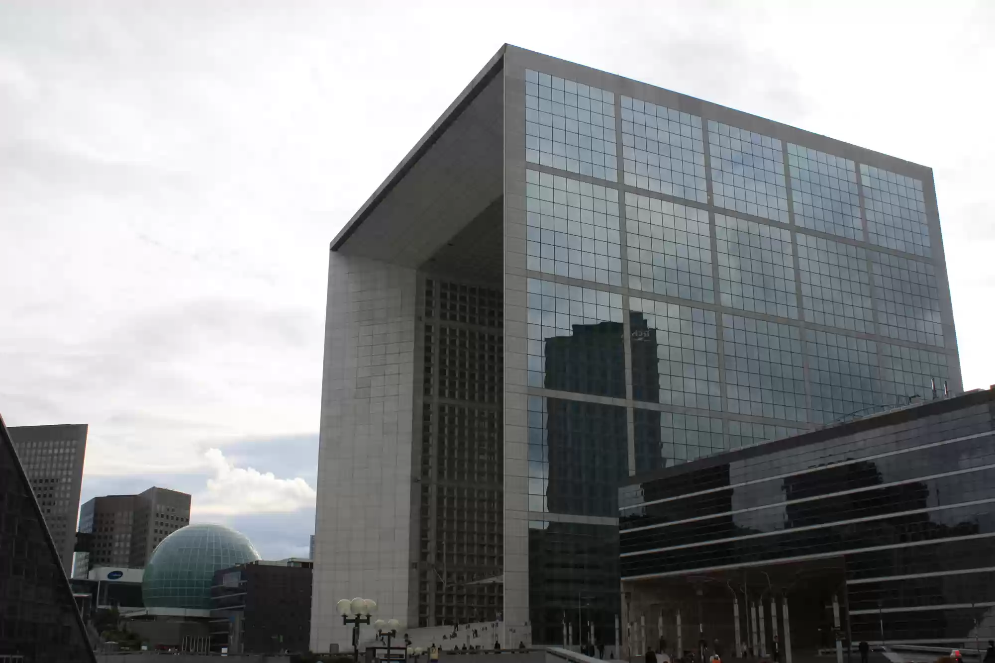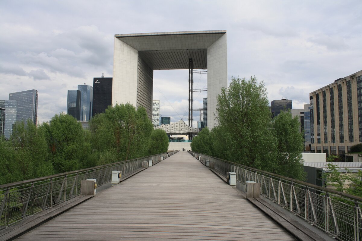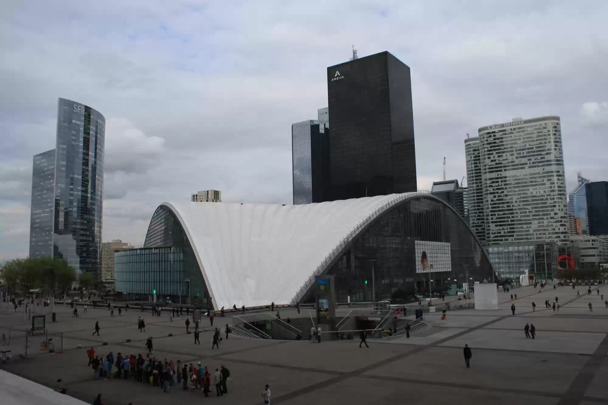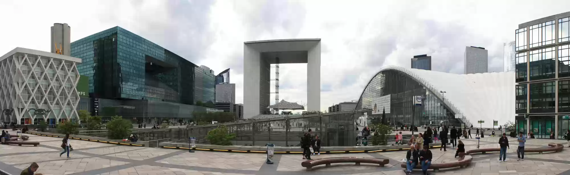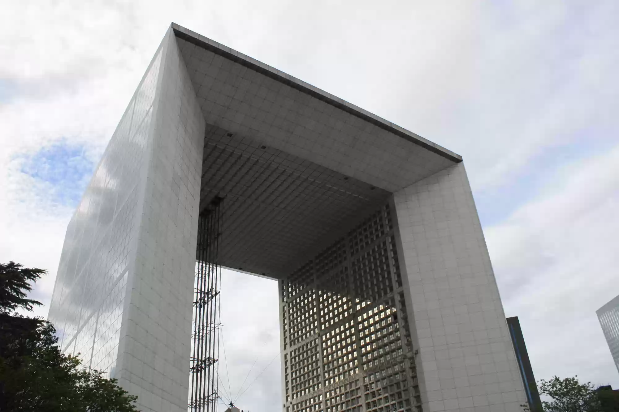 La Defense is a modern business district just outside Paris, featuring steel-and-glass towers and the "Grande Arche" (great arch).