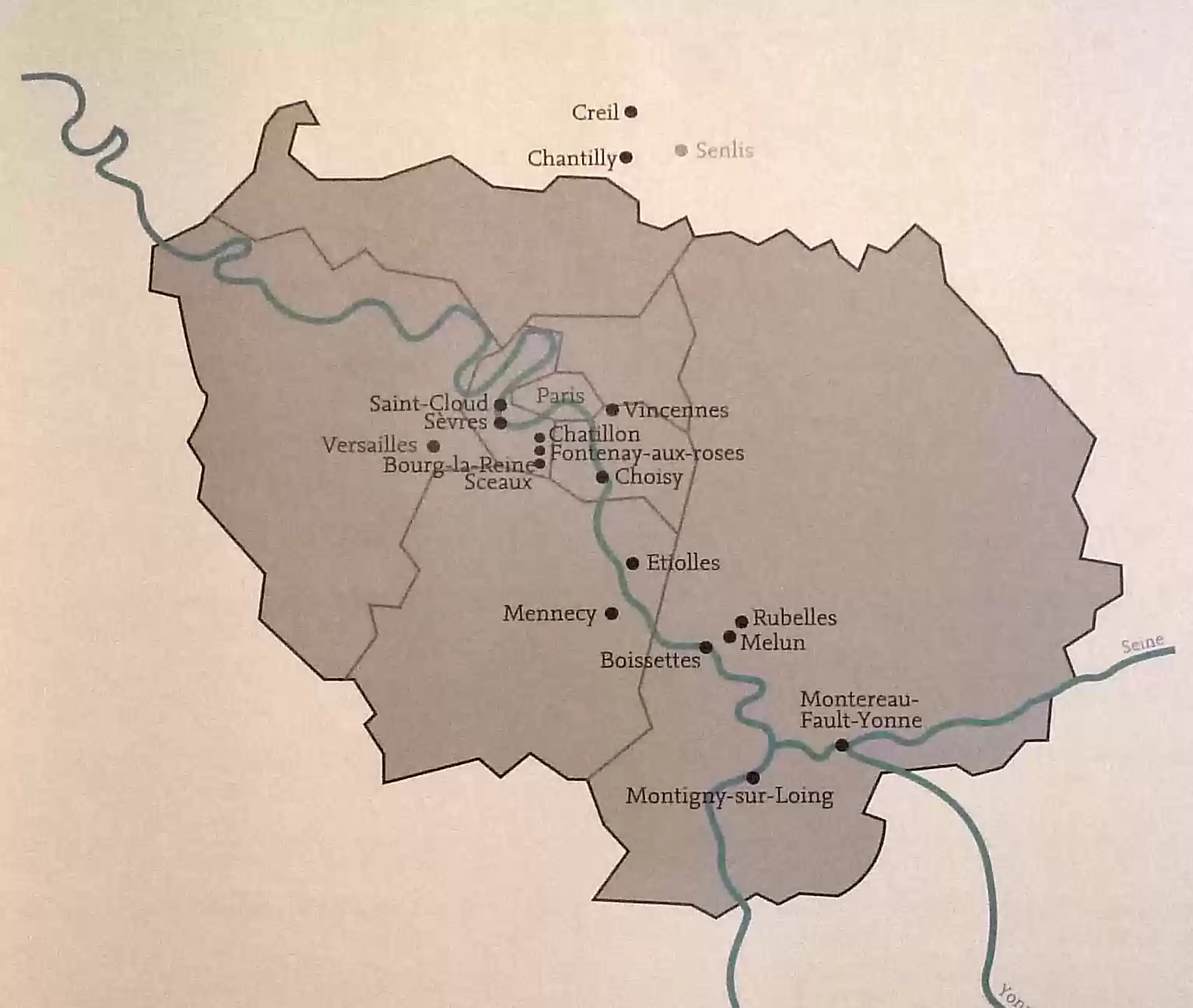 Louis XV cartel clock, 1st half of the 18th century. Fireplace plate with Colbert's arms, 17th century. Lacquer from China with the arms of the Duke of Maine, first quarter of the 18th century, from the workshop of Pan Yangming. Grand staircase, mid-19th century, restored in the late 20th century. Porcelain factories in the Paris area. Most were active between the mid-18th and the 20th century. Only the Sèvres factory is still active. Sceaux porcelain factory, 18th century. Lakanal highschool Labels
