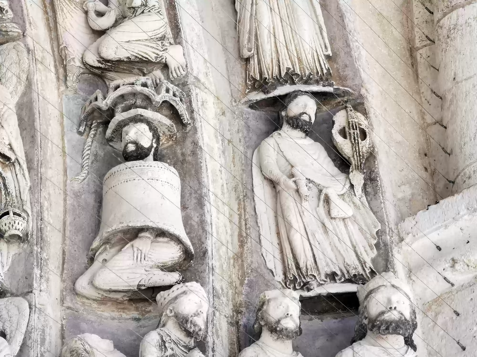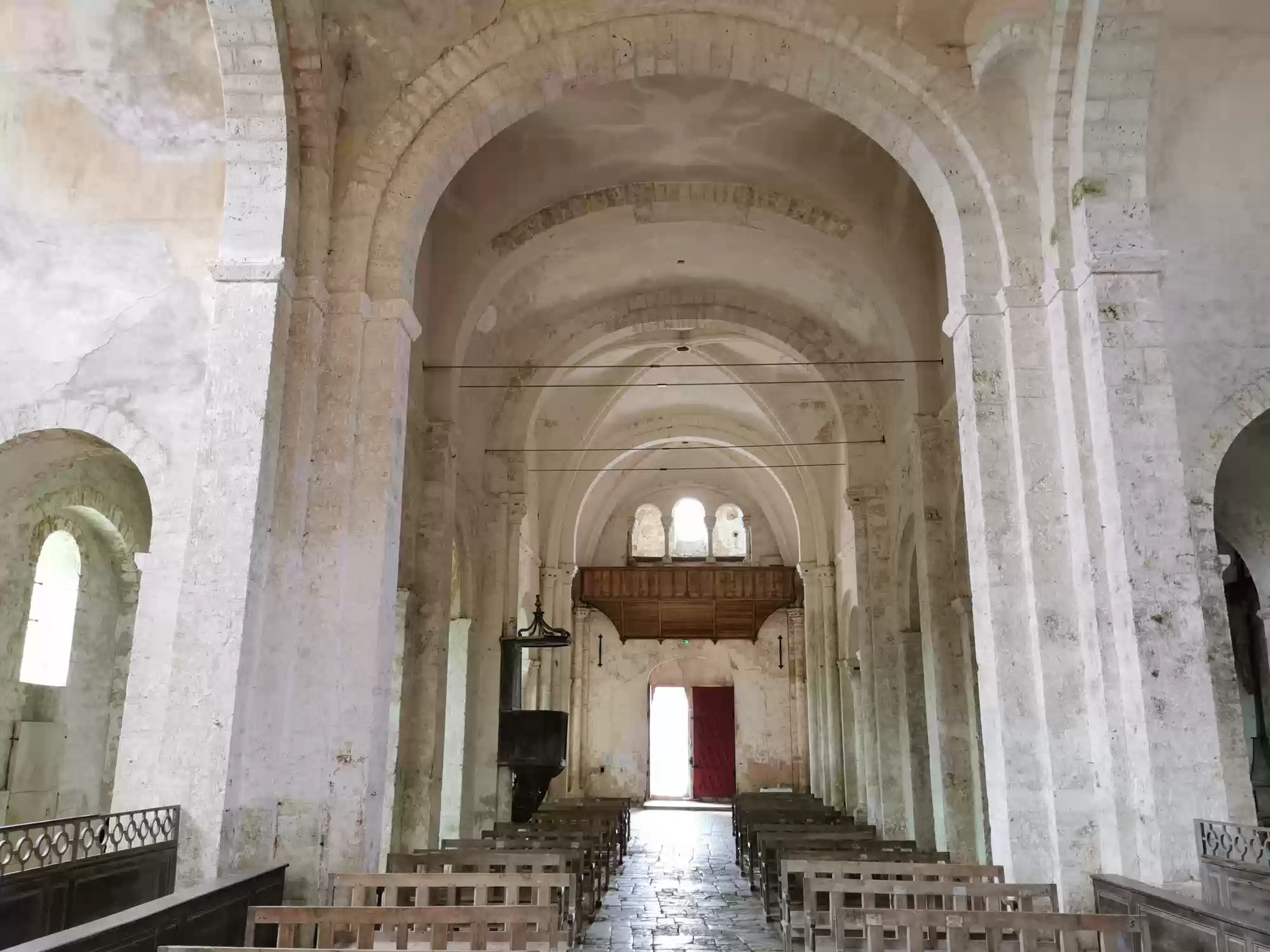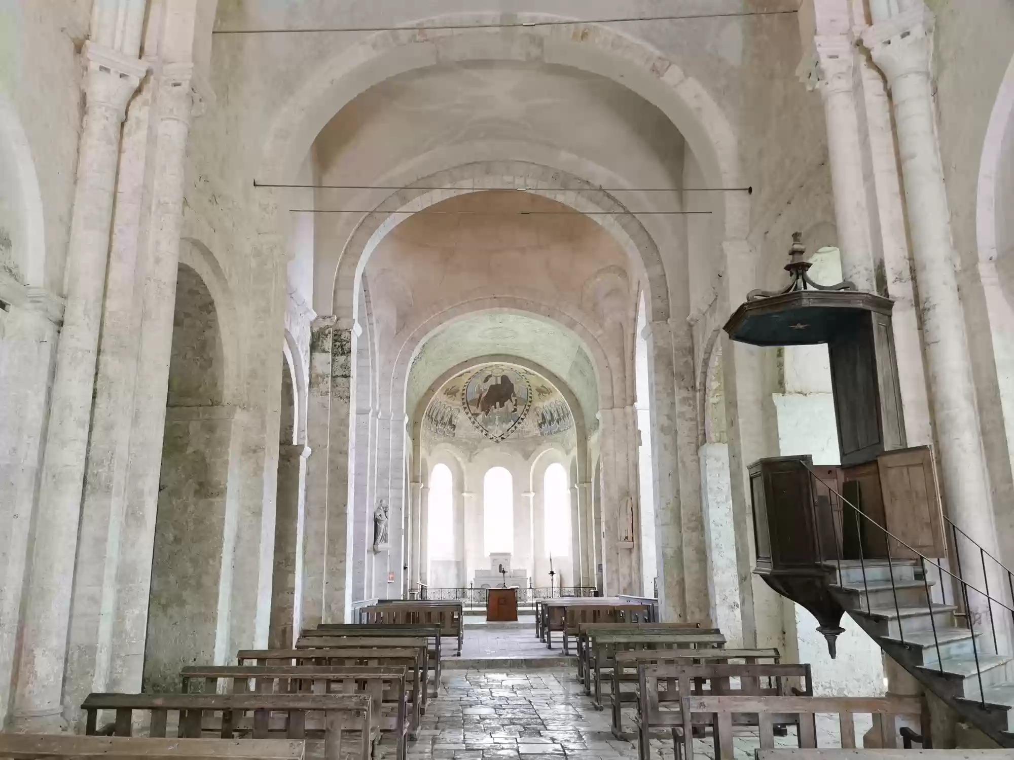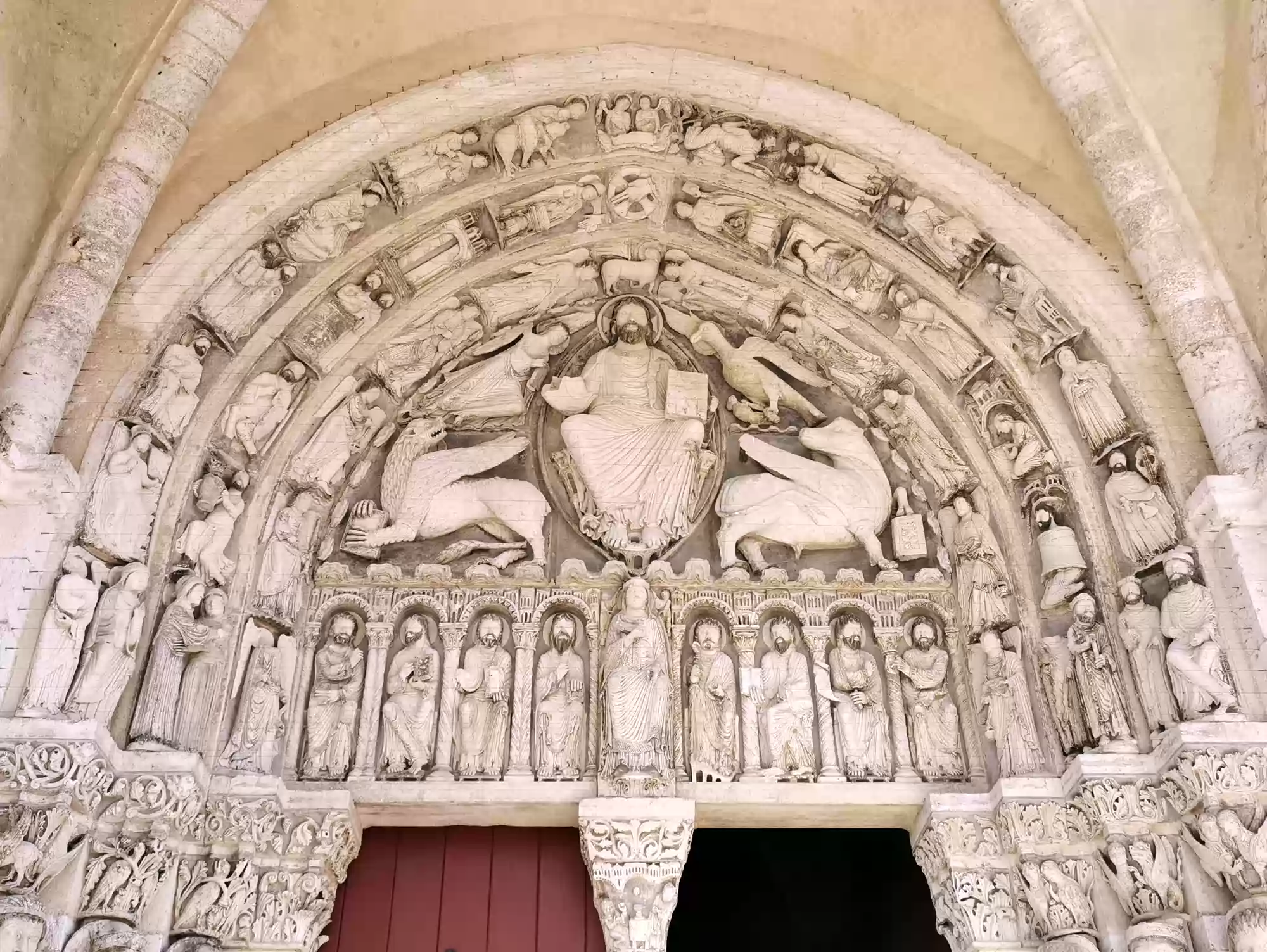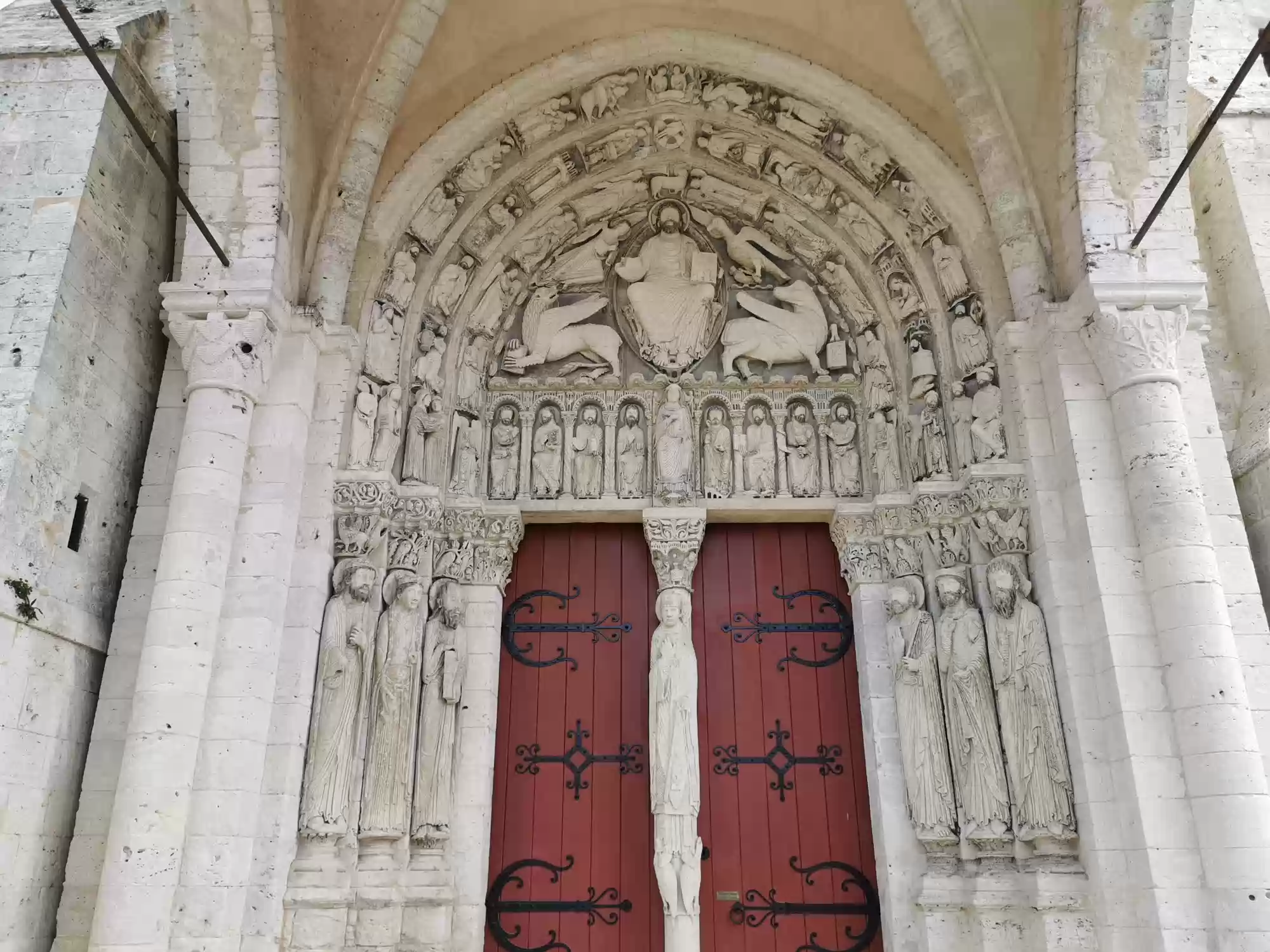 Former priory church, 12th century, dedicated to Saint Loup of Sens. Tympanum: Christ and symbols of the evangelists. Arches: life and miracles of Saint Loup. Column statue between the doors: Saint Loup. Tympanum: Christ and symbols of the evangelists. Arches: life and miracles of Saint Loup. Life and miracles of Saint Loup. Life and miracles of Saint Loup. Life and miracles of Saint Loup. Altarpiece. Walnut wood statue, 19th century. Noyen-sur-SeineCaesar tower Labels