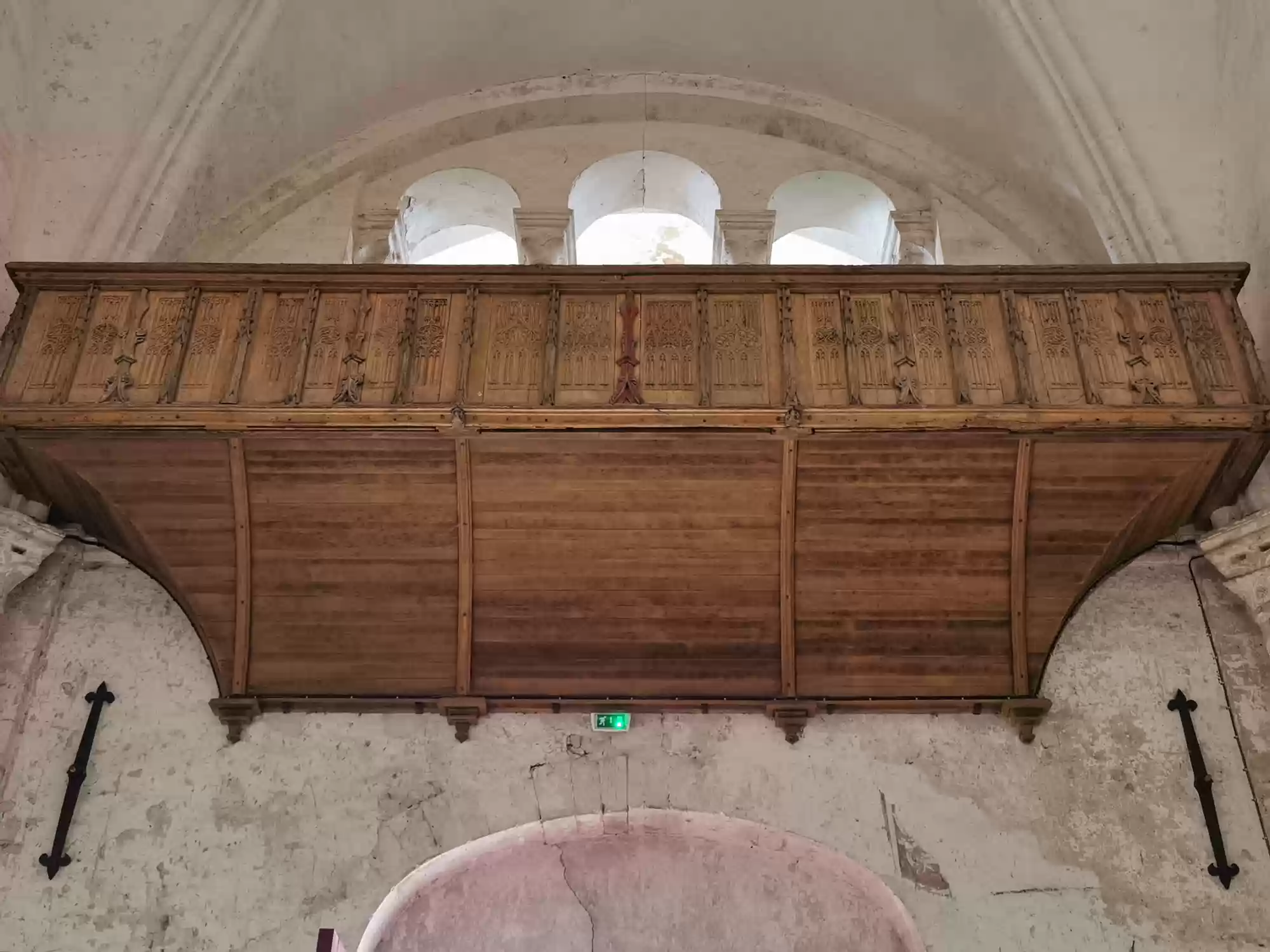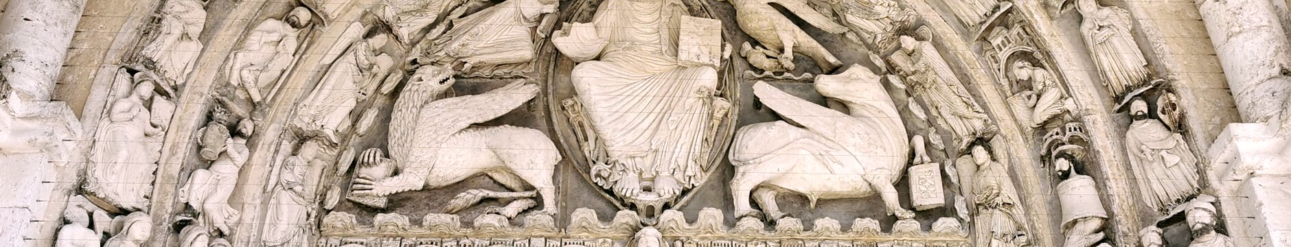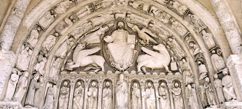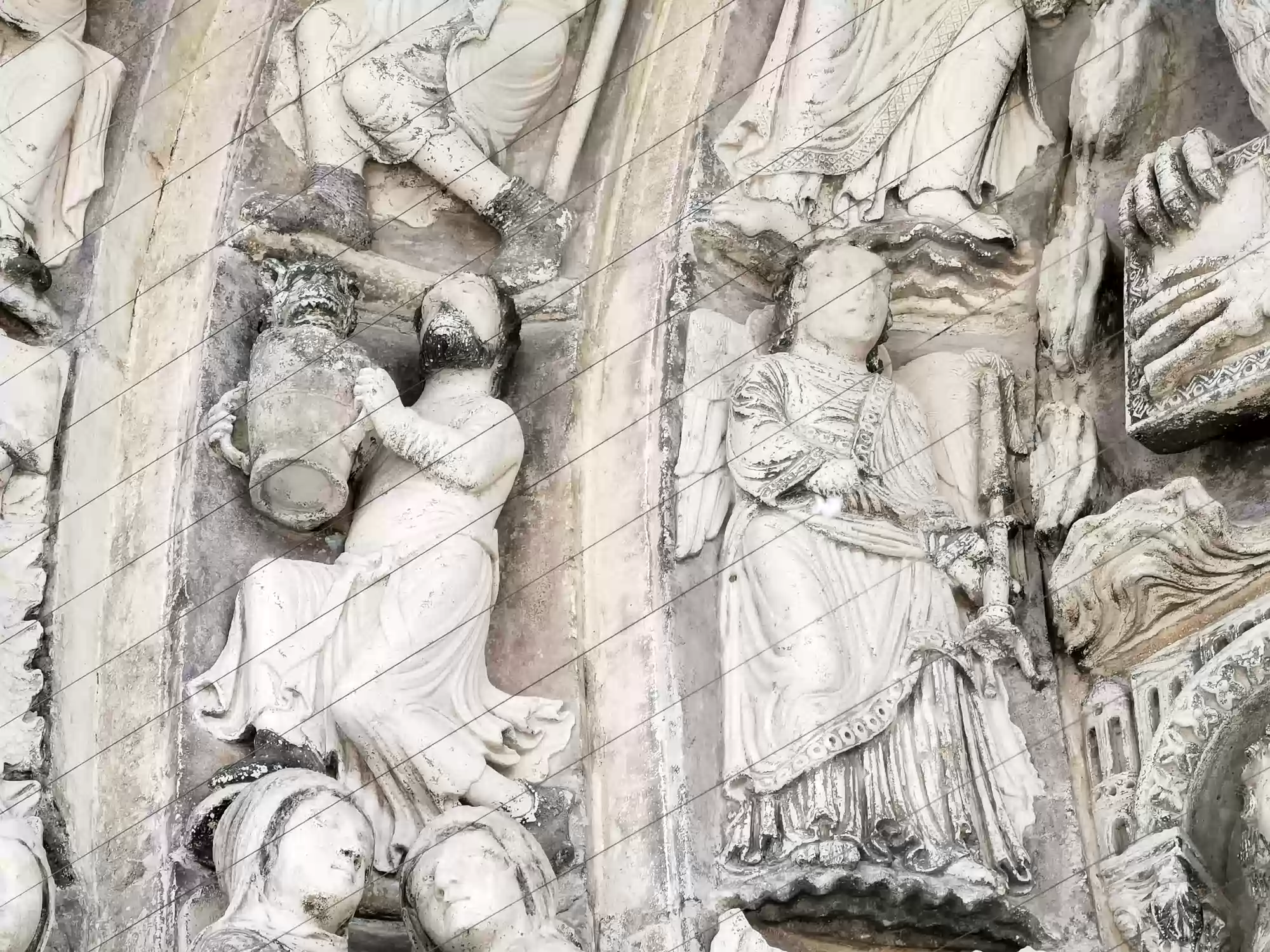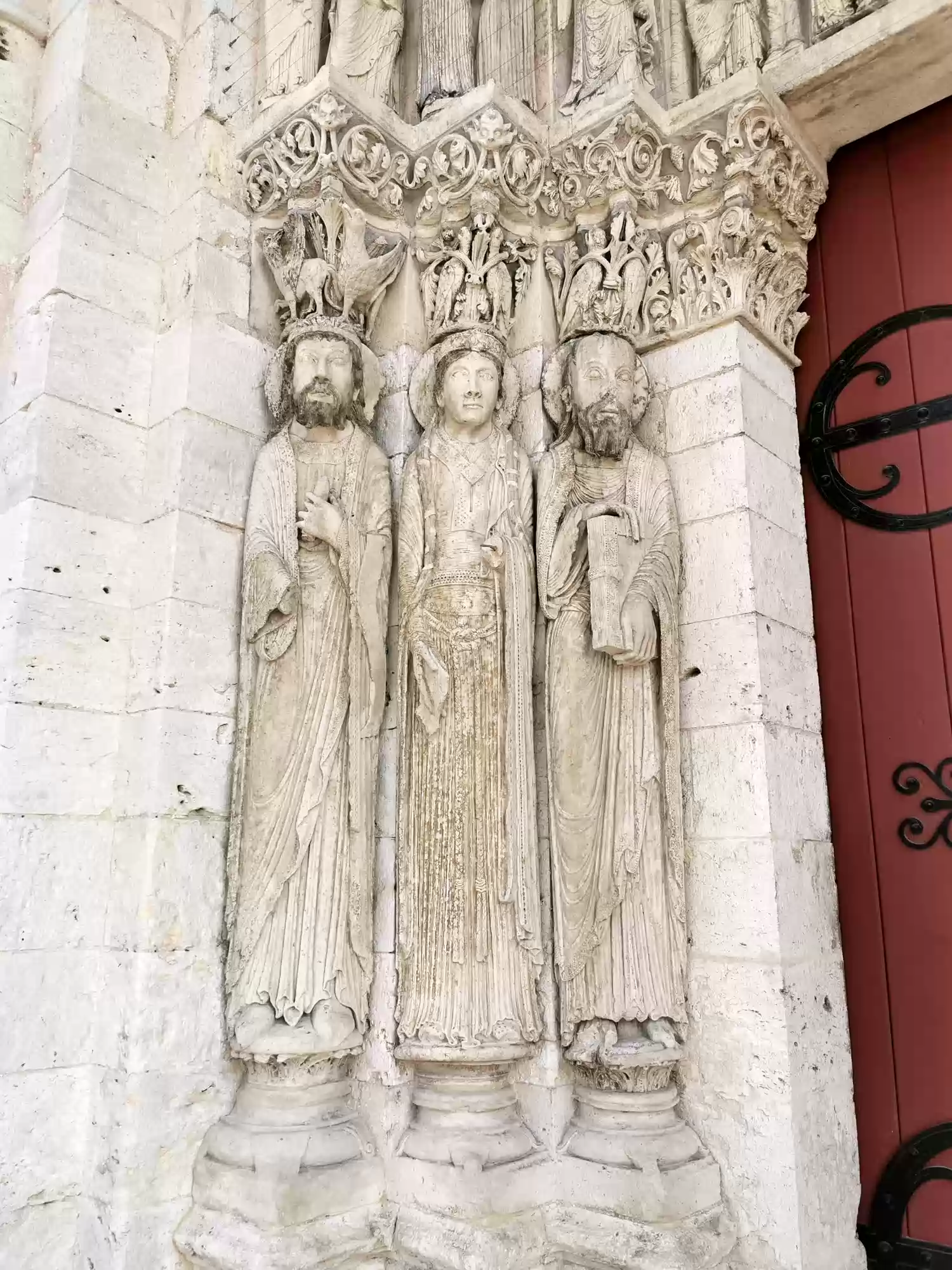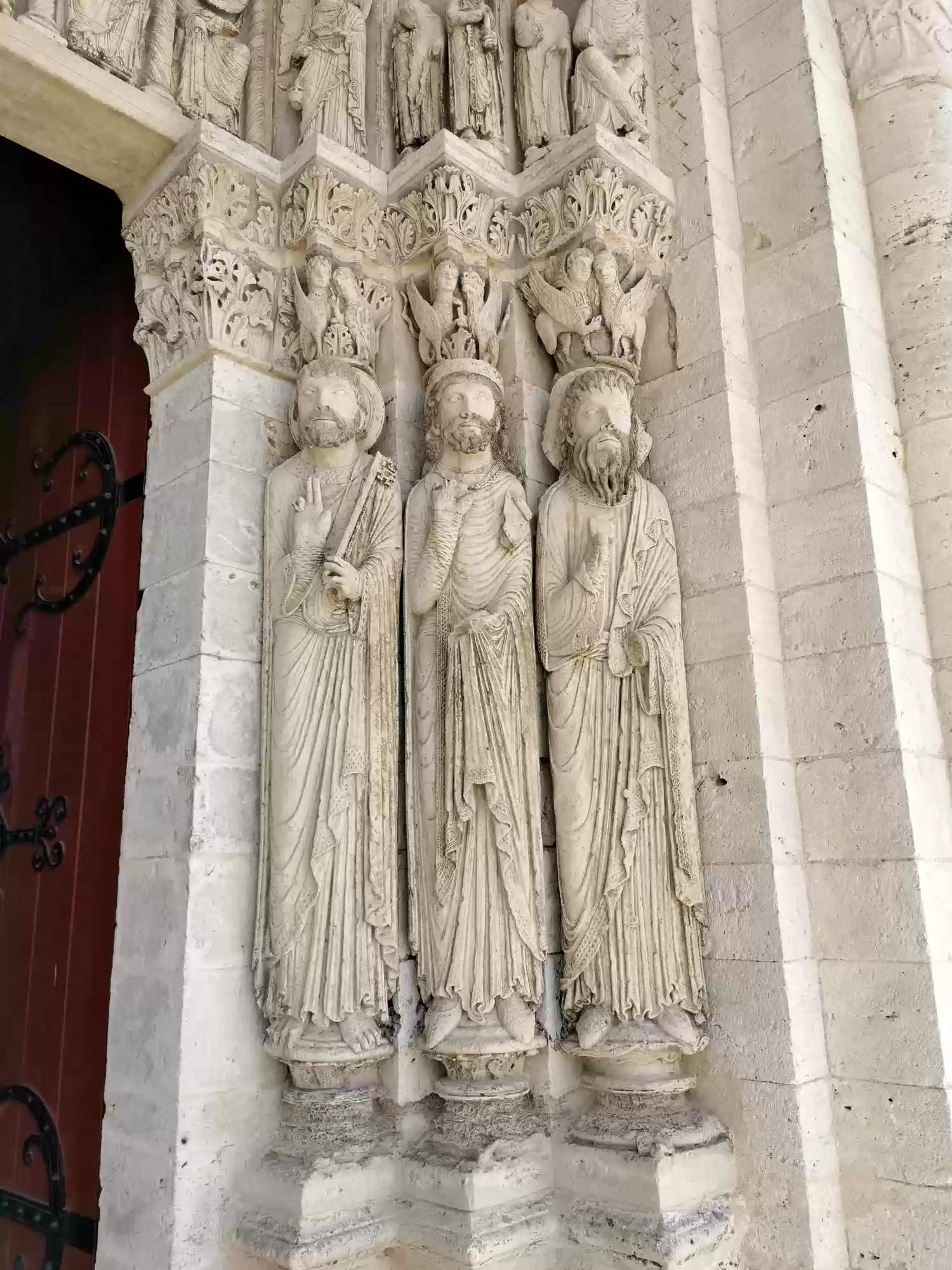 Former priory church, 12th century, dedicated to Saint Loup of Sens. Tympanum: Christ and symbols of the evangelists. Arches: life and miracles of Saint Loup. Column statue between the doors: Saint Loup. Tympanum: Christ and symbols of the evangelists. Arches: life and miracles of Saint Loup. Life and miracles of Saint Loup. Life and miracles of Saint Loup. Life and miracles of Saint Loup. Altarpiece. Walnut wood statue, 19th century. Noyen-sur-SeineCaesar tower Labels