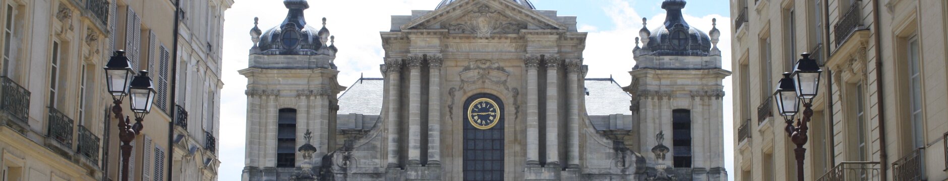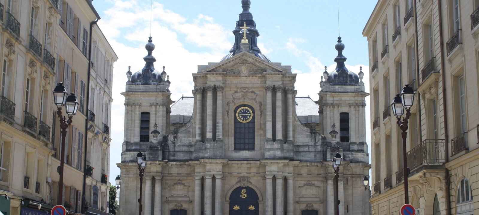 Saint-Louis church, erected by Mansart and Sagonne between 1743 and 1754. It became a cathedral in 1802. Square in front of the cathedral. Nave. Nave. Altar and bishop chair. Organ. Chapel. Chapel. Reliquary, 19th century, ebony, shell, gilded metal. Monstrance, second half of the 18th century. Palace Labels